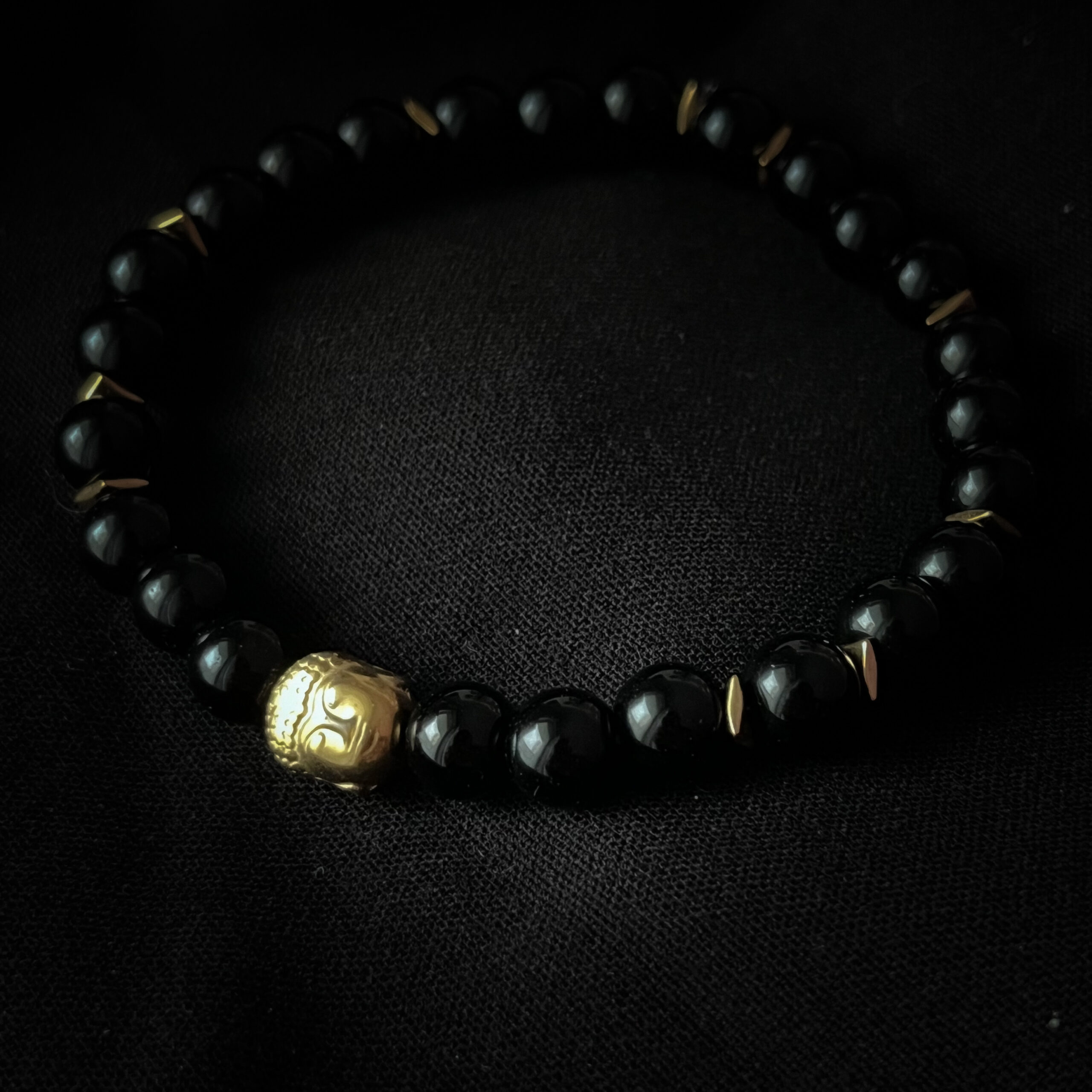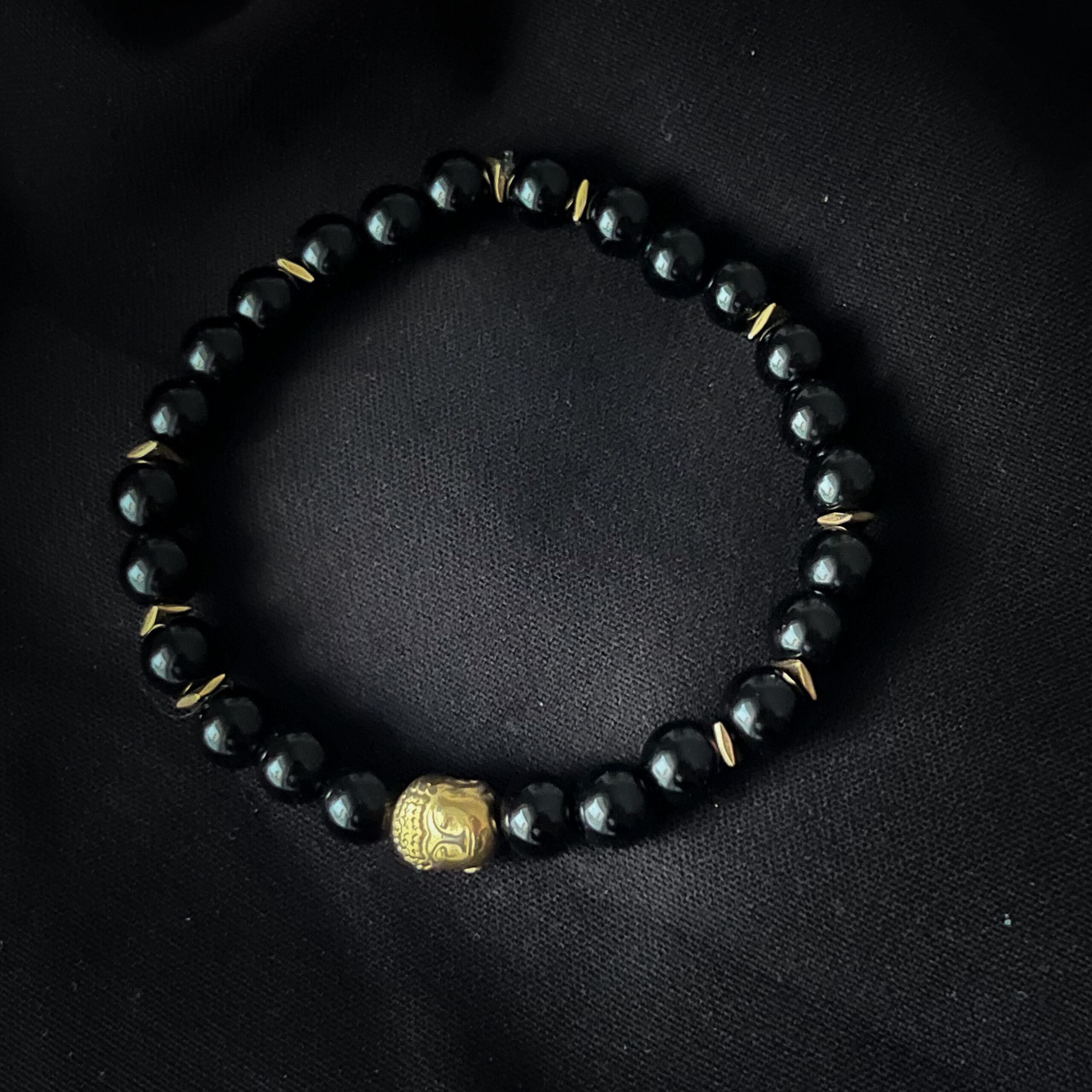 Czarna bransoletka ze złotymi przekładkami u Buddą