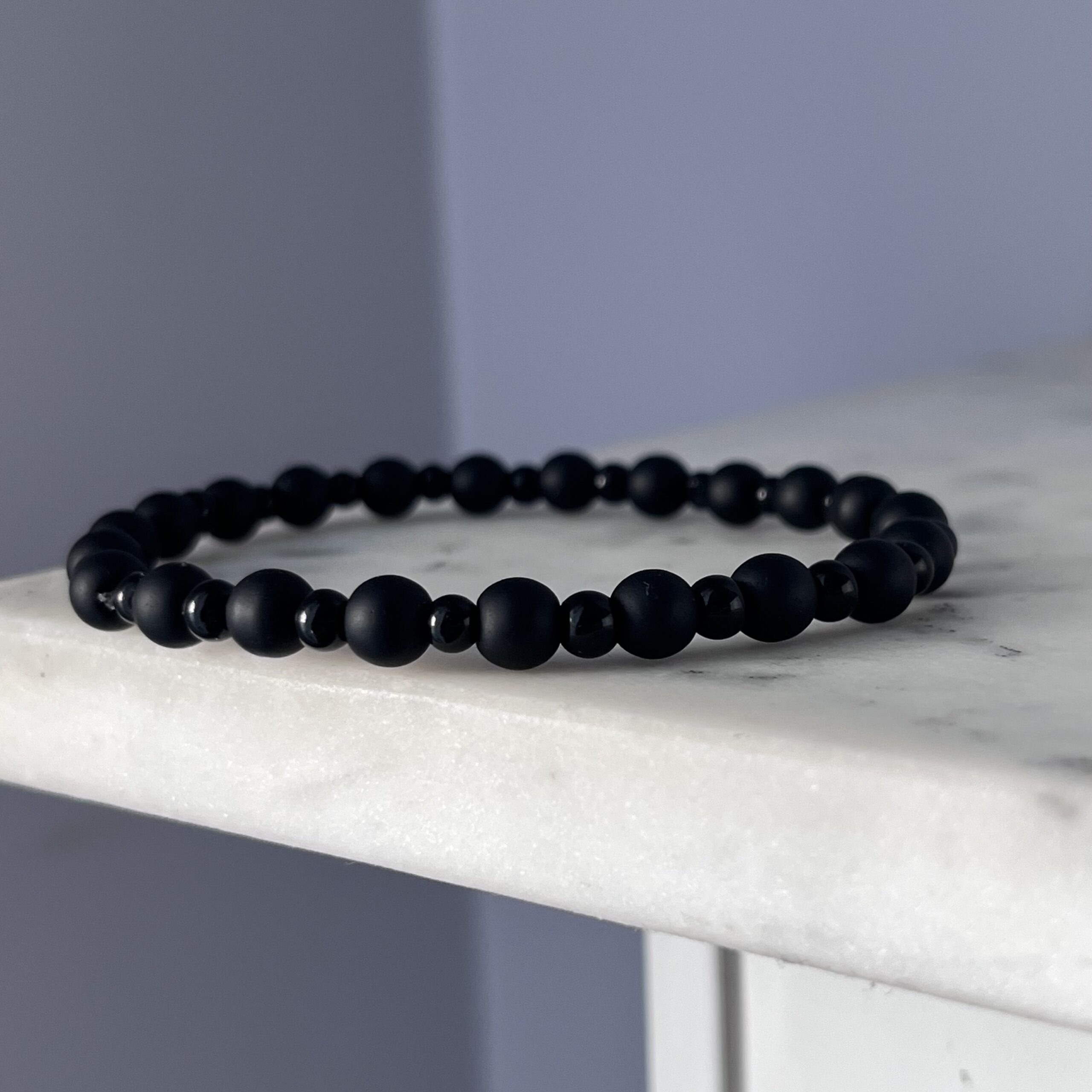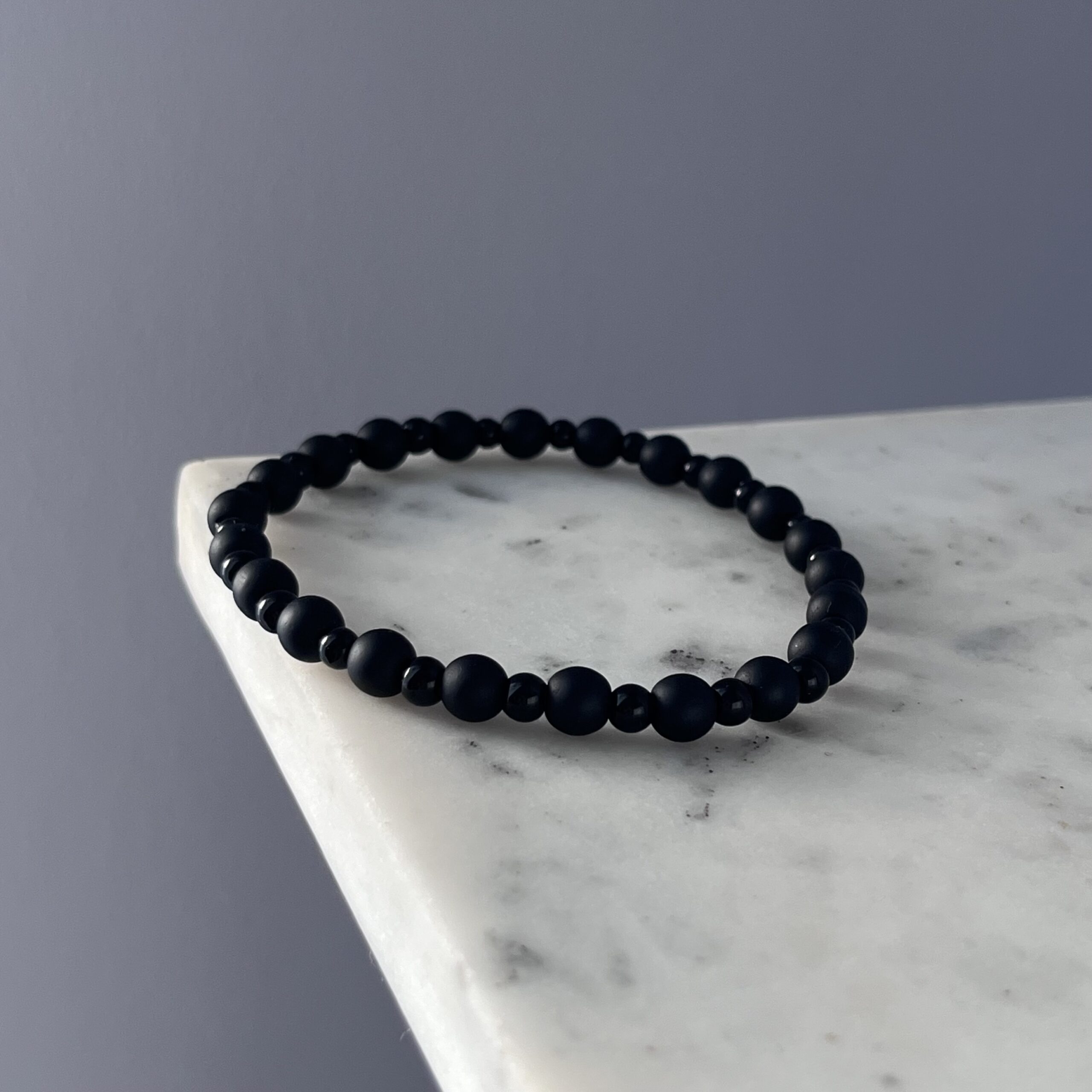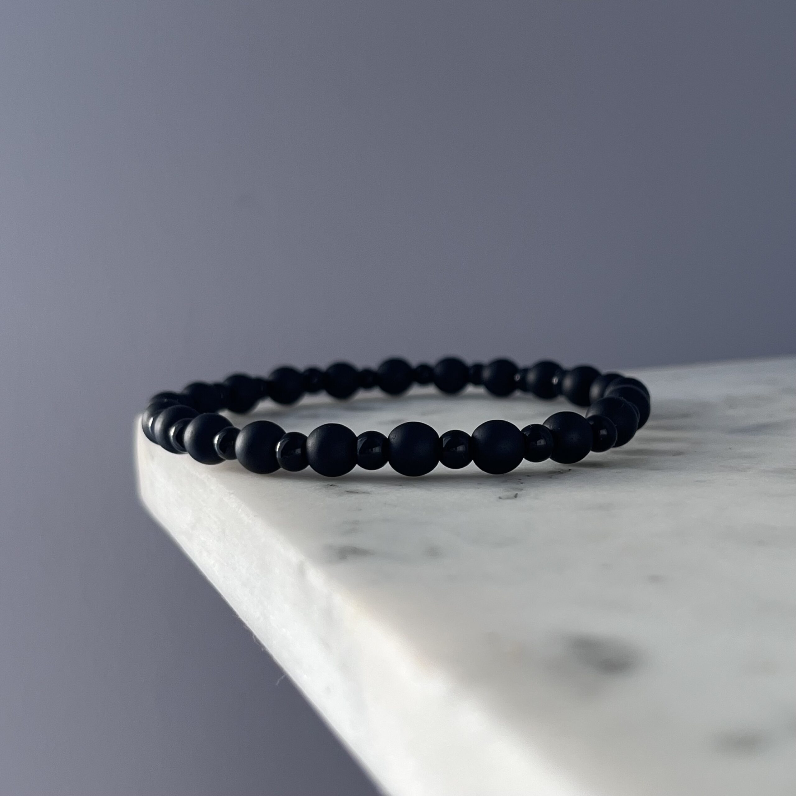 Stylowa, elastyczna bransoletka męska wykonana z naturalnych kamieni onyksu. Składa się z większych, matowych koralików oraz mniejszych, błyszczących kamieni, nawleczonych naprzemiennie, co tworzy elegancki i nowoczesny kontrast. Elastyczna żyłka dopasowuje się do nadgarstka, zapewniając wygodę noszenia. Onyks, uważany za kamień siły i równowagi, dodaje tej biżuterii nie tylko wyjątkowego charakteru, ale i symbolicznego znaczenia.