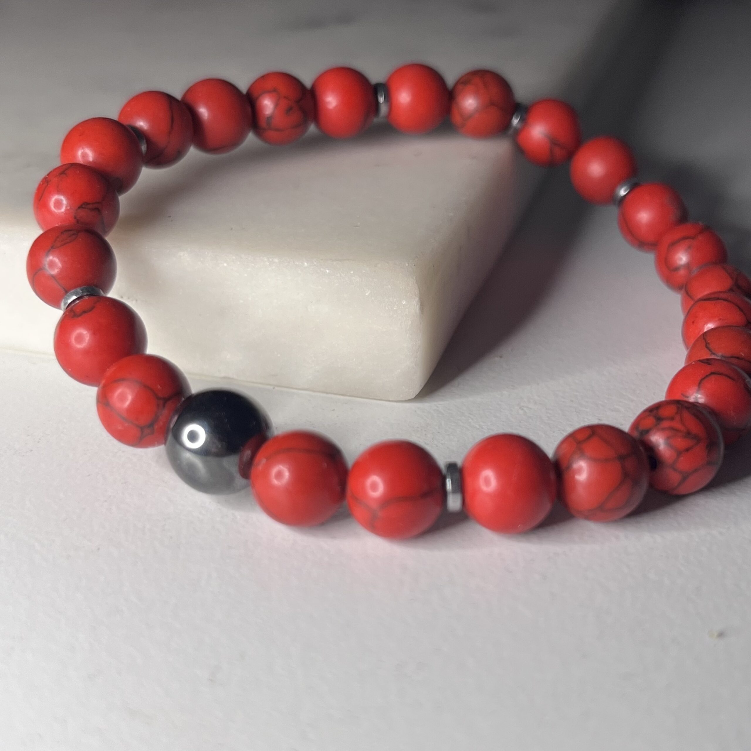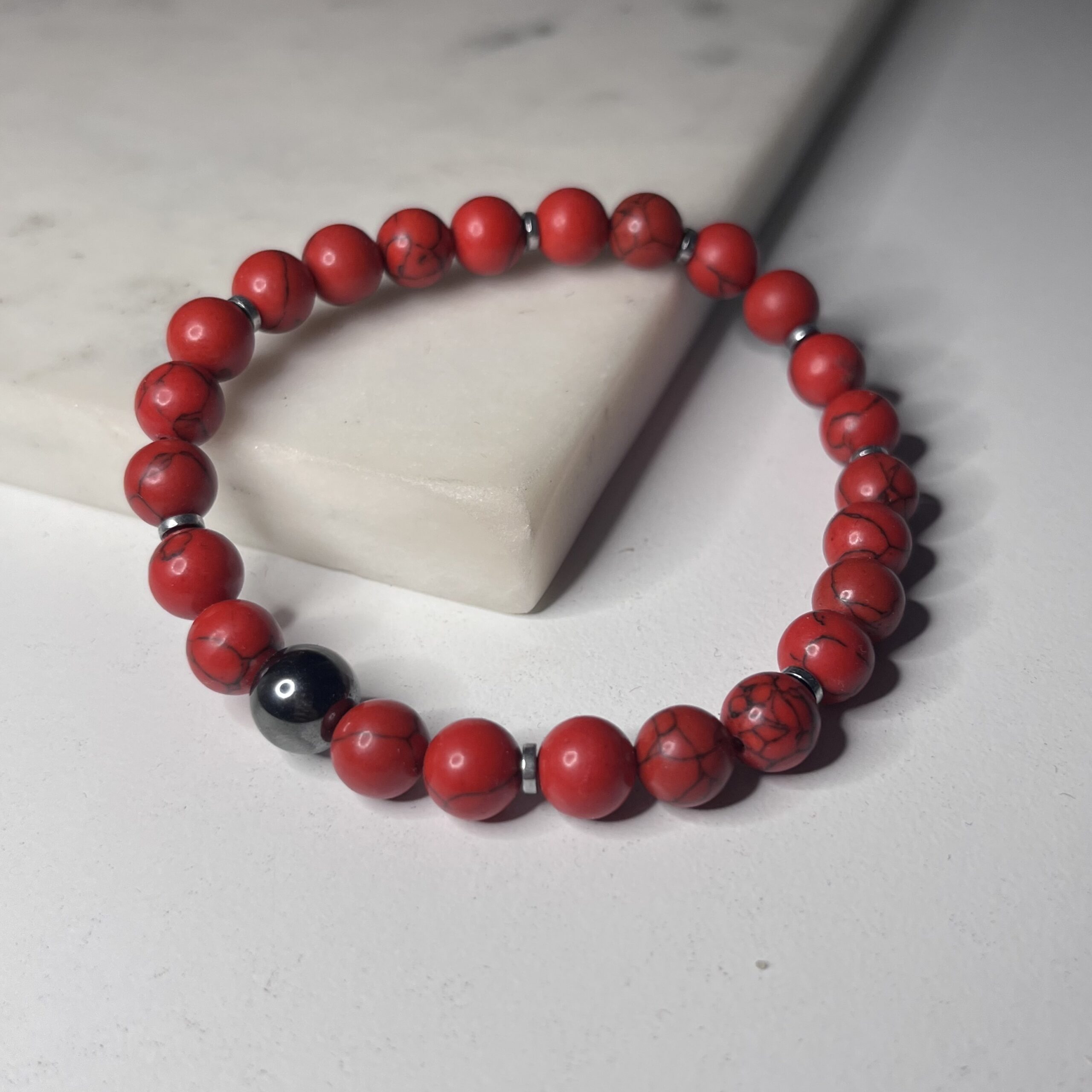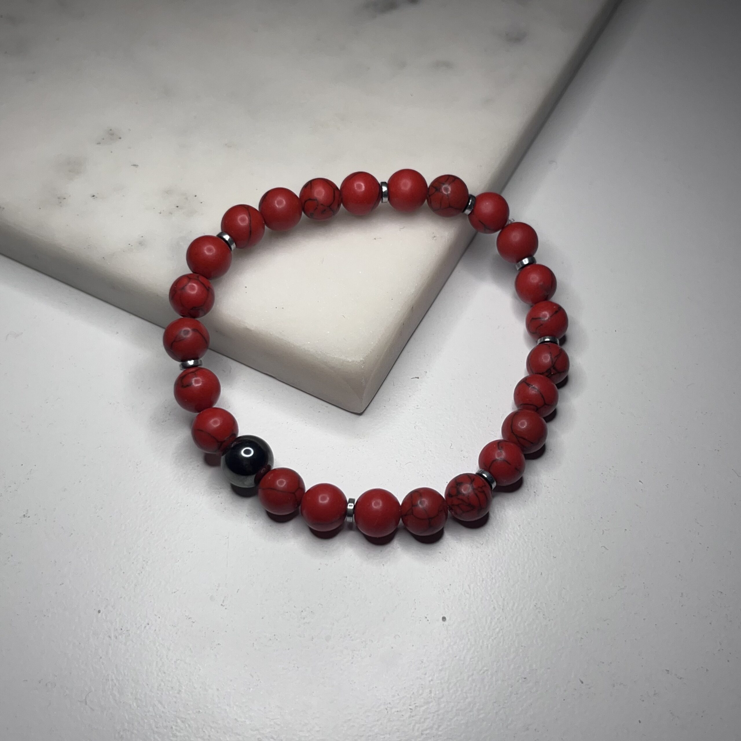 Elastyczna męska bransoletka wykonana z czerwonego jaspisu i srebrnych przekładek.