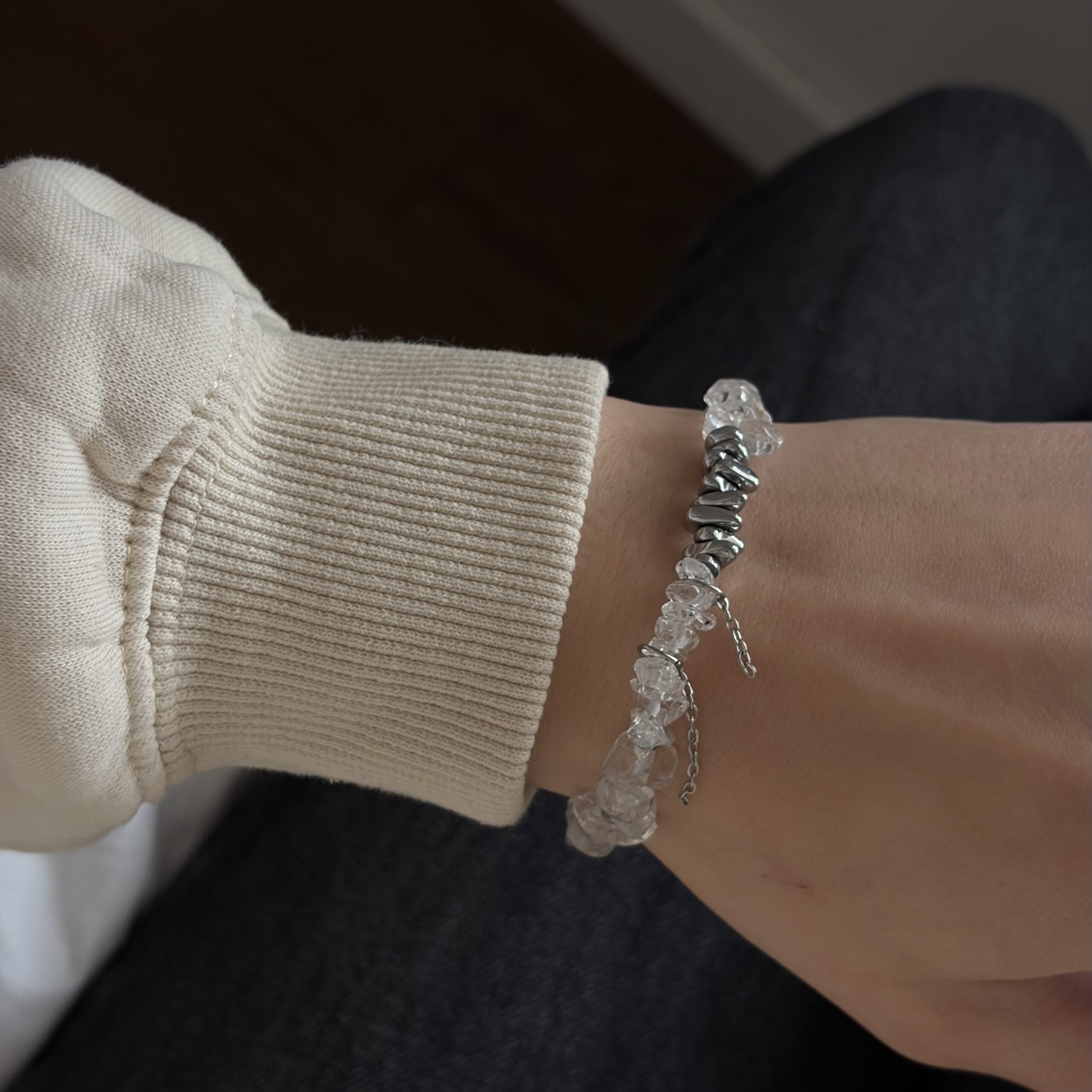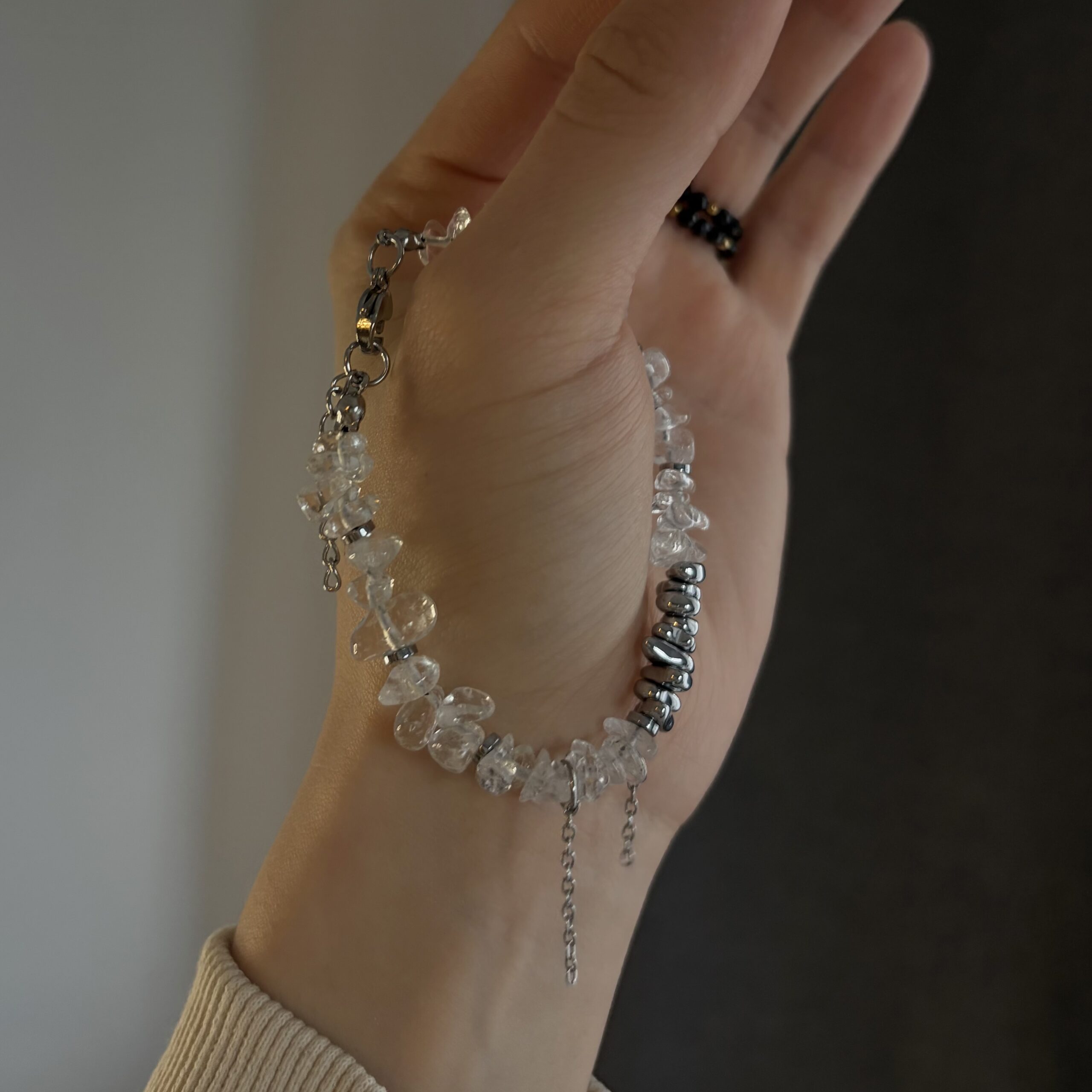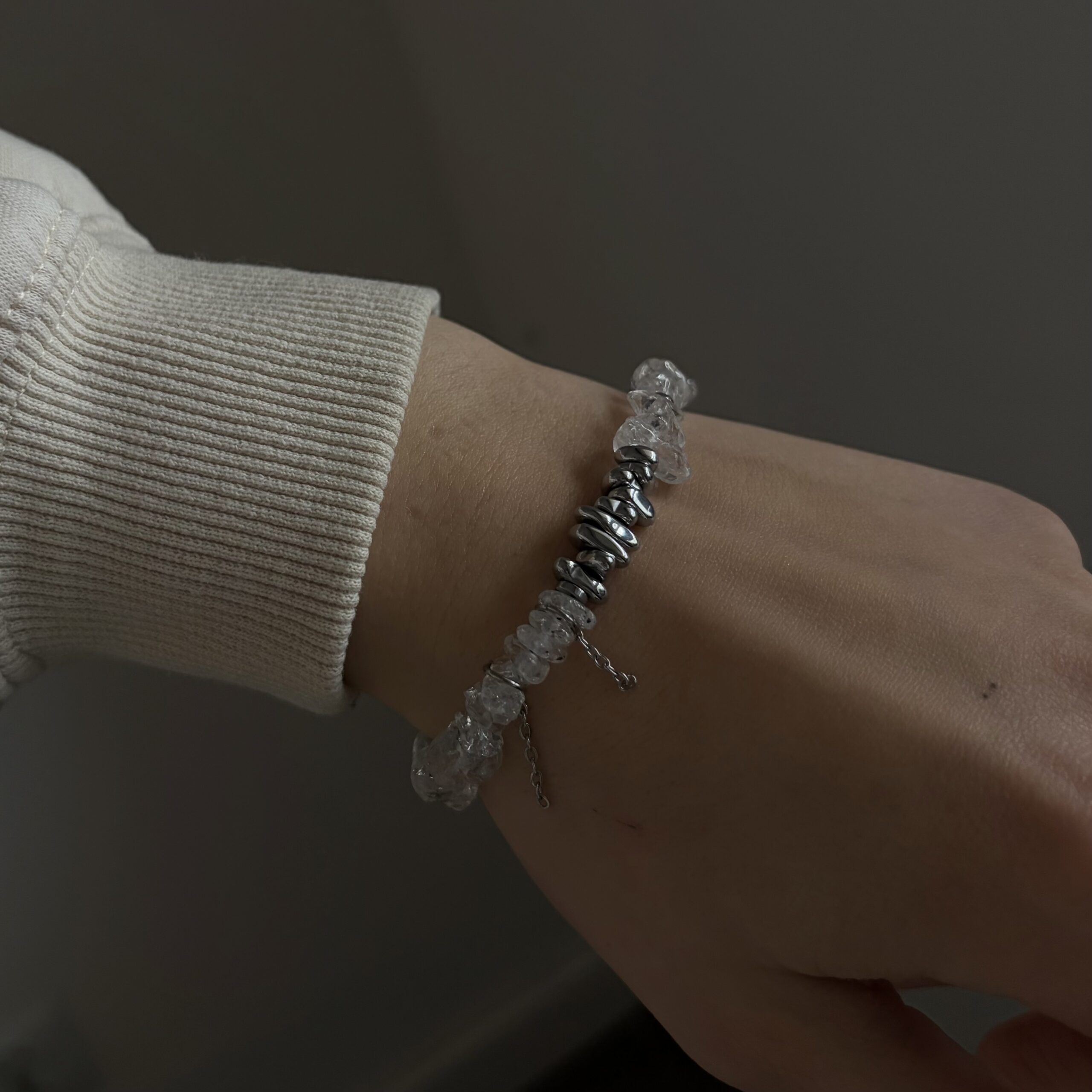 Środkową część zdobi sieczka hematytu o metalicznym połysku, która przyciąga uwagę i nadaje całości nowoczesnego charakteru. Po bokach znajdują się naturalne kamienie kryształu górskiego – lekkie, przejrzyste i subtelnie rozświetlające nadgarstek.