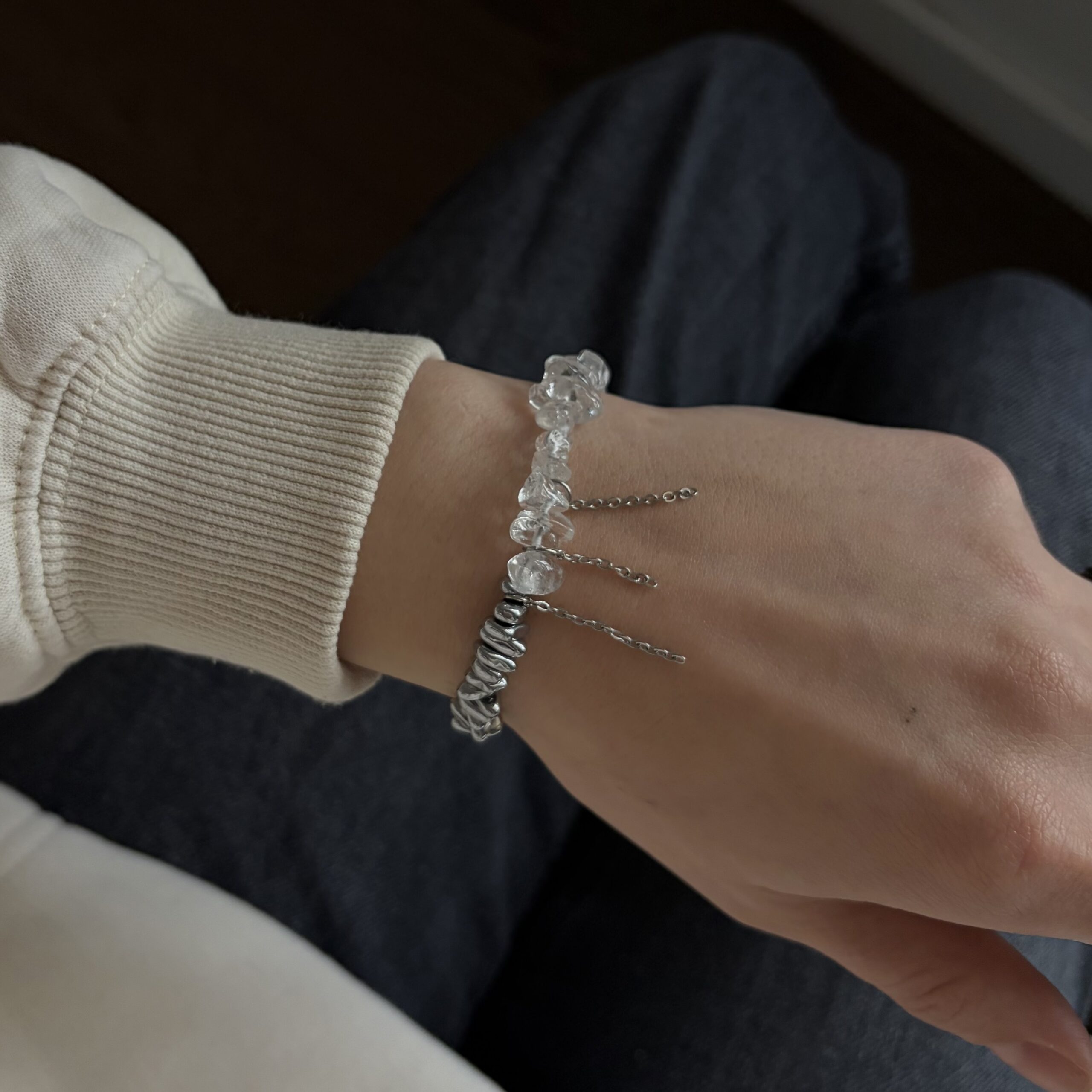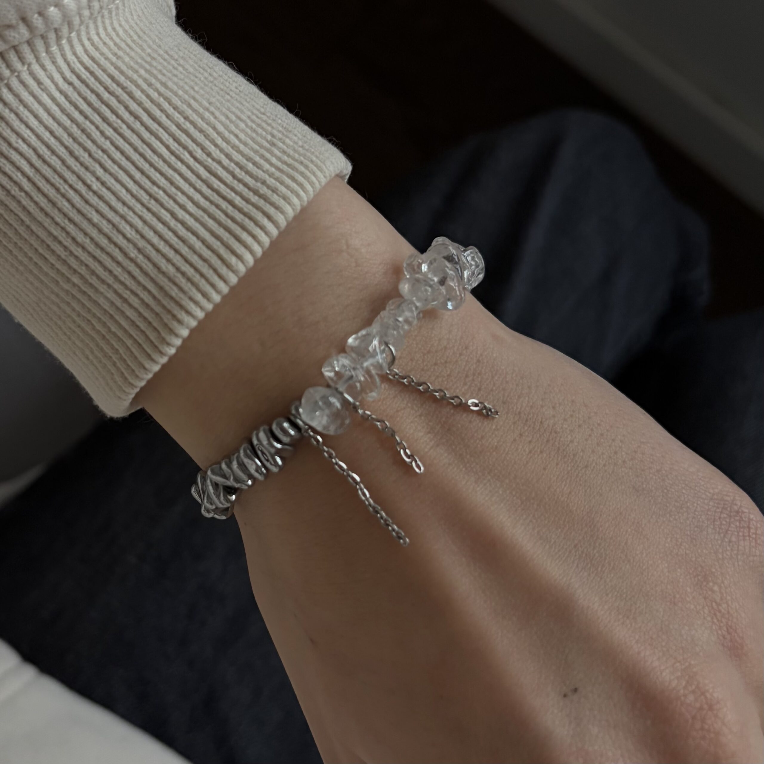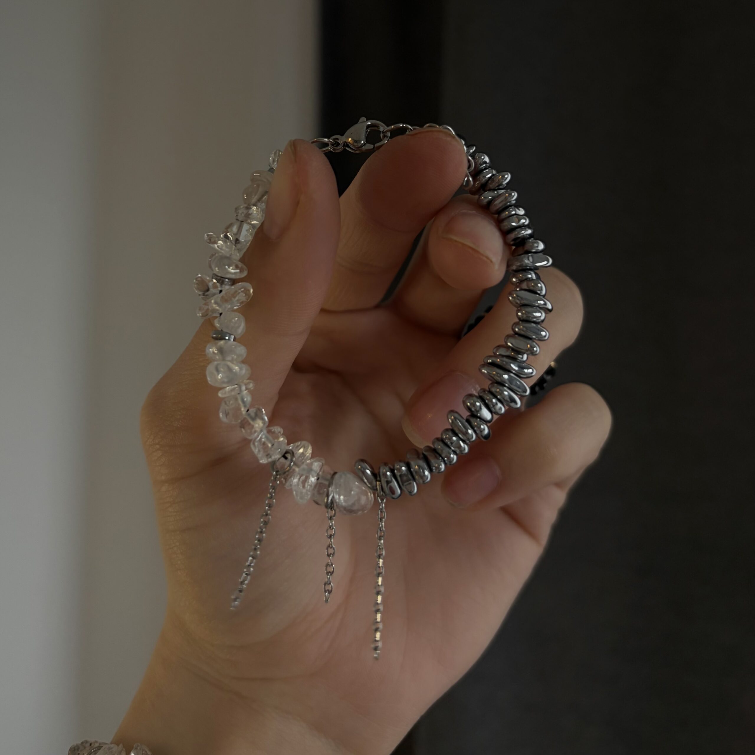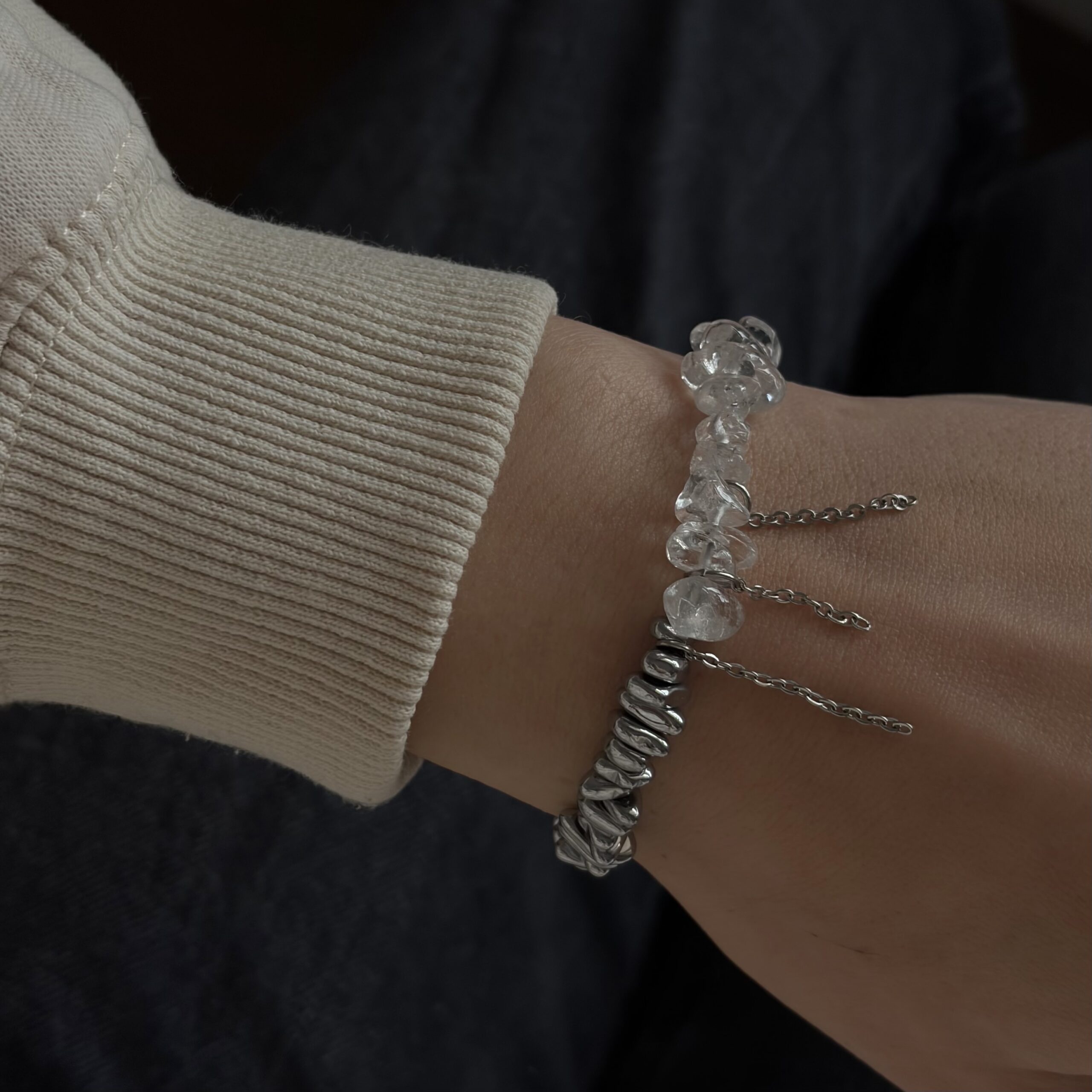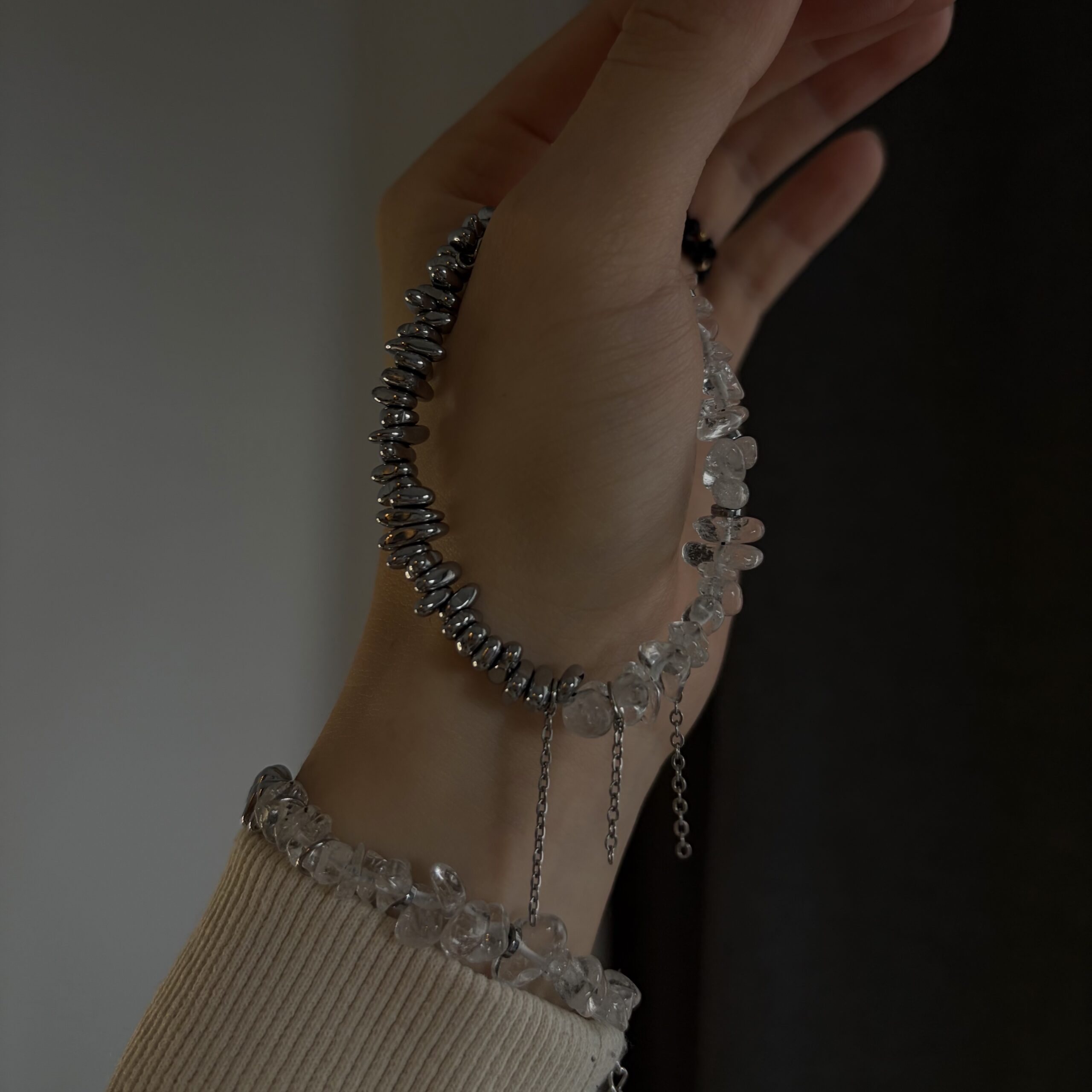 Połowę bransoletki tworzy naturalna sieczka kryształu górskiego – lekka, przejrzysta i delikatnie połyskująca przy każdym ruchu dłoni. Drugą część stanowią chłodne, metaliczne elementy hematytu, które nadają całości nowoczesnego, wyrazistego charakteru.