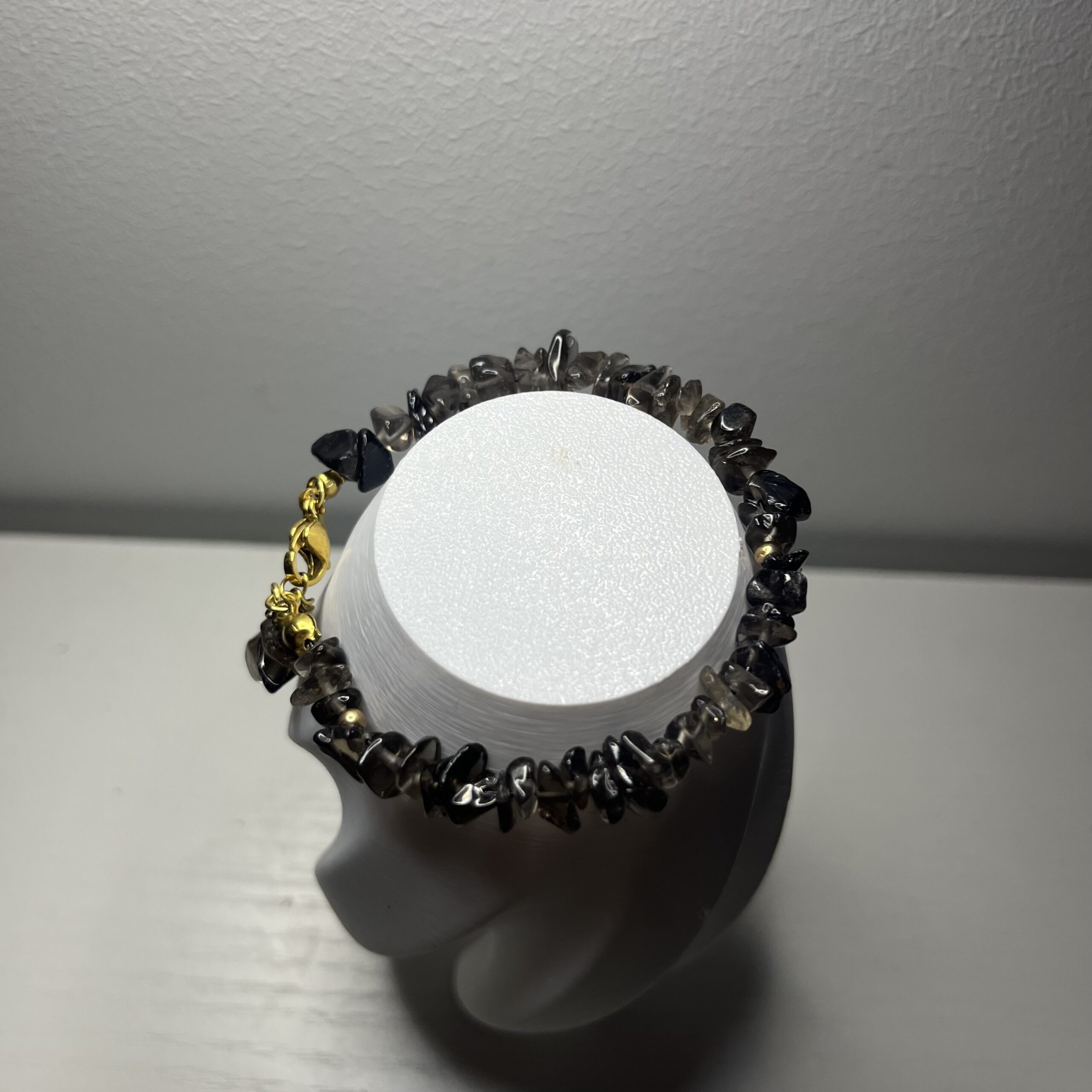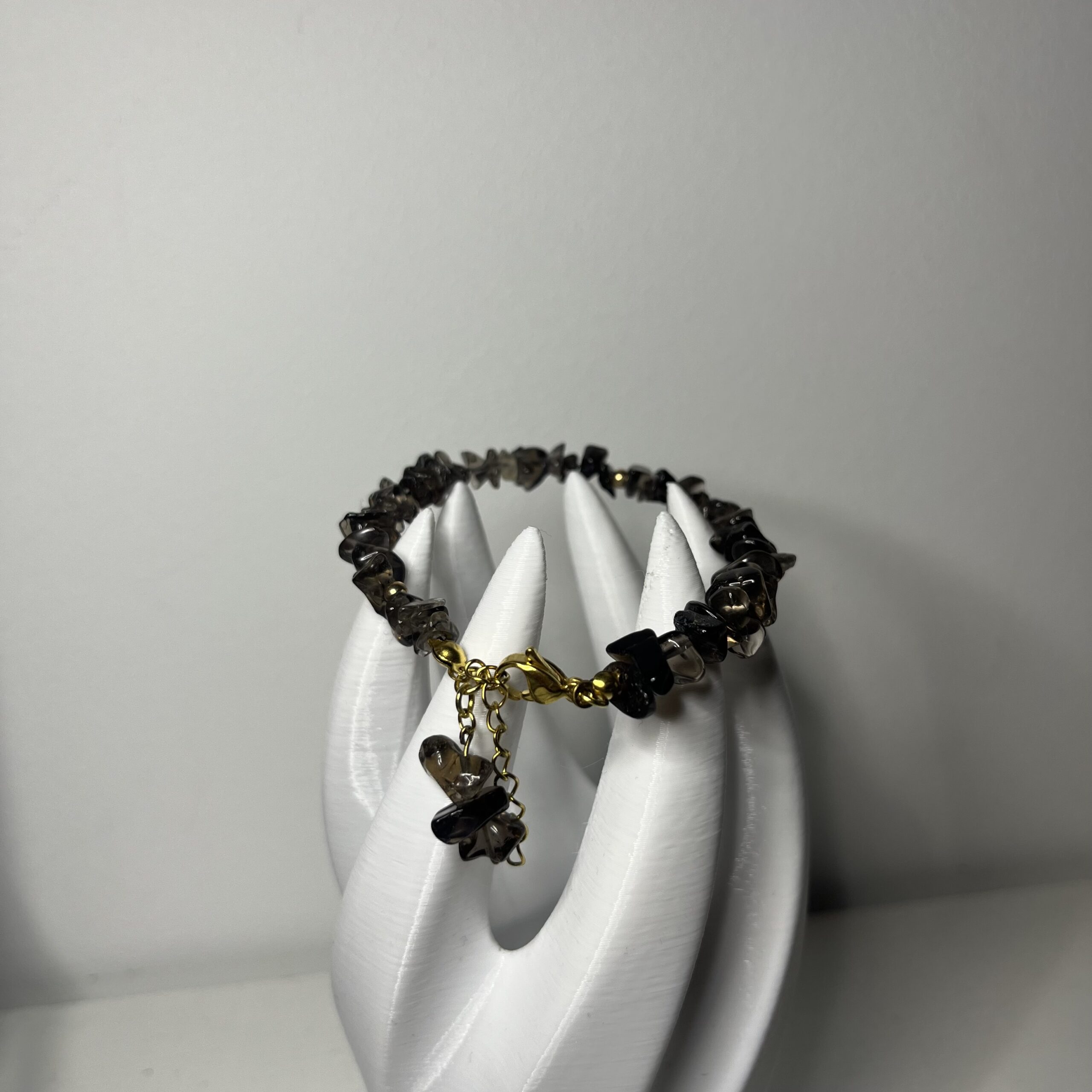 Odkryj piękno naturalnych kamieni z naszą bransoletką damską z kwarcu dymnego. Wykonana z drobnej sieczki kamienia naturalnego, ozdobiona złotymi przekładkami, które dodają całości subtelnego blasku i elegancji.