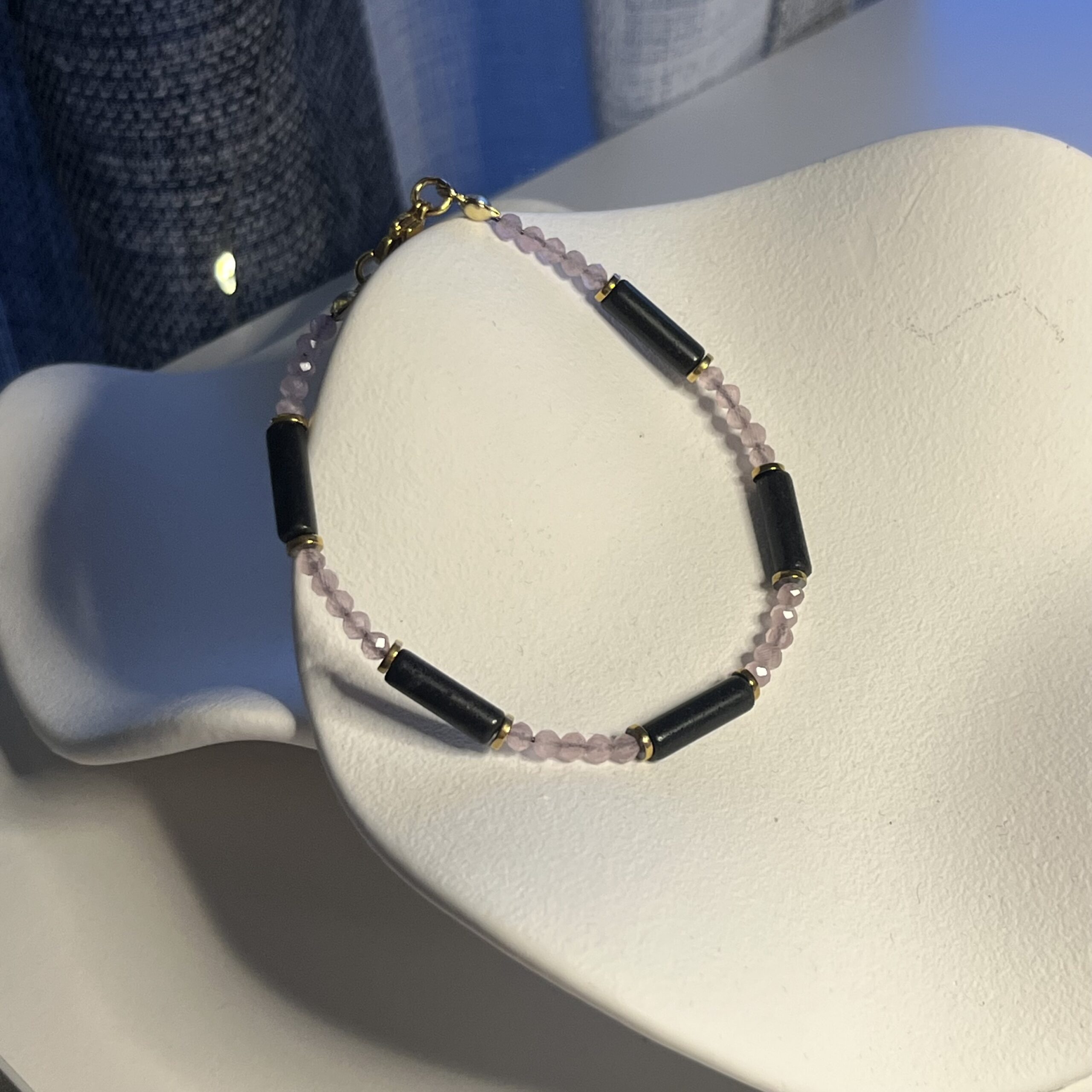 Bransoletka Soft Contrast to eleganckie połączenie delikatnego kwarcu i głębokiej czerni onyksu. Minimalistyczna forma podkreśla naturalne piękno kamieni, a złote przekładki dodają całości subtelnego, luksusowego akcentu.