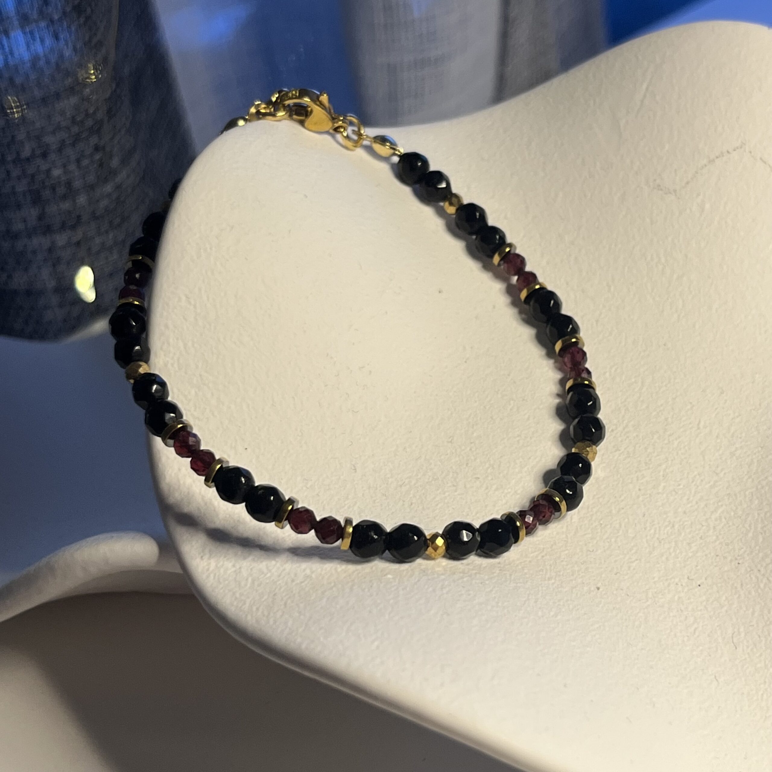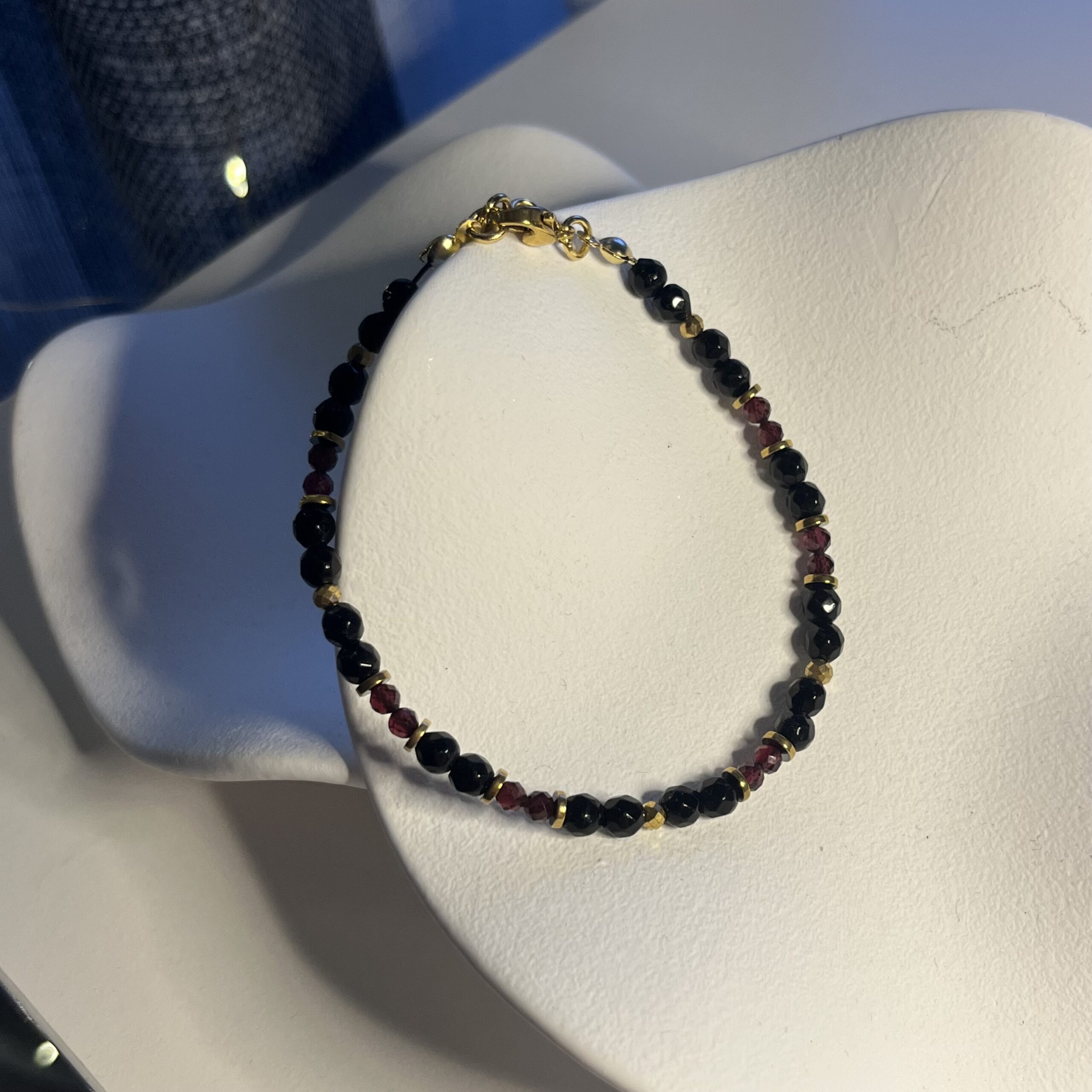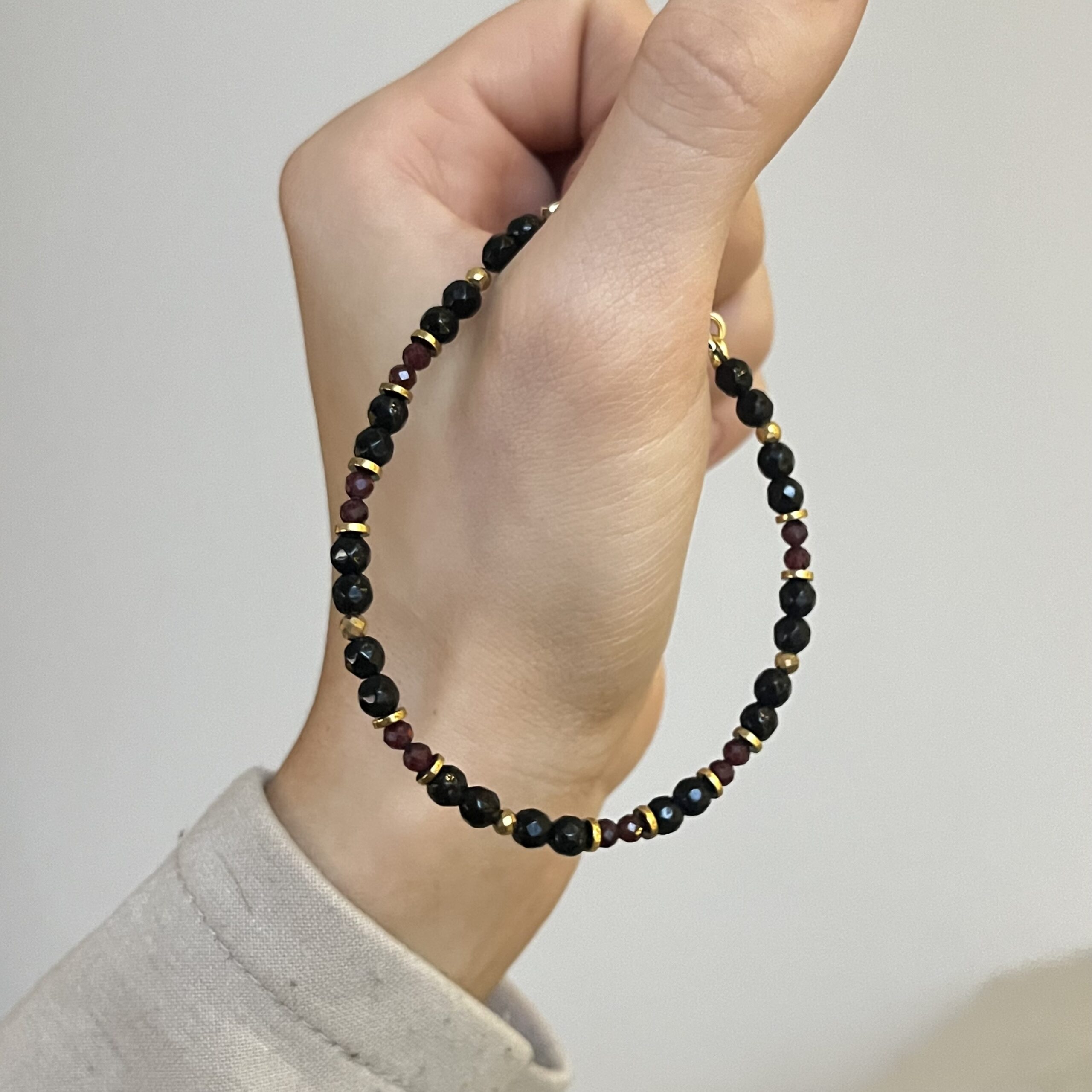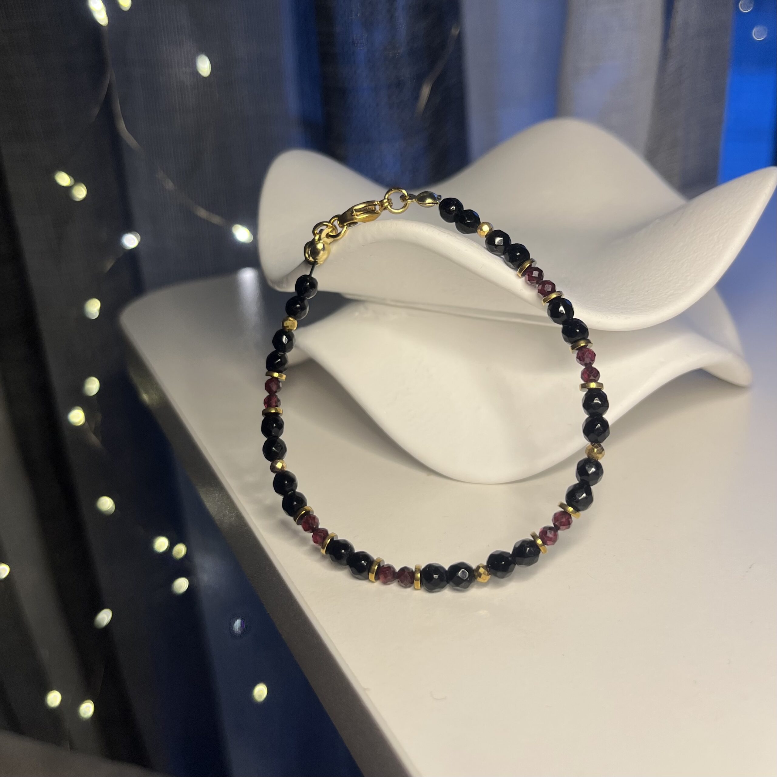Bransoletka Dark Desire to połączenie głębi czerni onyksu i intensywnej czerwieni granatu, które razem tworzą zmysłową, wyrazistą kompozycję. Fasetowane kulki pięknie odbijają światło, a złote przekładki dodają całości luksusowego charakteru.