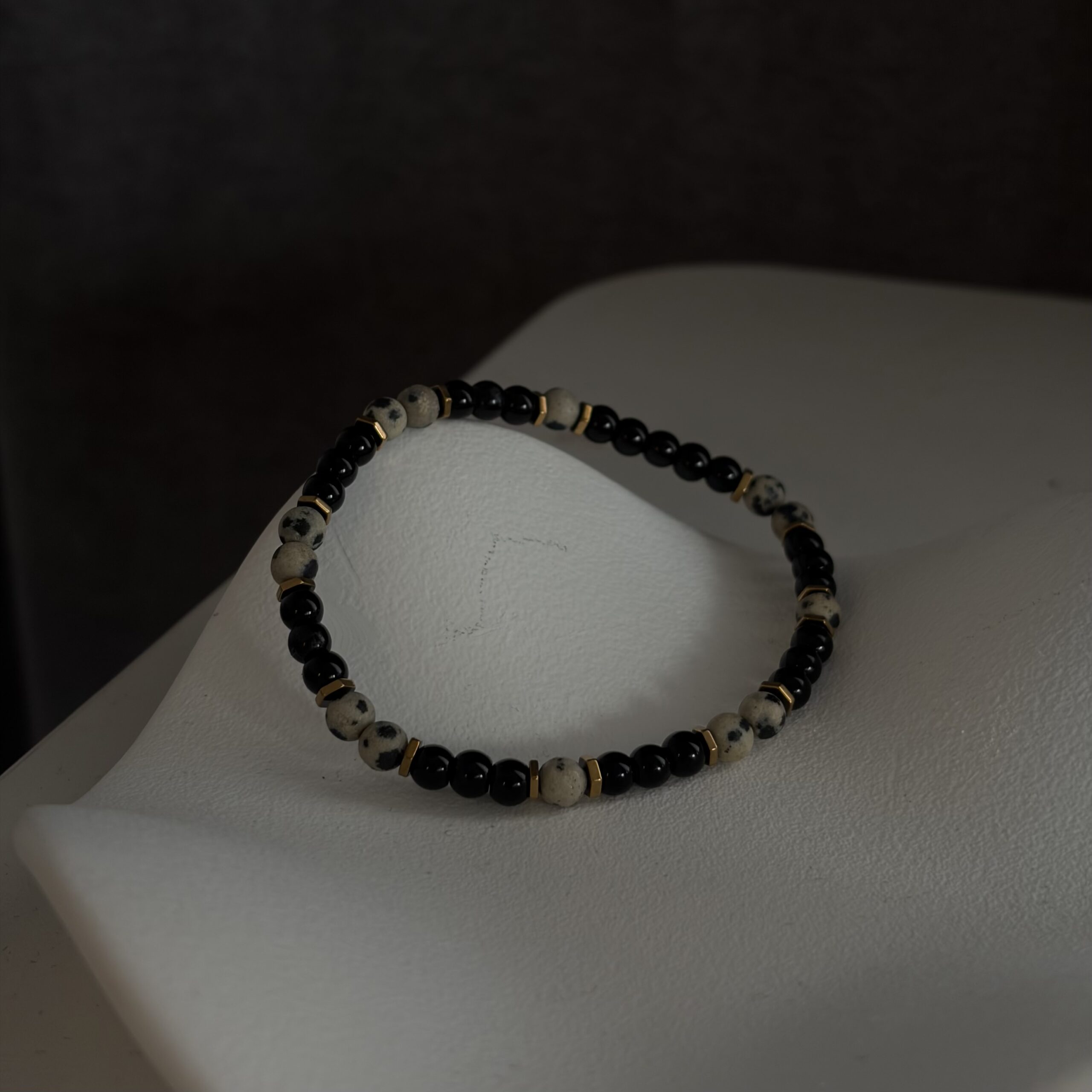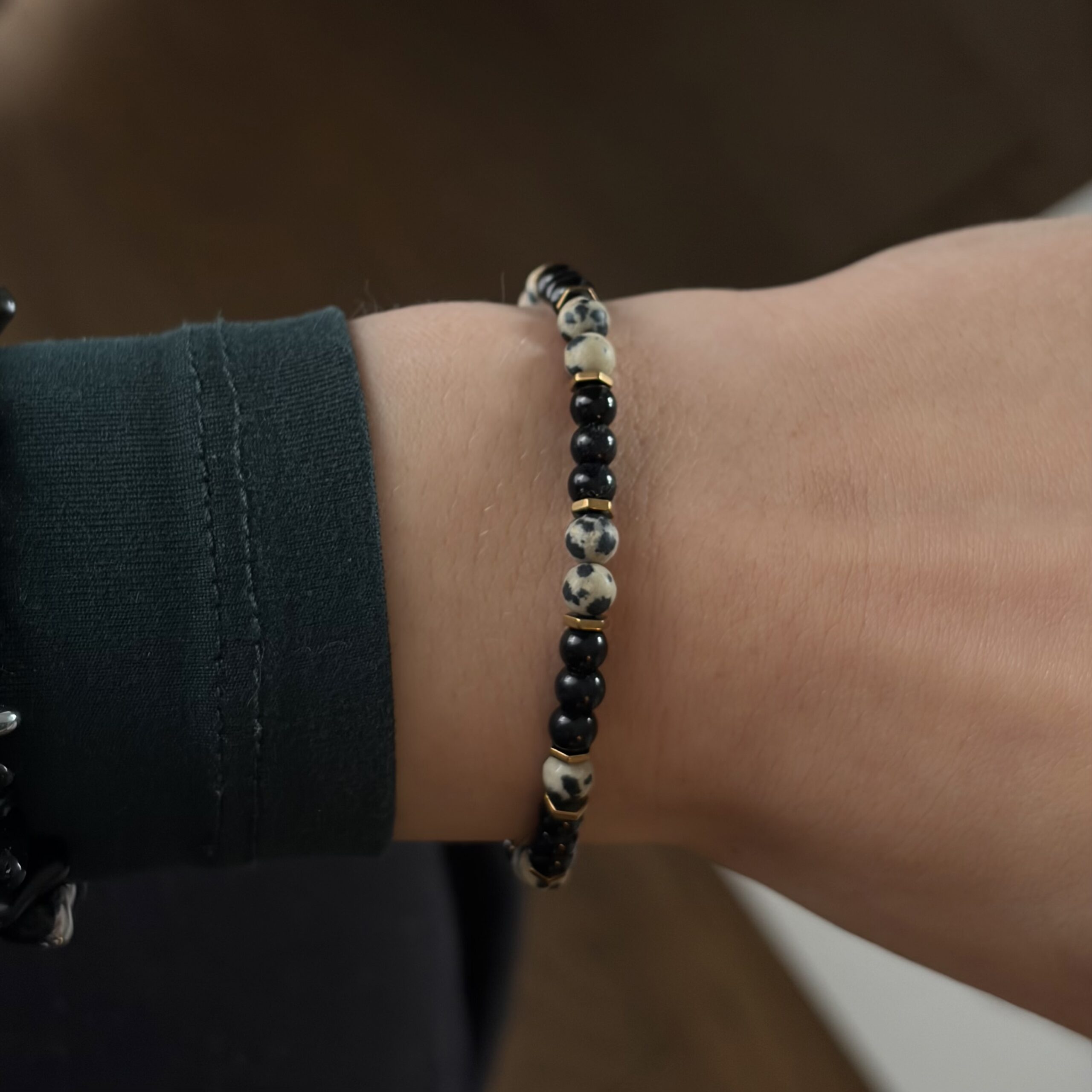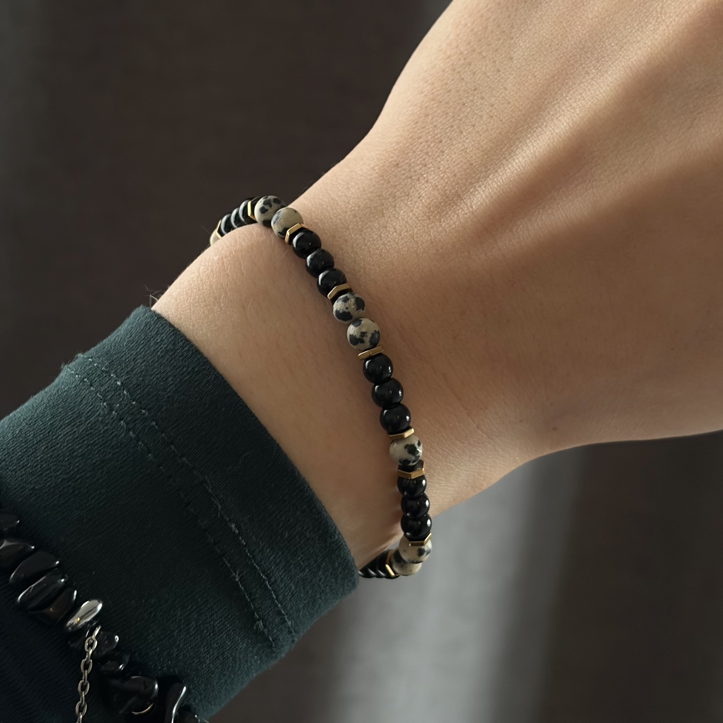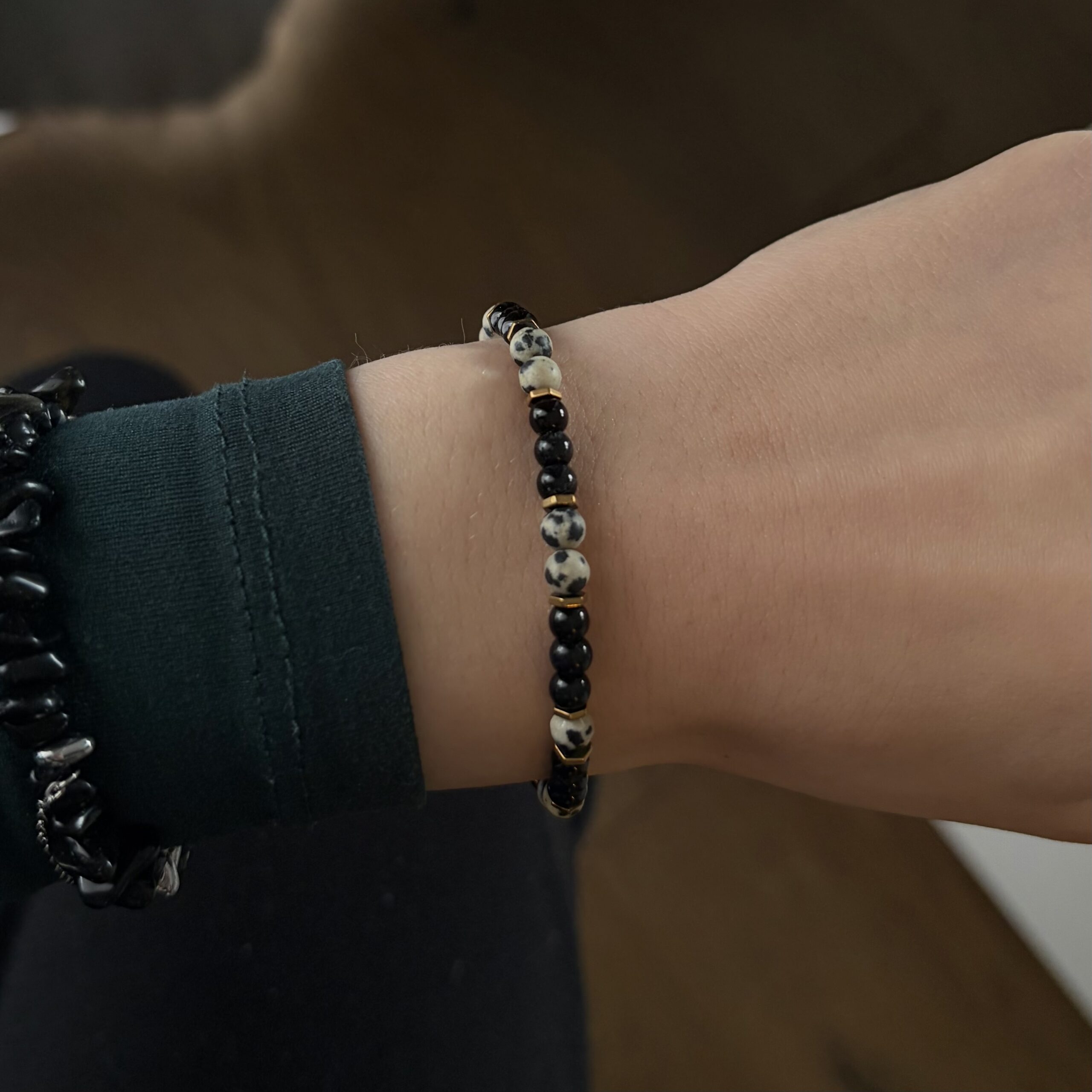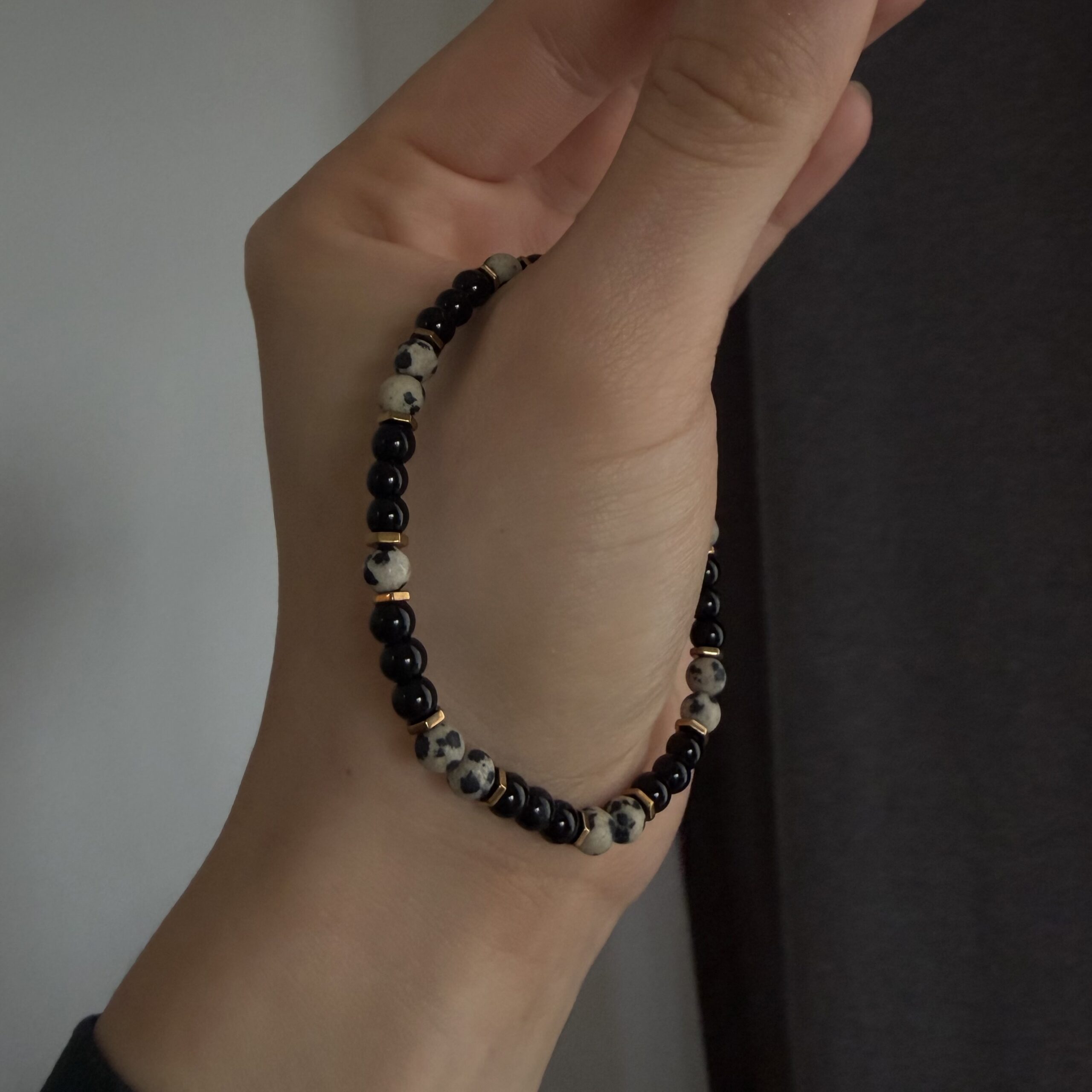 Ręcznie wykonana bransoletka z naturalnych kamieni: jaspisu dalmatyńskiego i głębokiego, czarnego onyksu. Całość uzupełniają złote przekładki z hematytu, które dodają subtelnego blasku i nowoczesnego charakteru. Elastyczna forma sprawia, że bransoletka idealnie dopasowuje się do nadgarstka i jest wygodna w codziennym noszeniu.