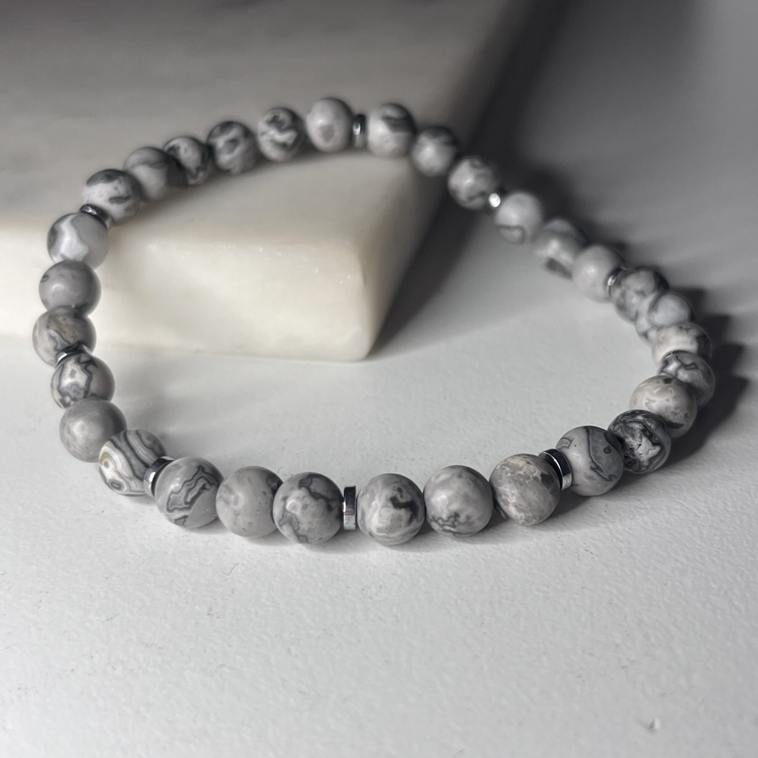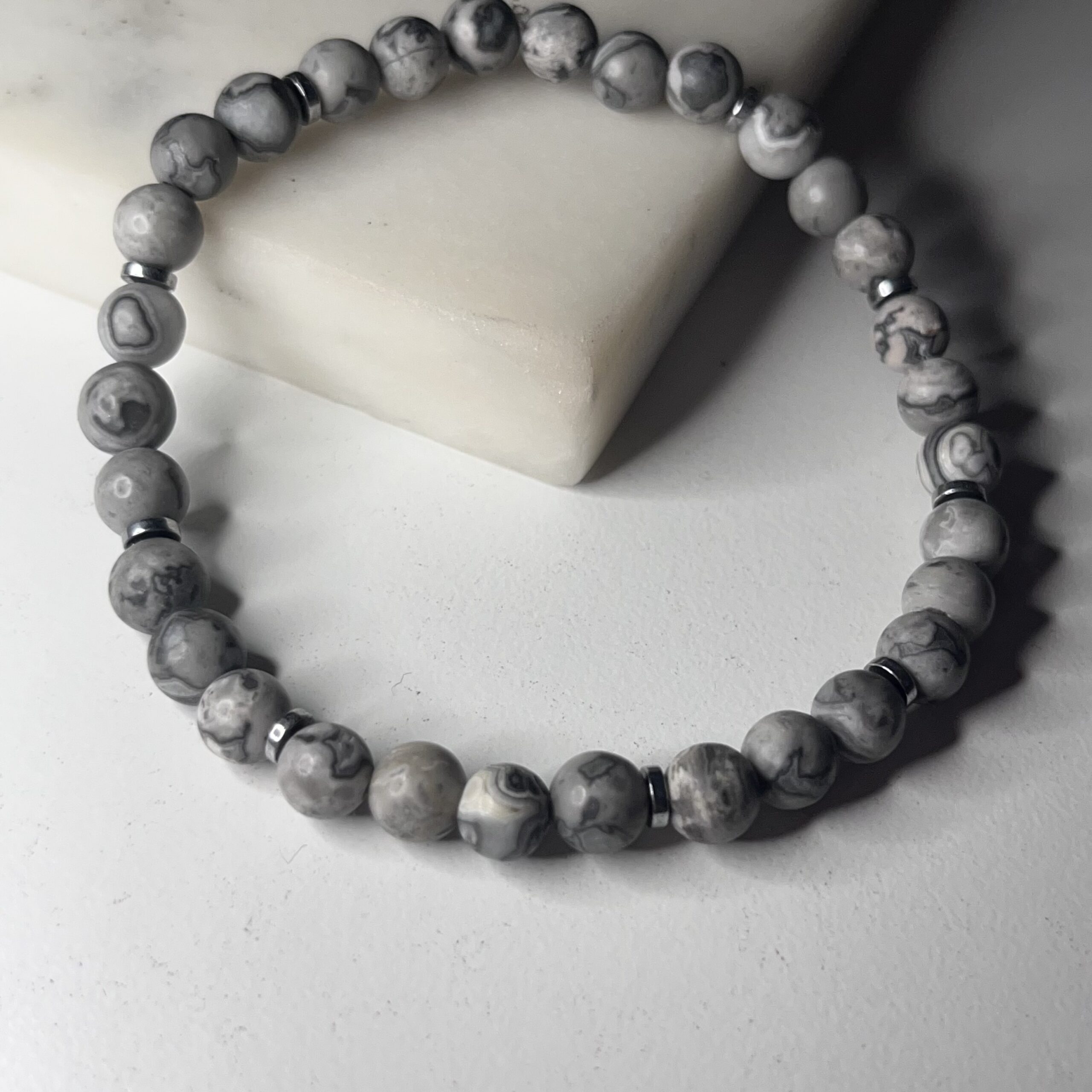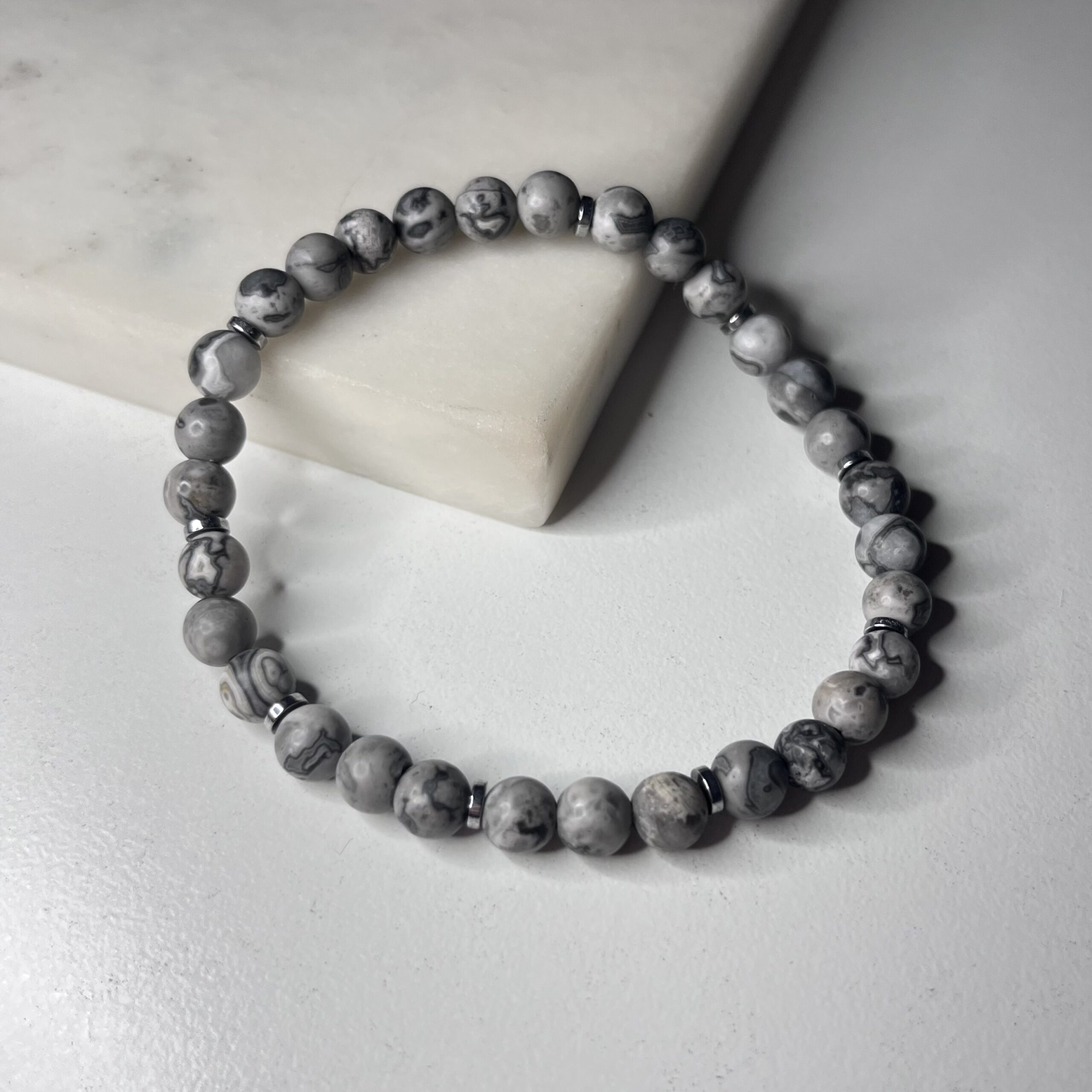 Bransoletka wykonana z jaspisu szarego matowego ze srebrnymi przekładkami