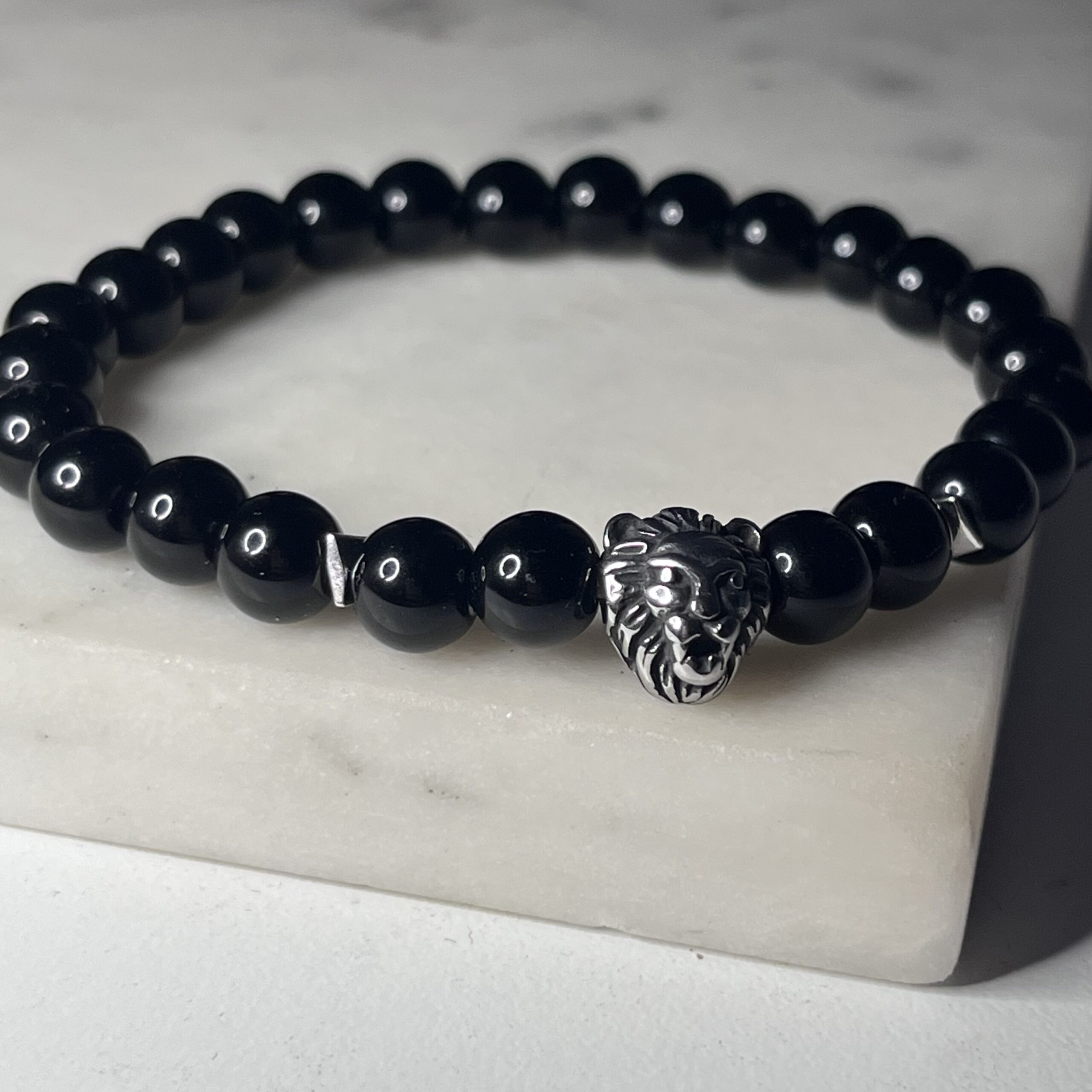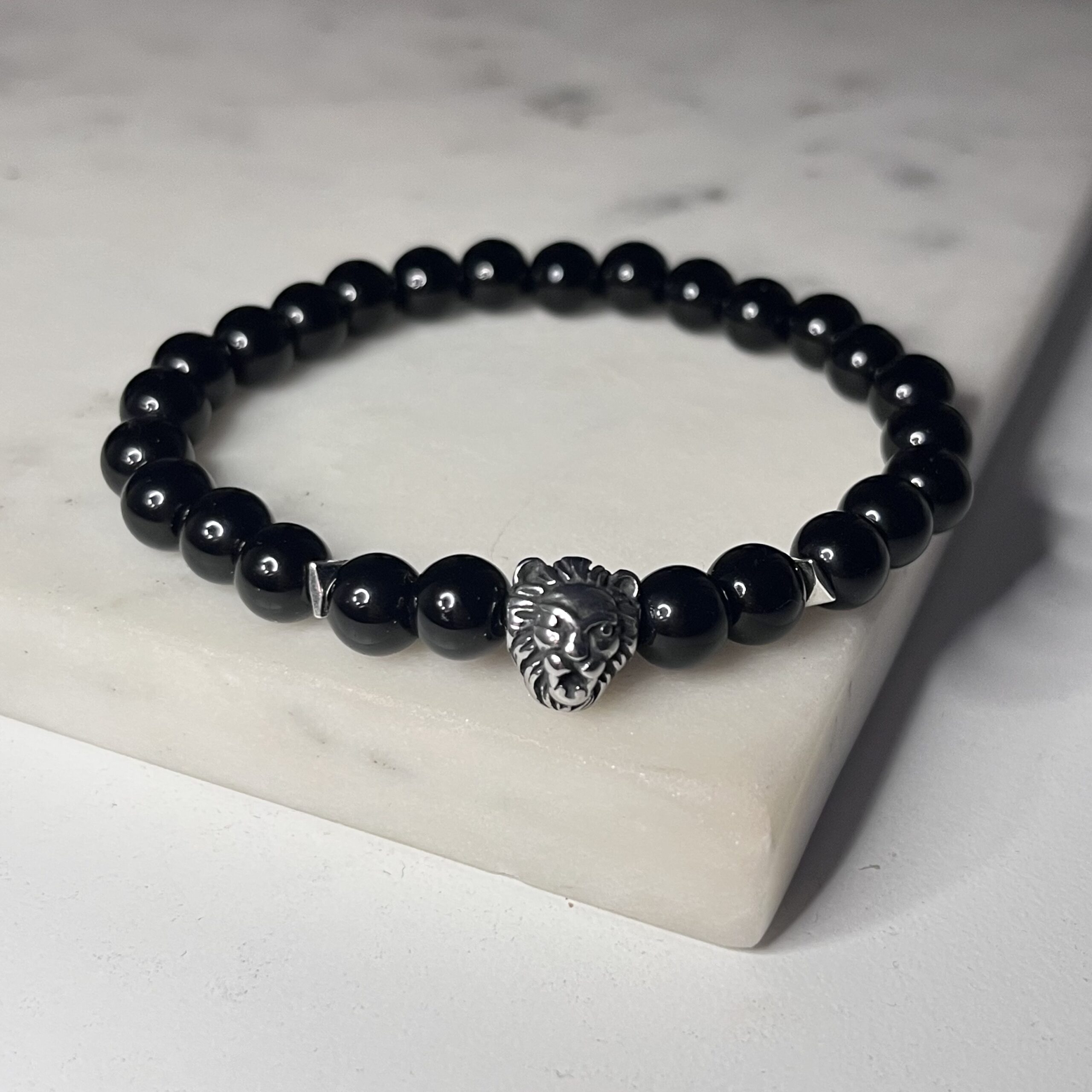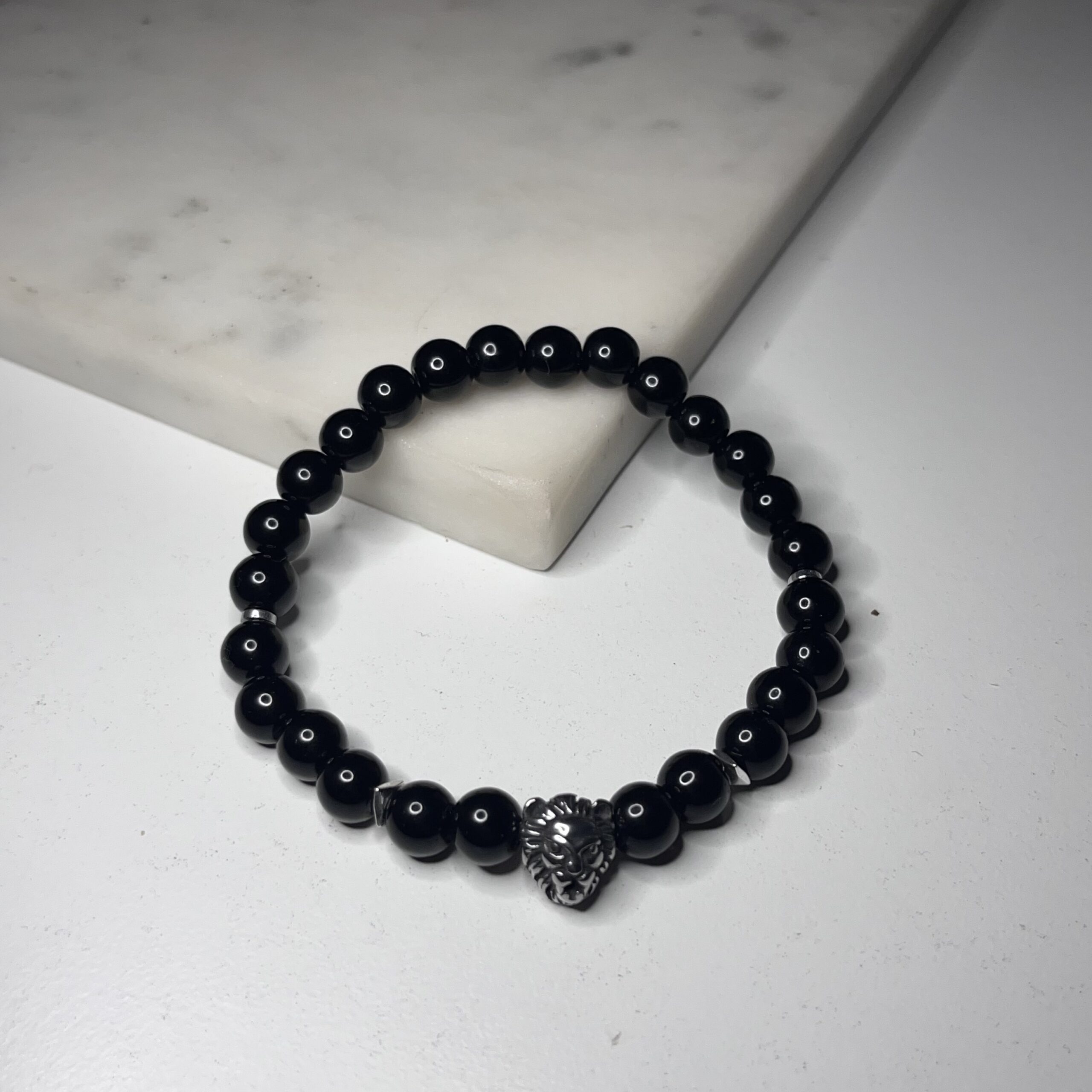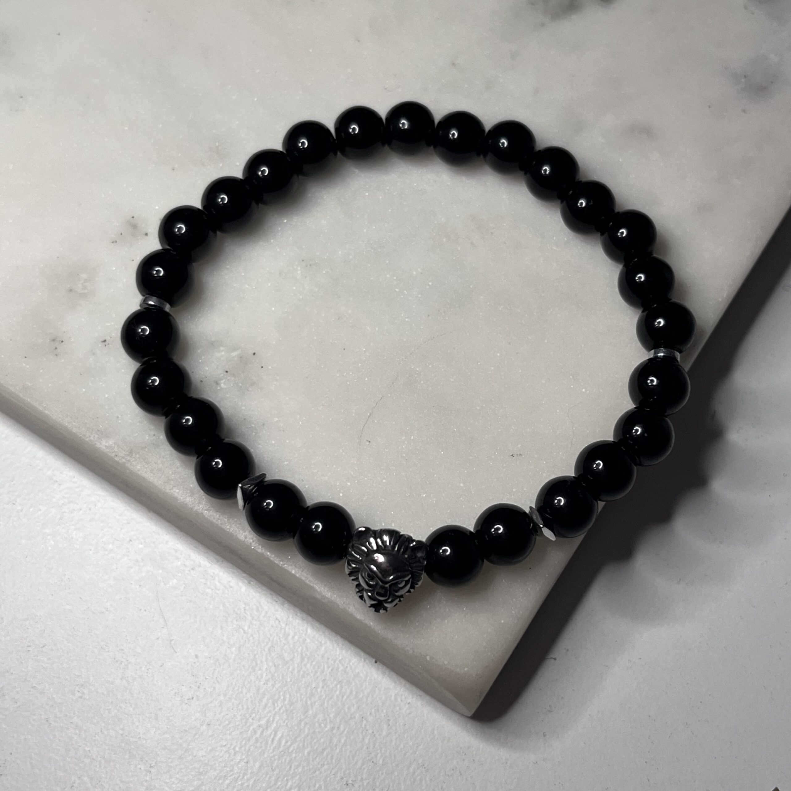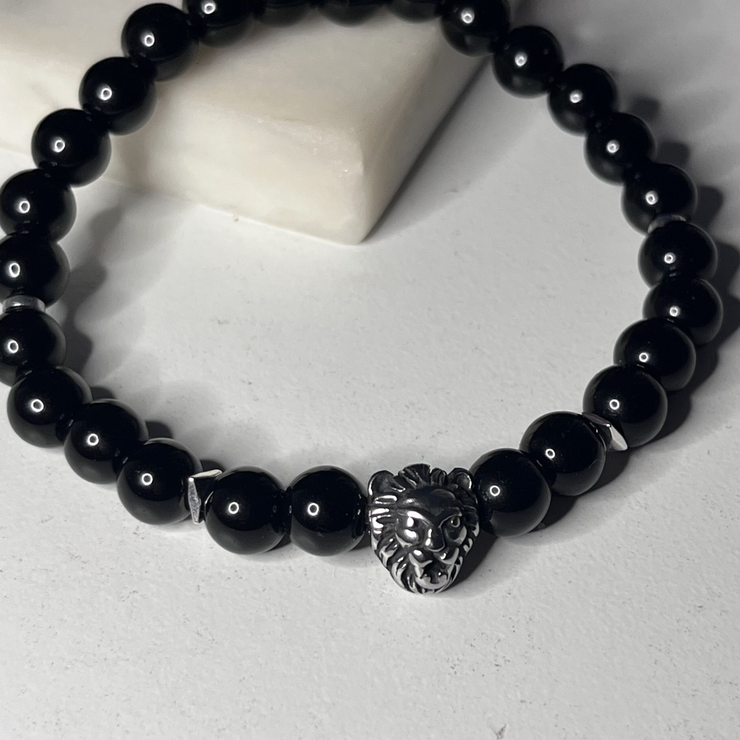 Bransoletka wykonana z onyksu, srebrnych przekładek i lwa