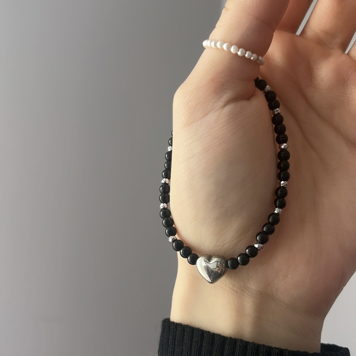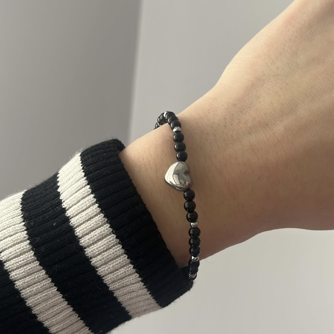 Piękna bransoletka wykonana z onyksu i srebrnych dodatków. Srebrne serduszko dodaje jej romantycznego charakteru