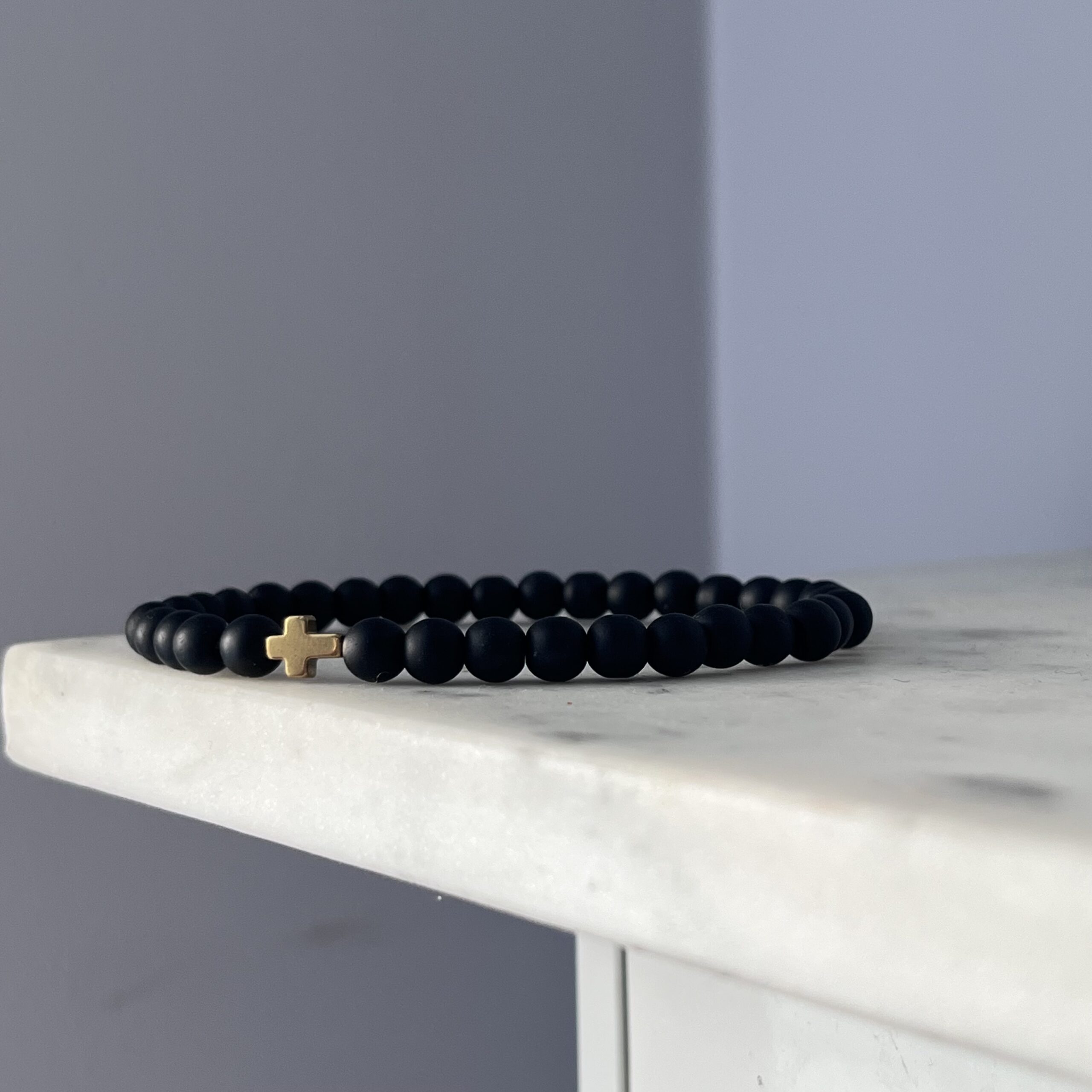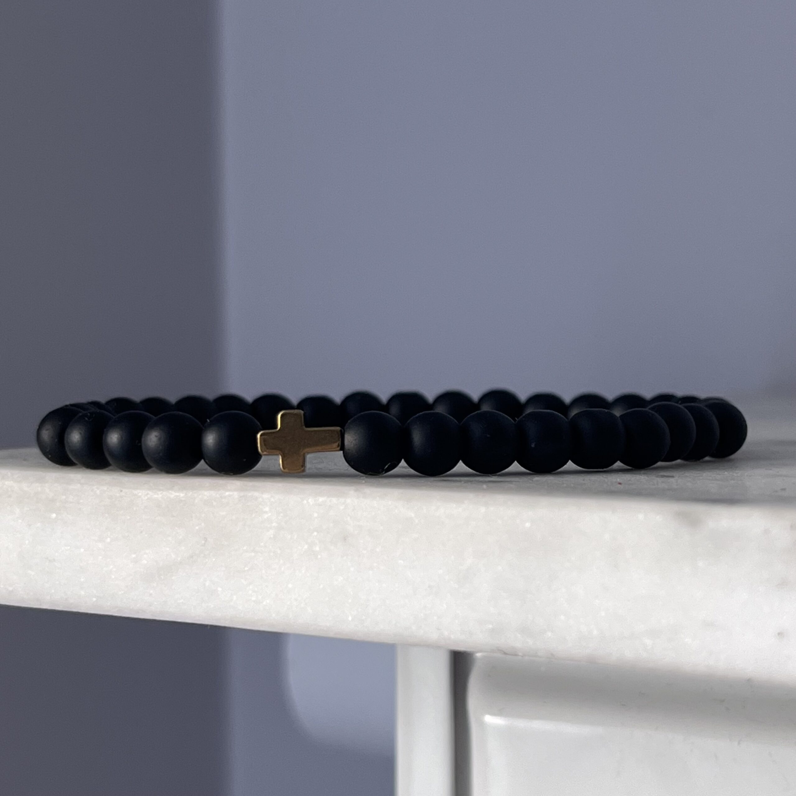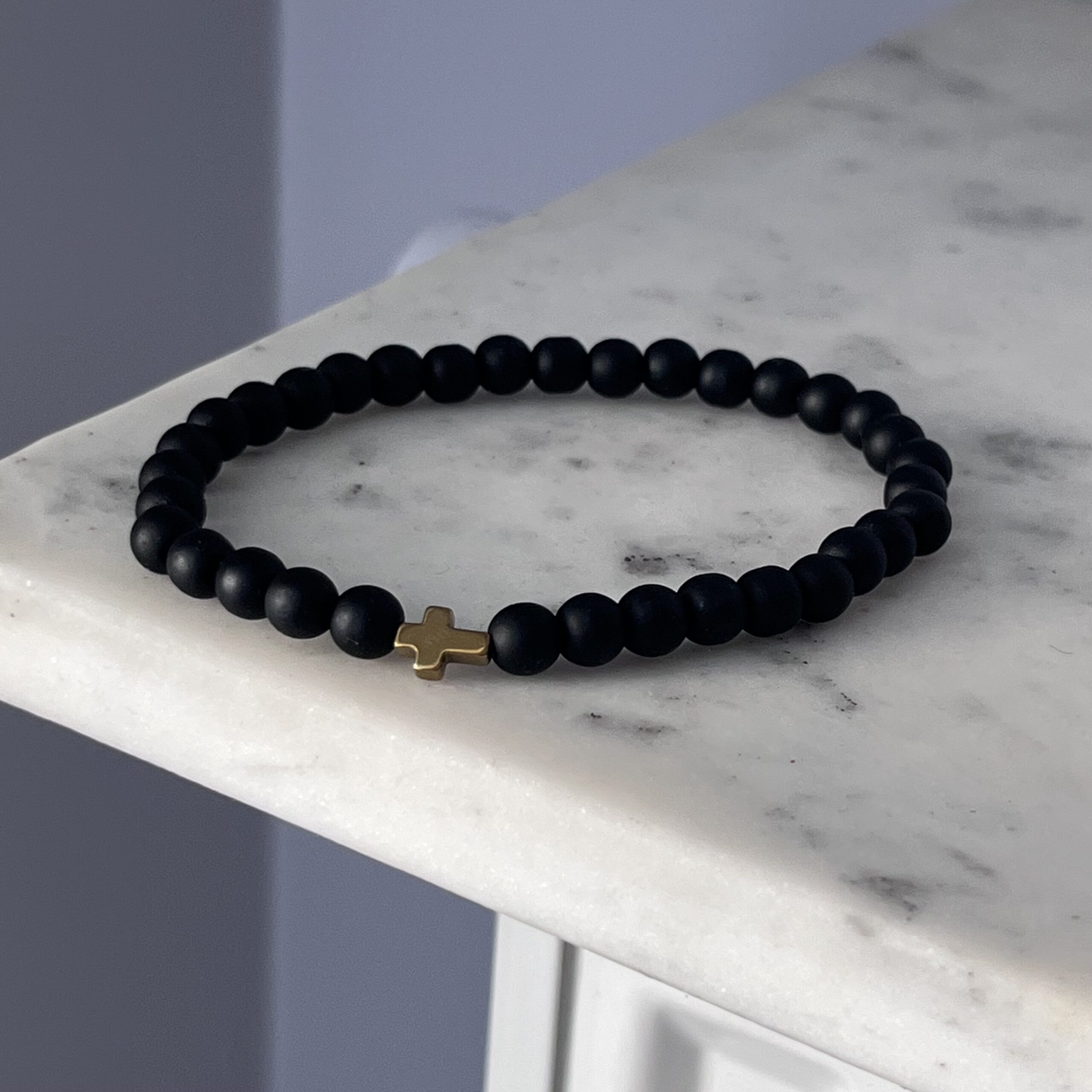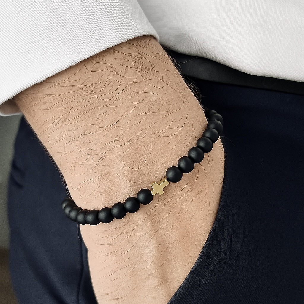 Ta ręcznie wykonana męska bransoletka została stworzona z matowych koralików onyksu, które nadają jej elegancki, stonowany wygląd. Centralnym elementem ozdobnym jest złoty krzyż – subtelny, ale wyrazisty akcent symboliczny, który dodaje całości wyjątkowego charakteru. Koraliki zostały nawleczone na wytrzymałą, elastyczną gumkę, dzięki czemu bransoletka dopasowuje się komfortowo do nadgarstka. To połączenie minimalizmu, klasy i duchowego przesłania – idealne dla mężczyzny ceniącego prostotę z głębią znaczenia. Doskonale komponuje się zarówno z codziennym stylem, jak i bardziej formalnym ubiorem.