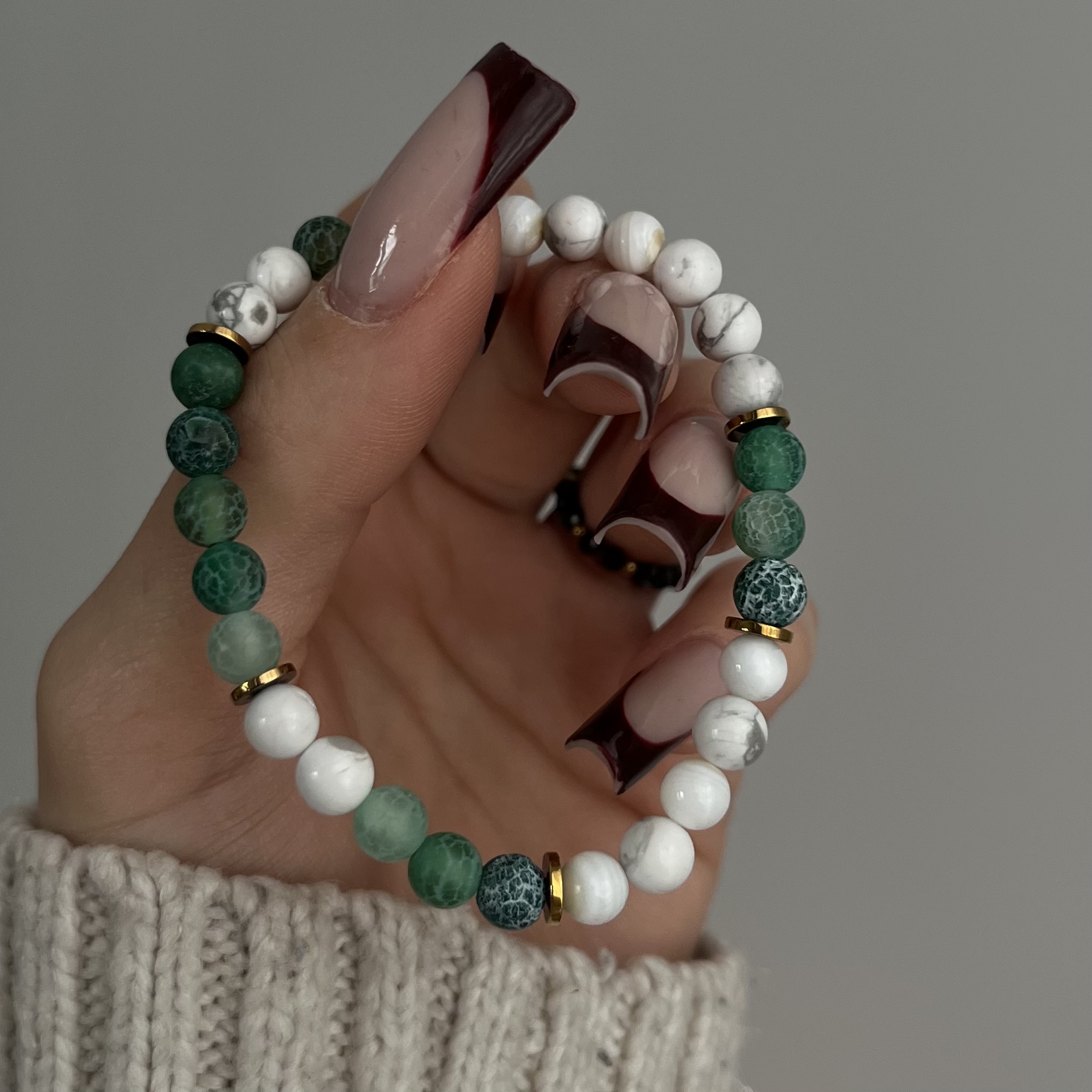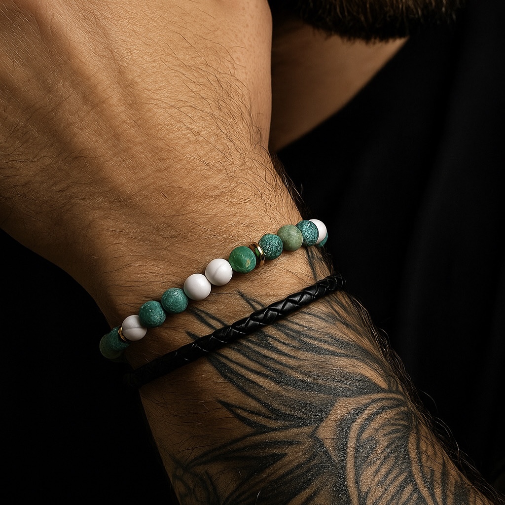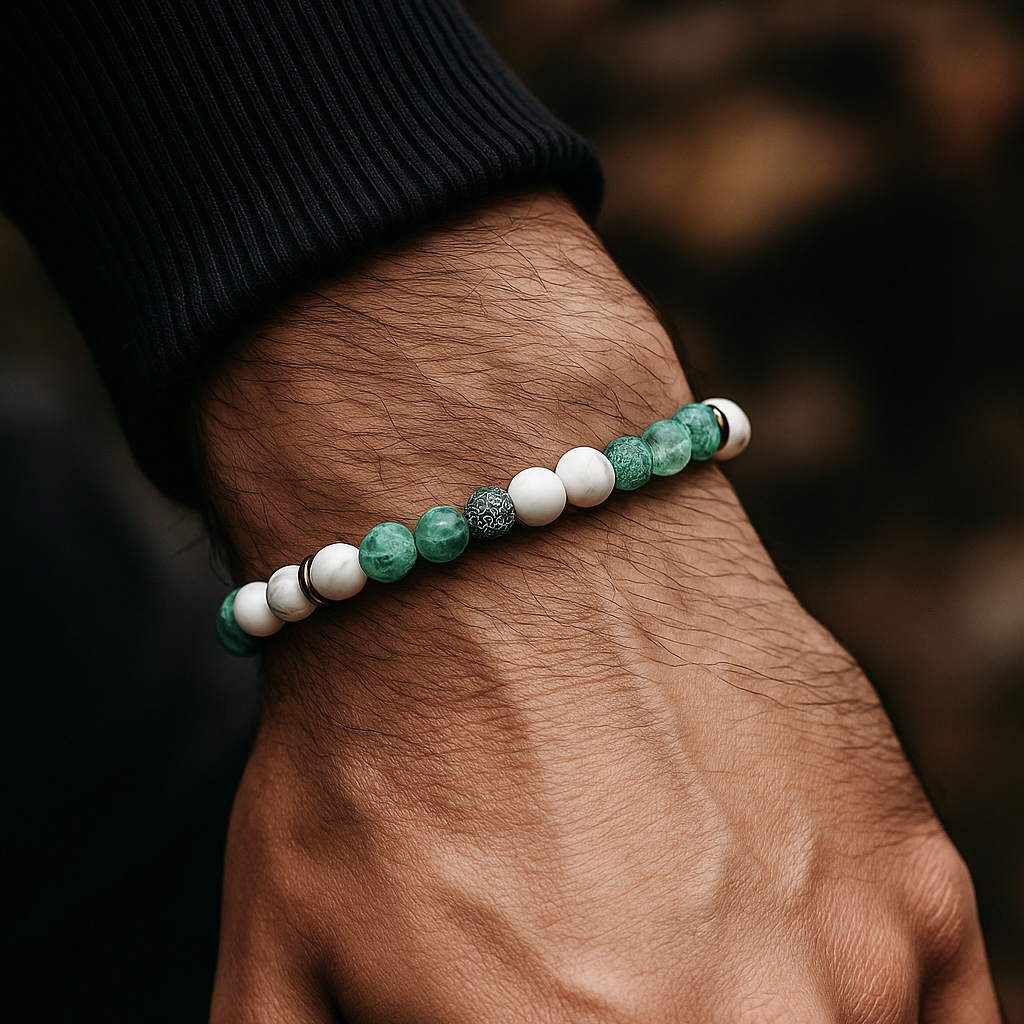 Męska bransoletka wykonana z połączenia białego howlitu i zielonego agatu, wzbogacona subtelnymi złotymi przekładkami. Naturalne kamienie tworzą elegancki kontrast: howlit wprowadza spokojną, jasną harmonię, a matowy, zielony agat dodaje całości głębi i męskiego charakteru.