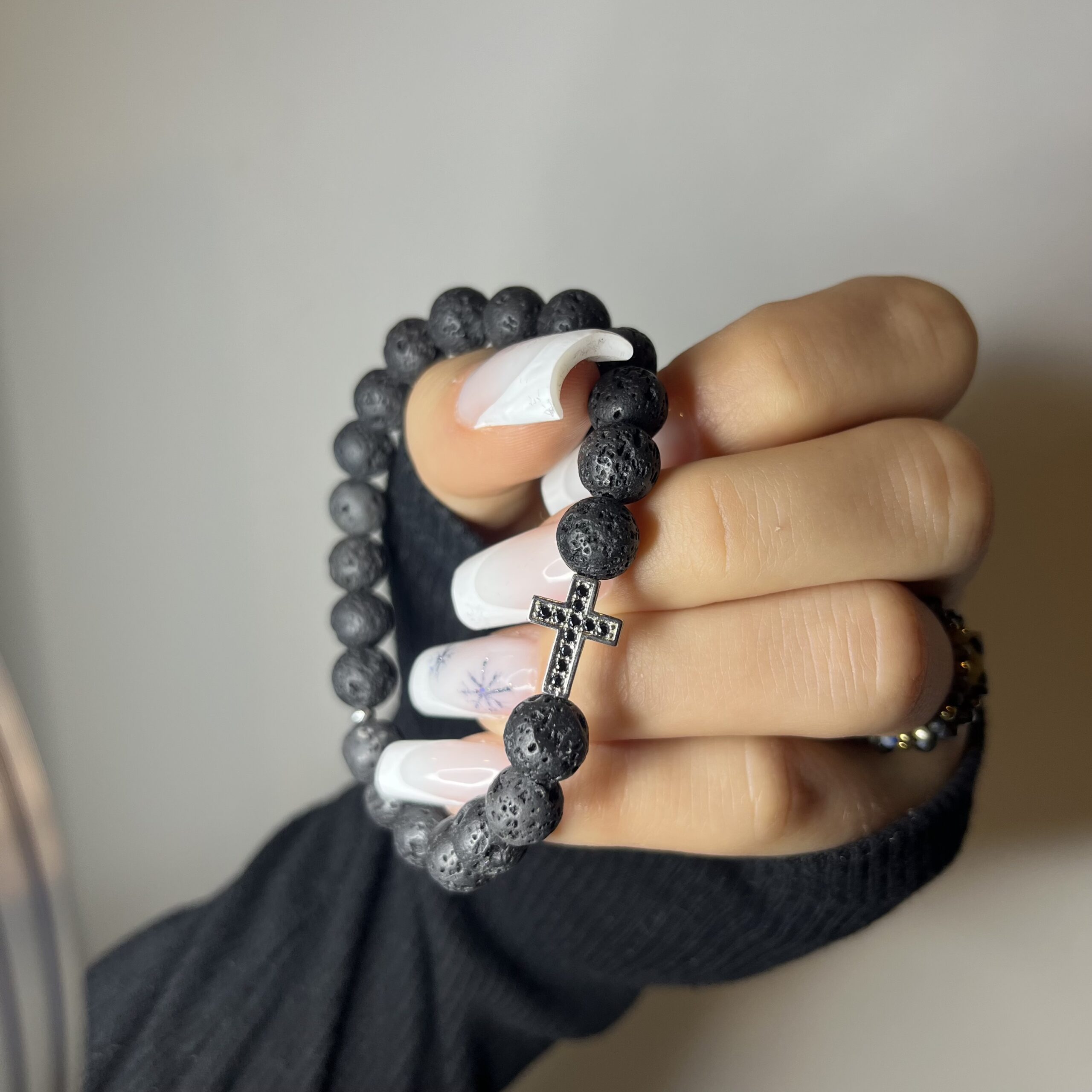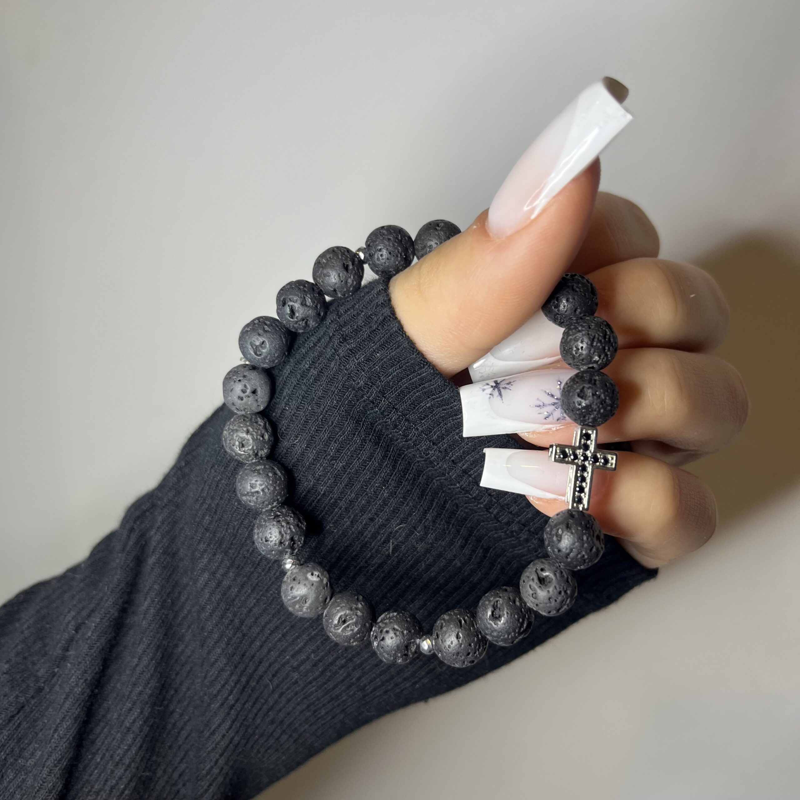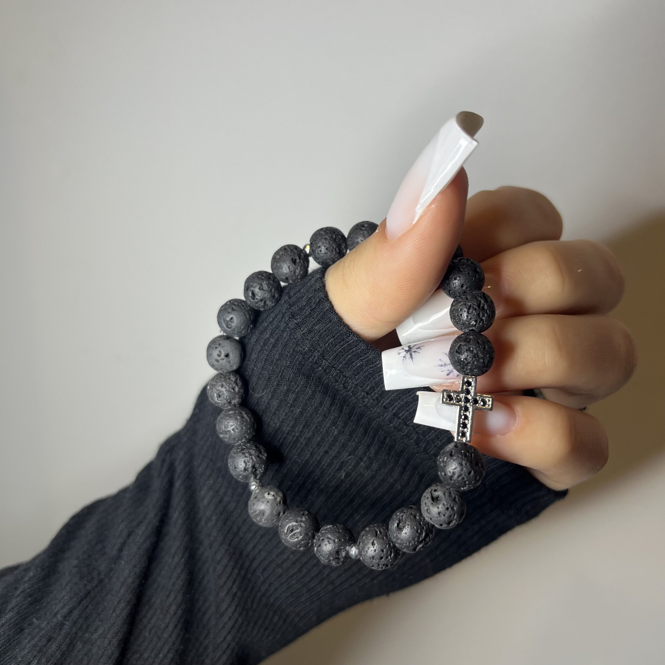 Bransoletka wykonana jest na wytrzymałej gumce jubilerskiej, dzięki czemu wygodnie dopasowuje się do nadgarstka. Porowata struktura lawy wulkanicznej kontrastuje z gładkimi przekładkami z hematytu w kolorze srebra, które dodają całości nowoczesnego, eleganckiego wykończenia. Metalowy krzyż podkreśla minimalistyczny, a jednocześnie symboliczny charakter biżuterii.