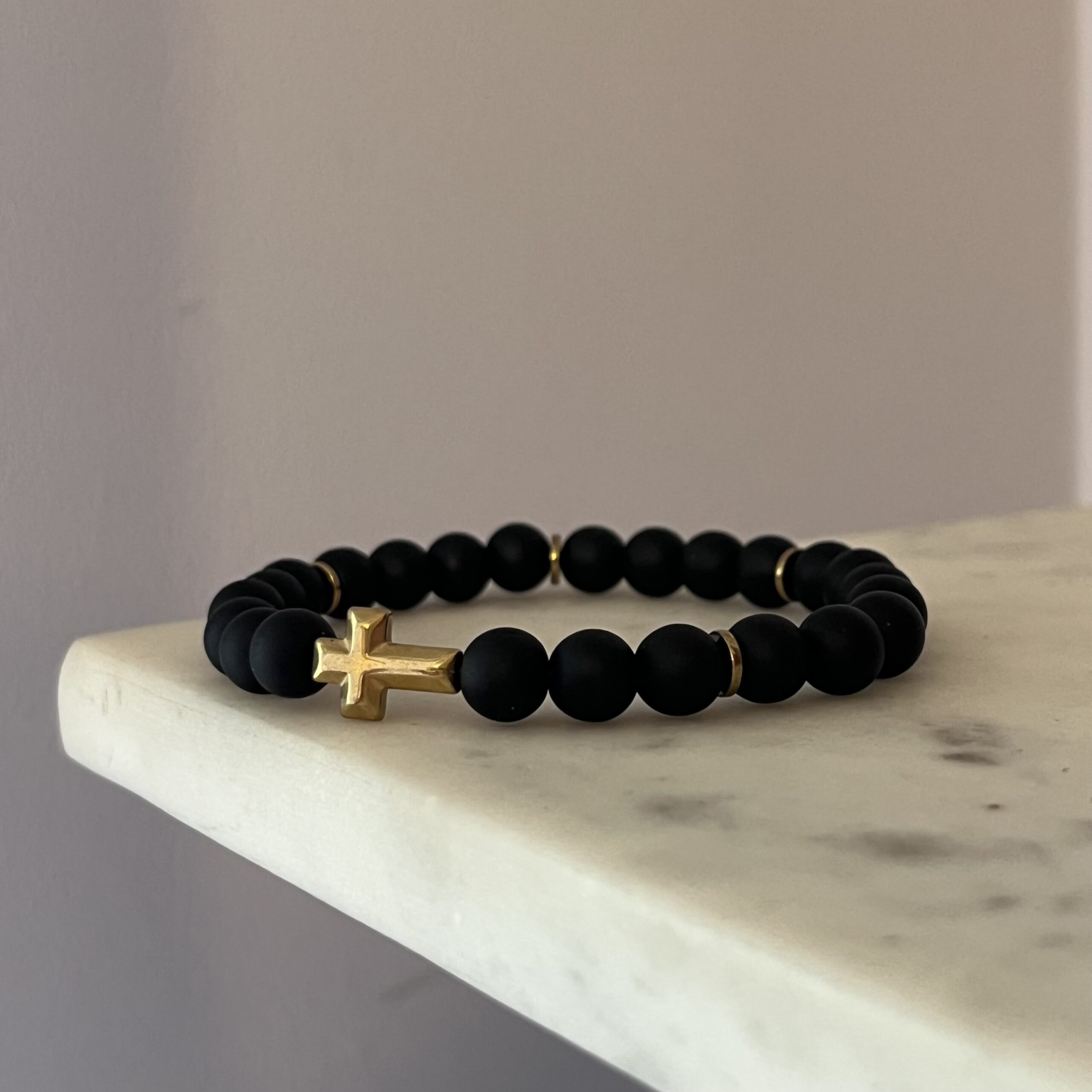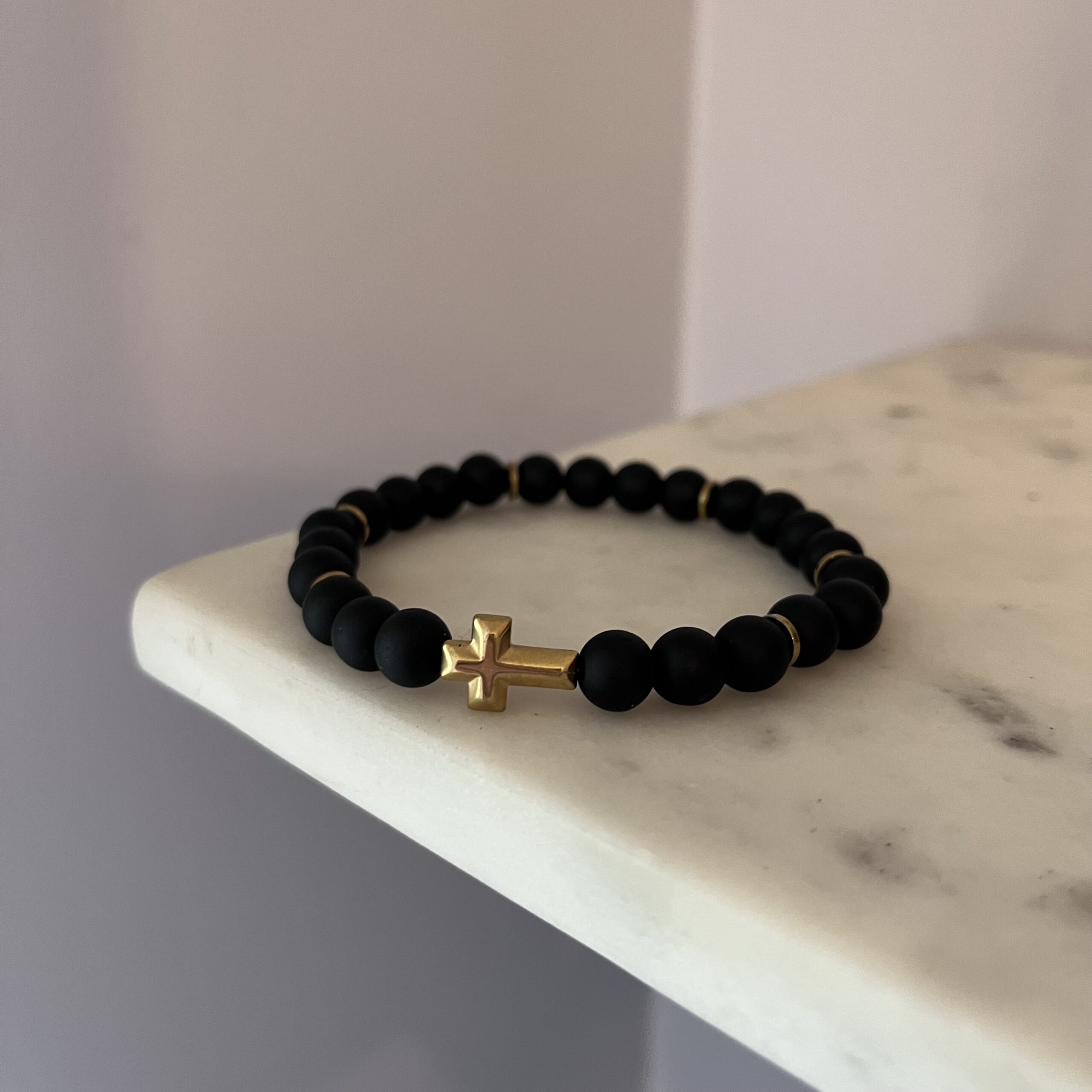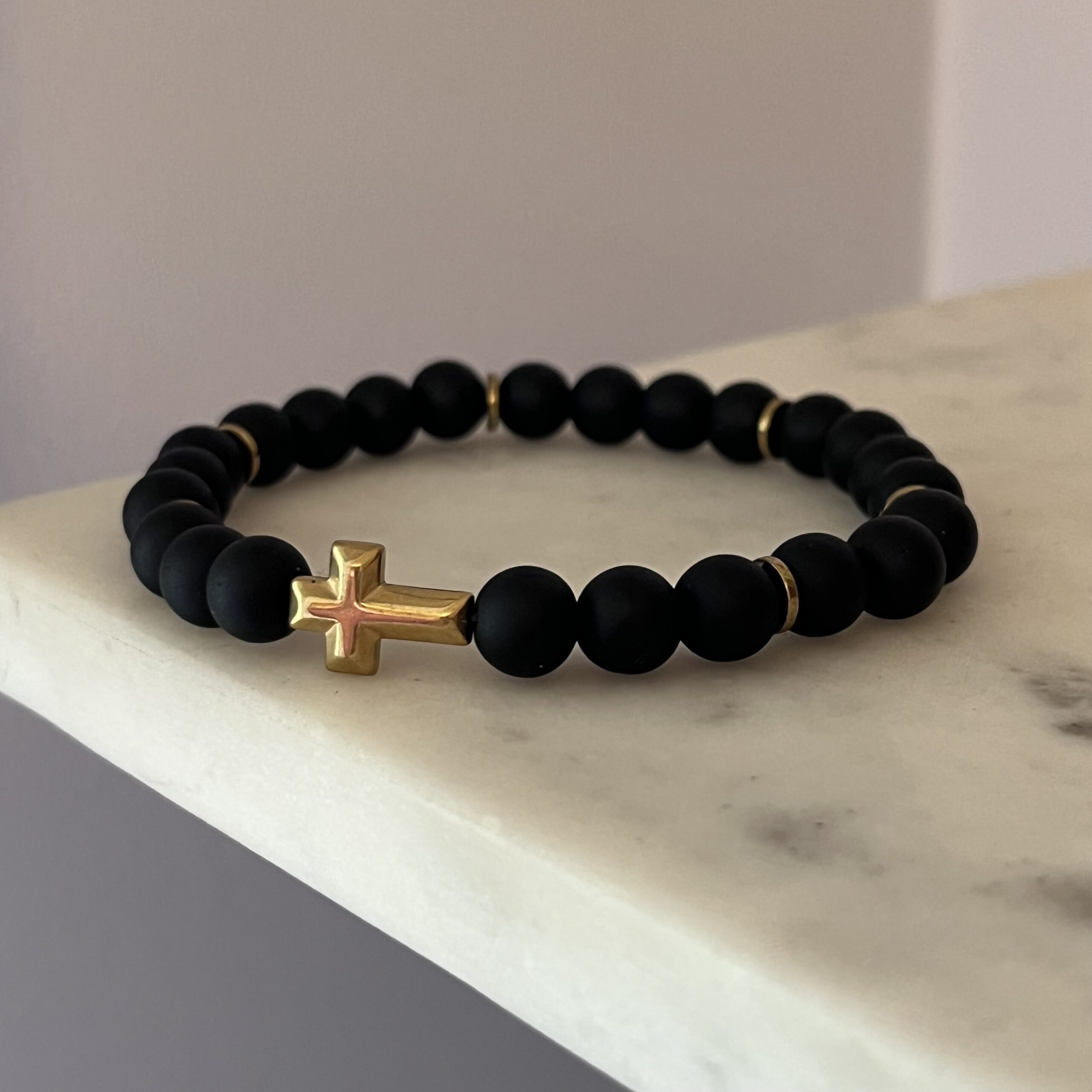 Męska elastyczna bransoletka wykonana z matowego onyksu to elegancka i nowoczesna ozdoba, która doskonale łączy subtelność z męskością. Kamienie onyksu w klasycznym, głębokim odcieniu czerni nadają jej wyjątkowego charakteru, a matowe wykończenie podkreśla prostotę i stonowaną elegancję. Złote przekładki w formie drobnych elementów ozdobnych wprowadzają subtelną, ale wyraźną nutę luksusu, natomiast centralny element – krzyżyk w złotym kolorze – dodaje bransoletce głębszego symbolicznego znaczenia. Dzięki elastycznej konstrukcji, bransoletka łatwo dopasowuje się do nadgarstka, oferując wygodę noszenia na co dzień. To połączenie klasyki z nowoczesnym designem sprawia, że jest idealnym wyborem zarówno na codzienne stylizacje, jak i bardziej formalne okazje.