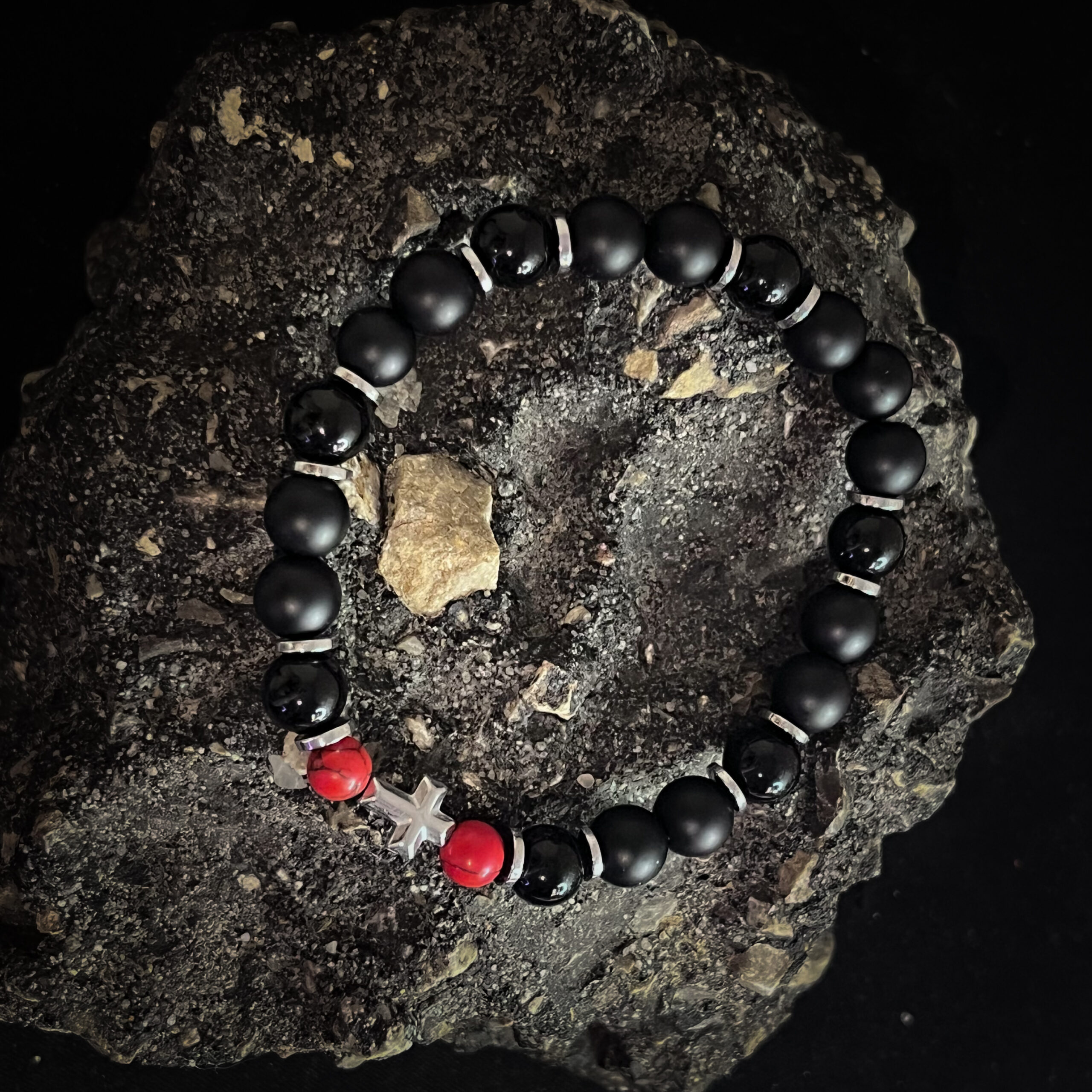 Bransoletka męska czerwono czarna z krzyżykiem