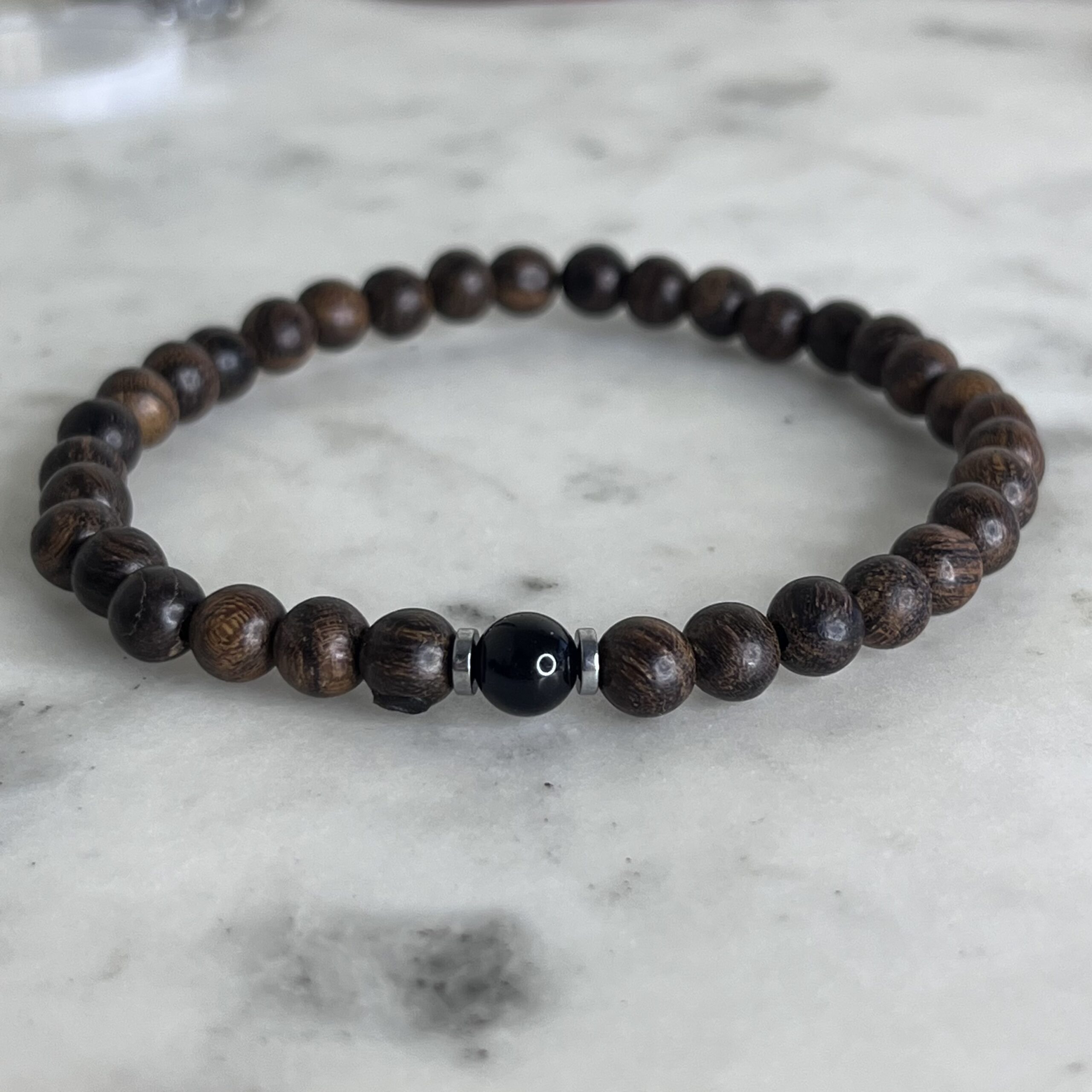 Bransoletka męska elastyczna wykonana z drewna egzotycznego i onyksu