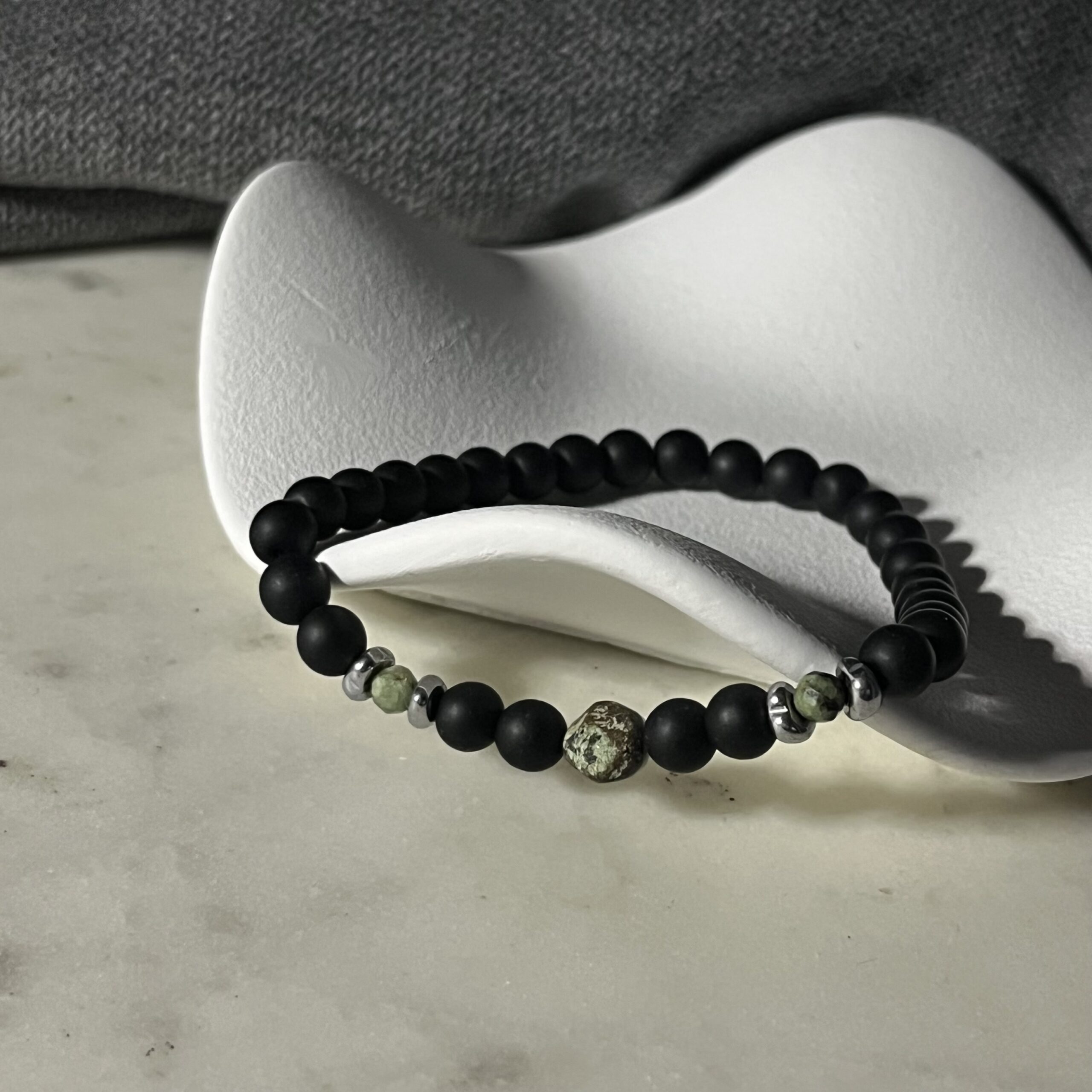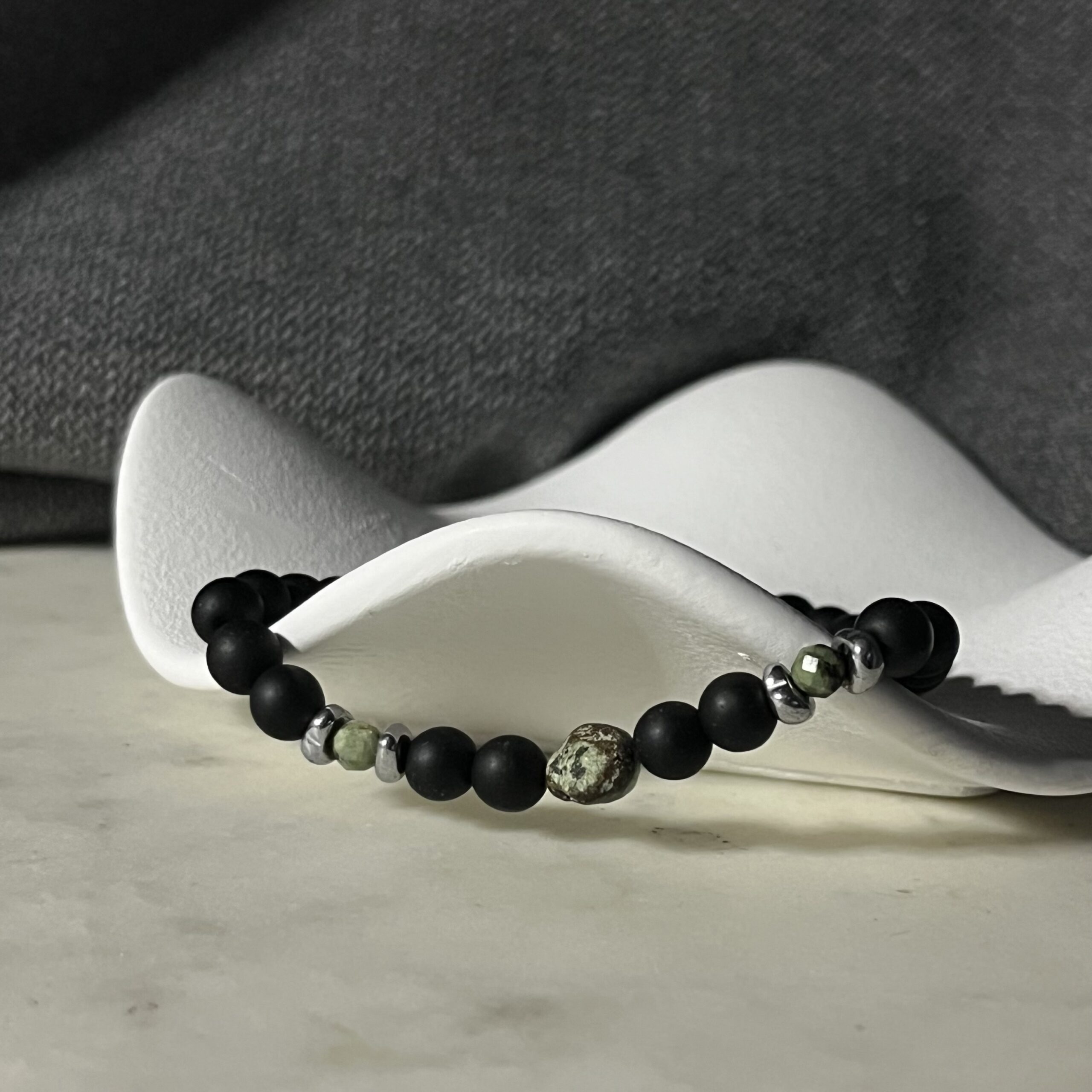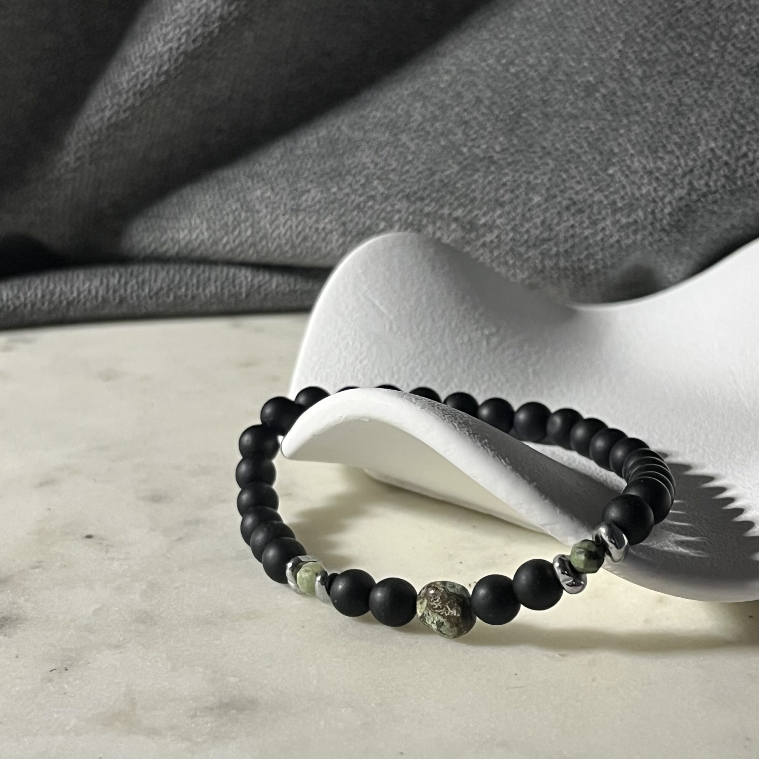 Onyks symbolizuje siłę i pewność siebie, natomiast turkus afrykański przyciąga dobrą energię i wspiera intuicję. Hematytowe przekładki dodają całości nowoczesnego, minimalistycznego charakteru. Bransoletka jest elastyczna, wygodnie dopasowuje się do nadgarstka i świetnie sprawdzi się zarówno na co dzień, jak i do bardziej eleganckich stylizacji.
