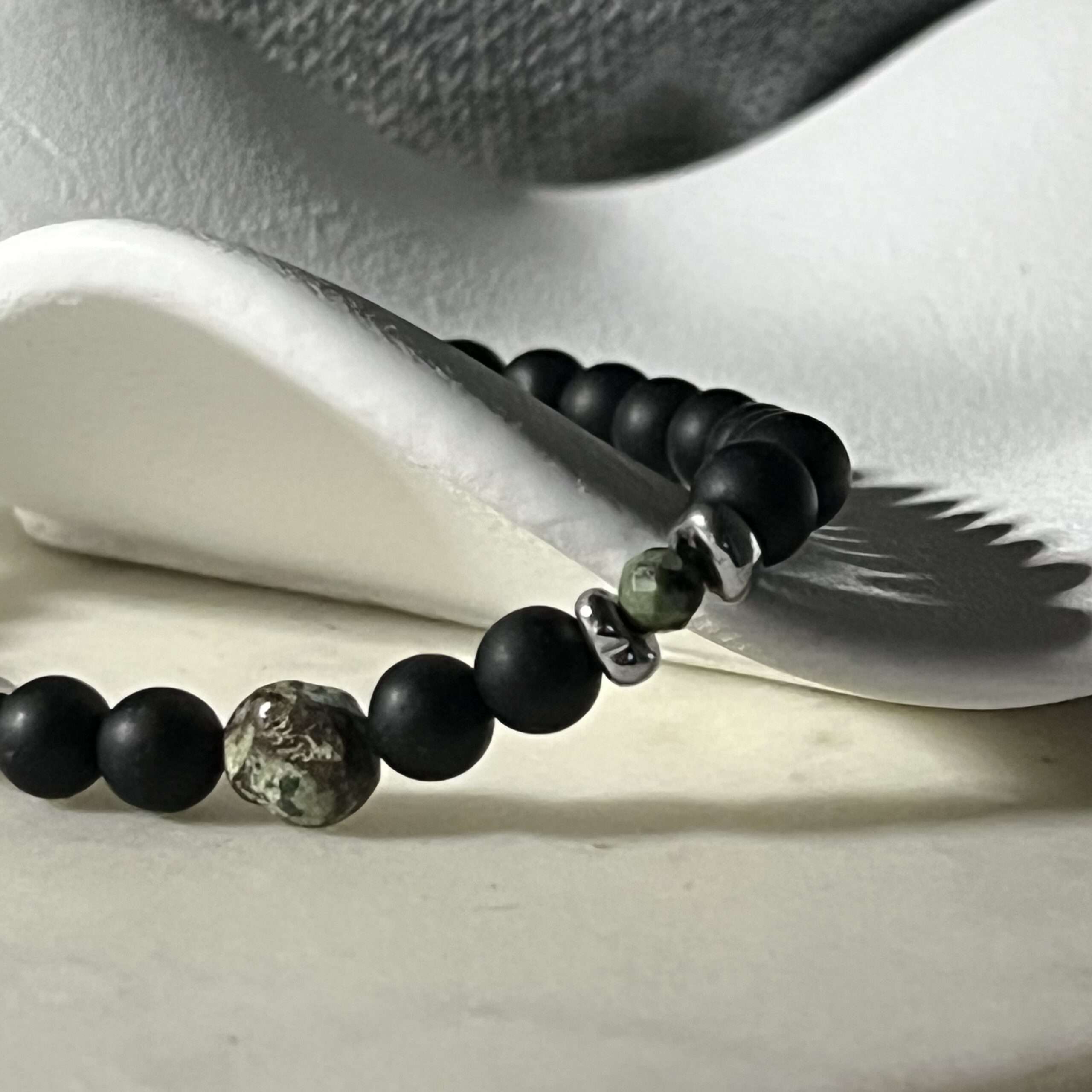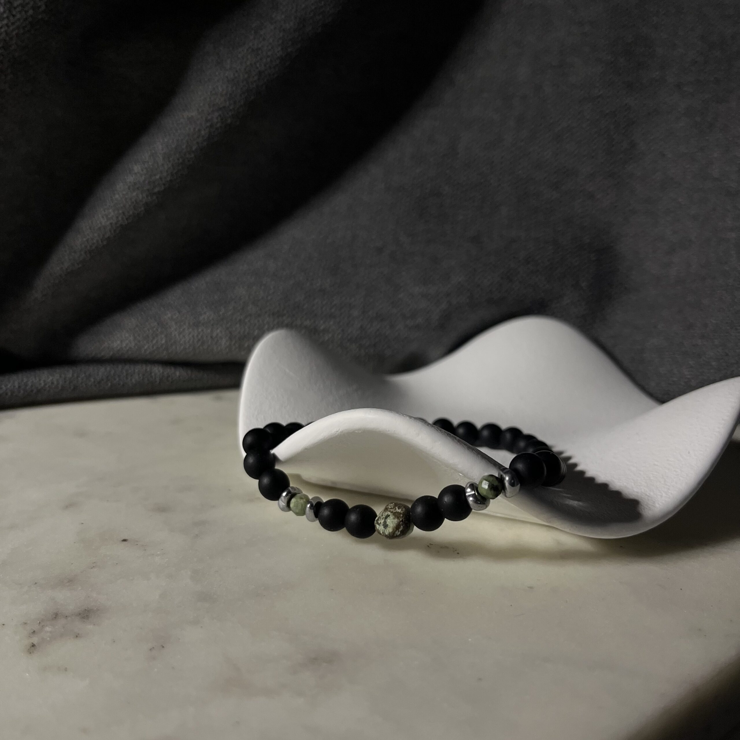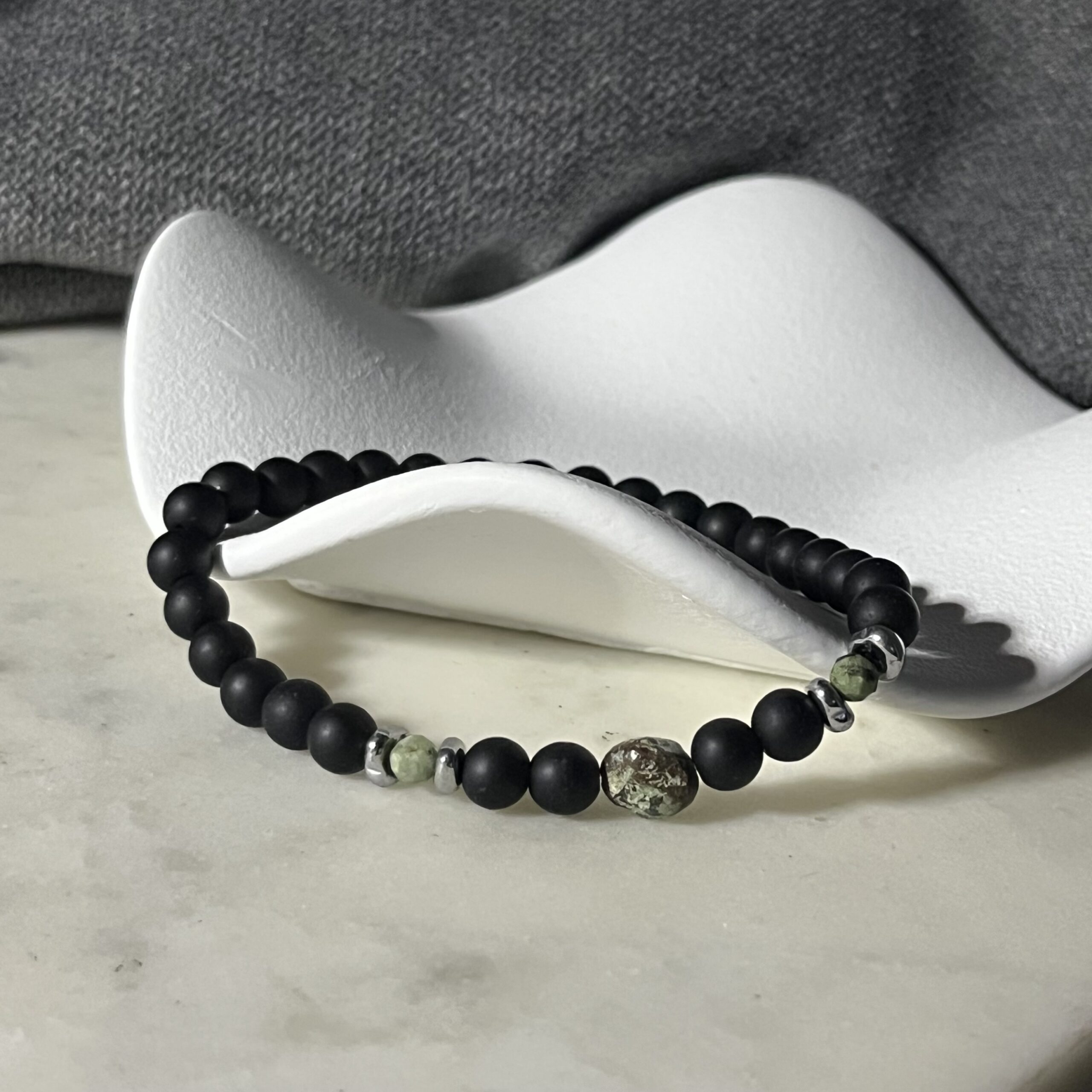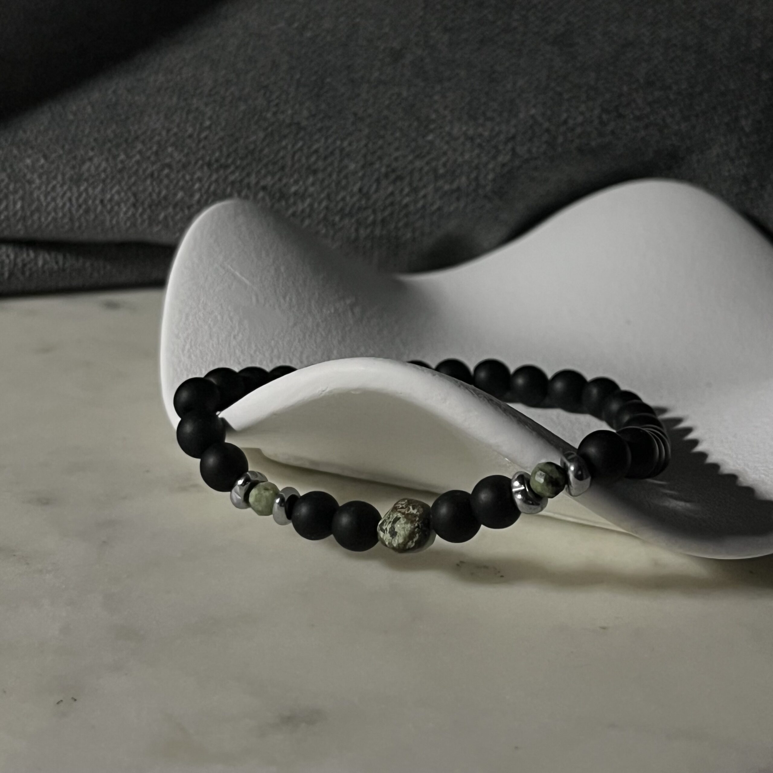Onyks symbolizuje siłę i pewność siebie, natomiast turkus afrykański przyciąga dobrą energię i wspiera intuicję. Hematytowe przekładki dodają całości nowoczesnego, minimalistycznego charakteru. Bransoletka jest elastyczna, wygodnie dopasowuje się do nadgarstka i świetnie sprawdzi się zarówno na co dzień, jak i do bardziej eleganckich stylizacji.