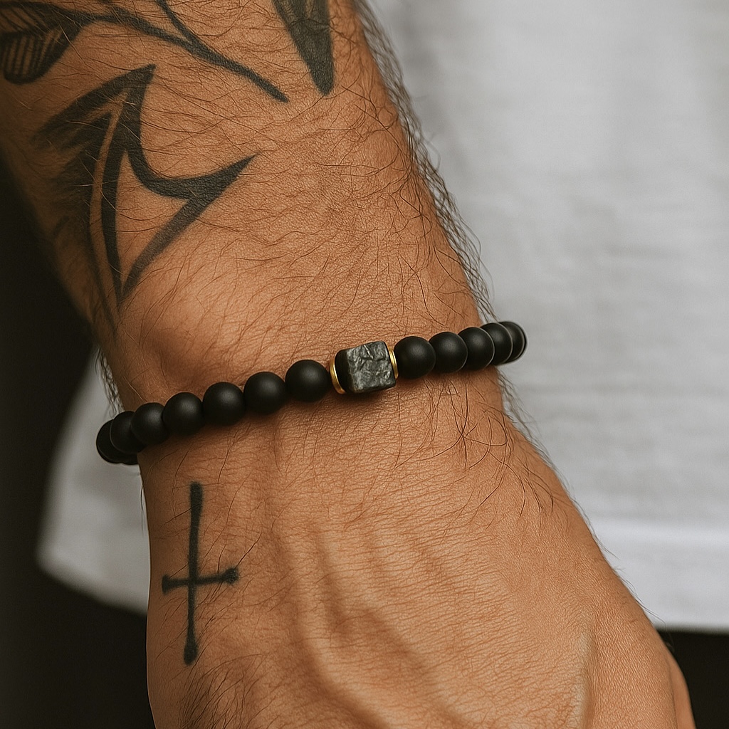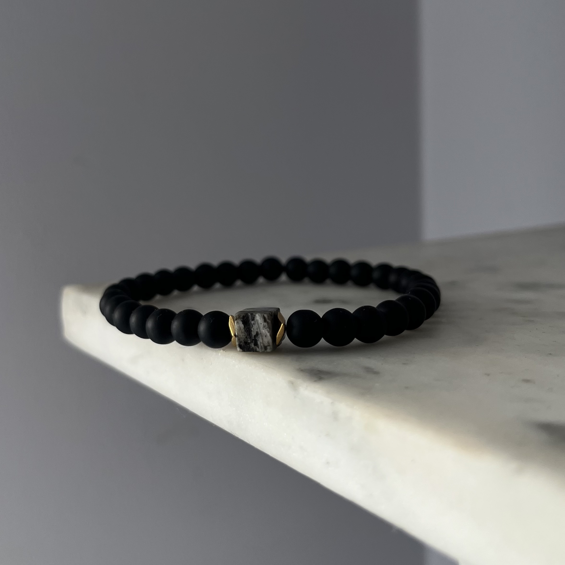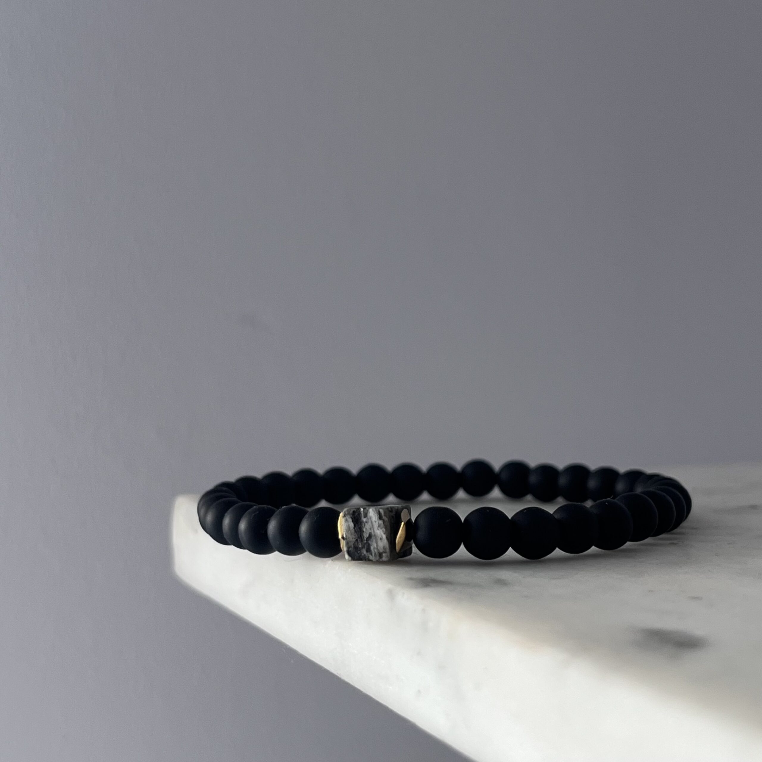 Minimalistyczna, a jednocześnie pełna charakteru. Wykonana z matowego onyksu, który symbolizuje siłę i stabilność, przełamana kostką larvikitu – kamienia zwanego „norweskim labradorytem”, kojarzonego z ochroną i wewnętrzną równowagą.
