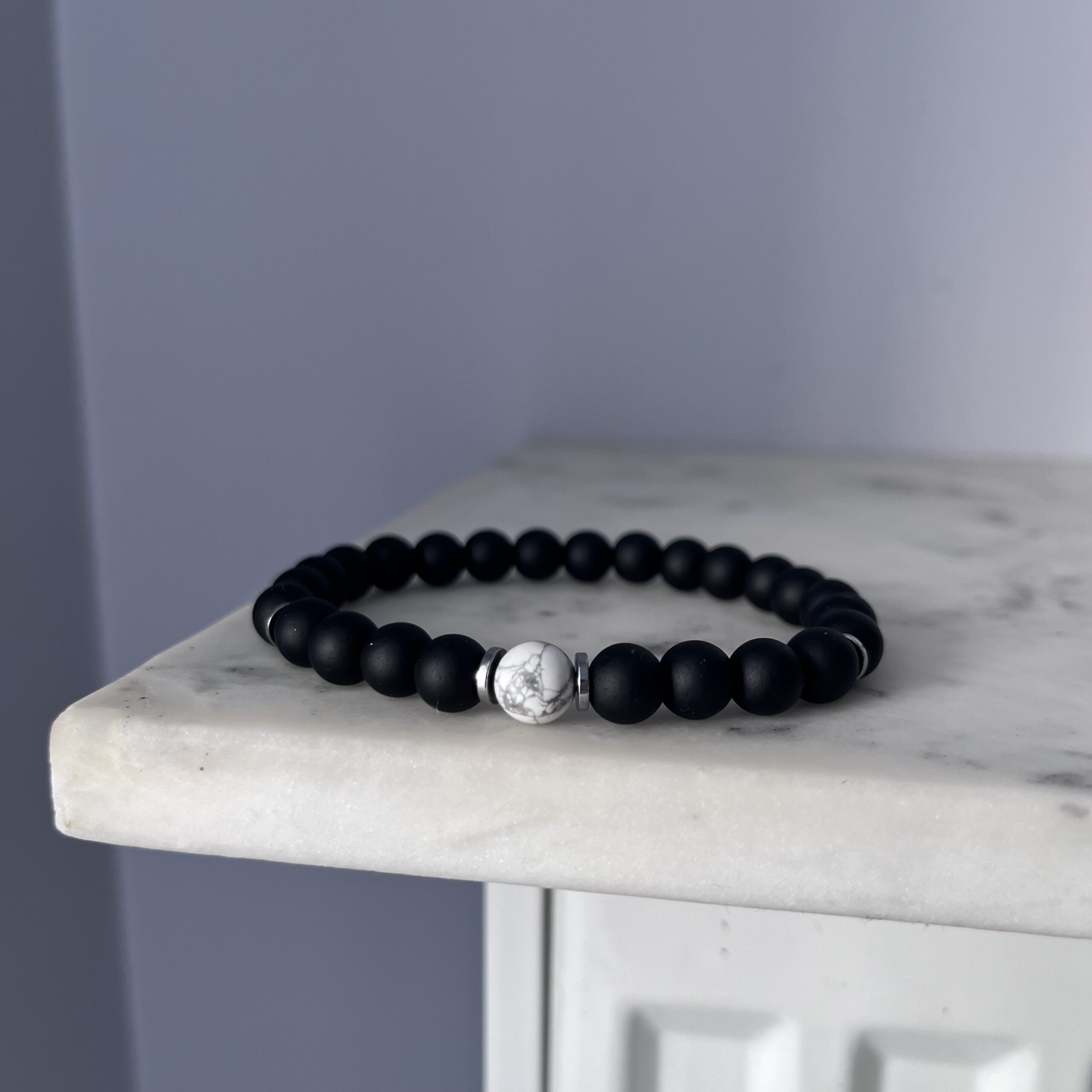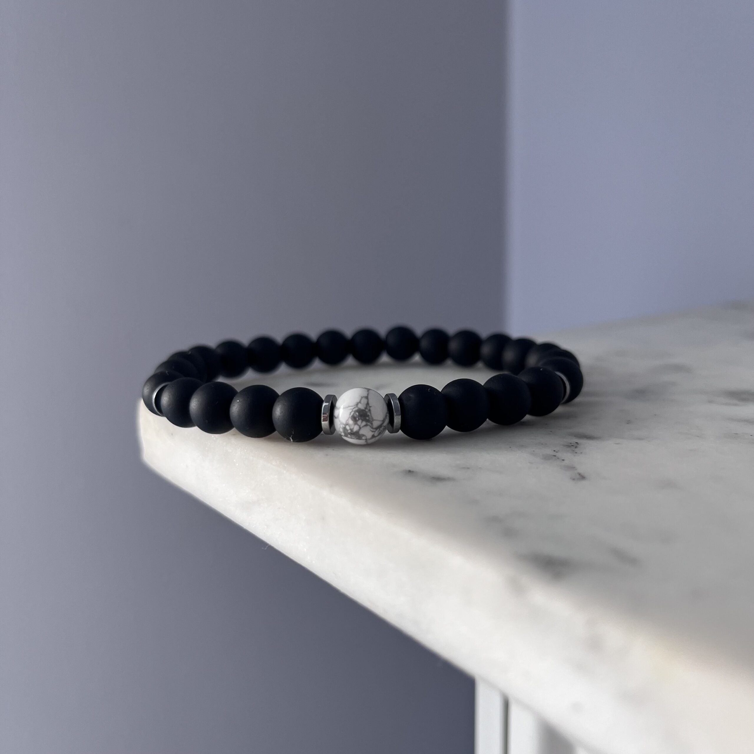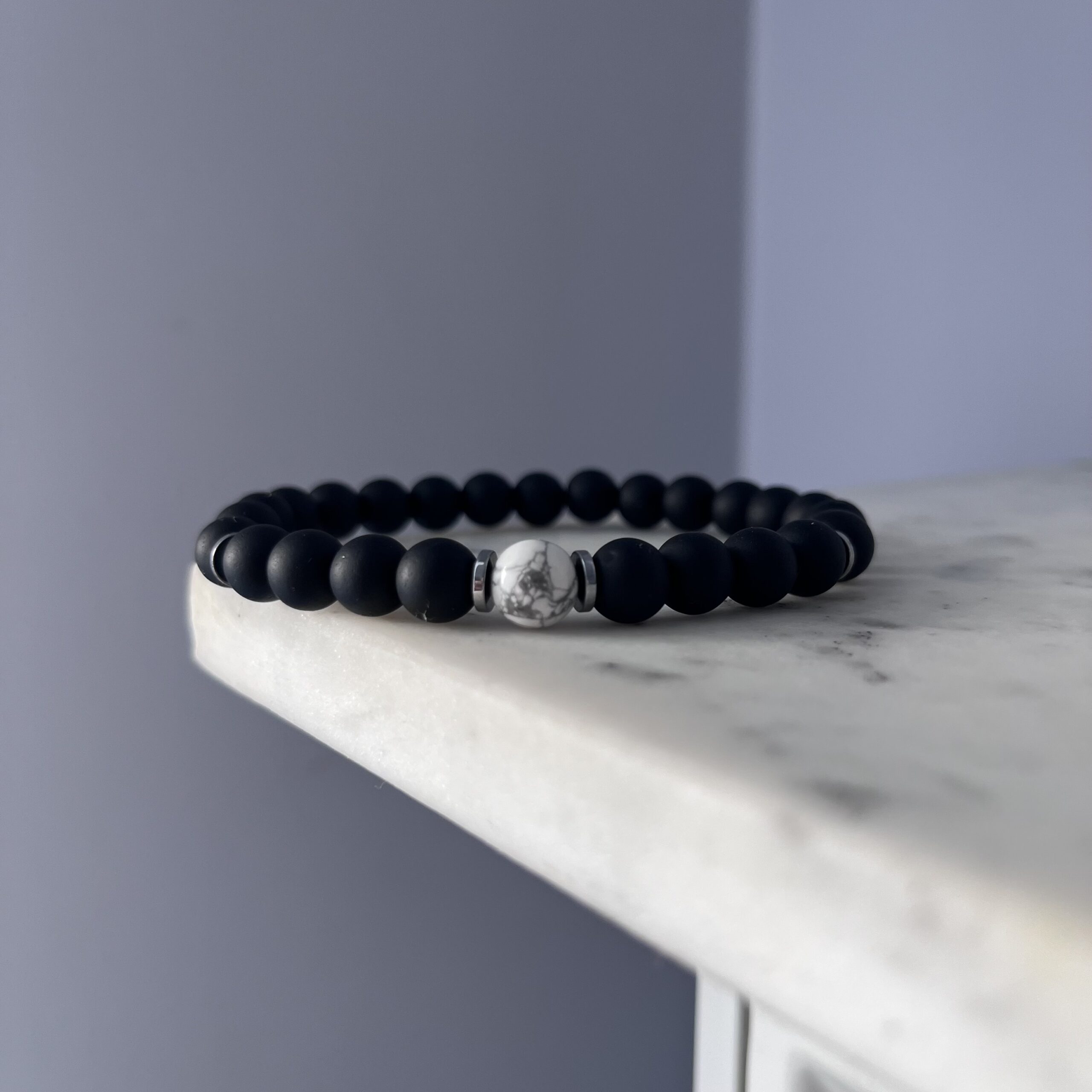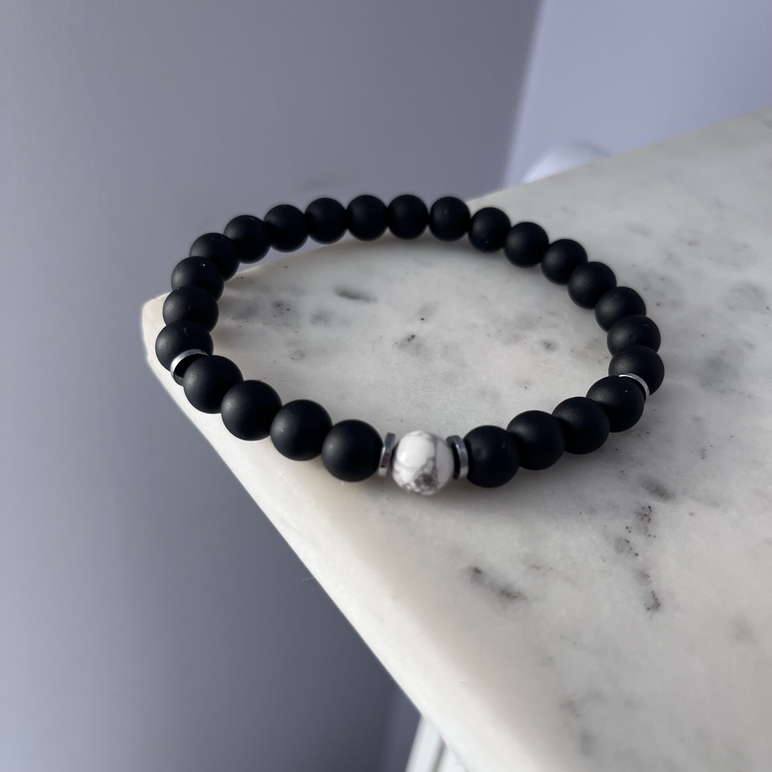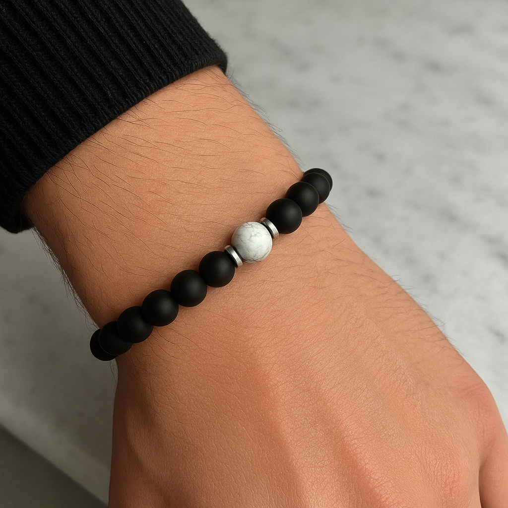 Unikalna, ręcznie wykonana bransoletka męska na elastycznej gumce, stworzona z matowych, czarnych kamieni onyksu – symbolu siły, równowagi i ochrony. Całość dopełniają subtelne srebrne przekładki, które dodają jej nowoczesnego charakteru. Centralnym punktem kompozycji jest biała kulka howlitu – kamienia spokoju i harmonii – stanowiąca kontrastowy, ale wyważony akcent.