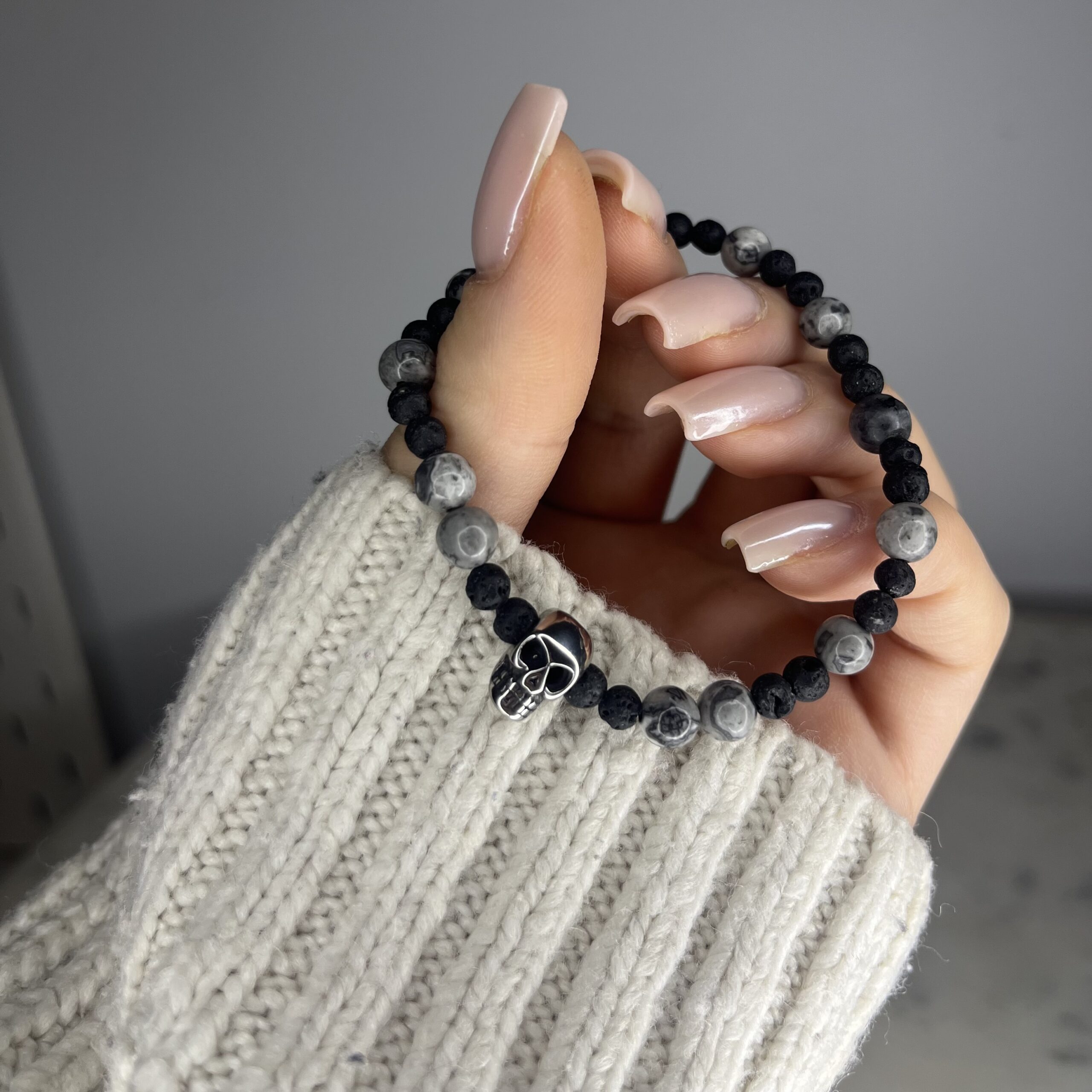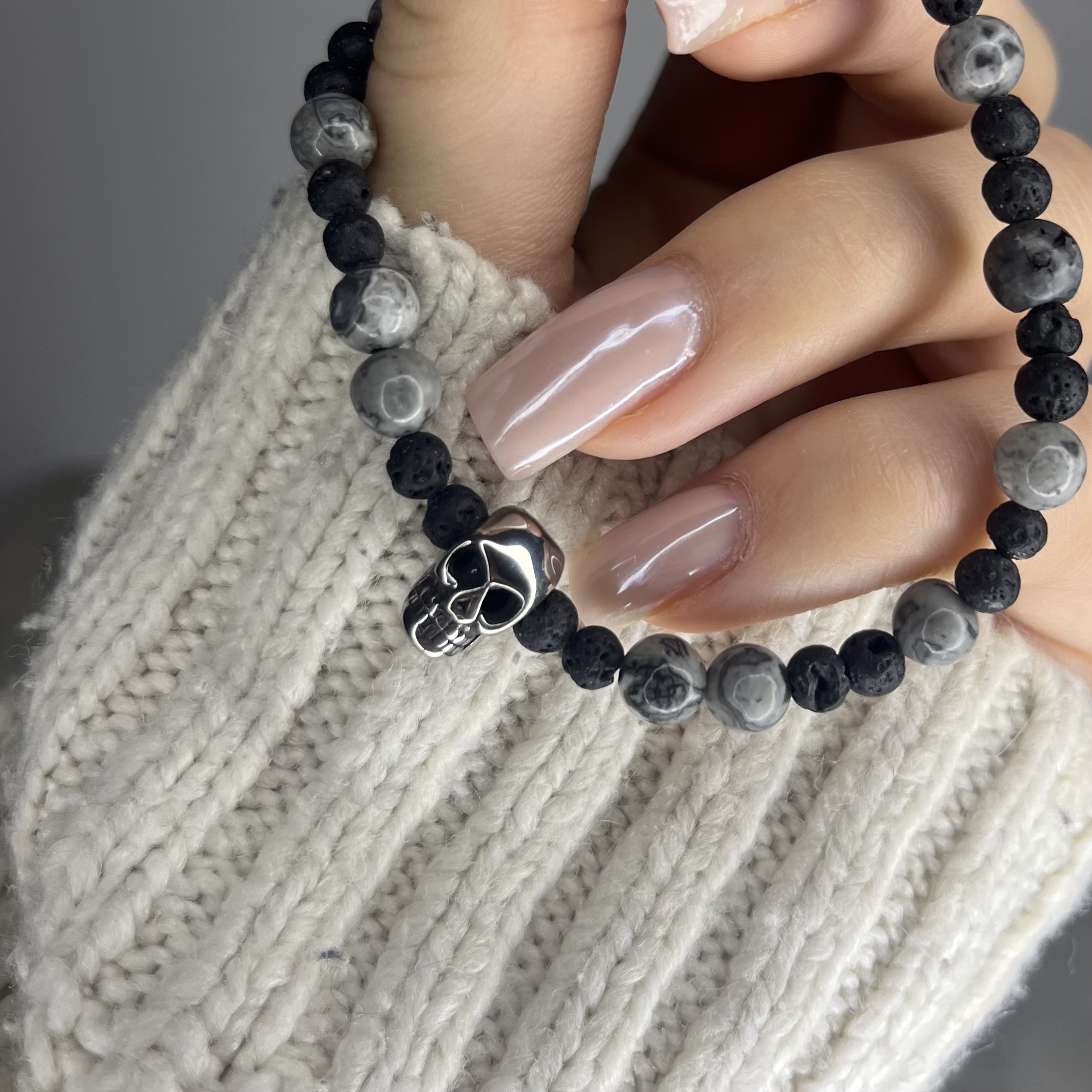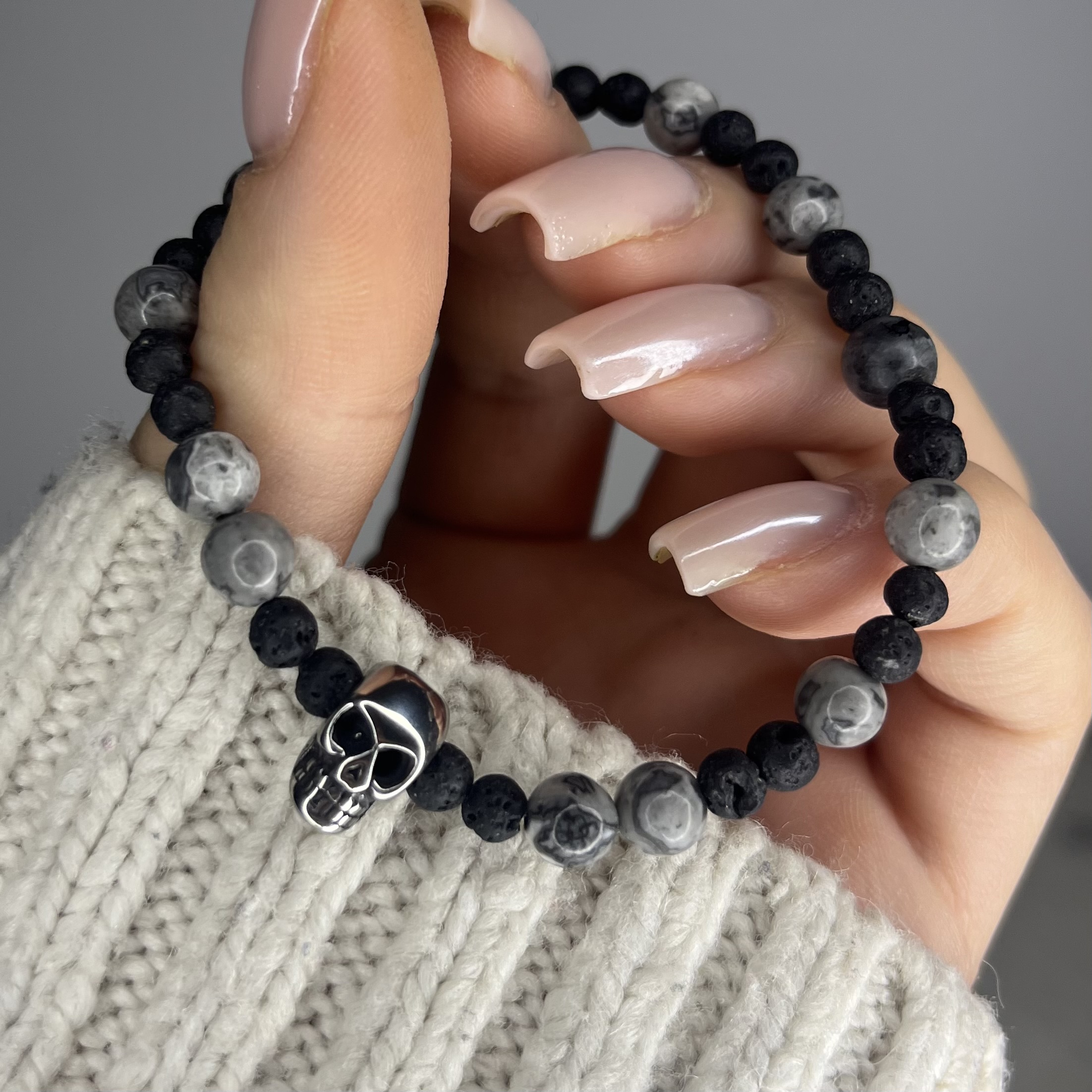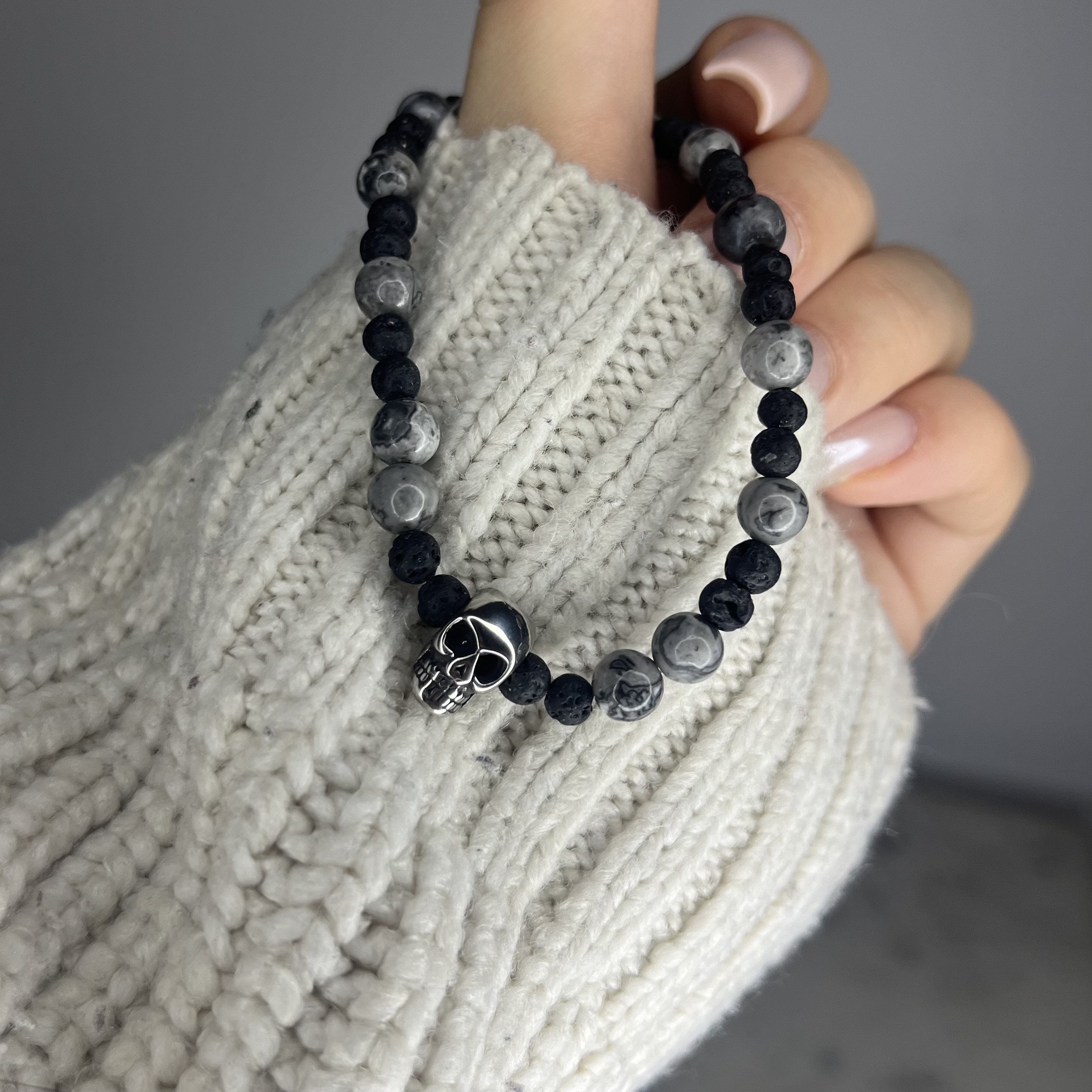 Męska bransoletka z jaspisu szarego, lawy wulkanicznej i czaszki to wyrazisty dodatek dla mężczyzny, który ceni mocny styl i naturalne kamienie z charakterem.
