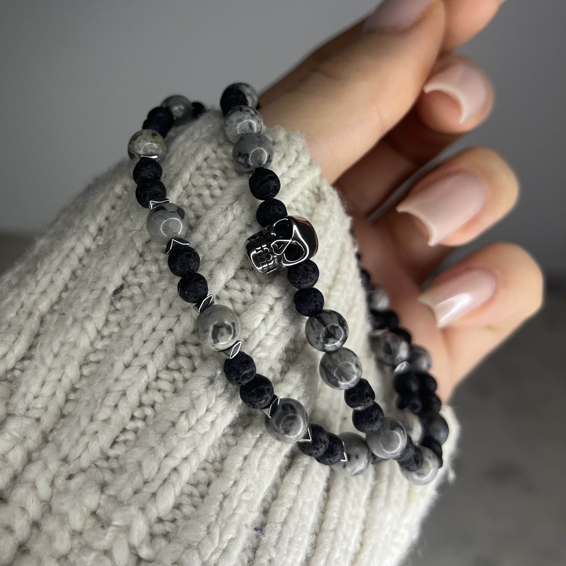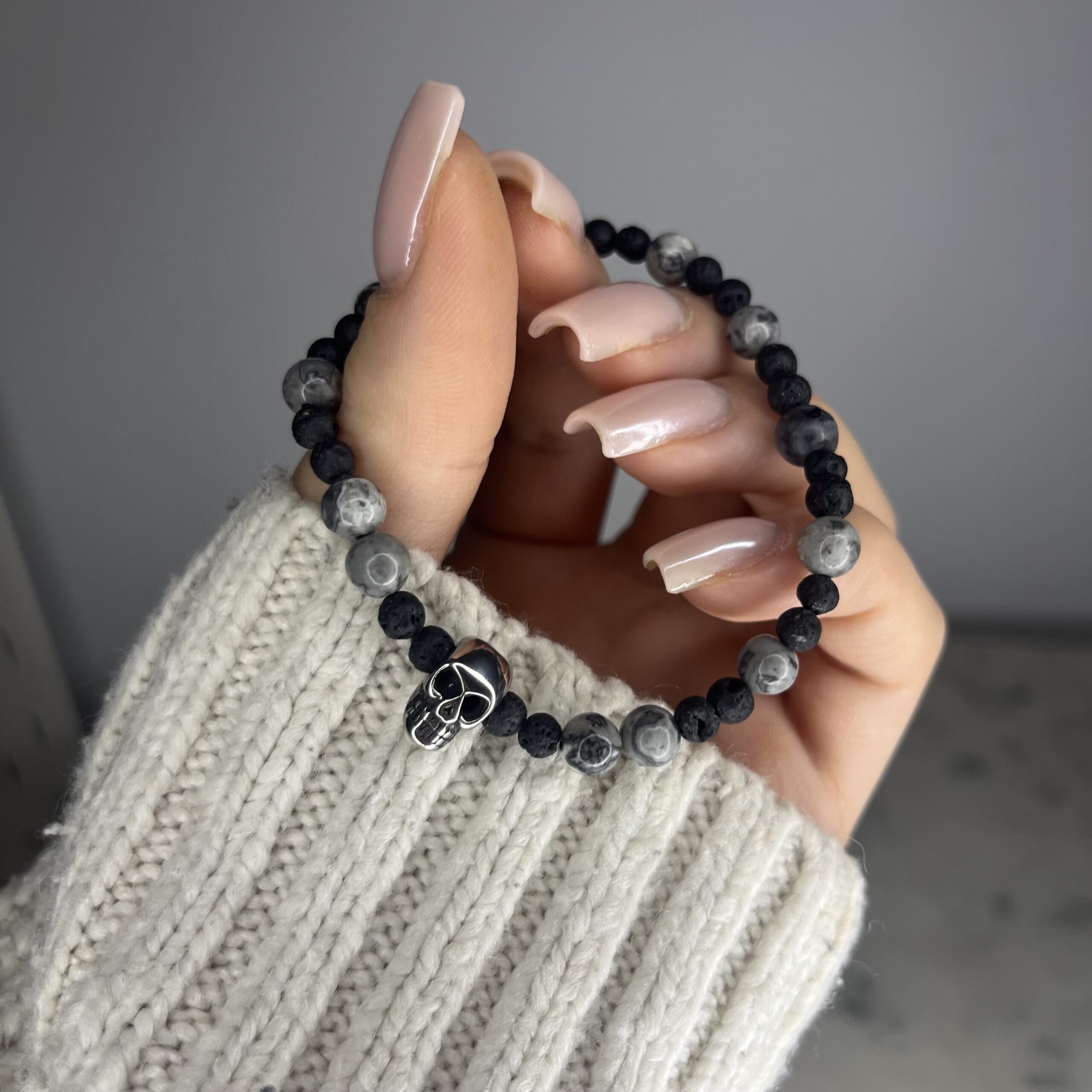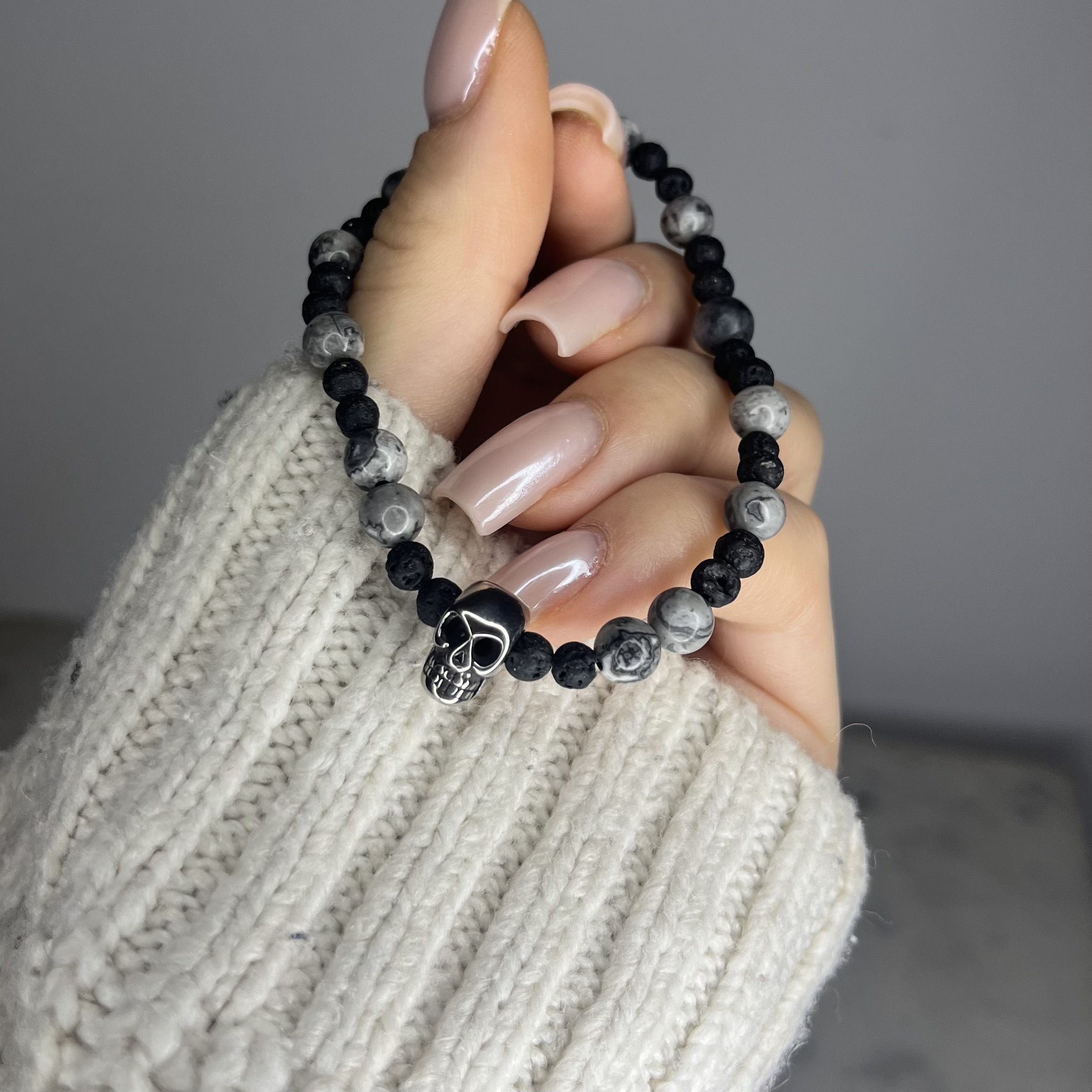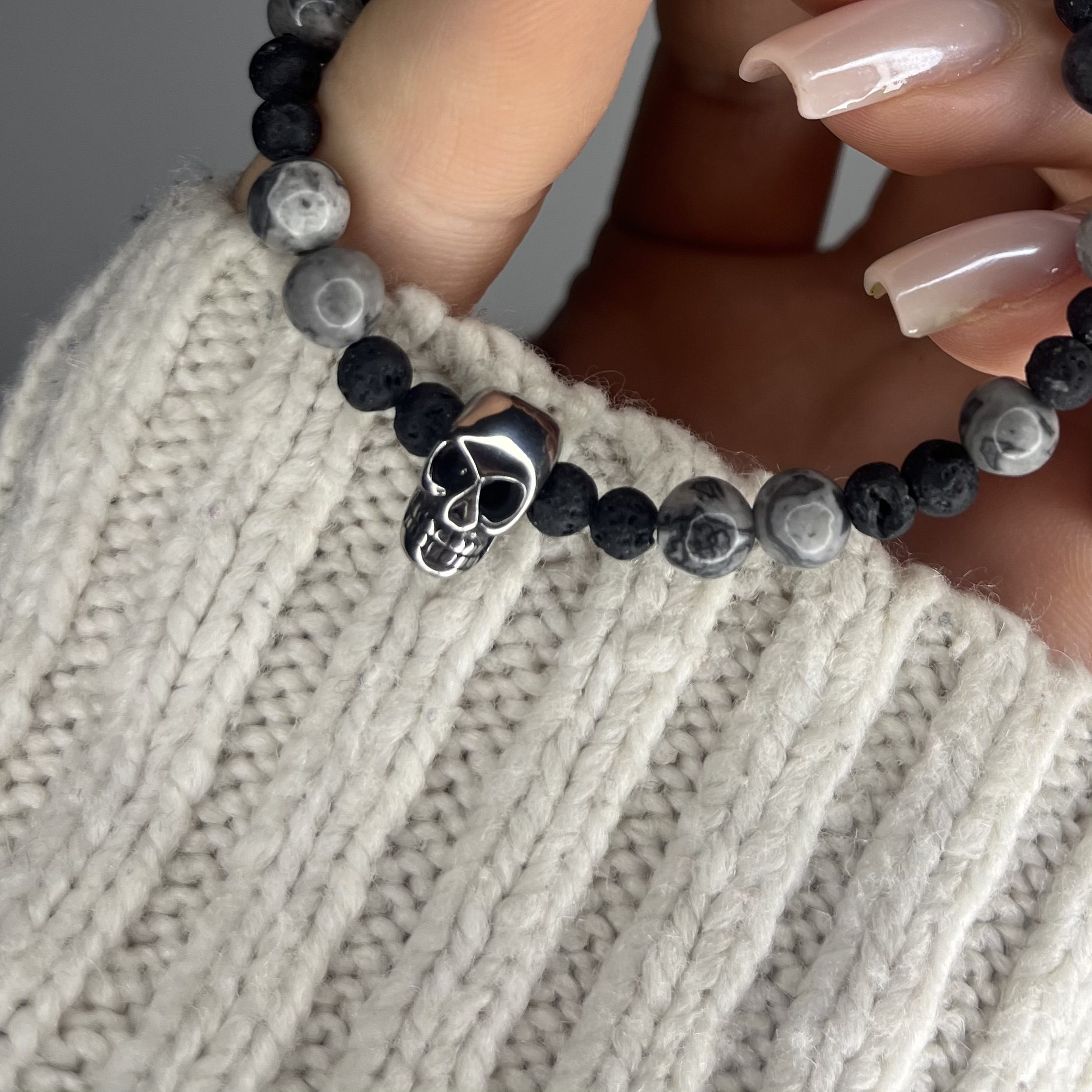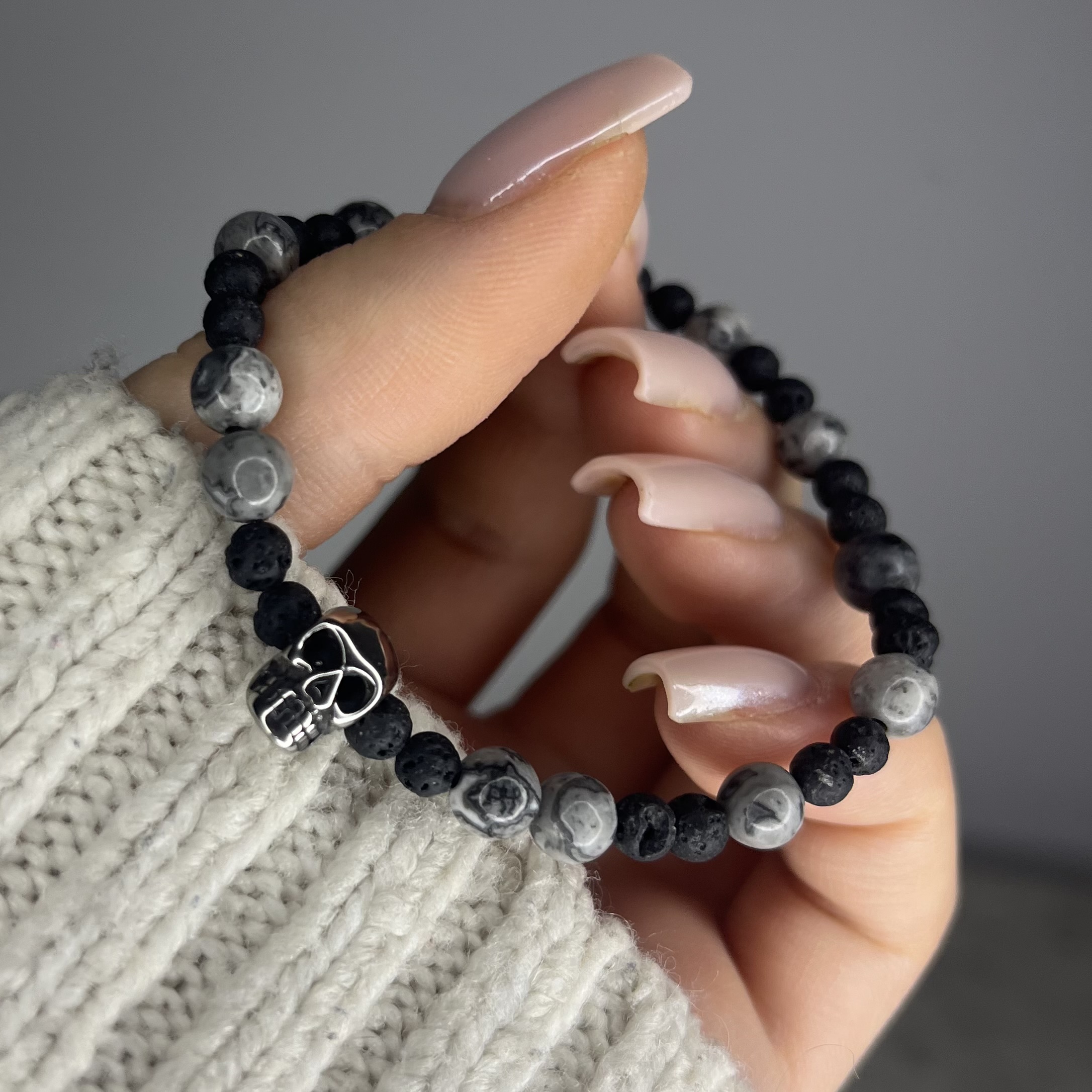 Męska bransoletka z jaspisu szarego, lawy wulkanicznej i czaszki to wyrazisty dodatek dla mężczyzny, który ceni mocny styl i naturalne kamienie z charakterem.