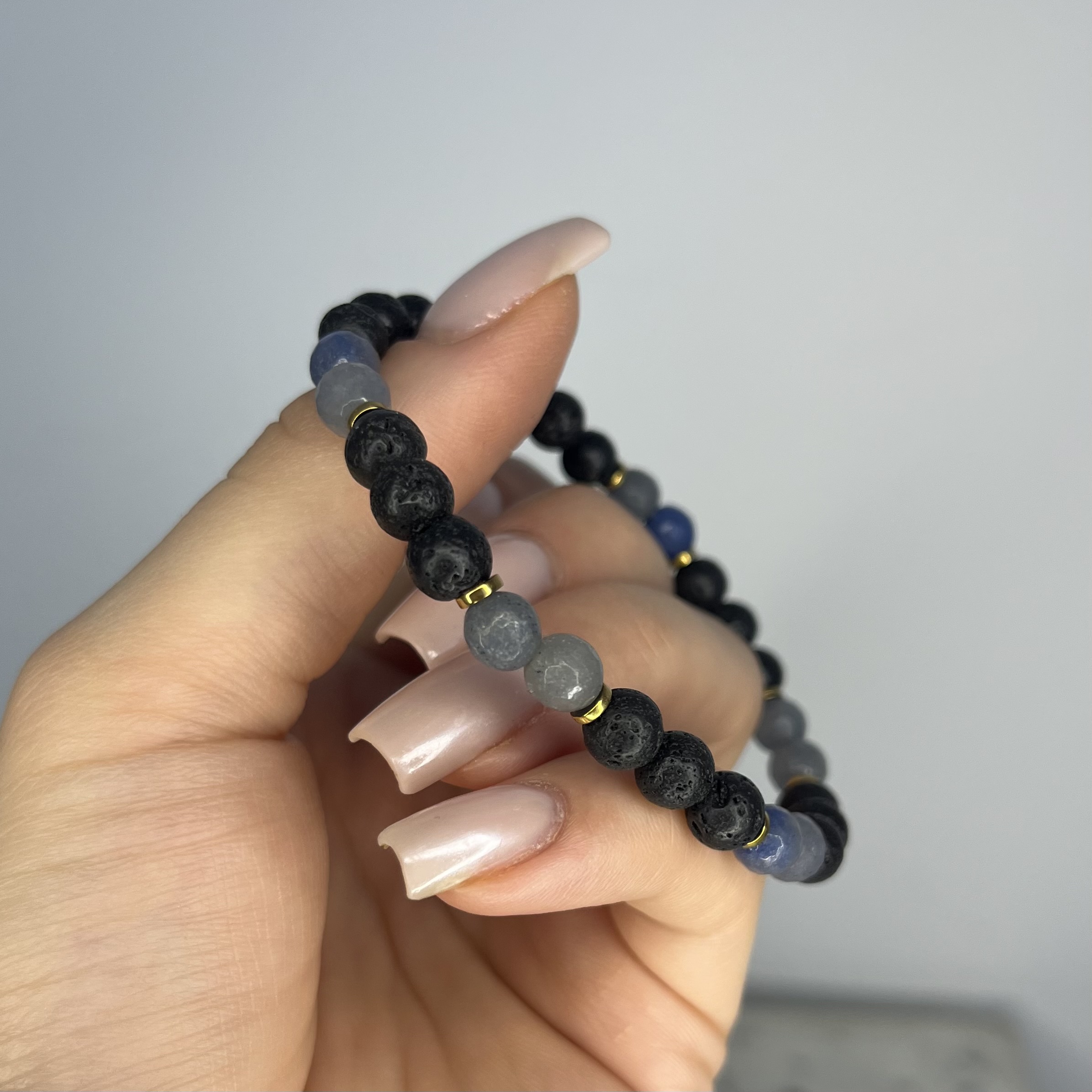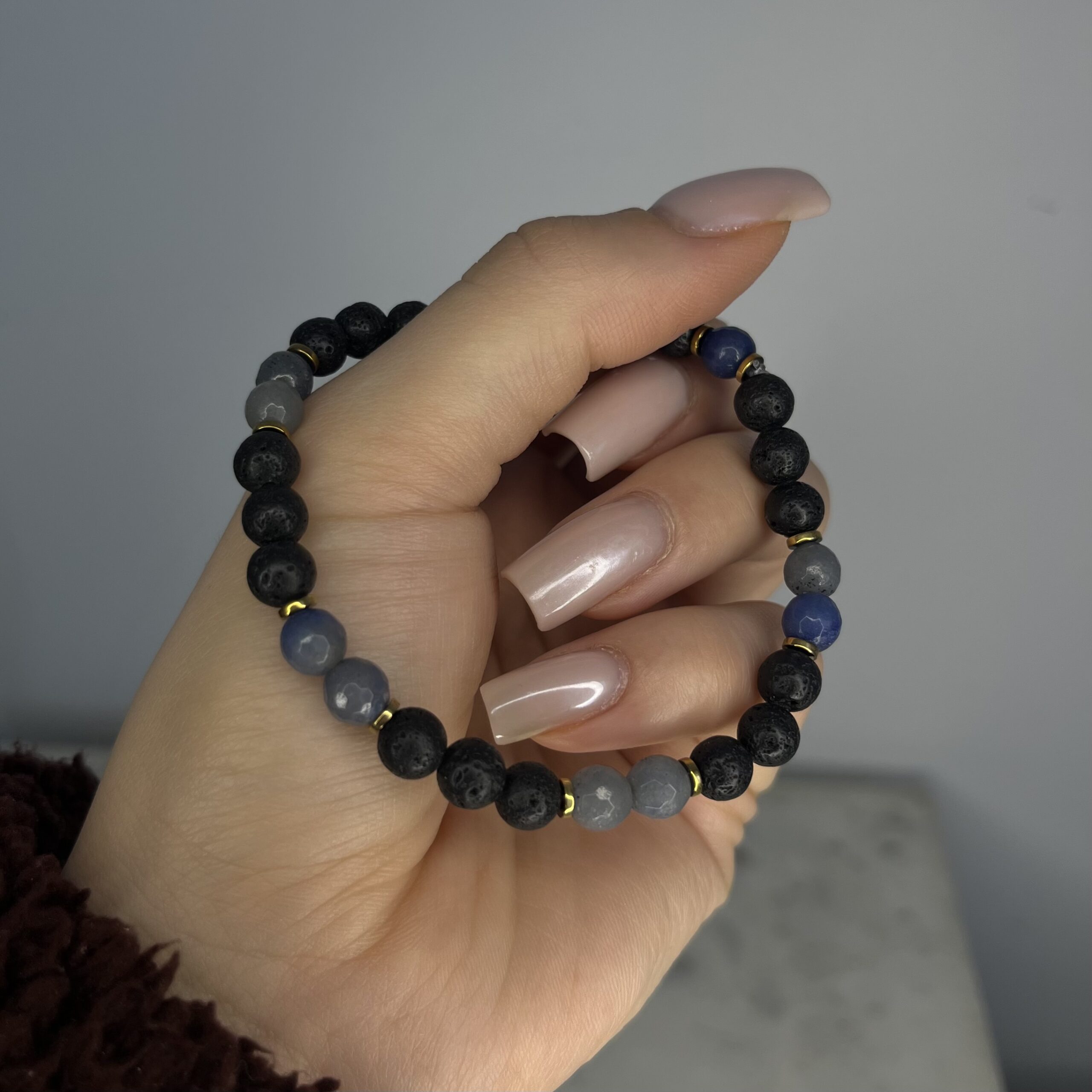 Bransoletka powstała z naturalnej lawy wulkanicznej oraz fasetowanego niebieskiego awenturynu. Matowa, surowa lawa symbolizuje siłę, stabilność i odwagę, natomiast niebieski awenturyn kojarzony jest ze spokojem, równowagą i pewnością siebie. Połączenie tych kamieni tworzy harmonijną, męską kompozycję o wyrazistym, ale eleganckim charakterze.