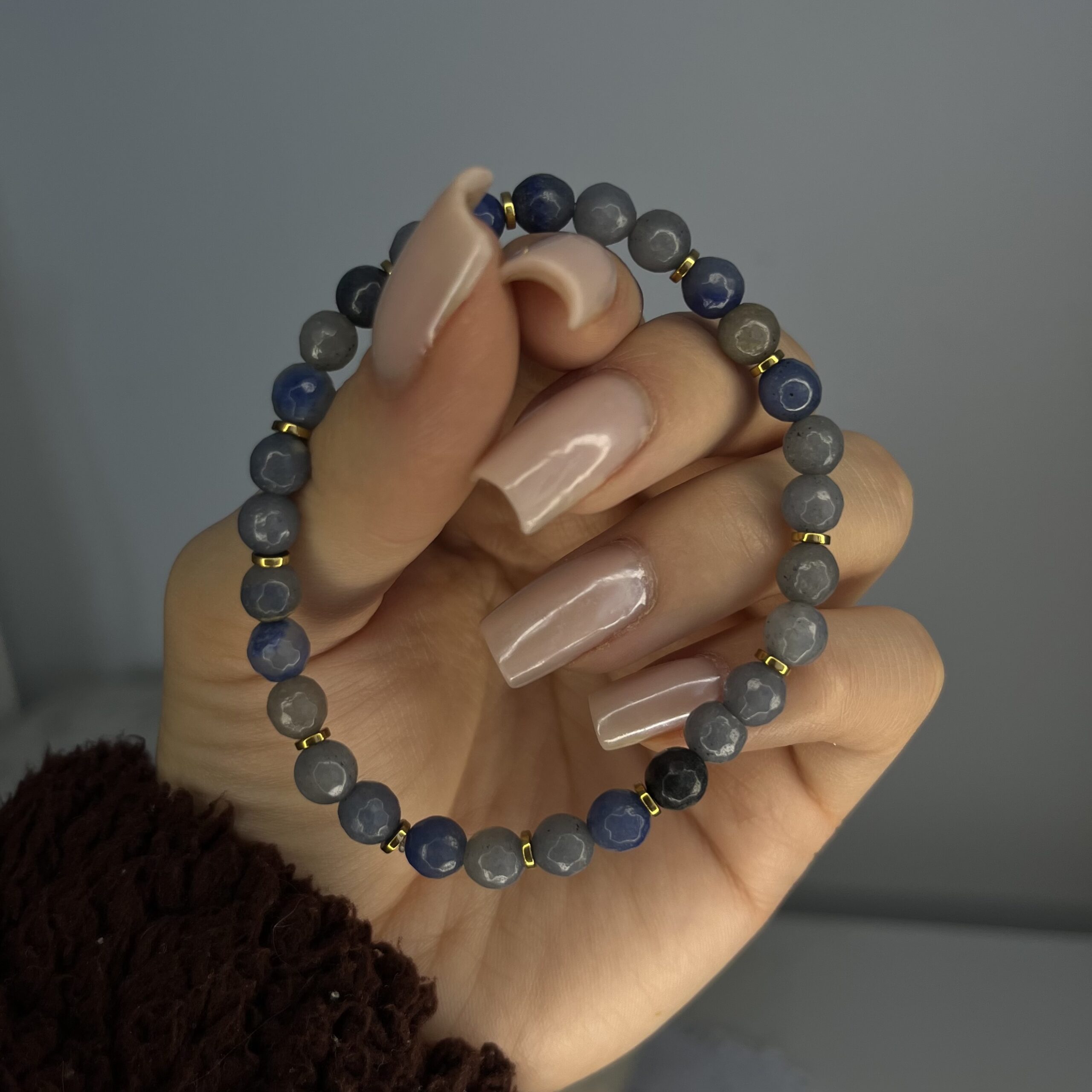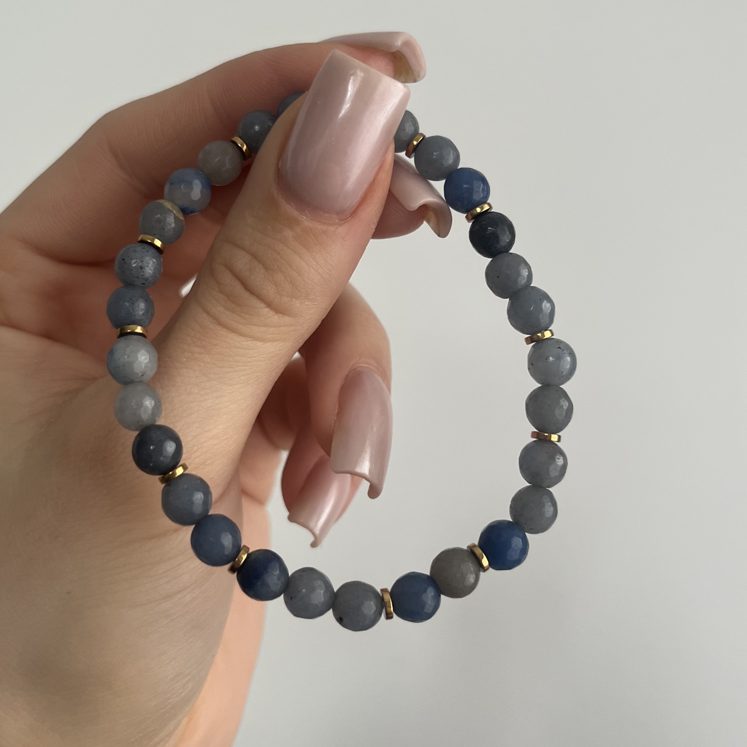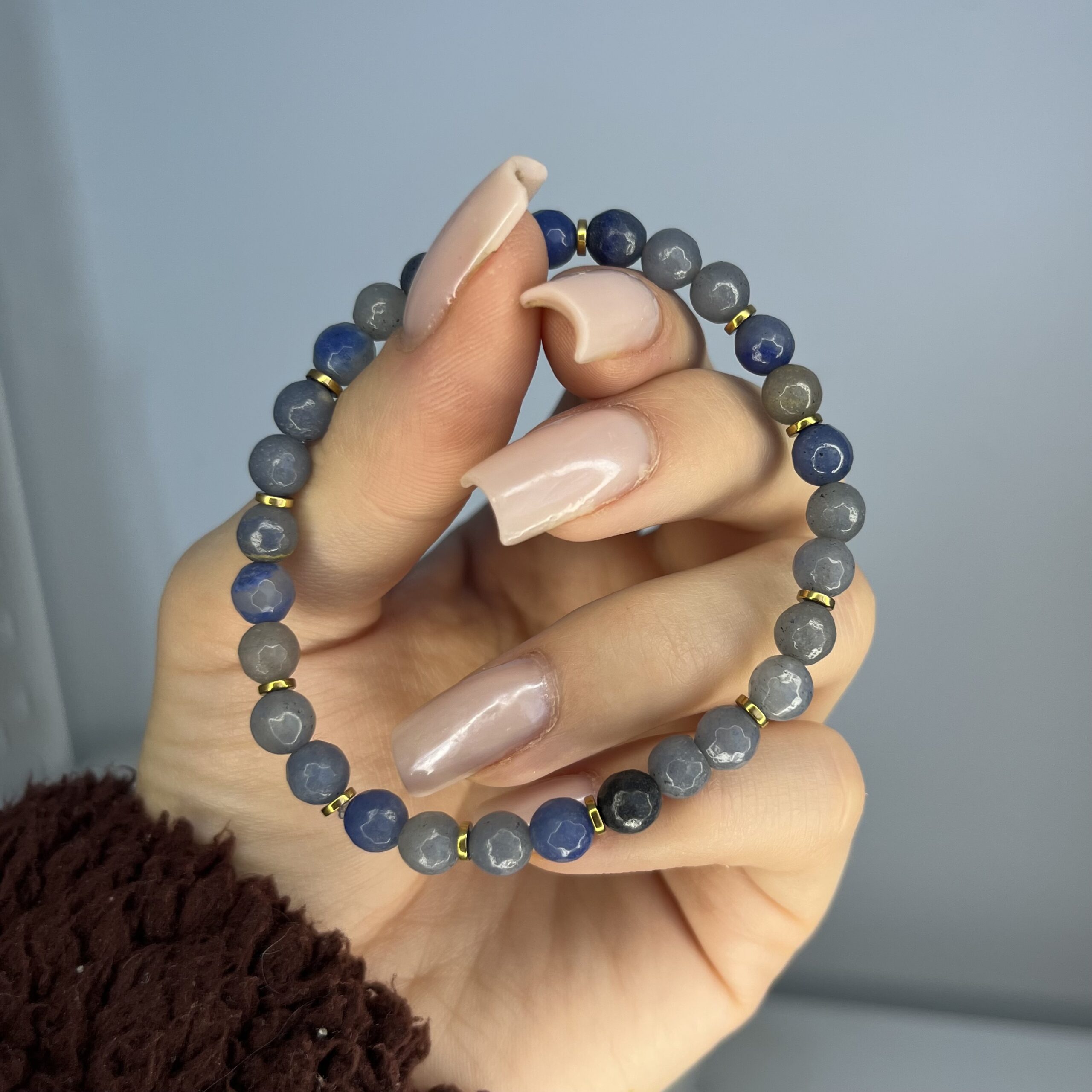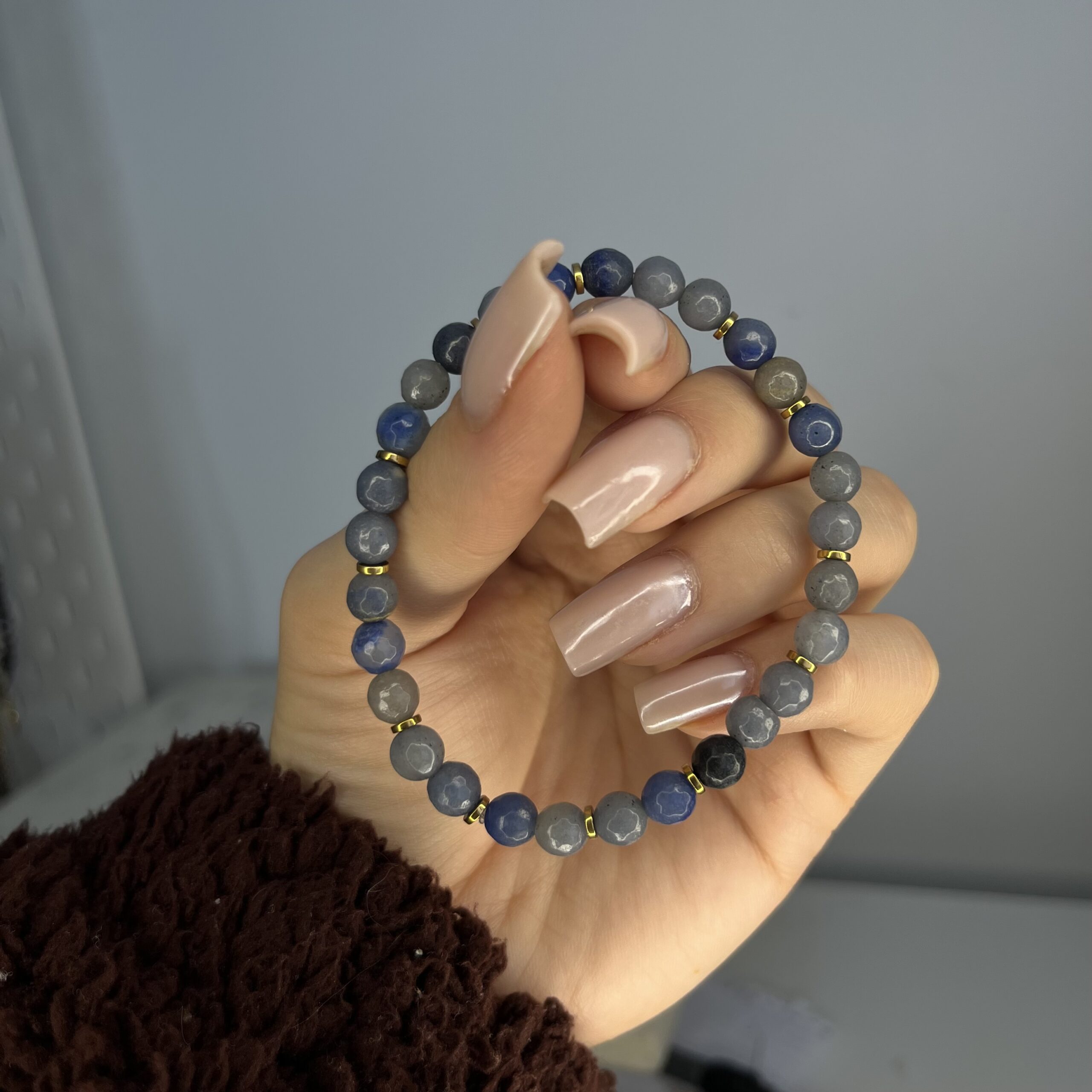 Ręcznie wykonana męska bransoletka z naturalnego niebieskiego awenturynu to połączenie klasy i subtelnego charakteru. Gładkie, starannie dobrane kamienie zachwycają głębokim odcieniem niebieskiego, który symbolizuje spokój, harmonię i siłę wewnętrzną. Złote przekładki dodają całości elegancji i luksusowego akcentu, tworząc wyjątkową biżuterię dla mężczyzny ceniącego styl i jakość.