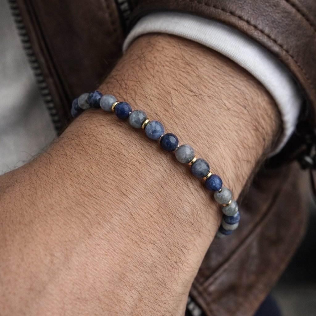 Męska bransoletka z niebieskiego awenturynu ze złotymi przekładkami podkreśla styl, pewność siebie i nowoczesną elegancję.