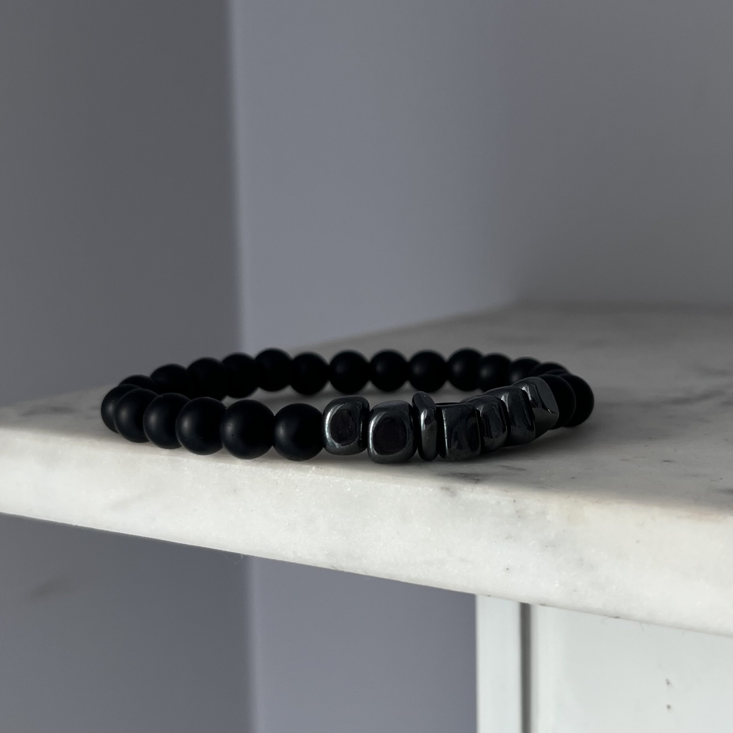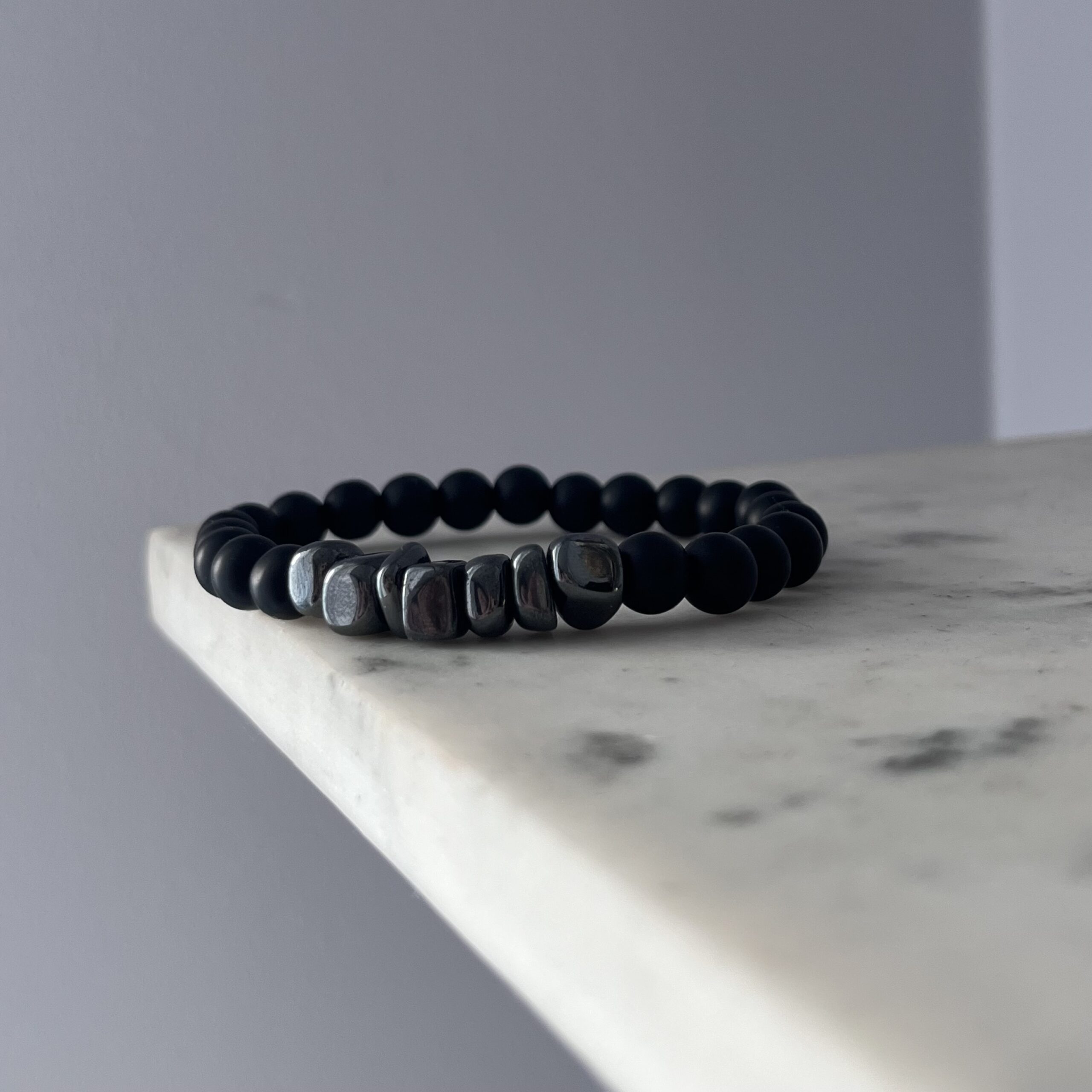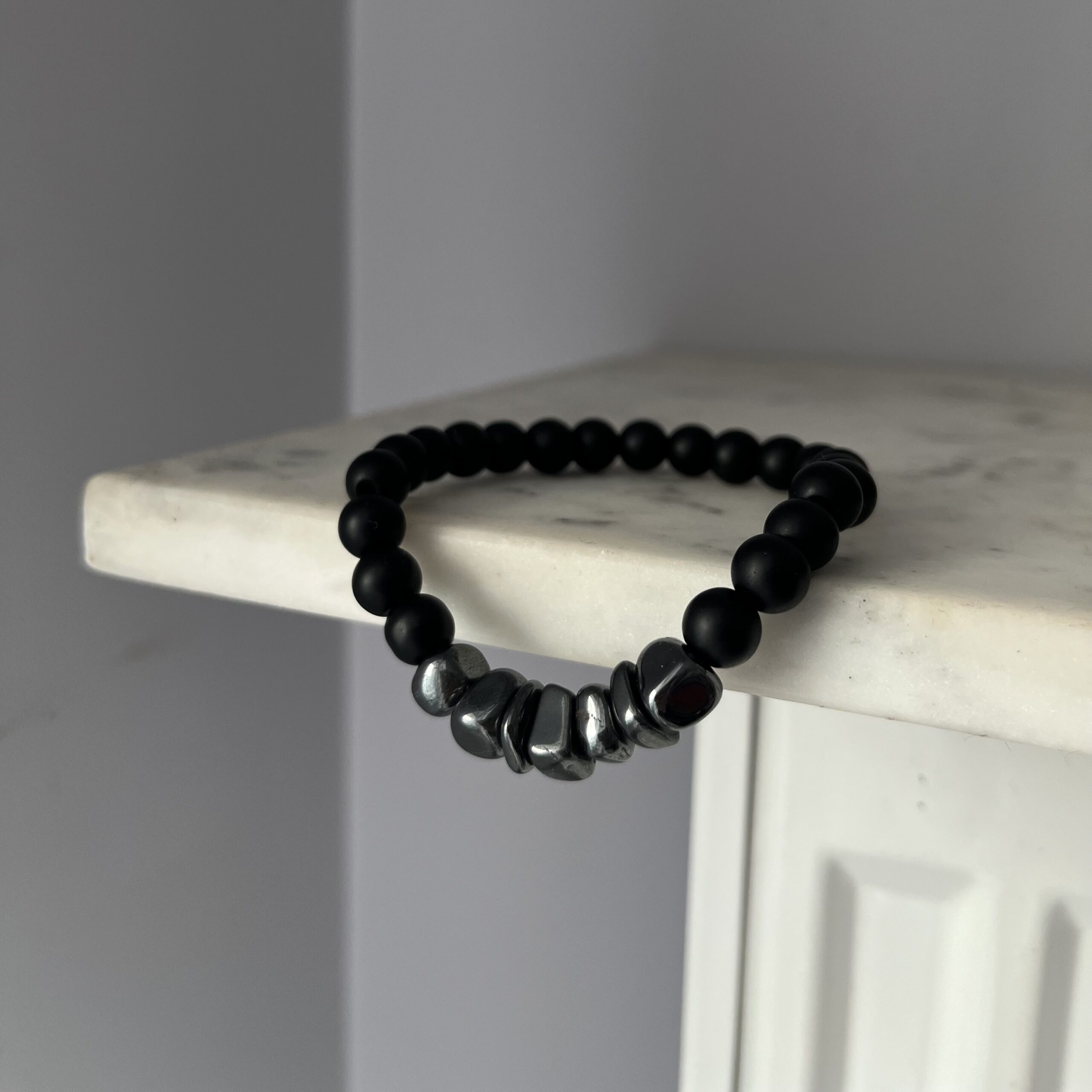 Minimalistyczna, a jednocześnie wyrazista bransoletka stworzona z matowych kulek onyksu oraz nieregularnych elementów hematytu. Połączenie głębokiej czerni i metalicznego połysku sprawia, że biżuteria nabiera mocnego, męskiego charakteru.