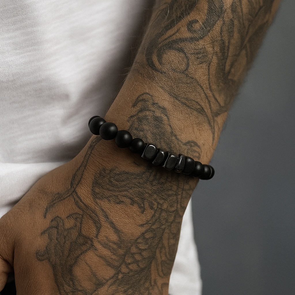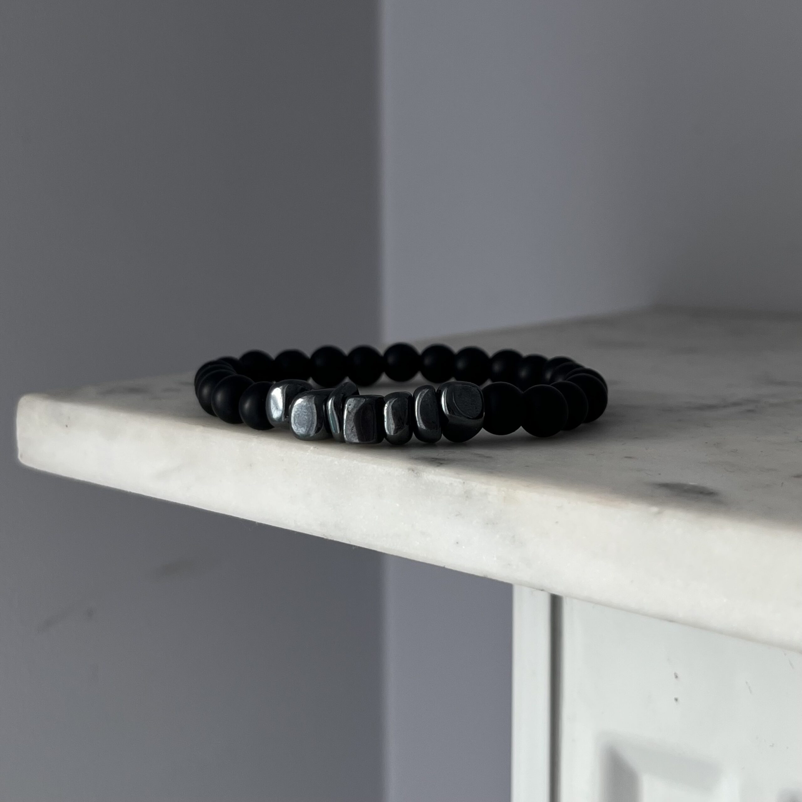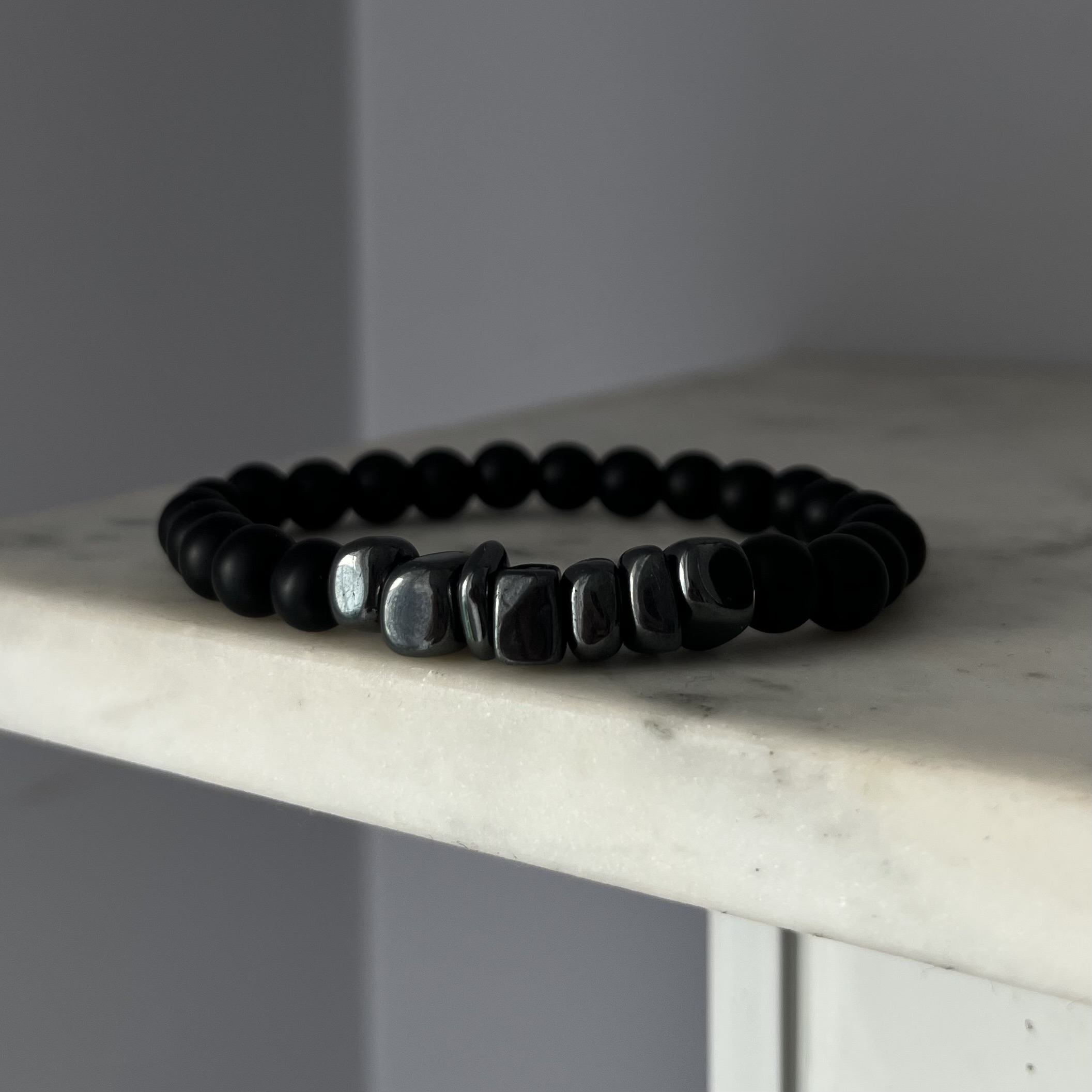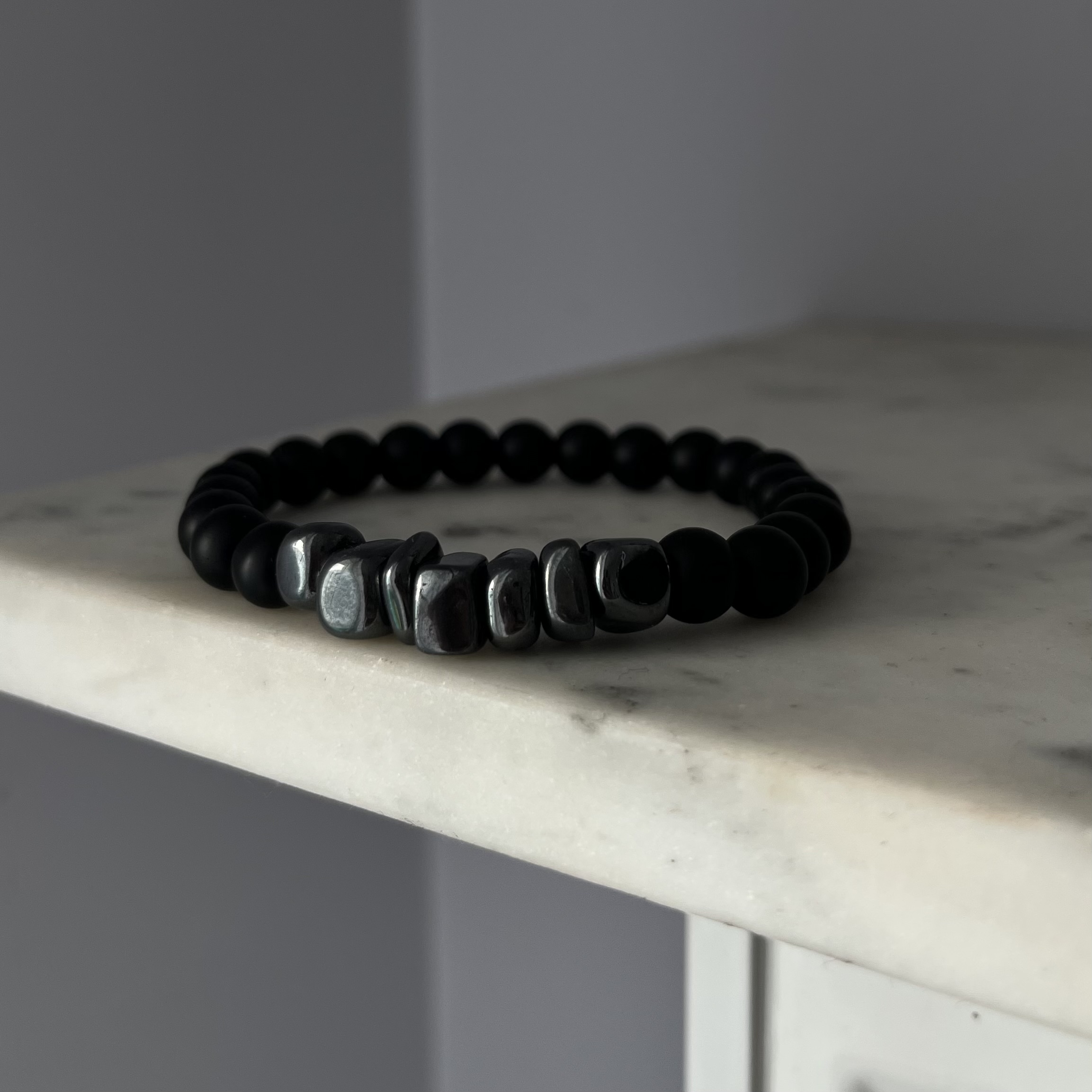Minimalistyczna, a jednocześnie wyrazista bransoletka stworzona z matowych kulek onyksu oraz nieregularnych elementów hematytu. Połączenie głębokiej czerni i metalicznego połysku sprawia, że biżuteria nabiera mocnego, męskiego charakteru.