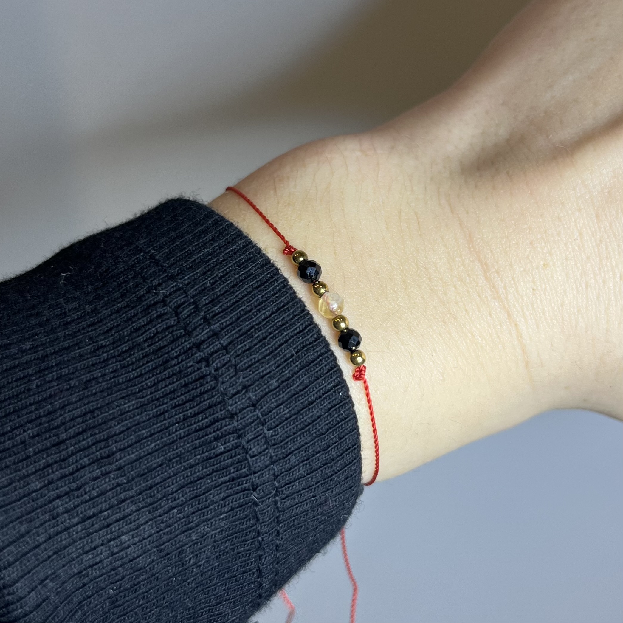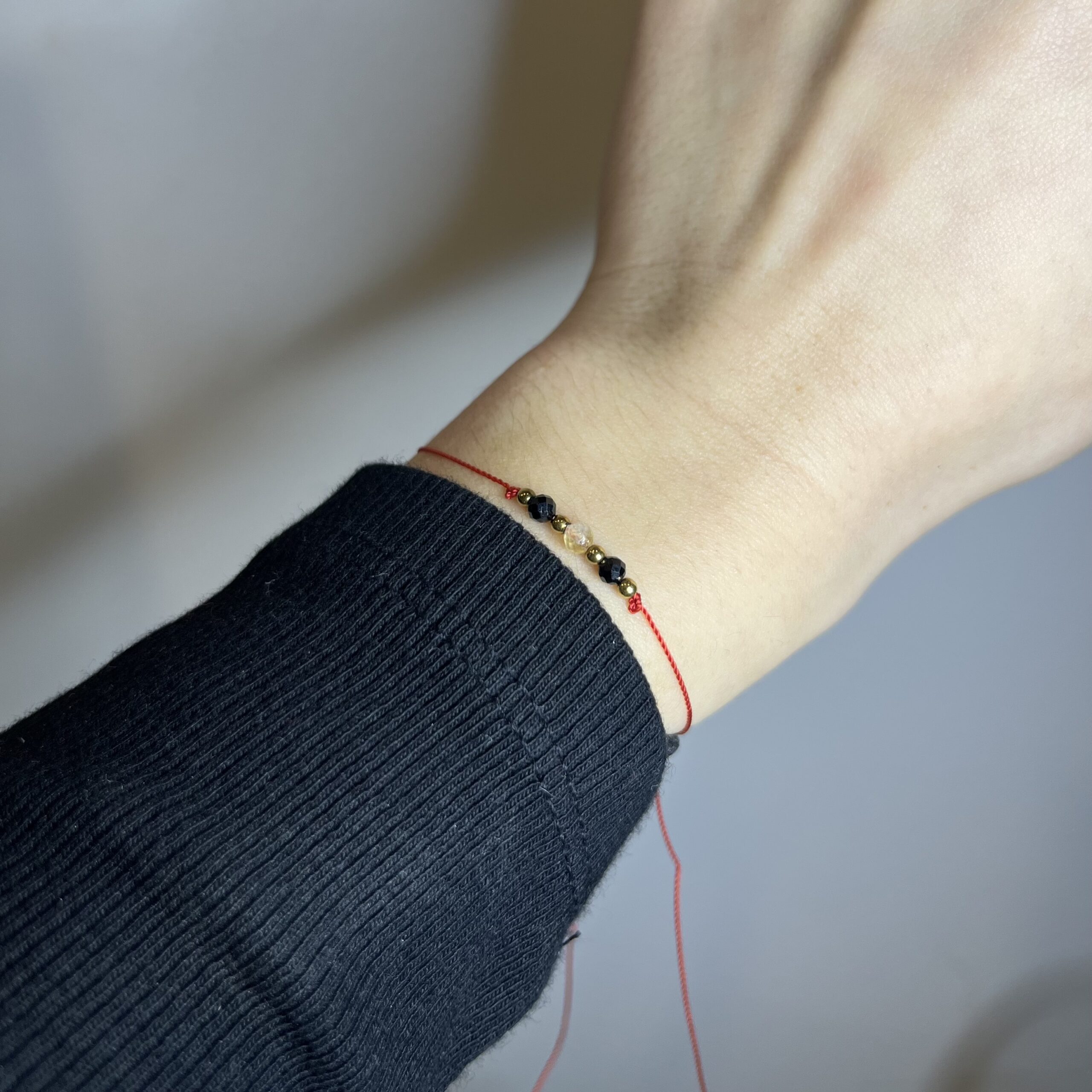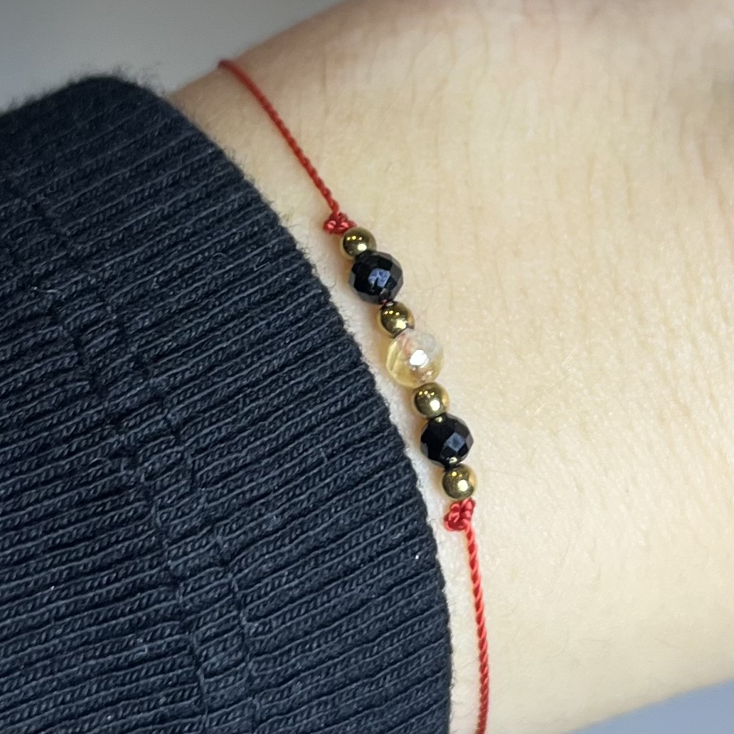 Delikatna bransoletka na nici jedwabnej do samodzielnego zawiązania, wykonana z naturalnych kamieni: czarnego turmalinu, cytrynu oraz złotego hematytu. Połączenie tych minerałów symbolizuje ochronę, pozytywną energię i wewnętrzną siłę. Minimalistyczny design sprawia, że bransoletka doskonale pasuje do codziennych stylizacji, jak i na wyjątkowe okazje. Idealna jako osobisty amulet lub wyjątkowy prezent.