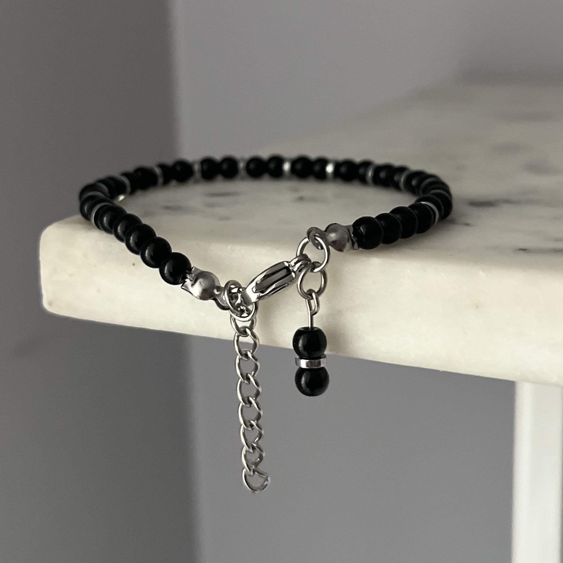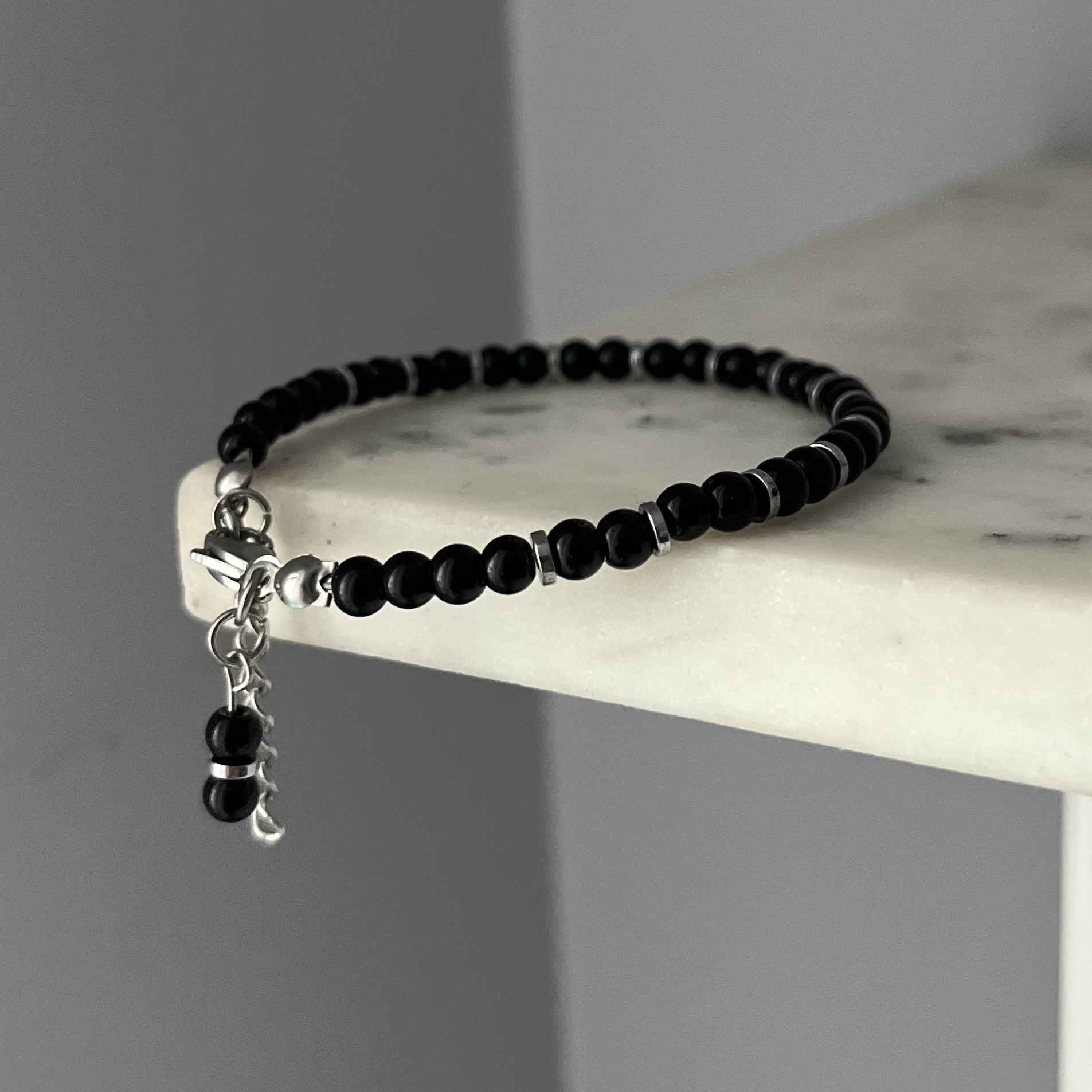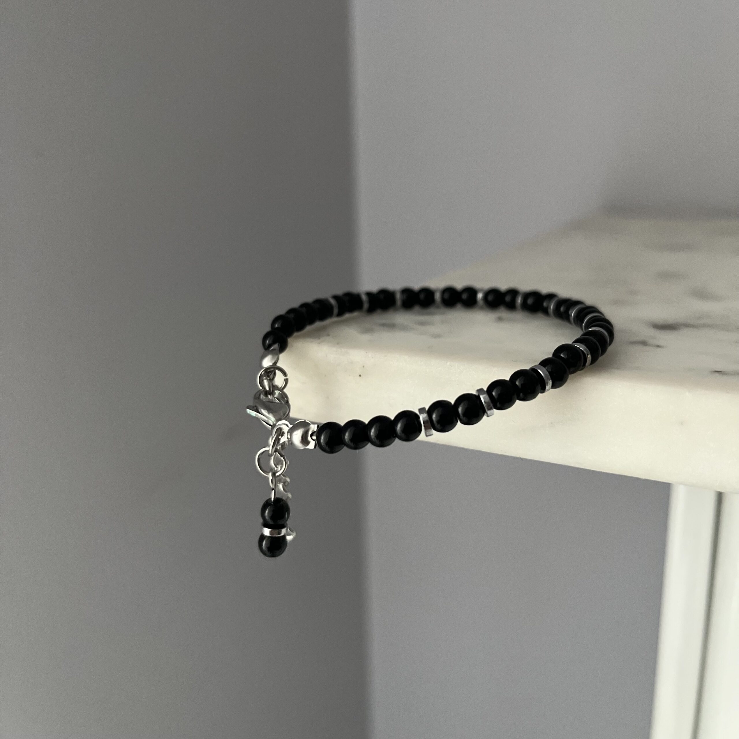 Klasyczna, a jednocześnie niezwykle elegancka — bransoletka „Srebrny Akcent” to połączenie czarnych, błyszczących koralików i drobnych srebrnych elementów, które subtelnie odbijają światło.