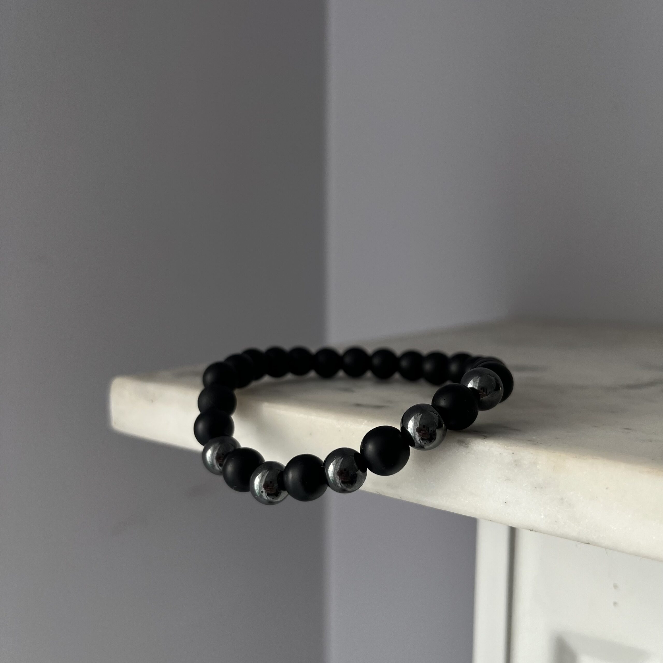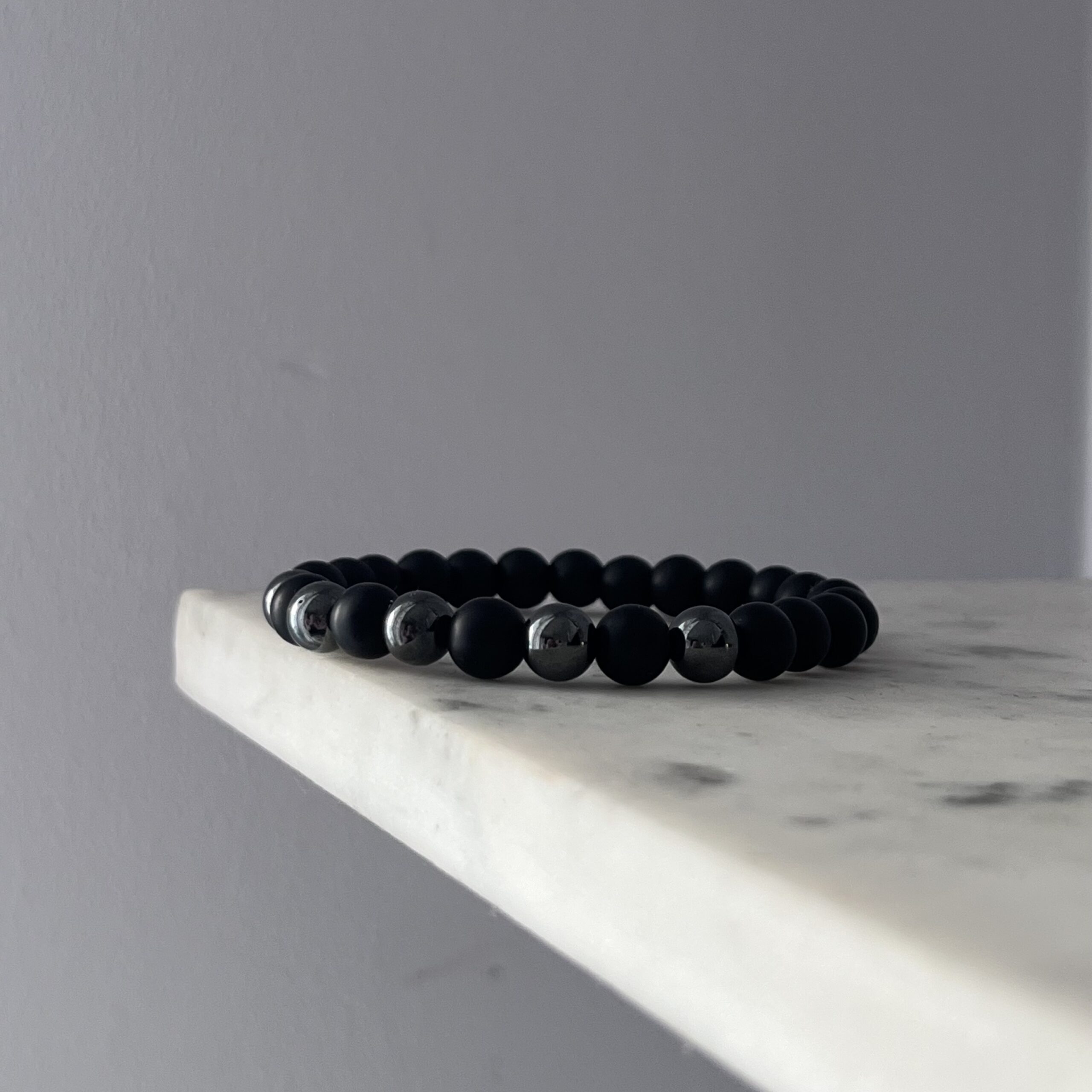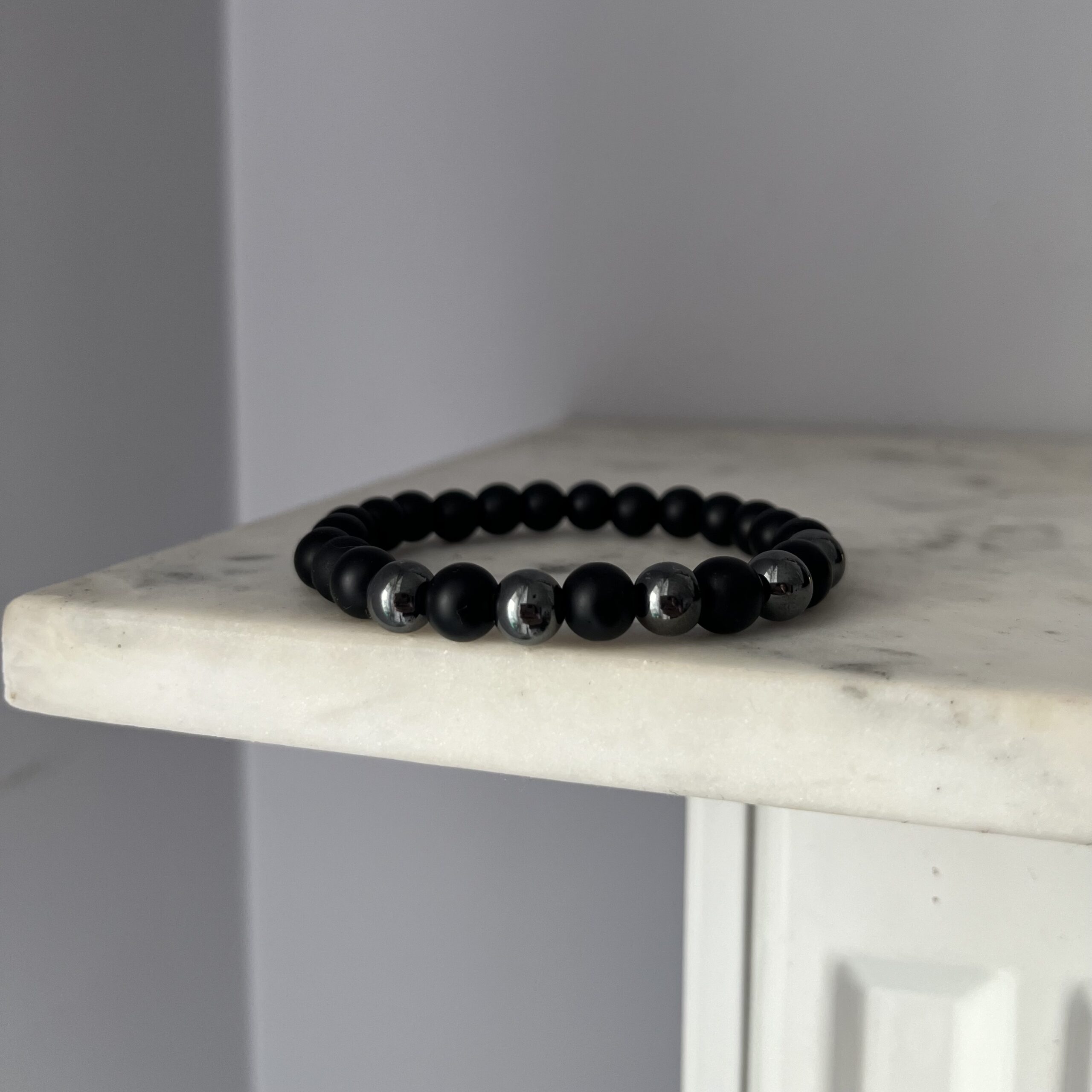 Klasyczna, minimalistyczna bransoletka wykonana z matowych kulek onyksu przełamanych błyszczącymi kulkami hematytu. Prosty układ i kontrast faktur sprawiają, że biżuteria wygląda niezwykle elegancko i ponadczasowo.