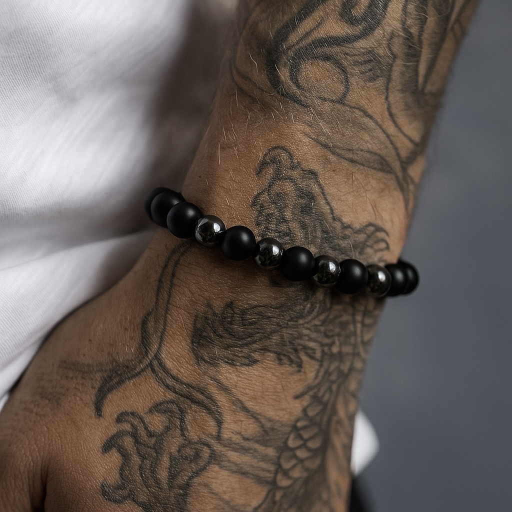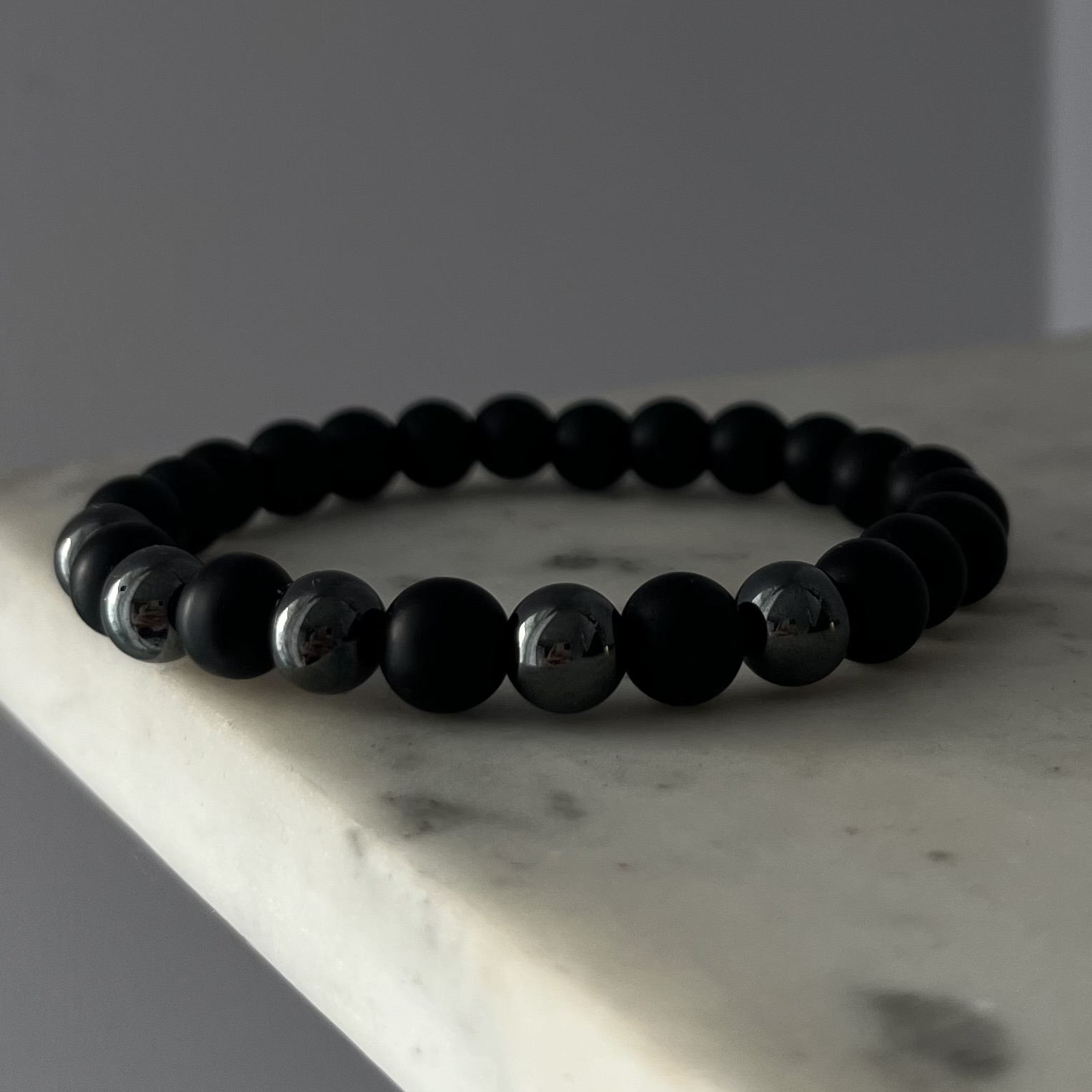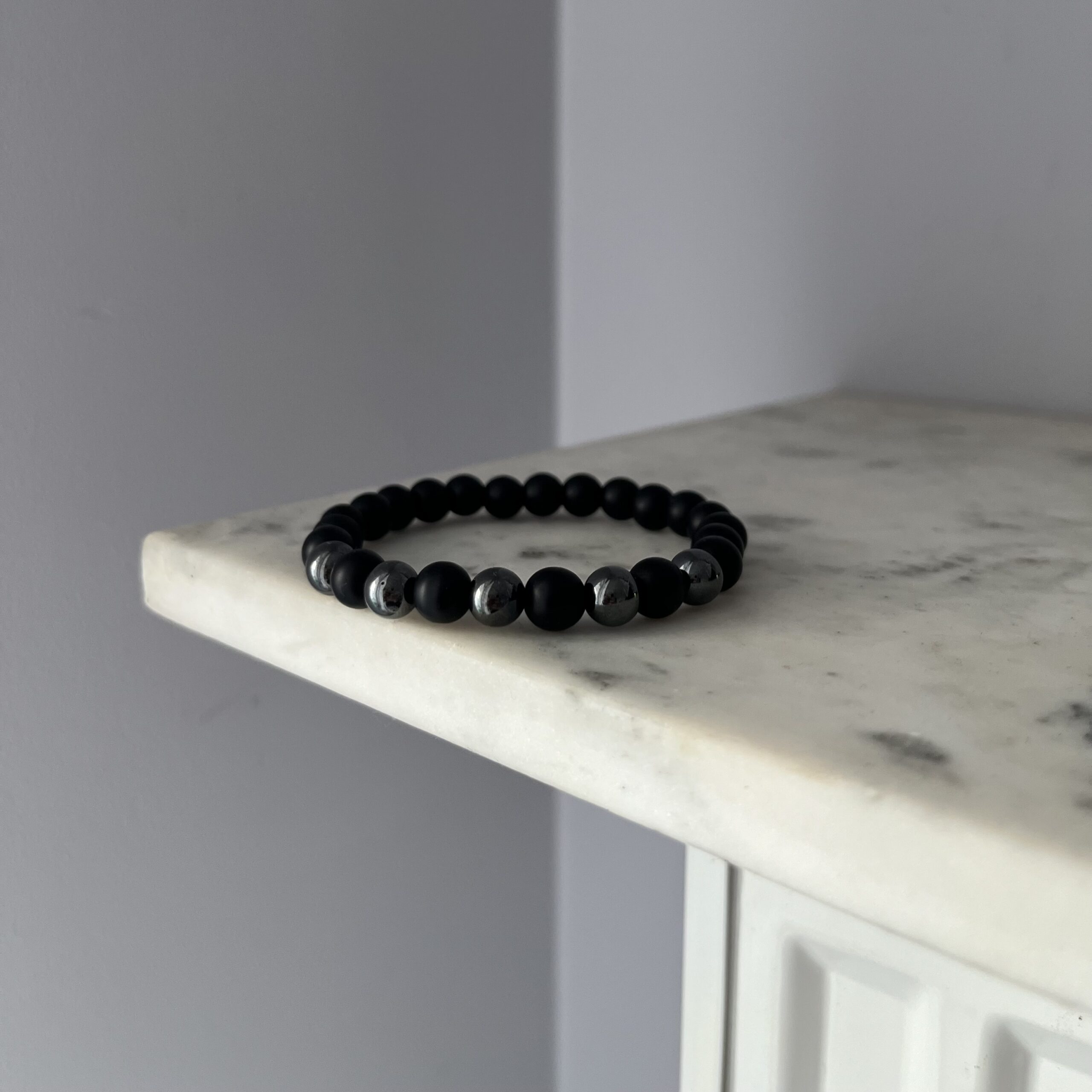 Klasyczna, minimalistyczna bransoletka wykonana z matowych kulek onyksu przełamanych błyszczącymi kulkami hematytu. Prosty układ i kontrast faktur sprawiają, że biżuteria wygląda niezwykle elegancko i ponadczasowo.