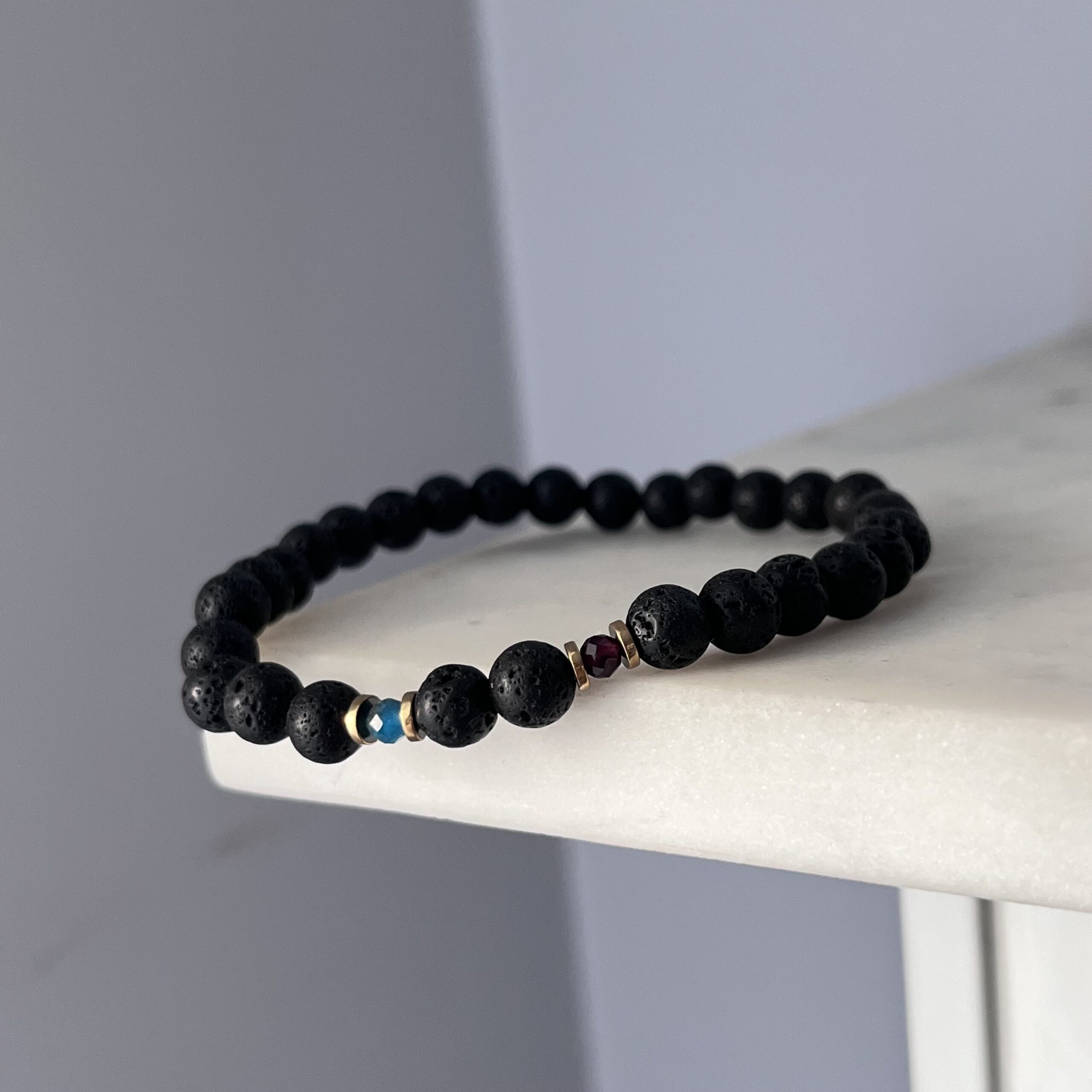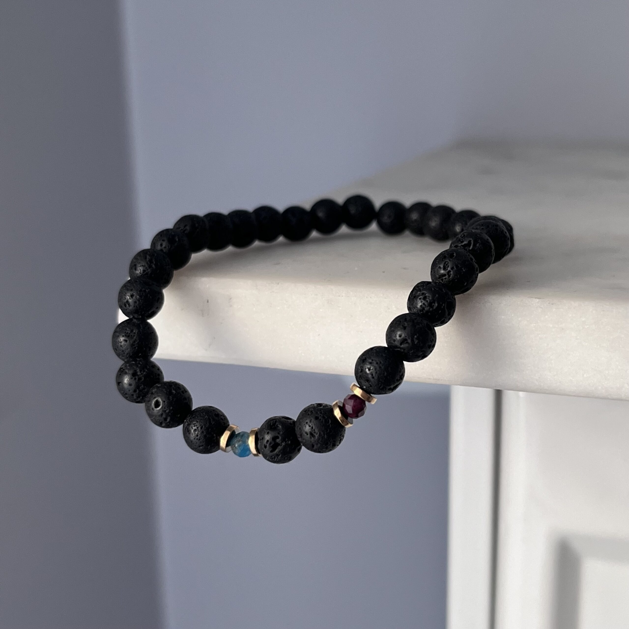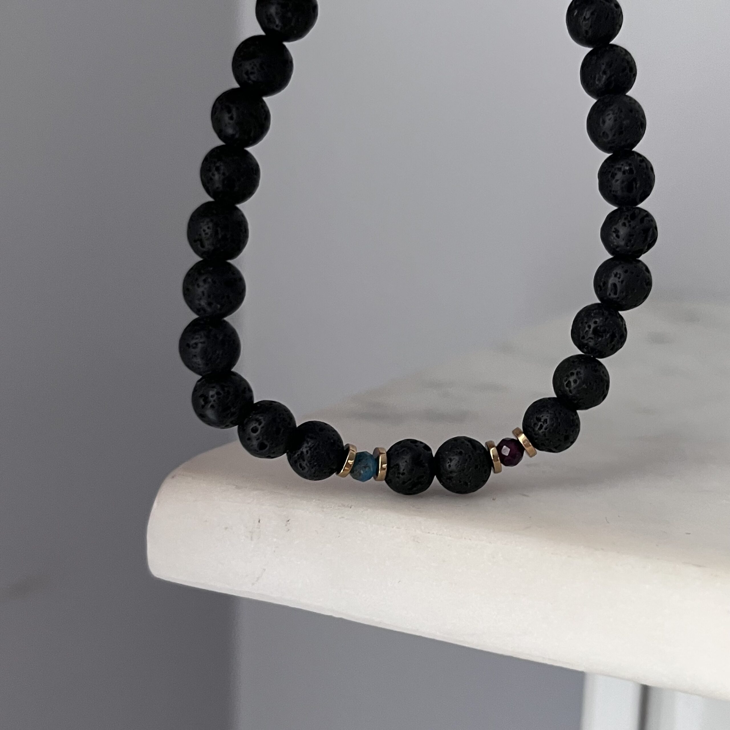 Bransoletka "Stone Line" to wyjątkowa kompozycja naturalnych kamieni, stworzona z myślą o mężczyznach ceniących siłę, charakter i styl. Ręcznie wykonana z matowej lawy wulkanicznej — kamienia surowej energii i mocy ziemi — przełamana została złotymi przekładkami ze stali szlachetnej oraz dwoma kamieniami o głębokim znaczeniu: granatem, symbolem pasji i odwagi, oraz turkusem, kamieniem harmonii i ochrony