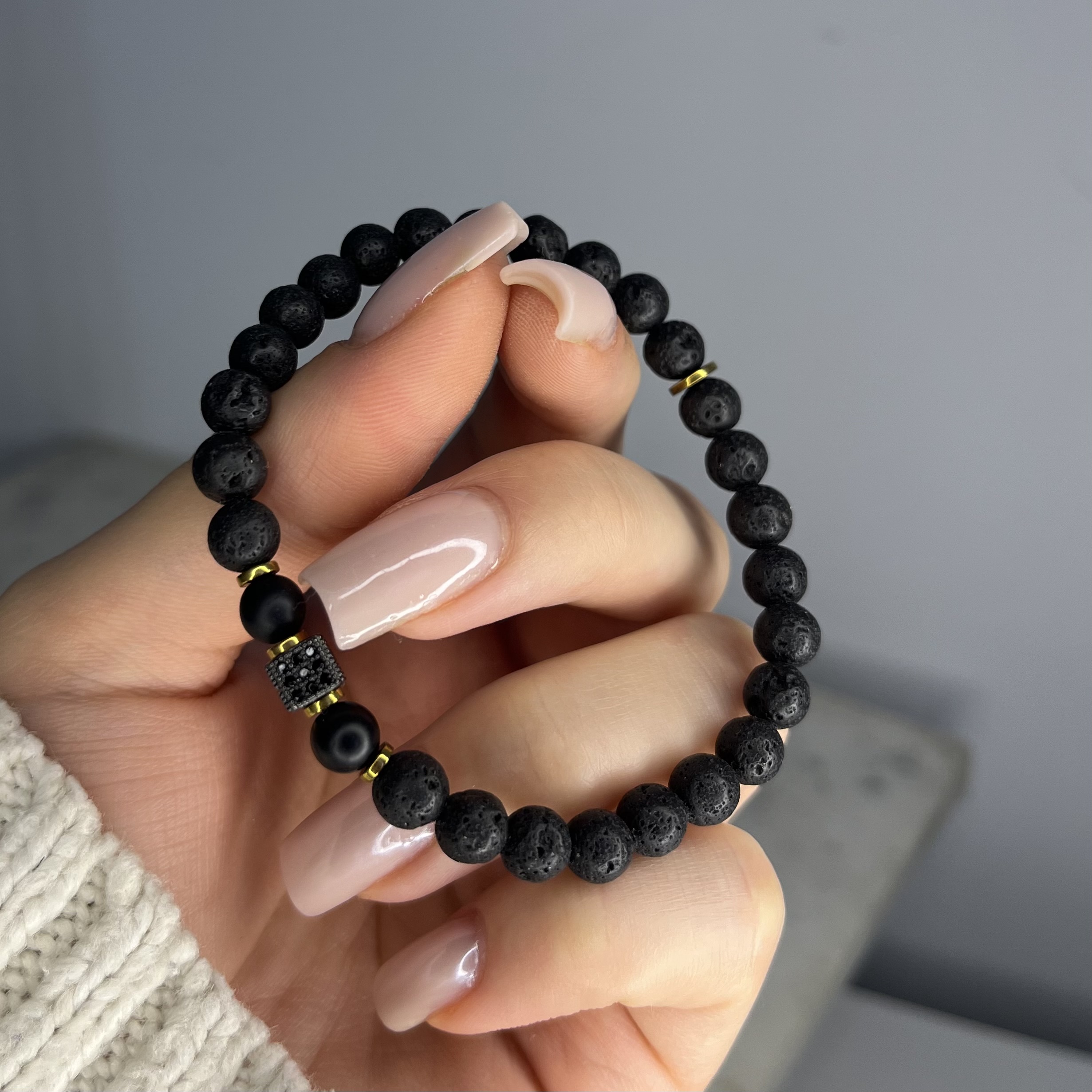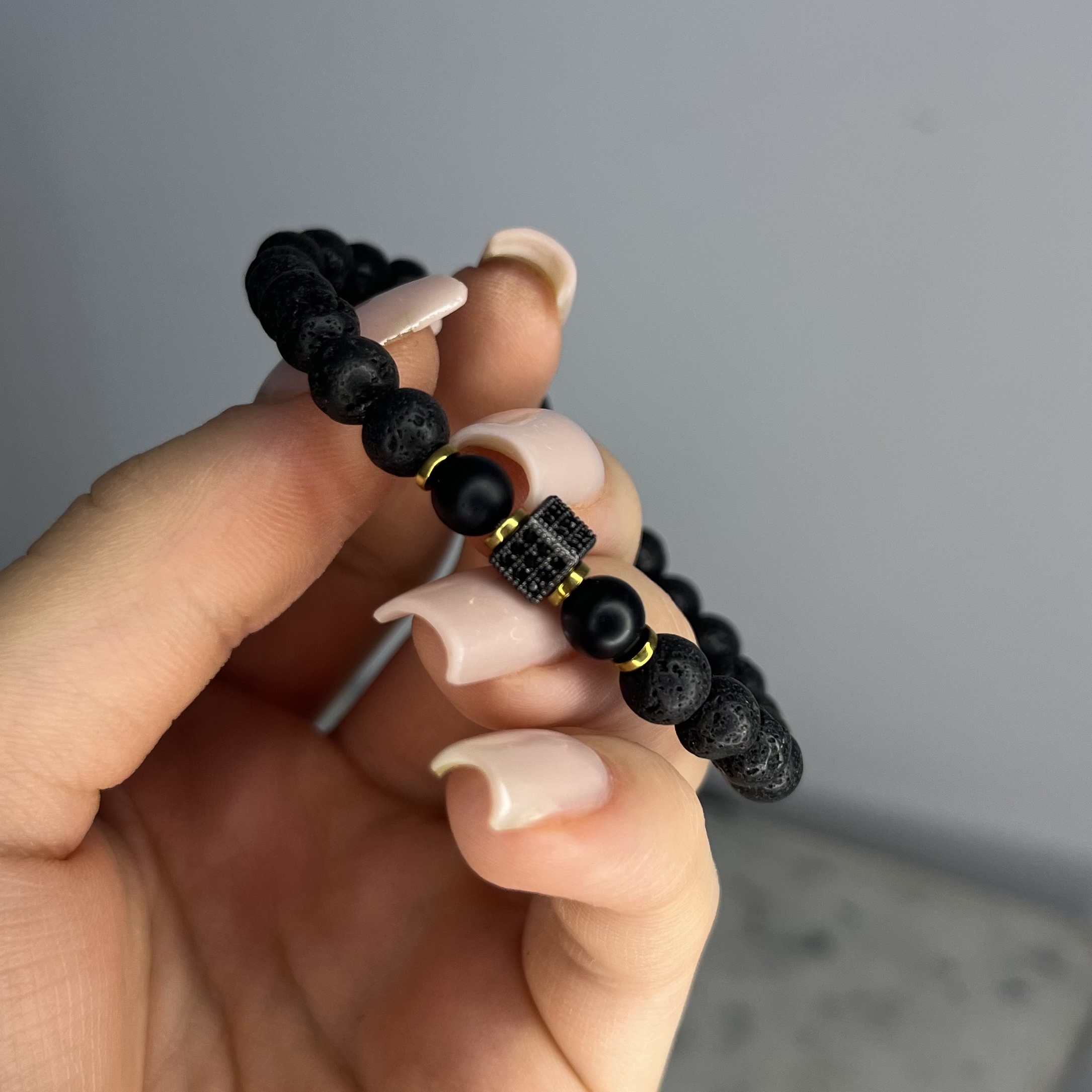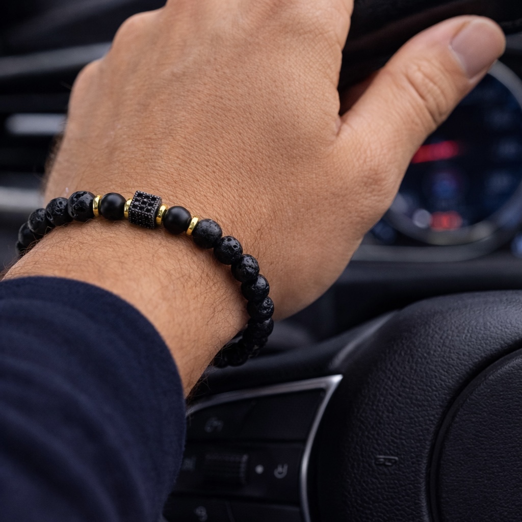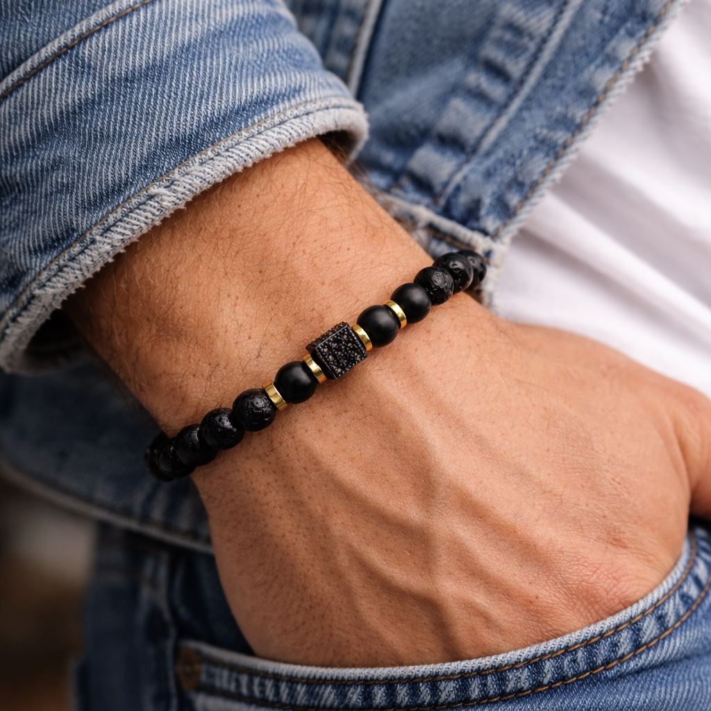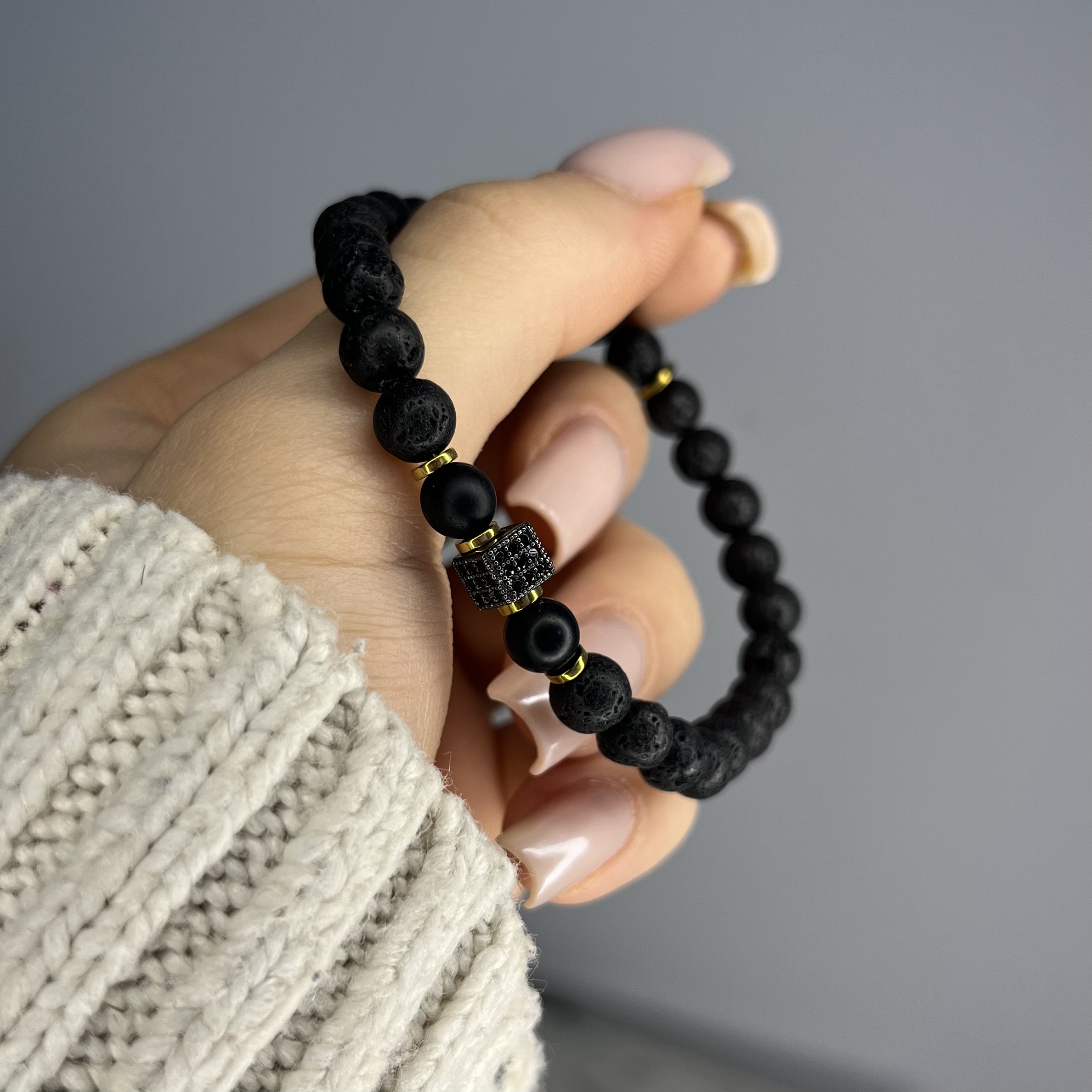 Surowa lawa wulkaniczna symbolizuje energię, stabilność i wewnętrzną moc. Matowy onyks podkreśla determinację oraz opanowanie, a złote hematytowe przekładki dodają elegancji i prestiżu. Centralnym punktem bransoletki jest kostka wysadzana czarnymi cyrkoniami, która przyciąga spojrzenia i nadaje całości wyjątkowego, męskiego blasku.