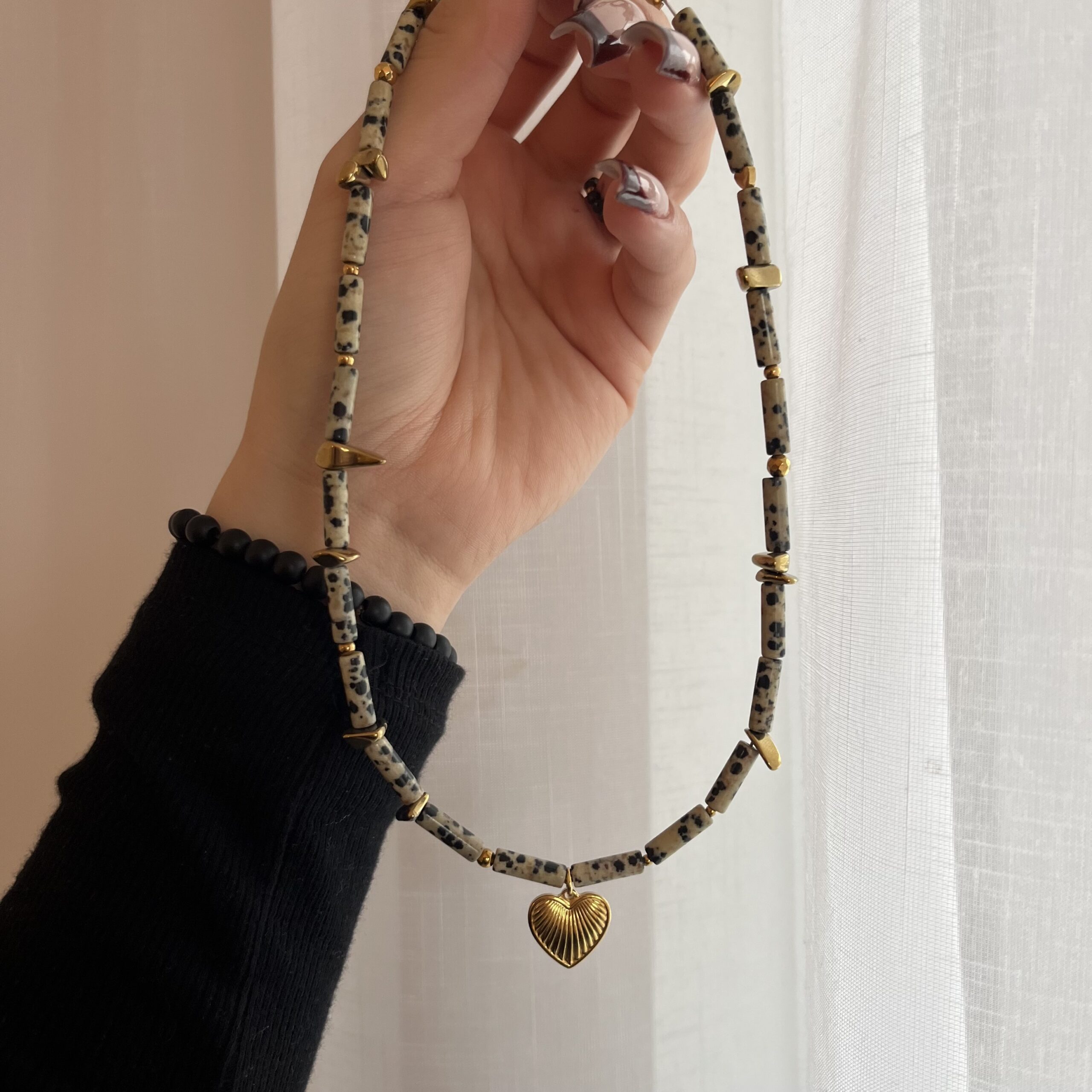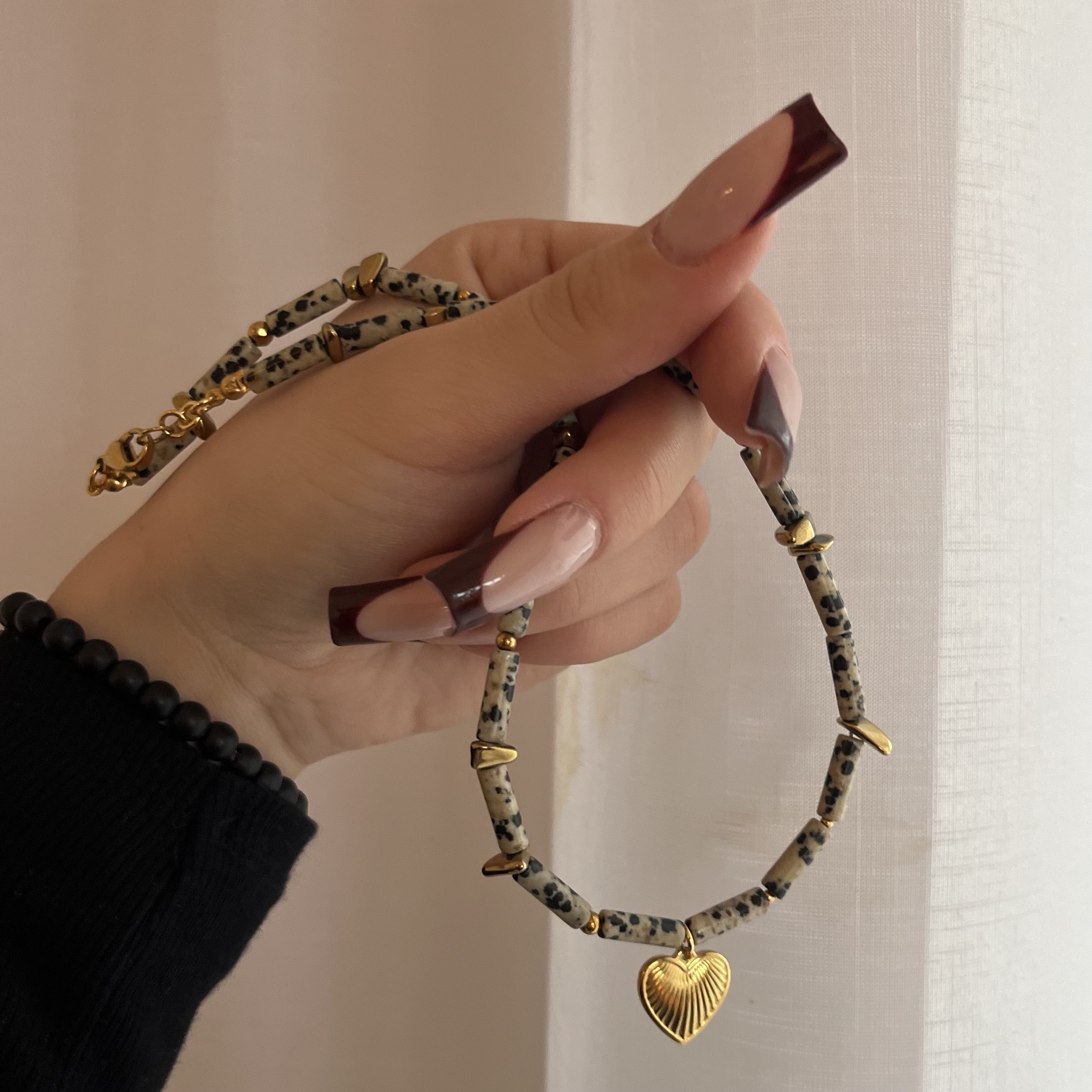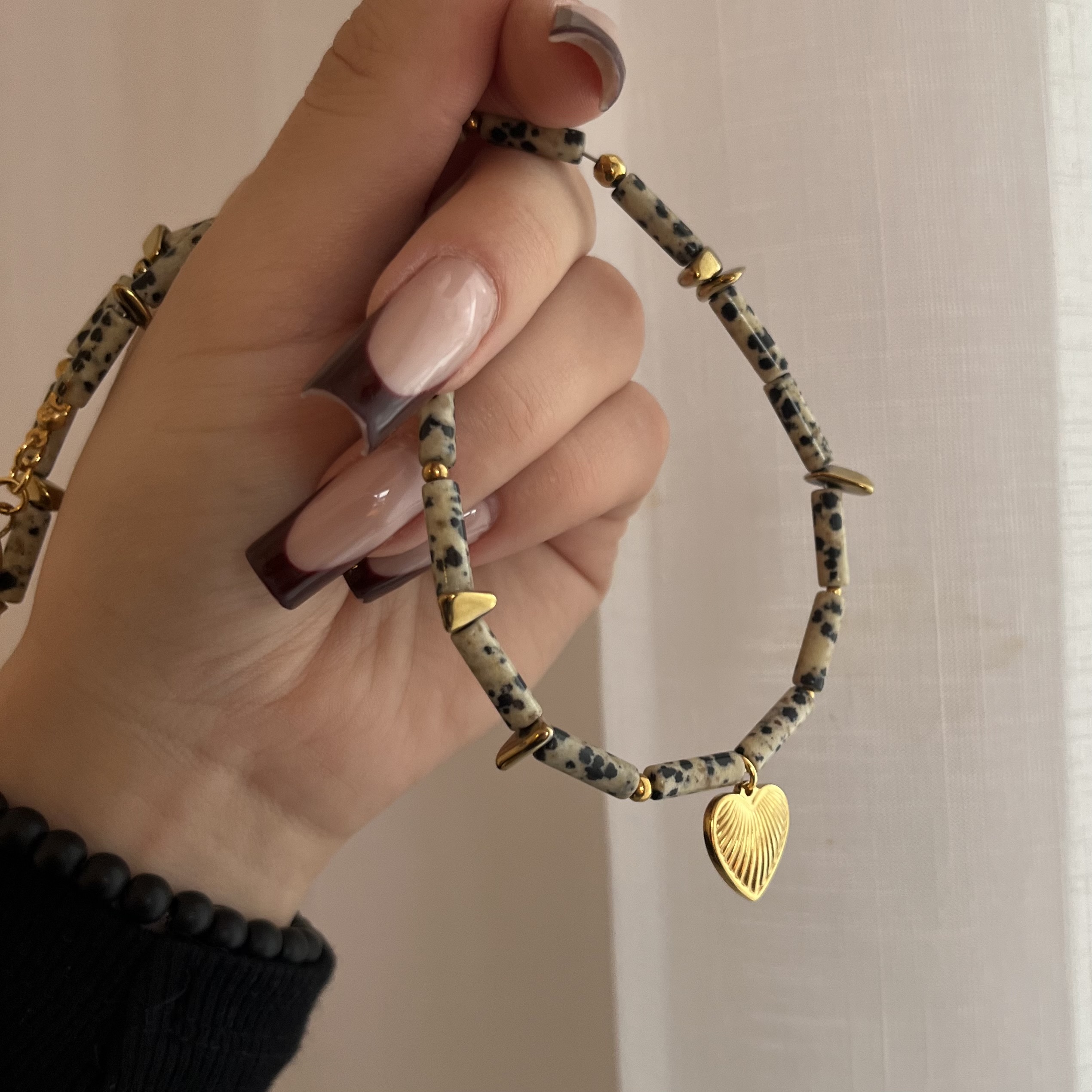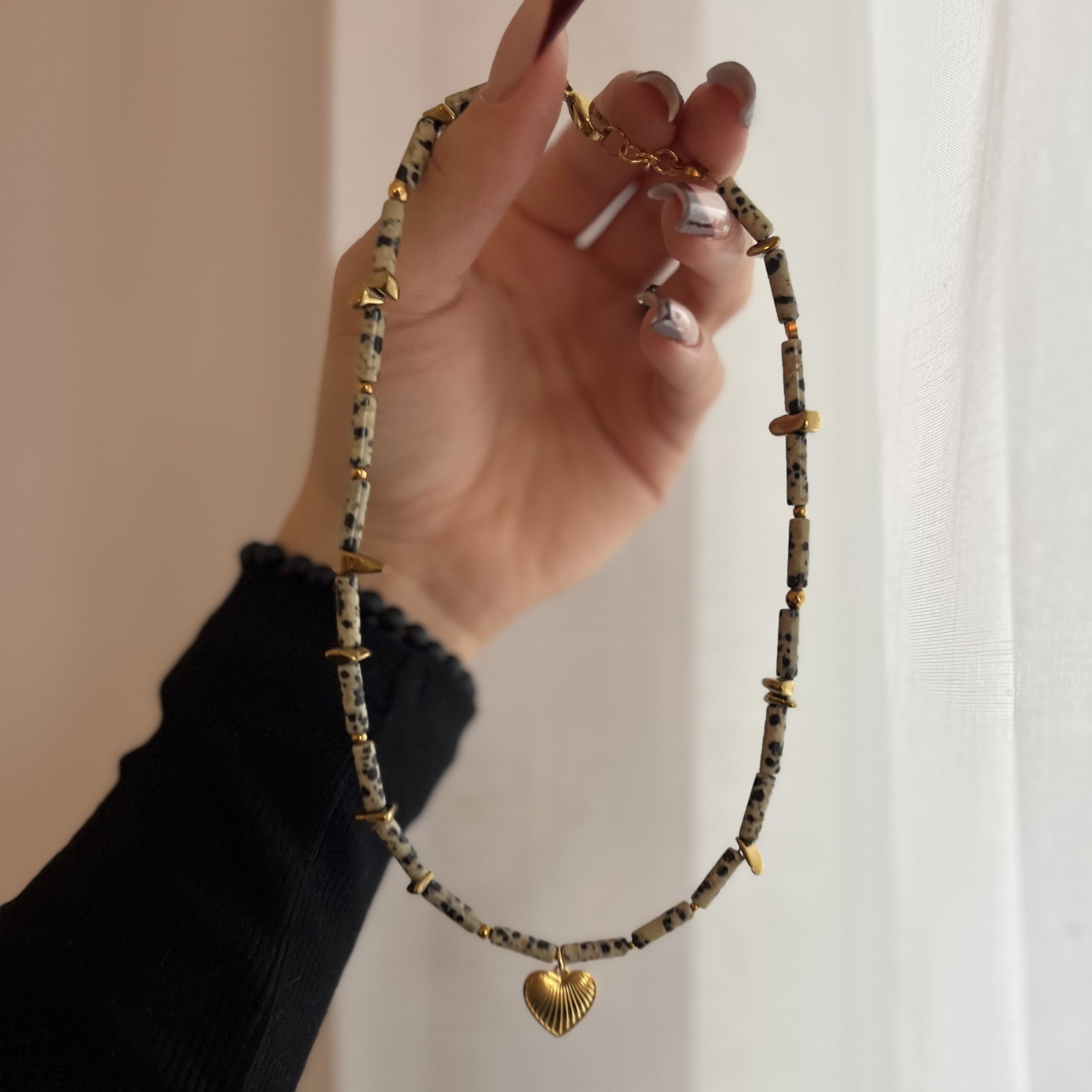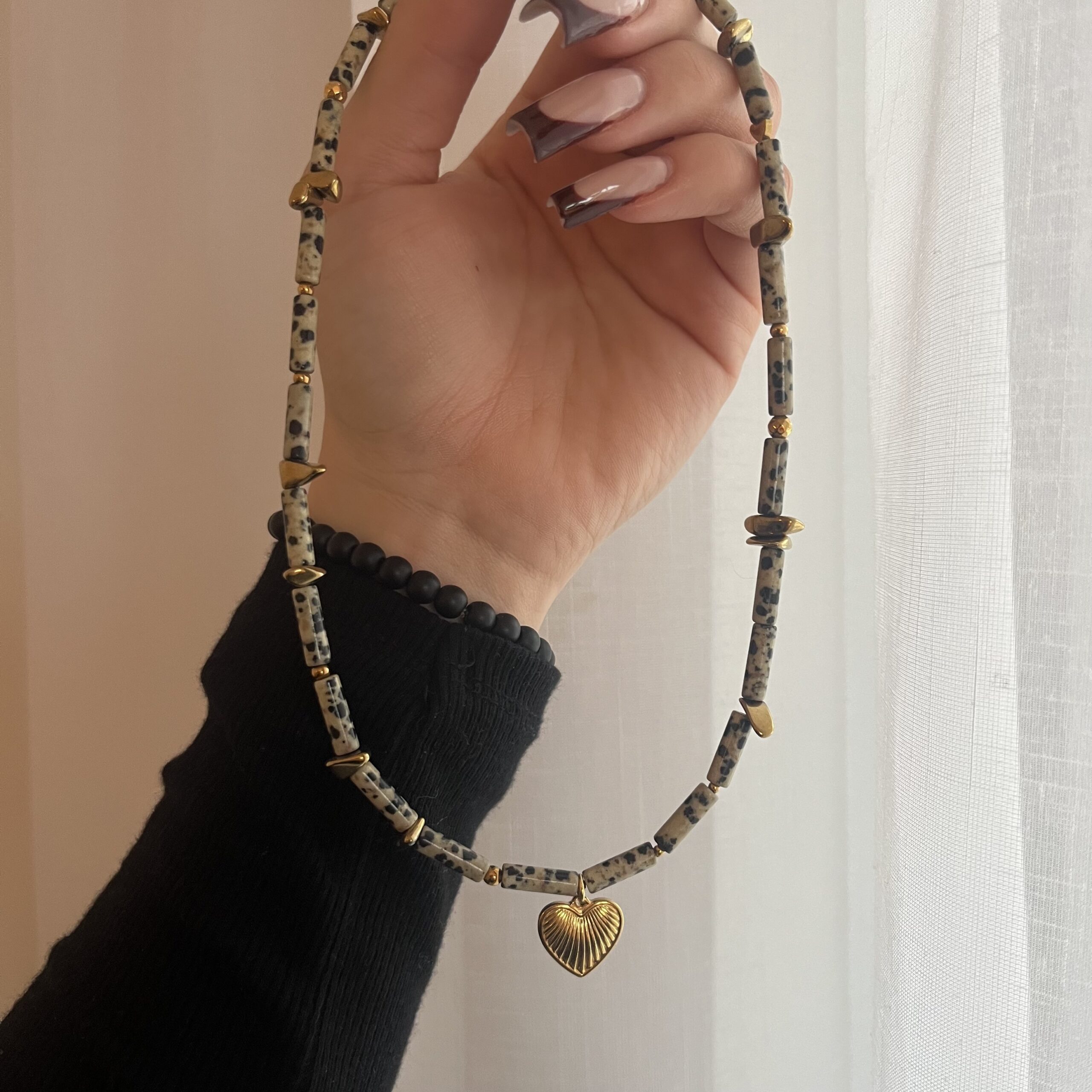 Naszyjnik Dalma Heart powstał z naturalnego jaspisu dalmatyńskiego, kamienia o wyjątkowym, nakrapianym wzorze. Kamień symbolizuje radość, harmonię i lekkość. Jego beżowo-czarna kolorystyka sprawia, że pasuje do każdej stylizacji — od casualowych po eleganckie.