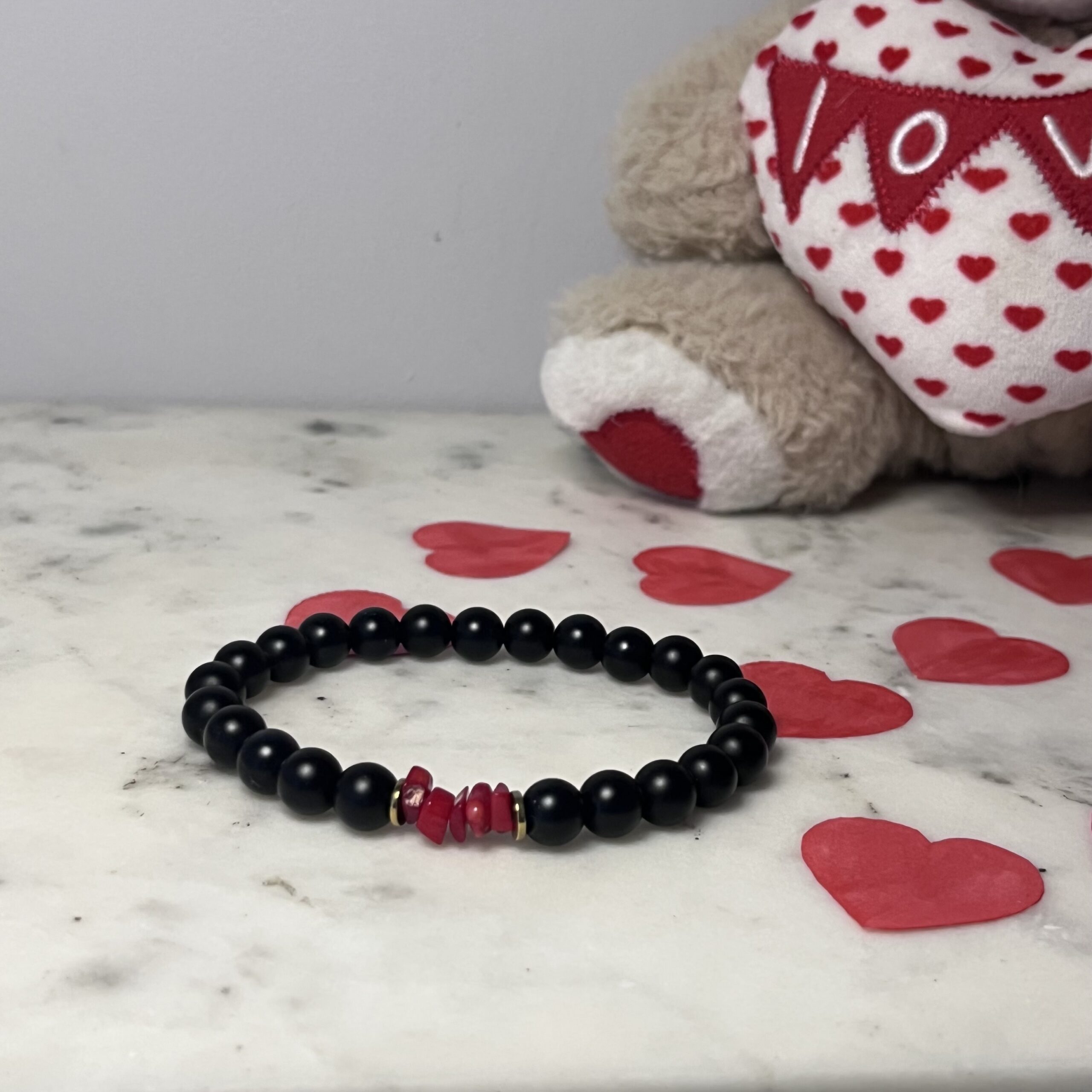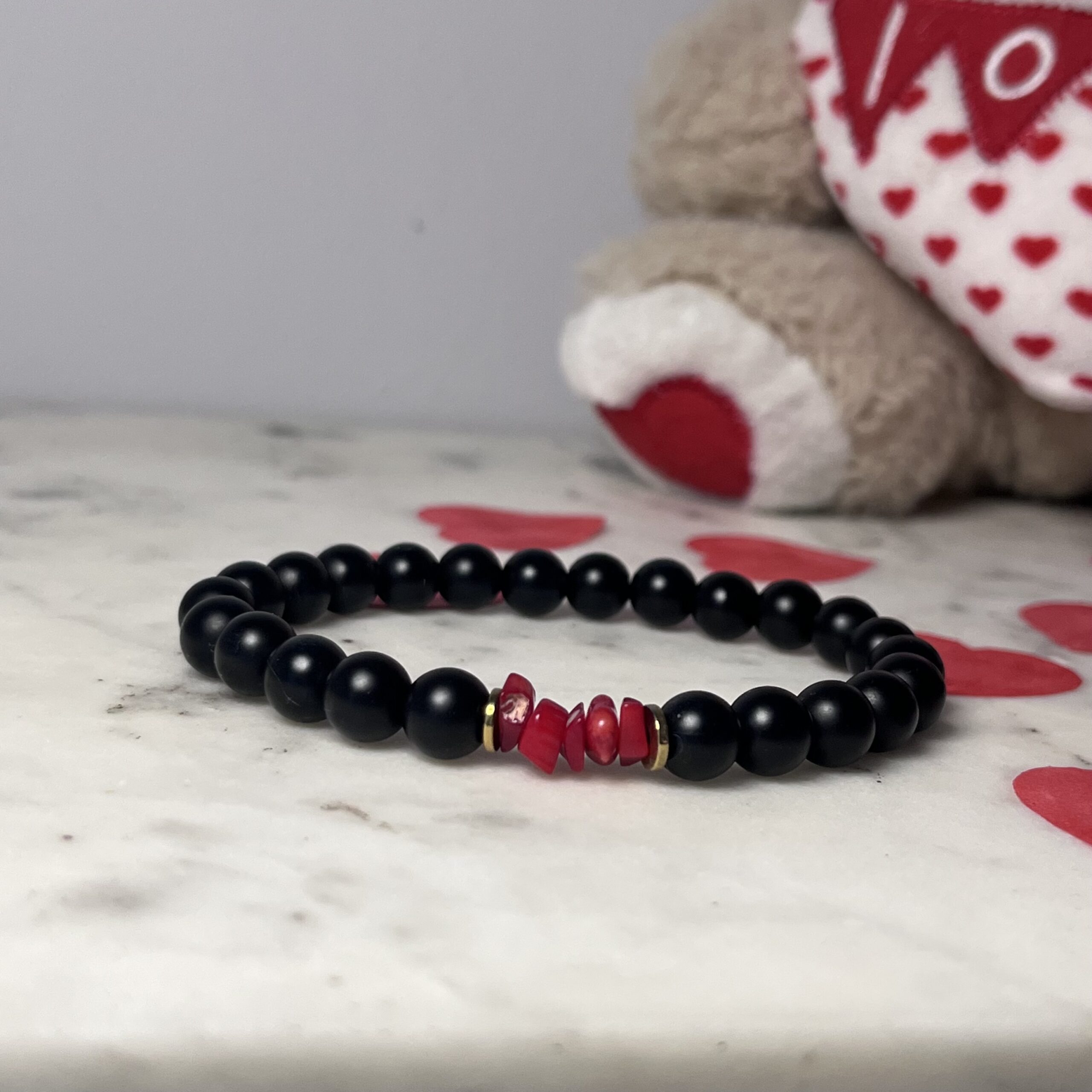 bransoletka męska dla fanów czerni i czerwieni. Onyks i Howlit czerwony, złote przekładki.
