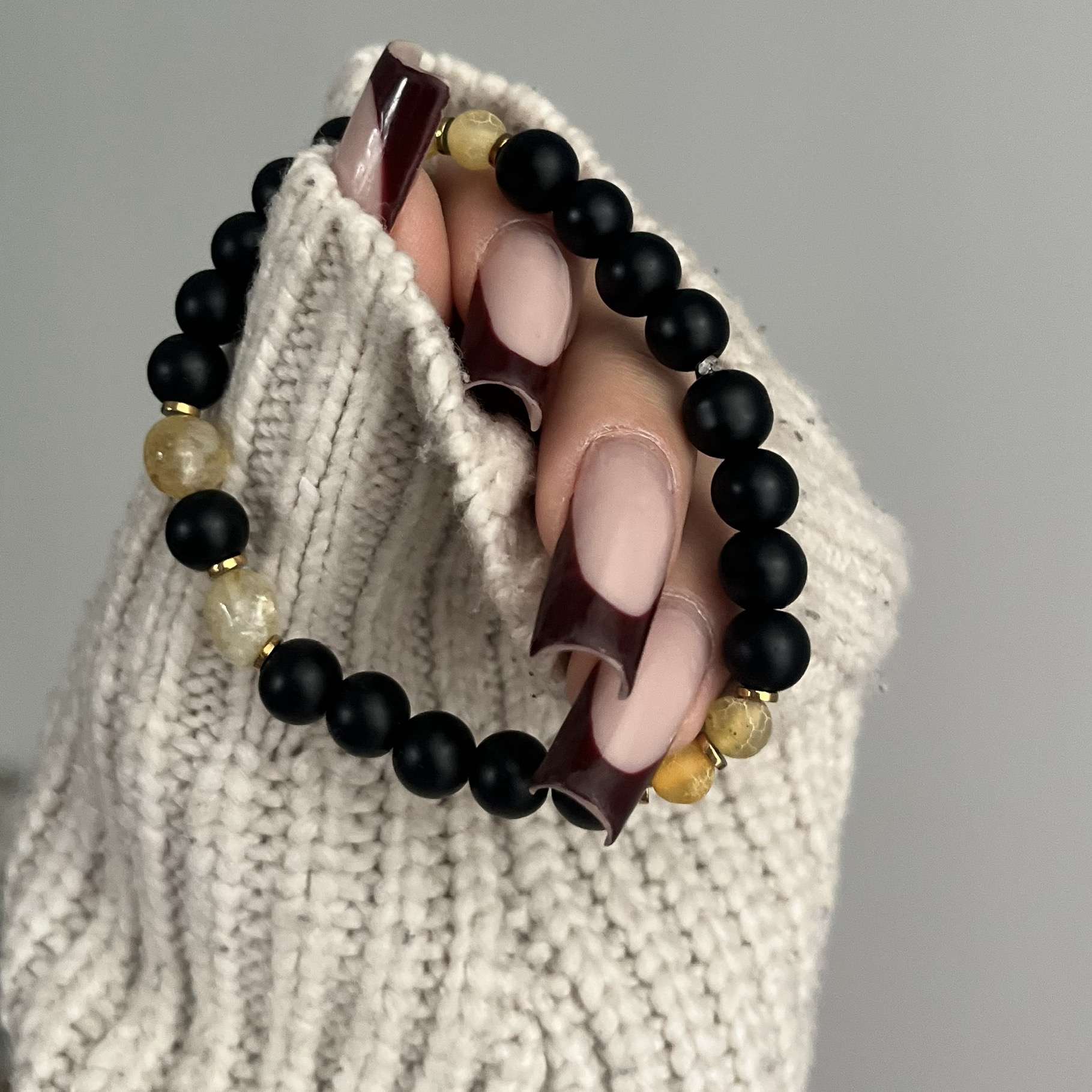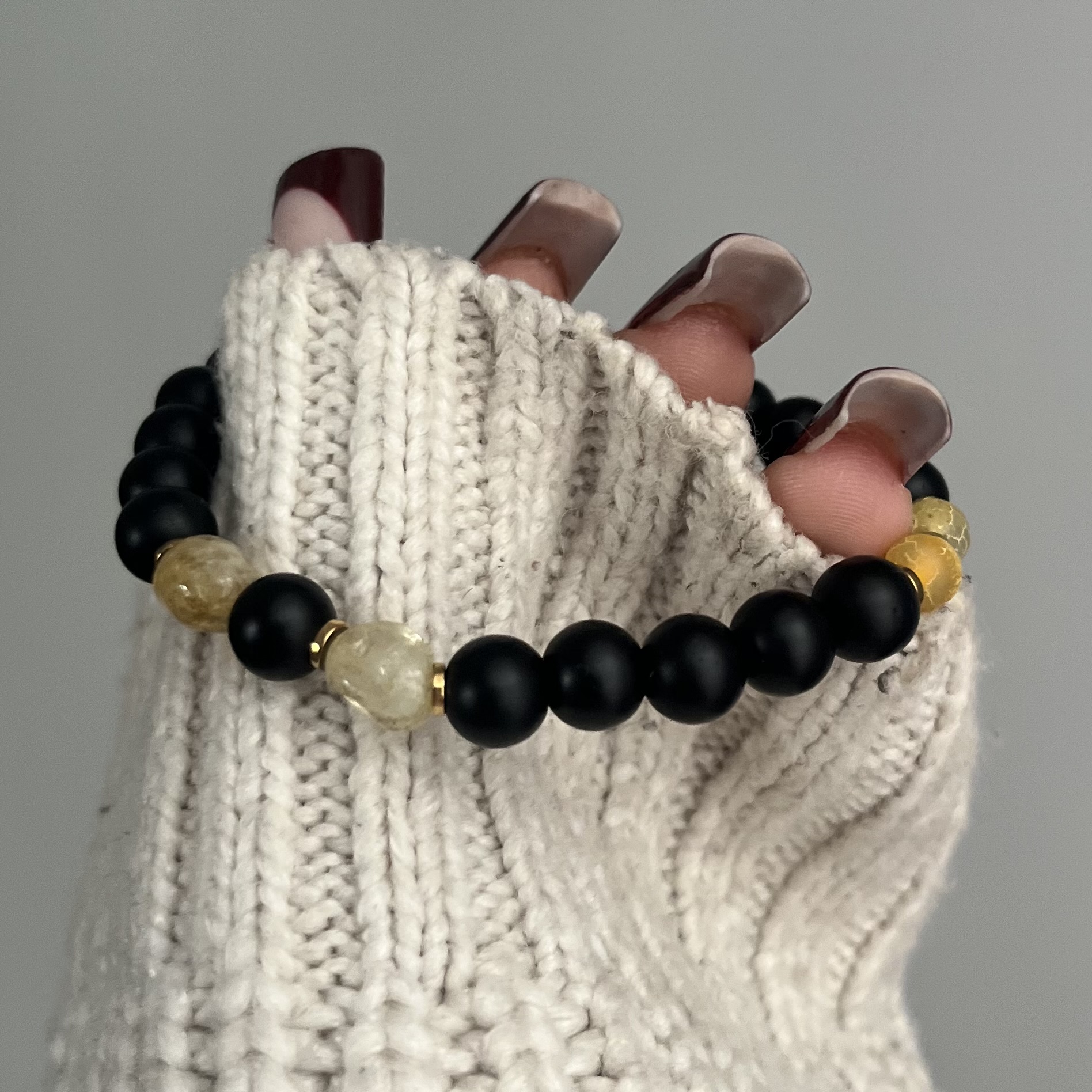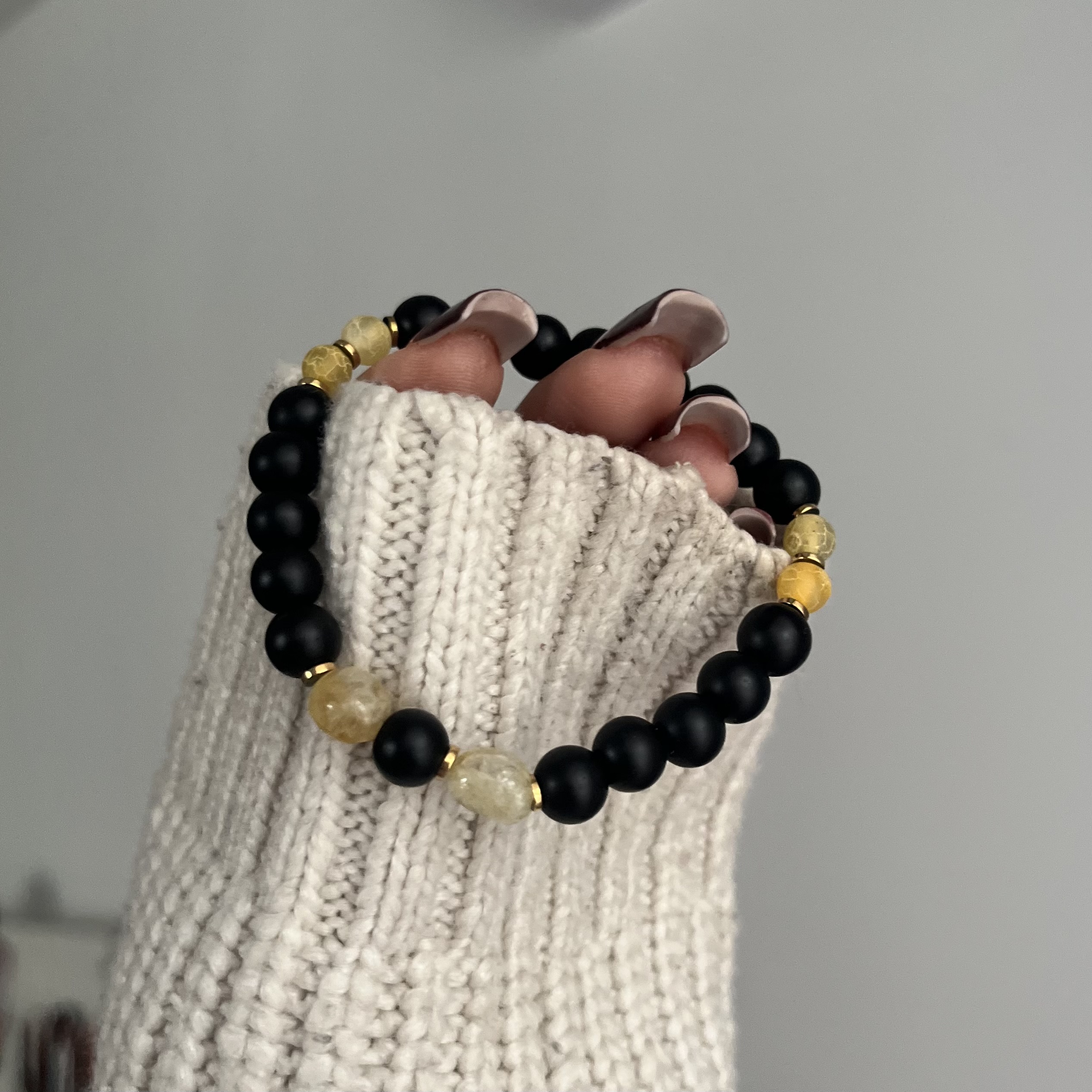 Męska bransoletka z onyksu i cytrynu to elegancka biżuteria łącząca minimalistyczny styl z mocą naturalnych kamieni. Matowy onyks symbolizuje siłę, pewność siebie i ochronę przed negatywną energią, natomiast cytryn dodaje energii, wspiera koncentrację i przyciąga dobrobyt. Całość uzupełniają złote przekładki z hematytu, które nadają bransoletce luksusowego charakteru oraz wzmacniają jej stabilizujące właściwości.