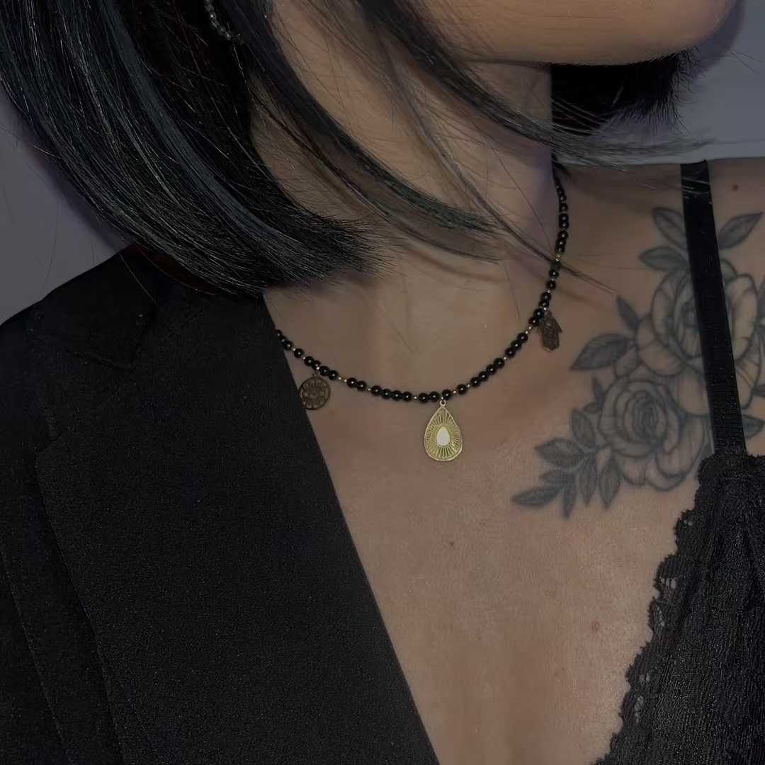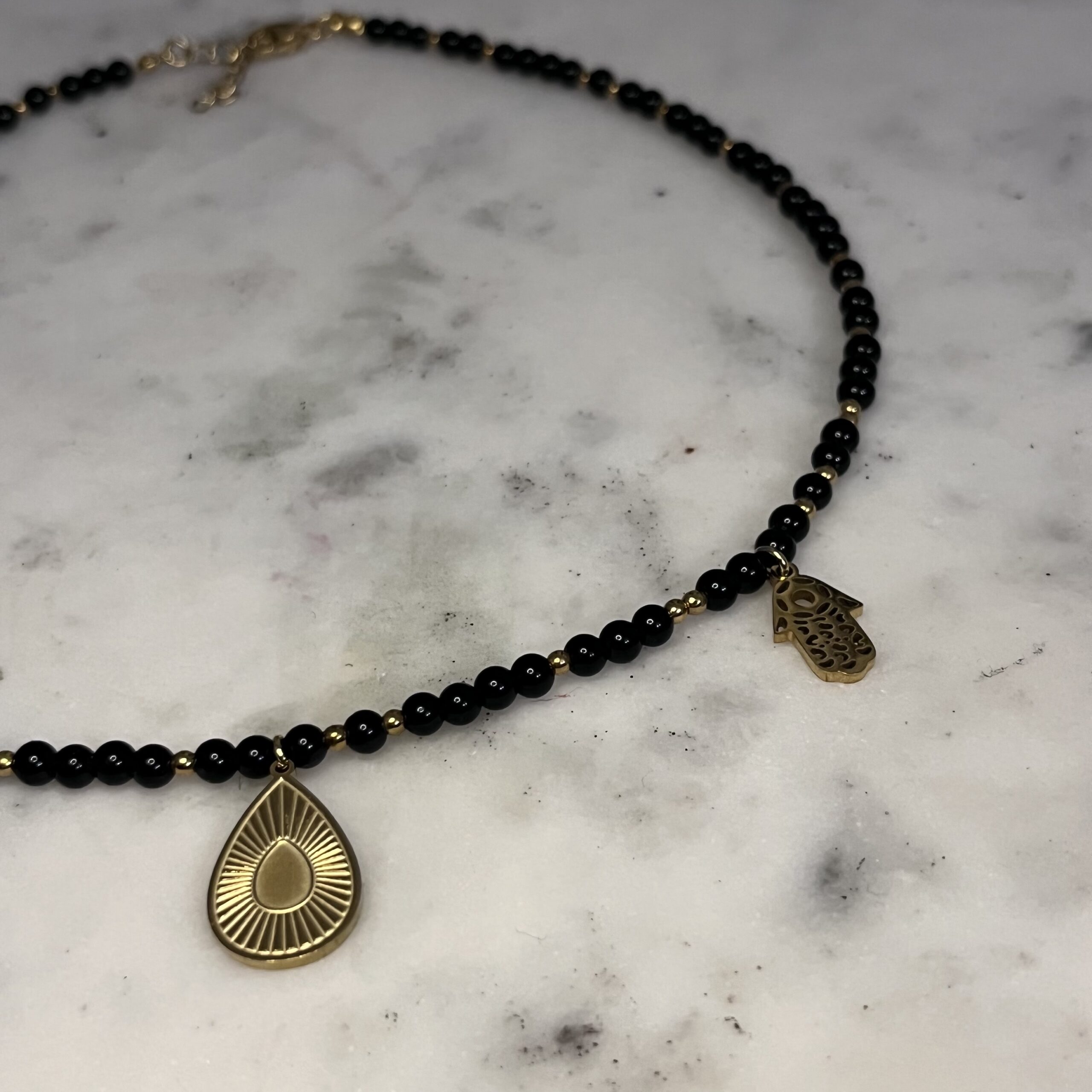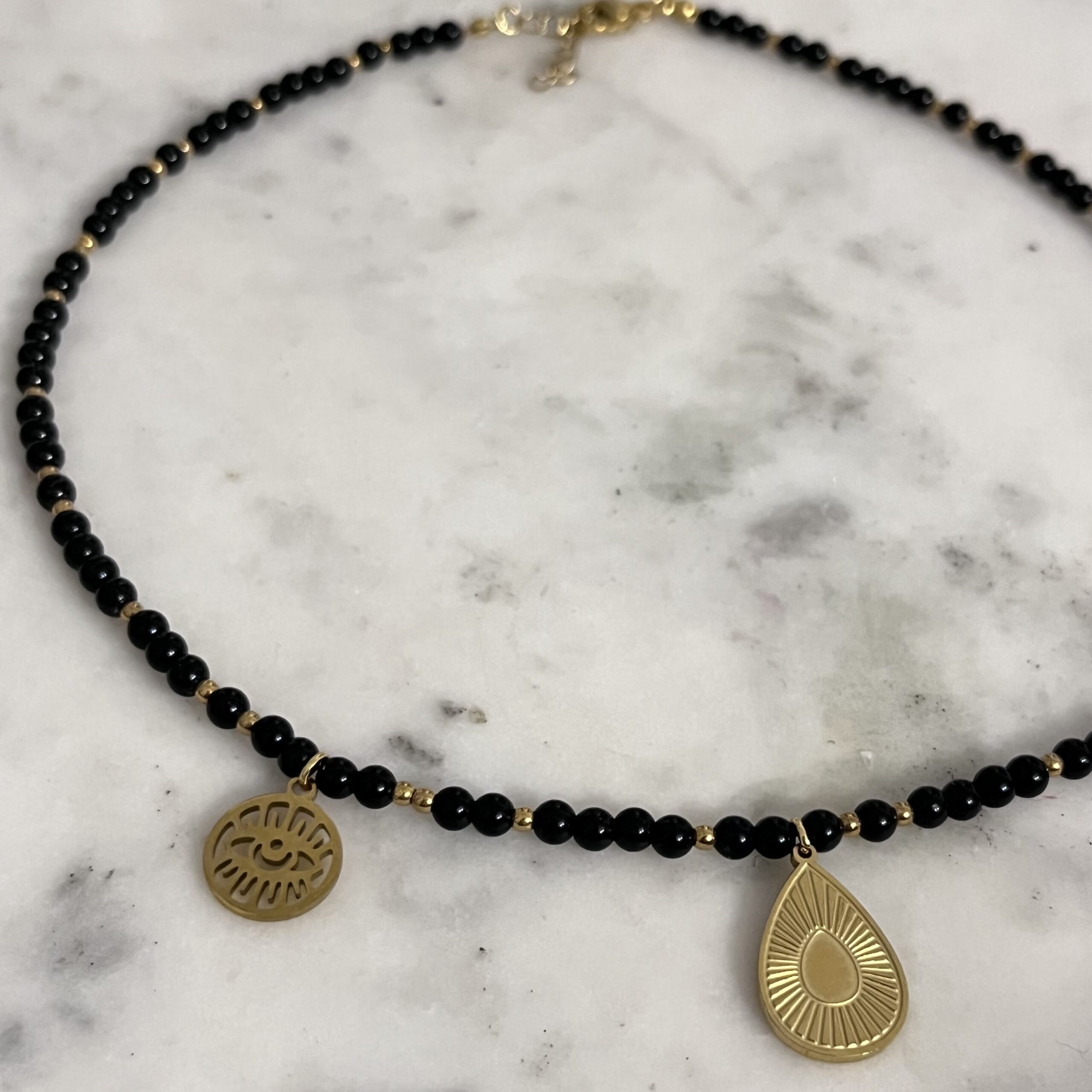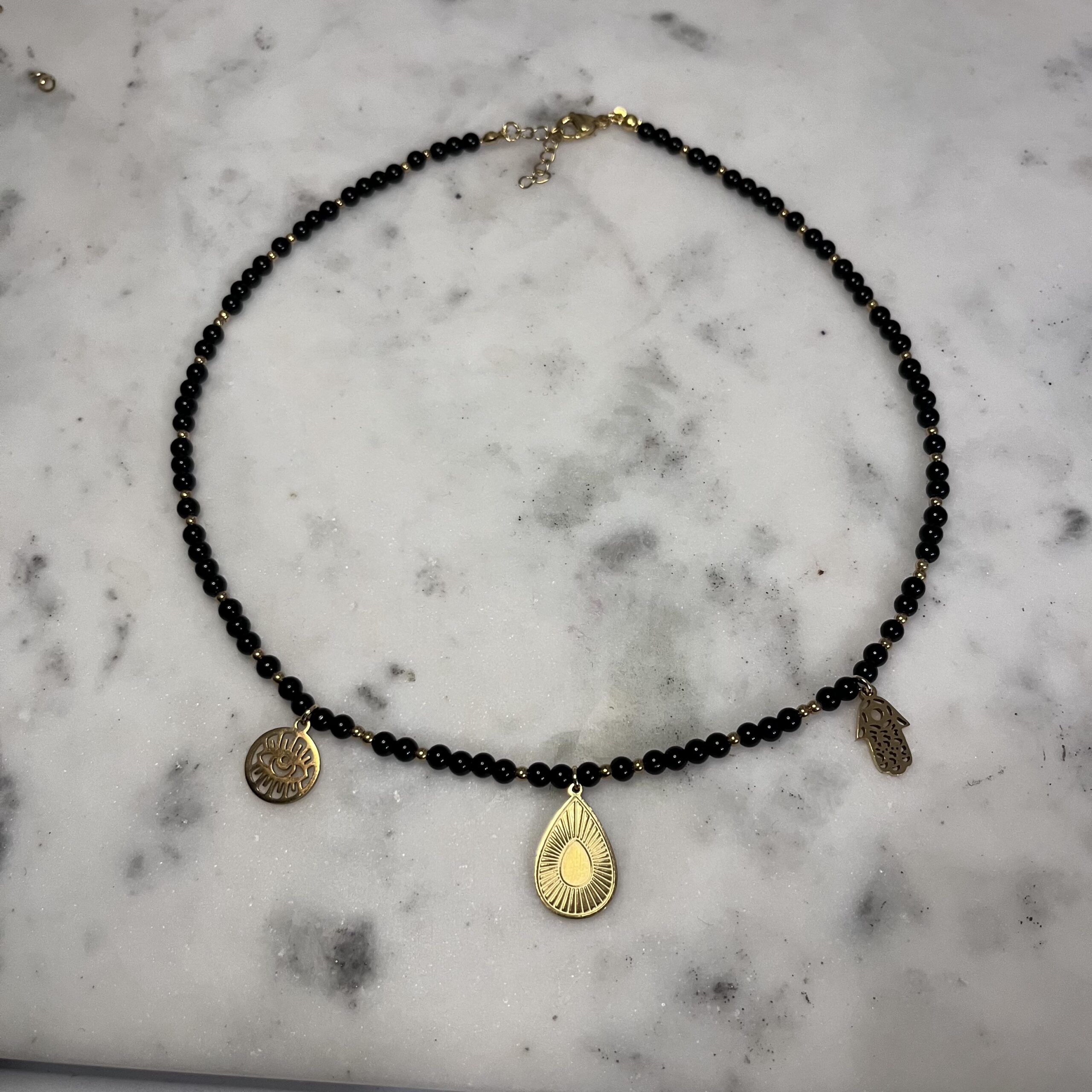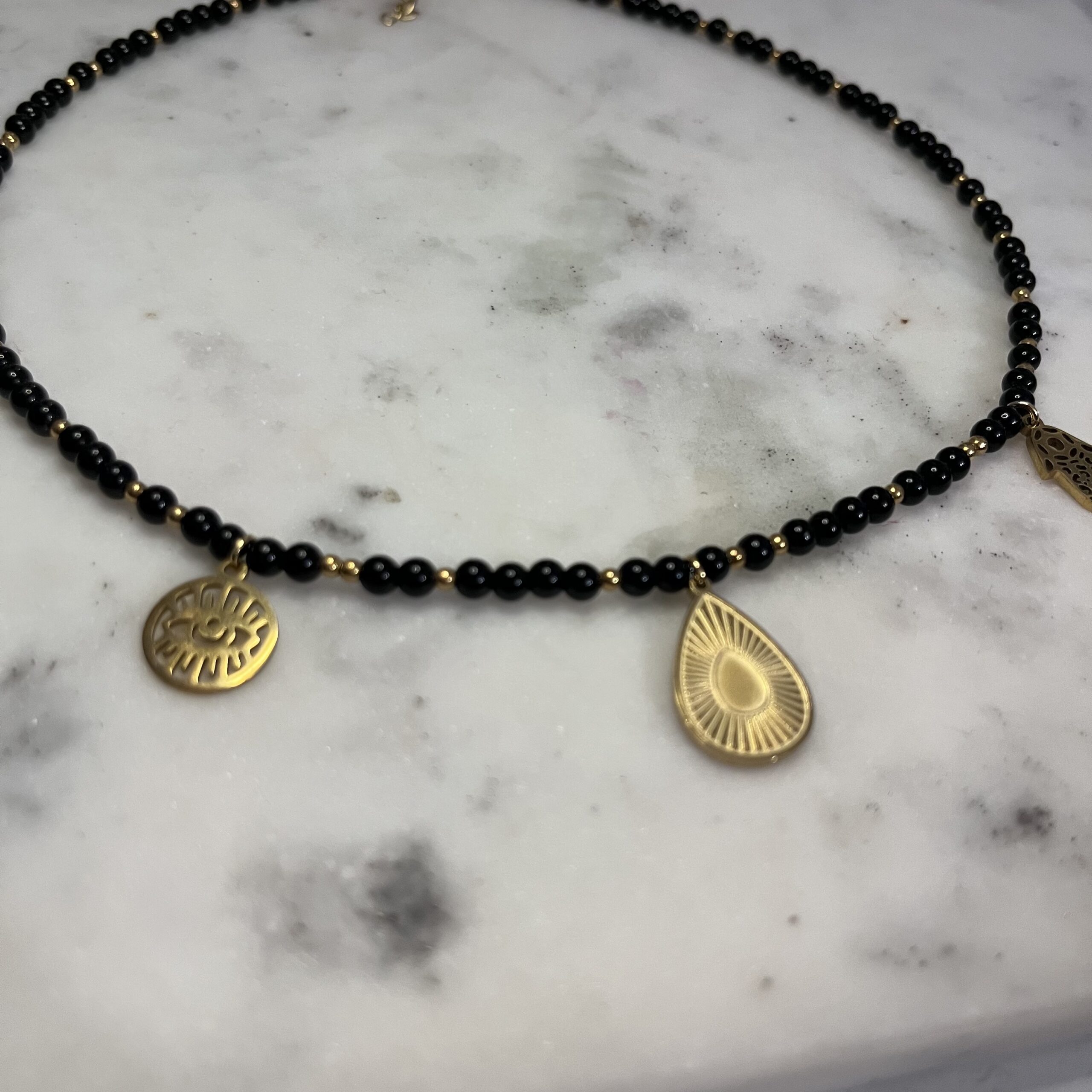 Czarny naszyjnik z zawieszkami, złote przekładki.