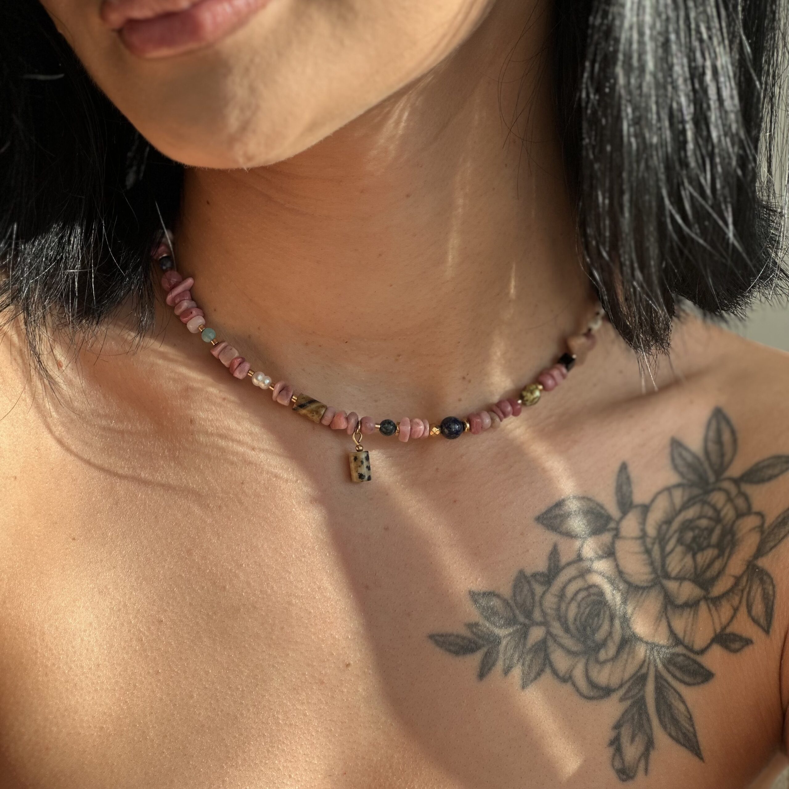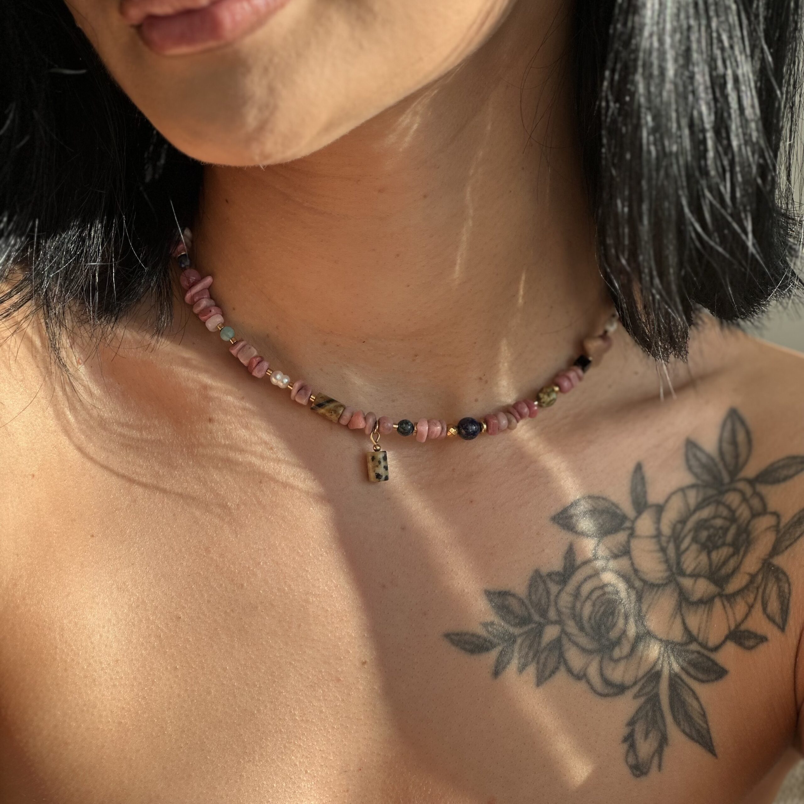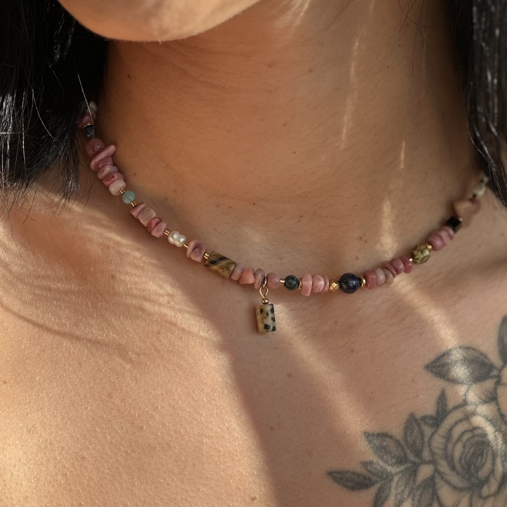 Naszyjnik z kamieni naturalnych „Czuły Dotyk” tworzę ręcznie z rodonitu, pereł, turkusu i lapis lazuli, łącząc je w subtelną, kobiecą kompozycję o harmonijnym charakterze. Każdy egzemplarz powstaje z dbałością o detal i jest unikatowy.