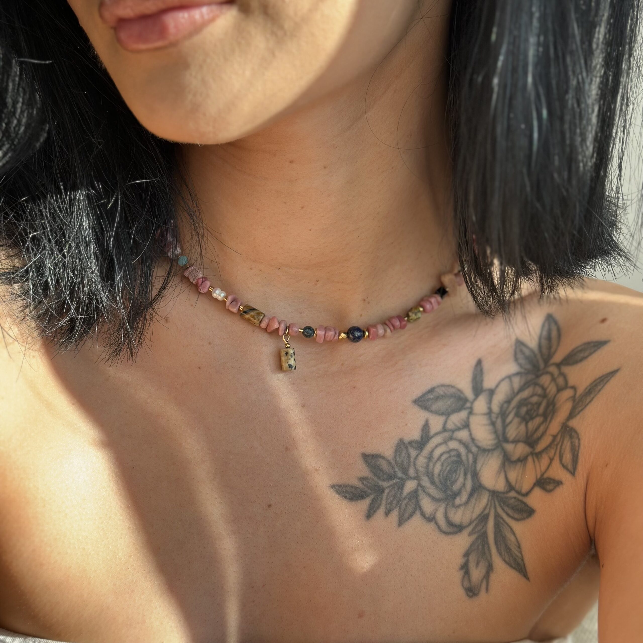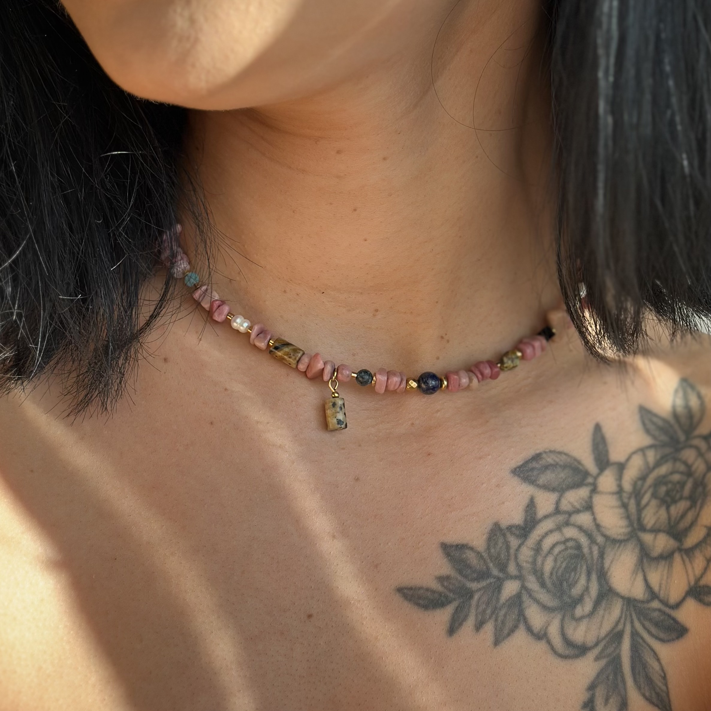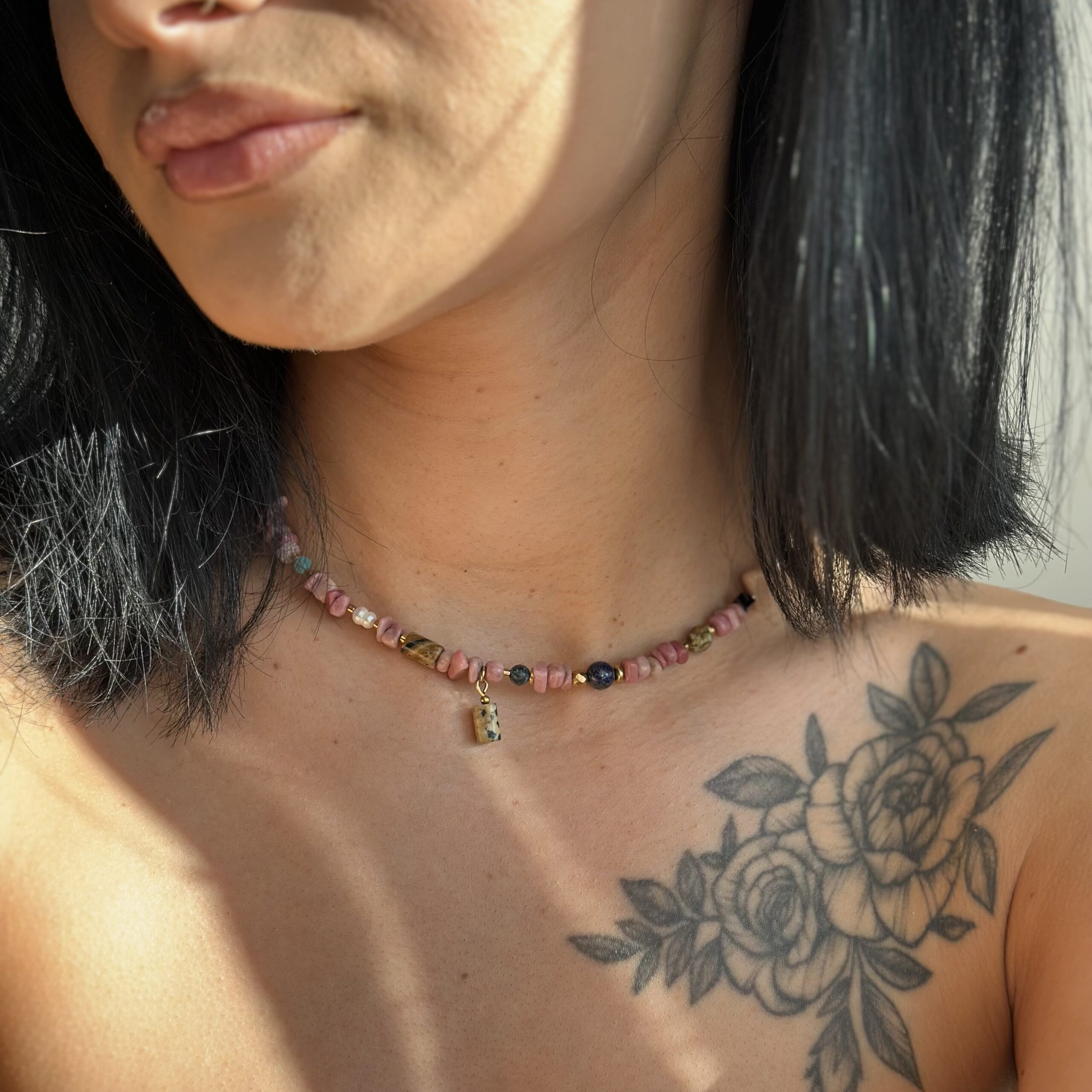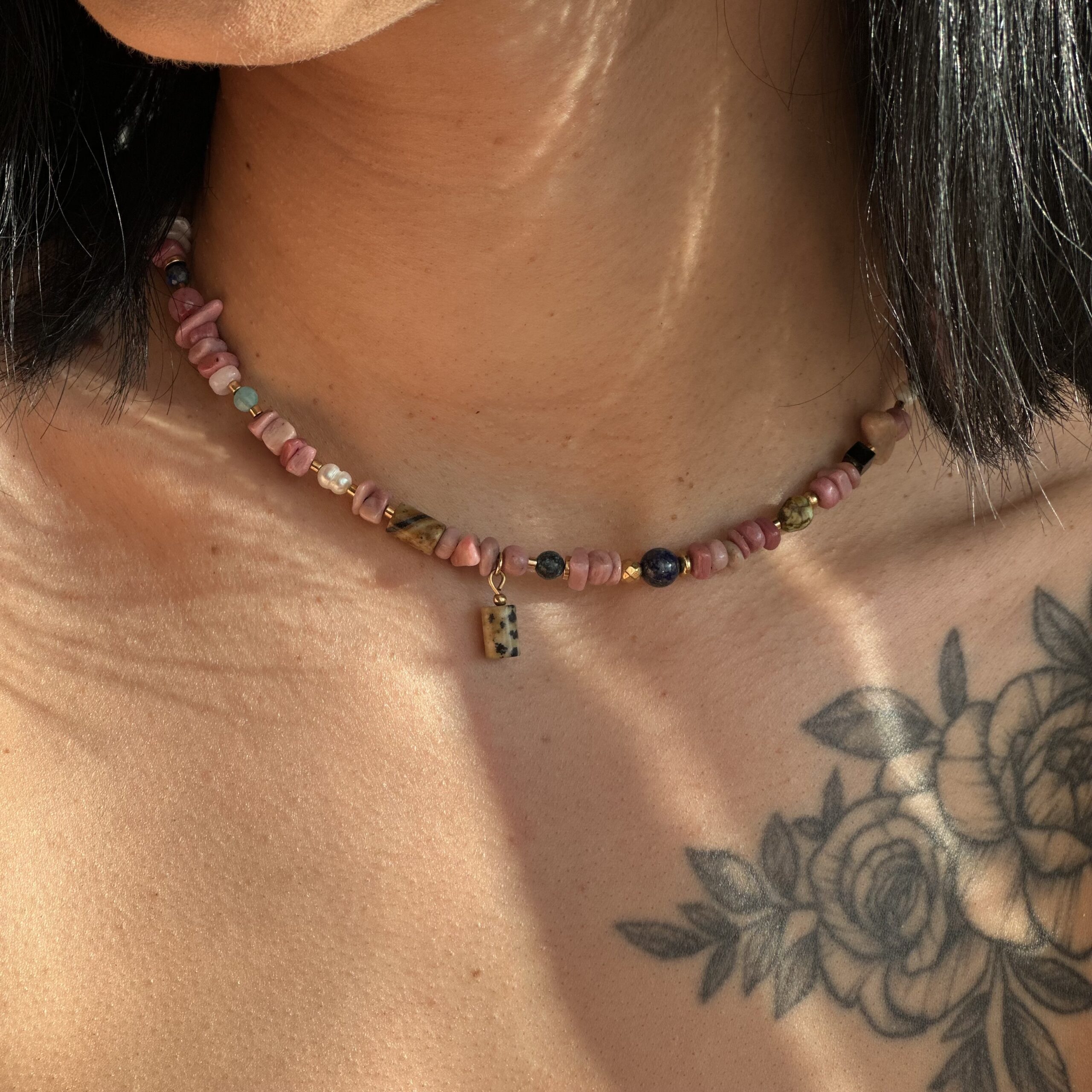 Naszyjnik z kamieni naturalnych „Czuły Dotyk” tworzę ręcznie z rodonitu, pereł, turkusu i lapis lazuli, łącząc je w subtelną, kobiecą kompozycję o harmonijnym charakterze. Każdy egzemplarz powstaje z dbałością o detal i jest unikatowy.