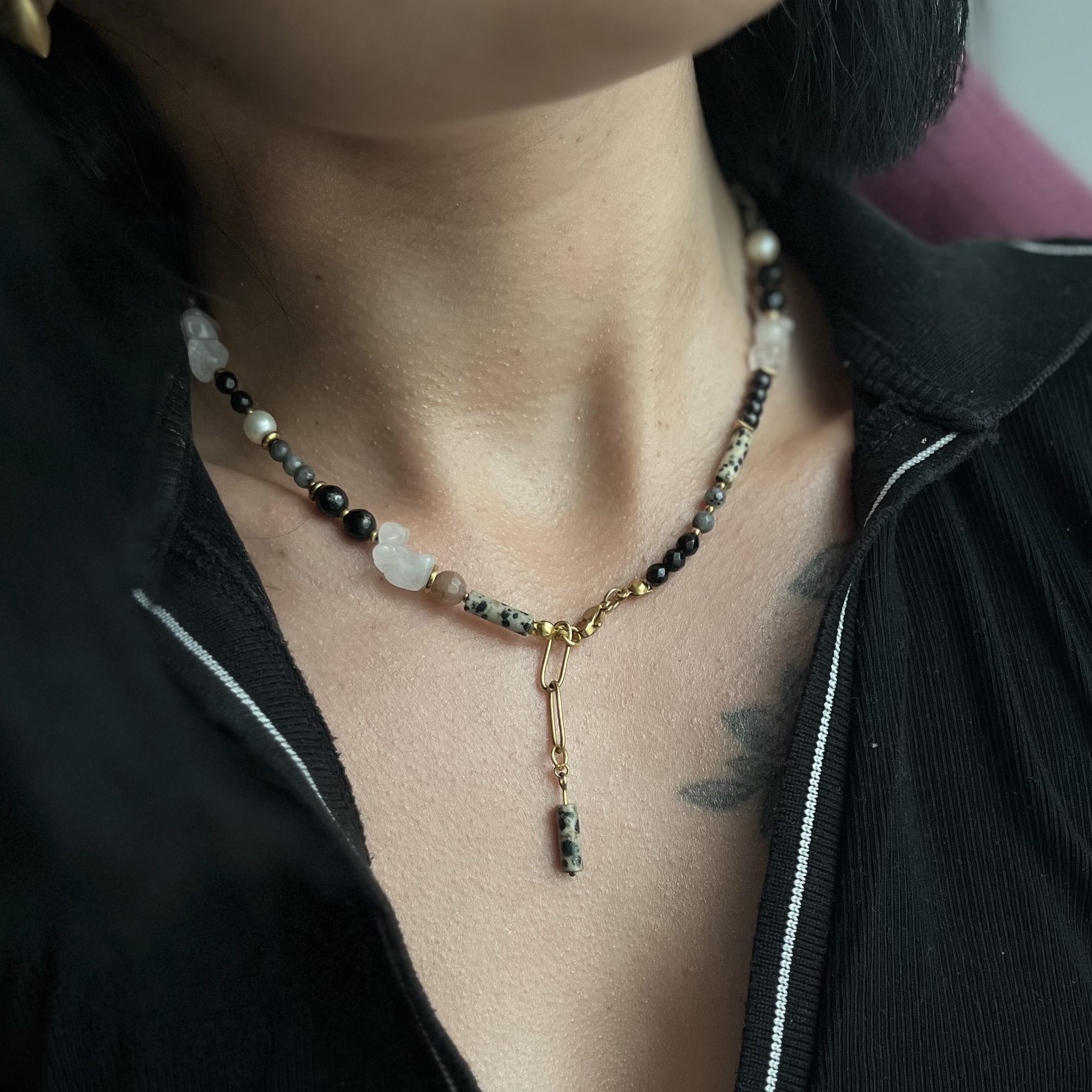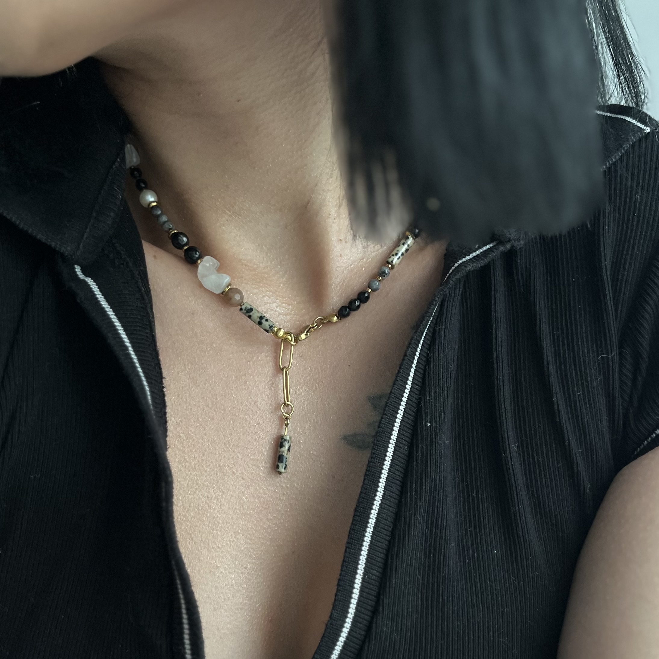 To unikatowy naszyjnik, który łączy w sobie subtelność pereł z mocą onyksu i charakterem jaspisu – idealny dla osób, które lubią oryginalne, energetyczne dodatki.