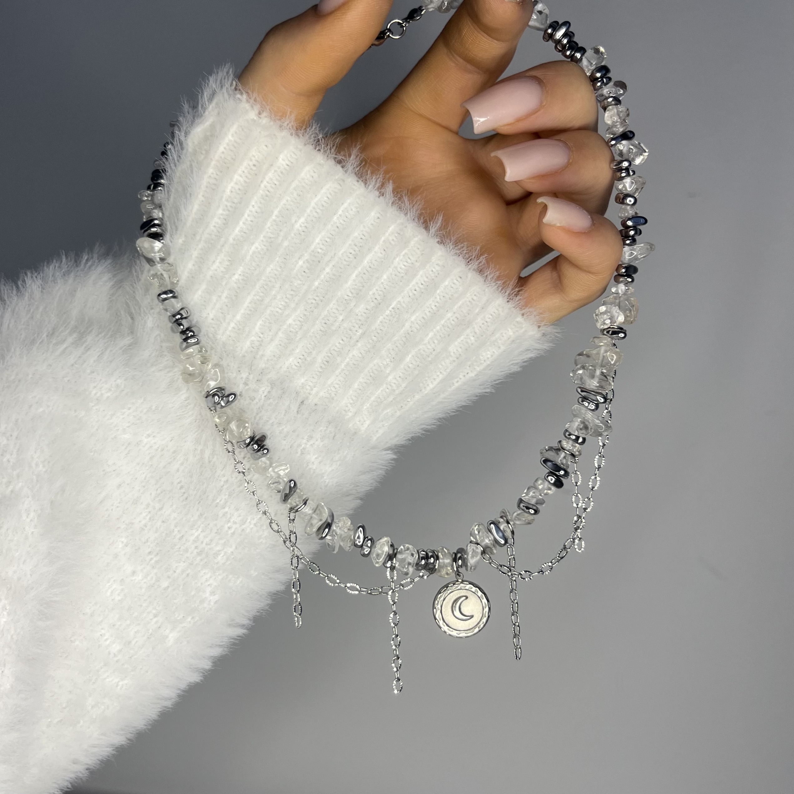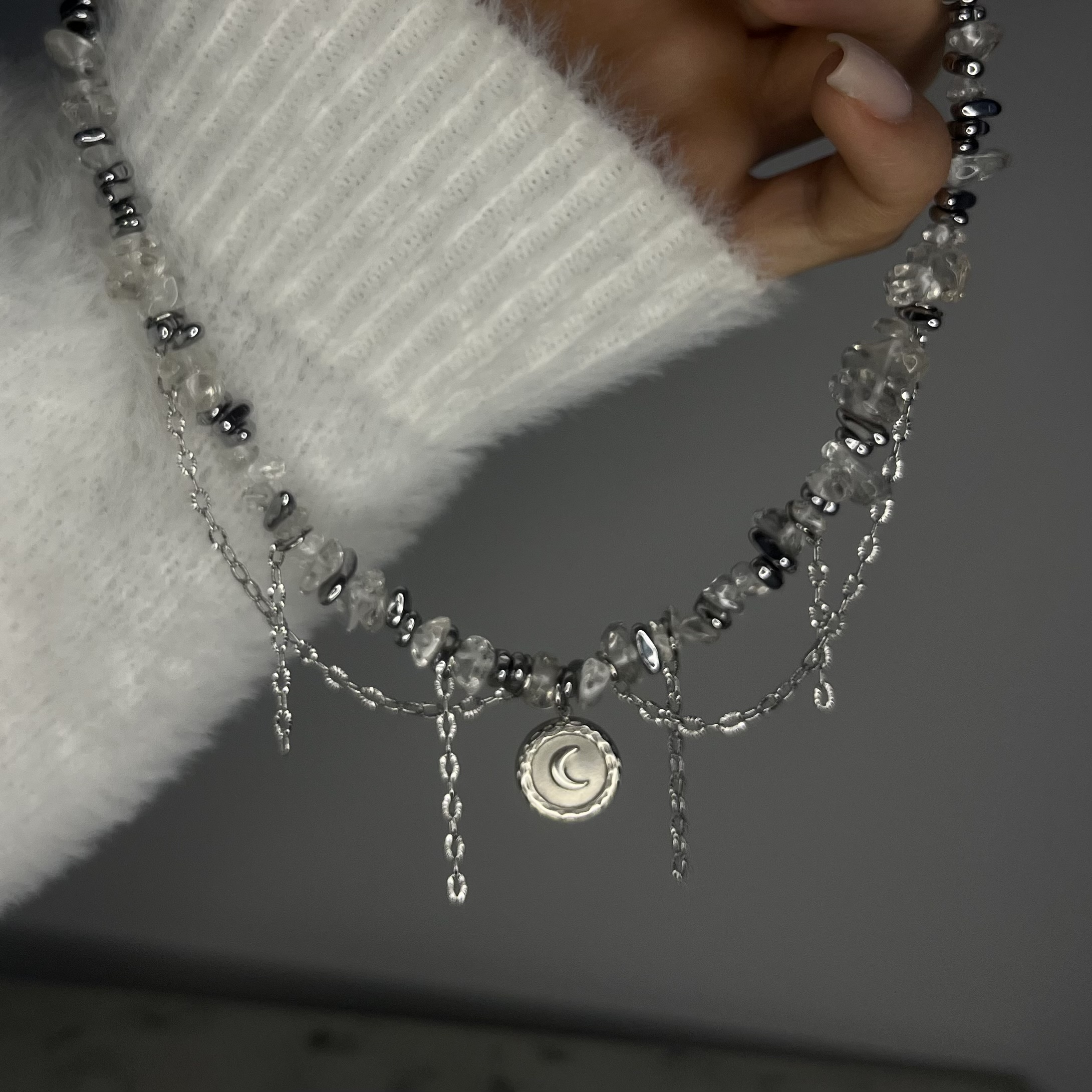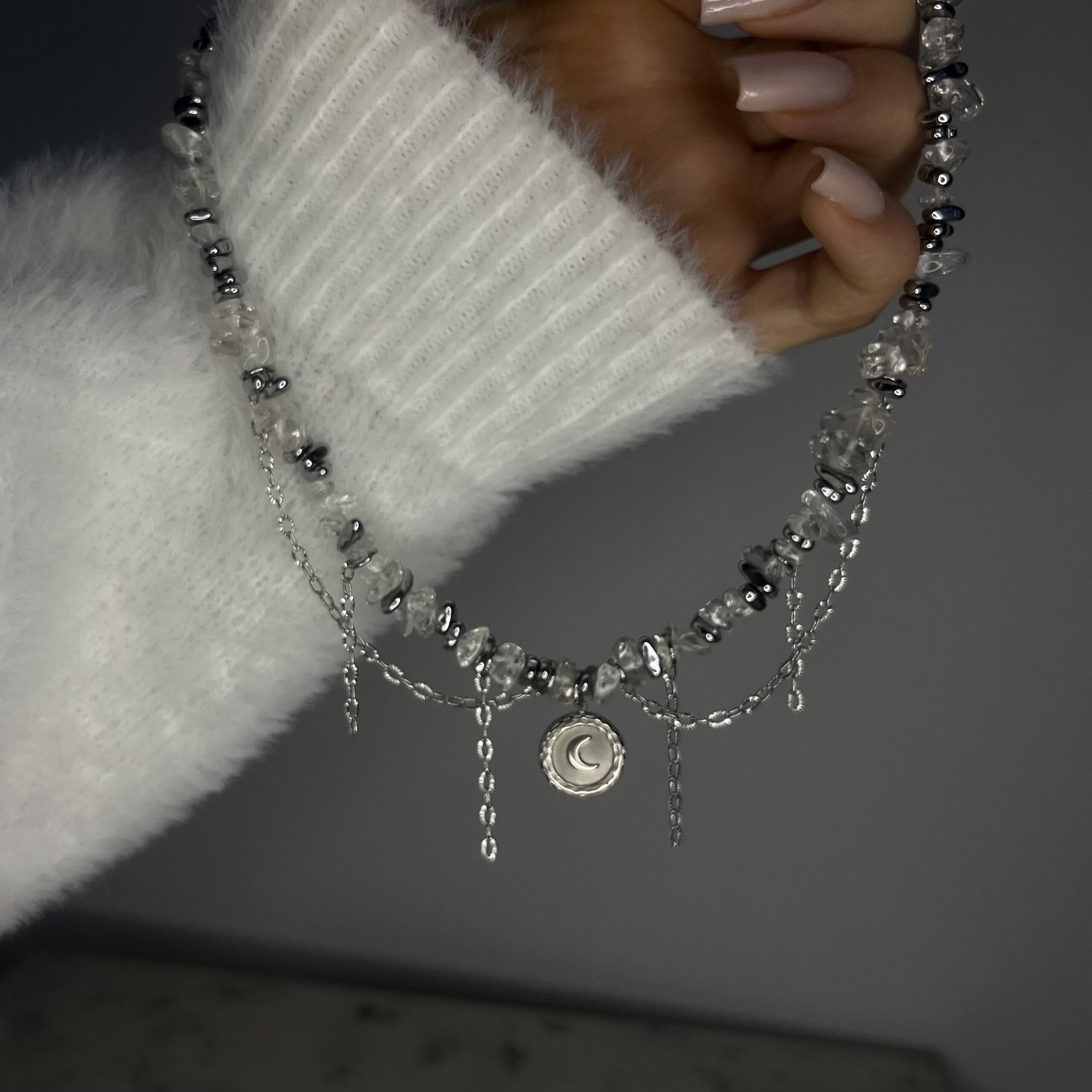 Księżycowy Blask to krótki naszyjnik, który łączy subtelne piękno kamienia księżycowego z chłodnym połyskiem srebrnego hematytu. Delikatna forma, naturalne kamienie w formie sieczki oraz lekko opalizujące refleksy tworzą biżuterię pełną światła, kobiecej energii i harmonii.
