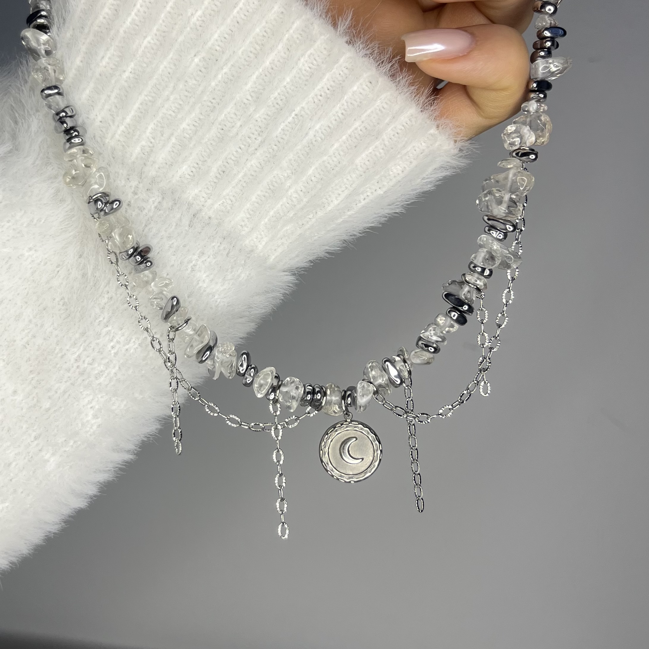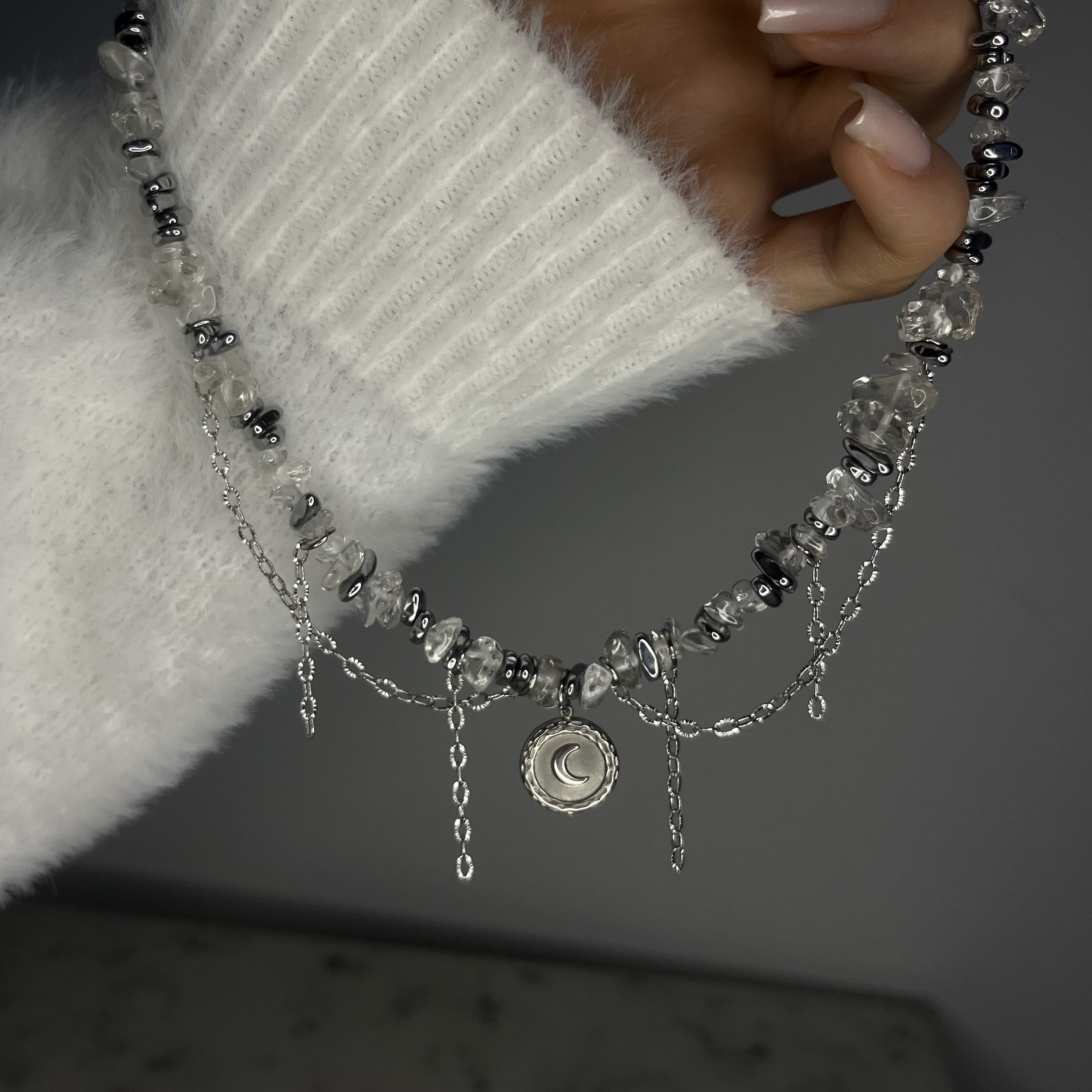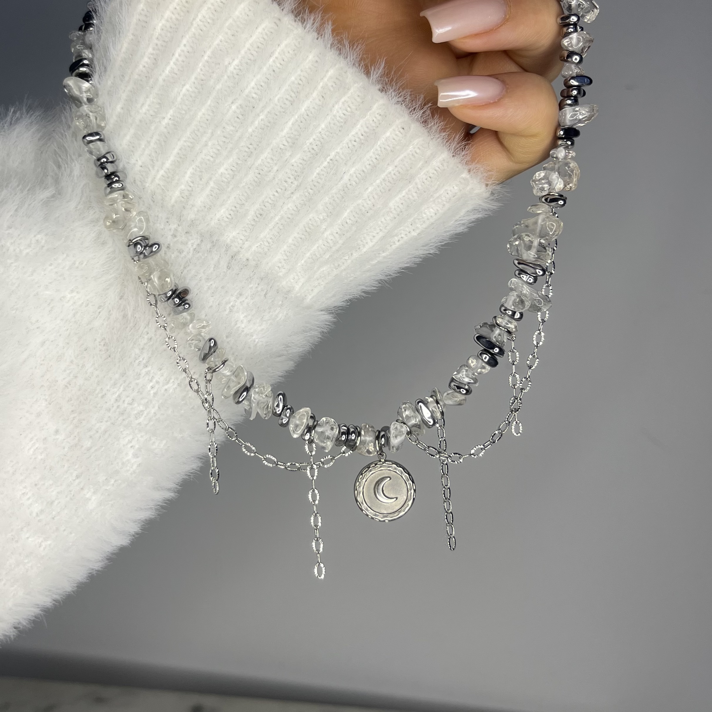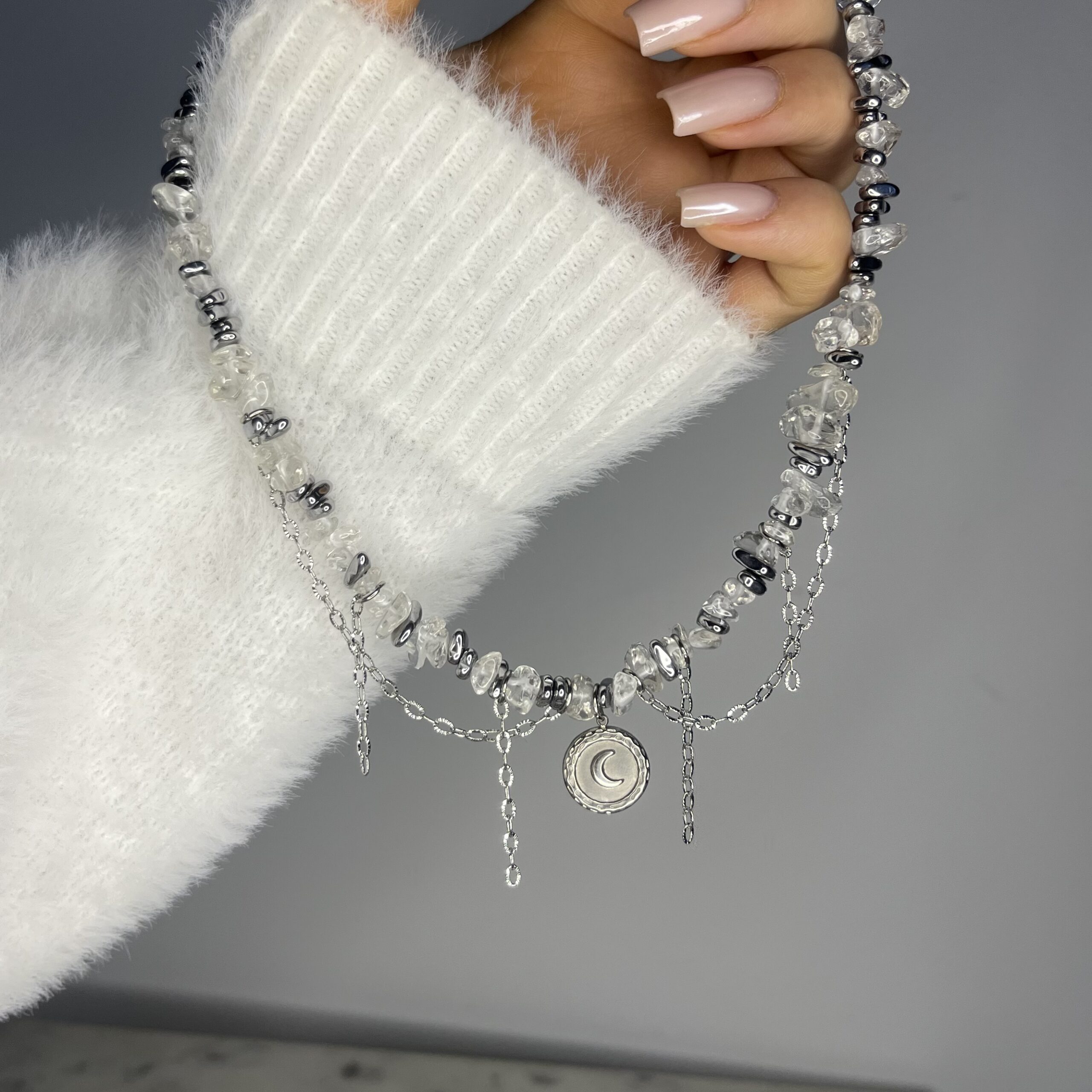 Księżycowy Blask to krótki naszyjnik, który łączy subtelne piękno kamienia księżycowego z chłodnym połyskiem srebrnego hematytu. Delikatna forma, naturalne kamienie w formie sieczki oraz lekko opalizujące refleksy tworzą biżuterię pełną światła, kobiecej energii i harmonii.