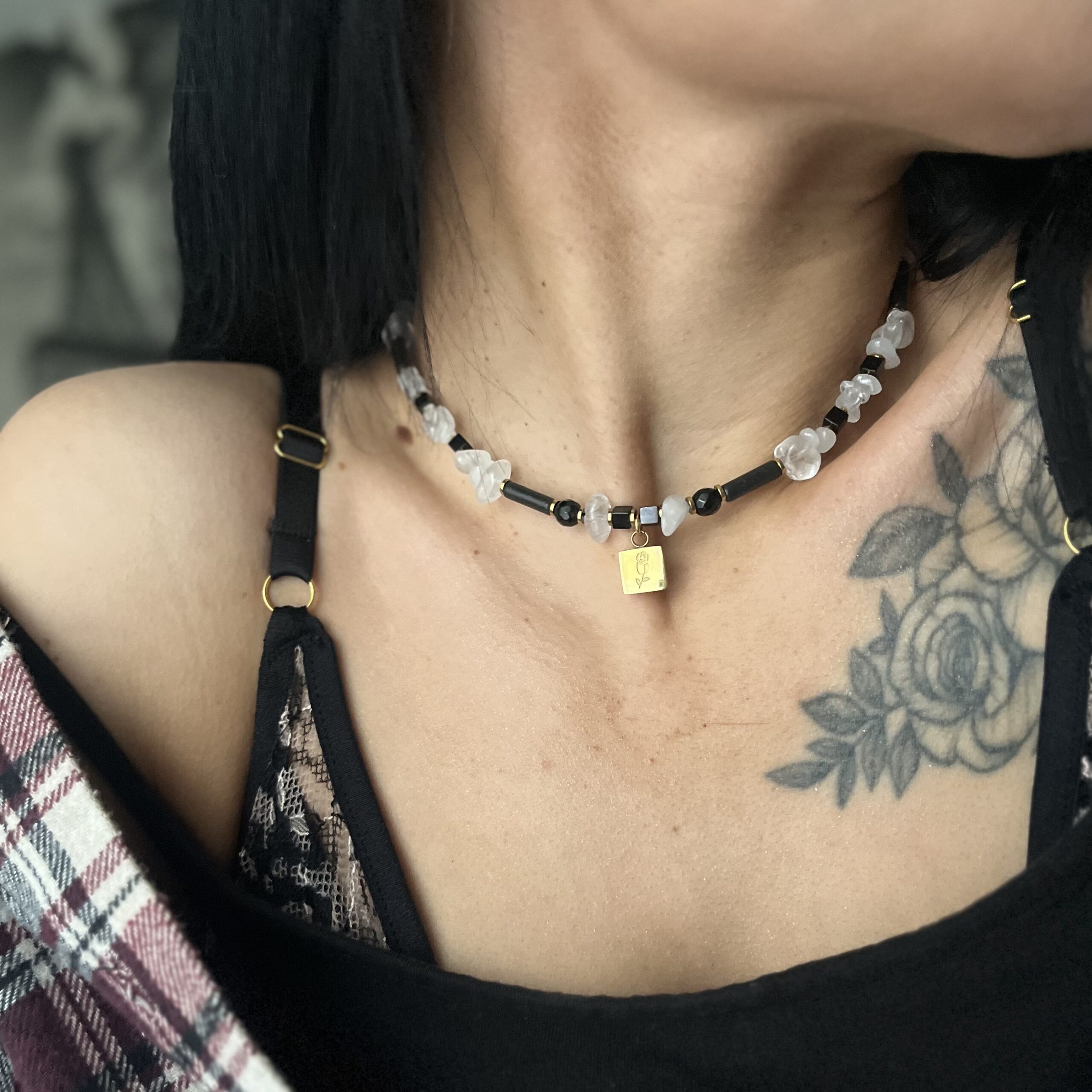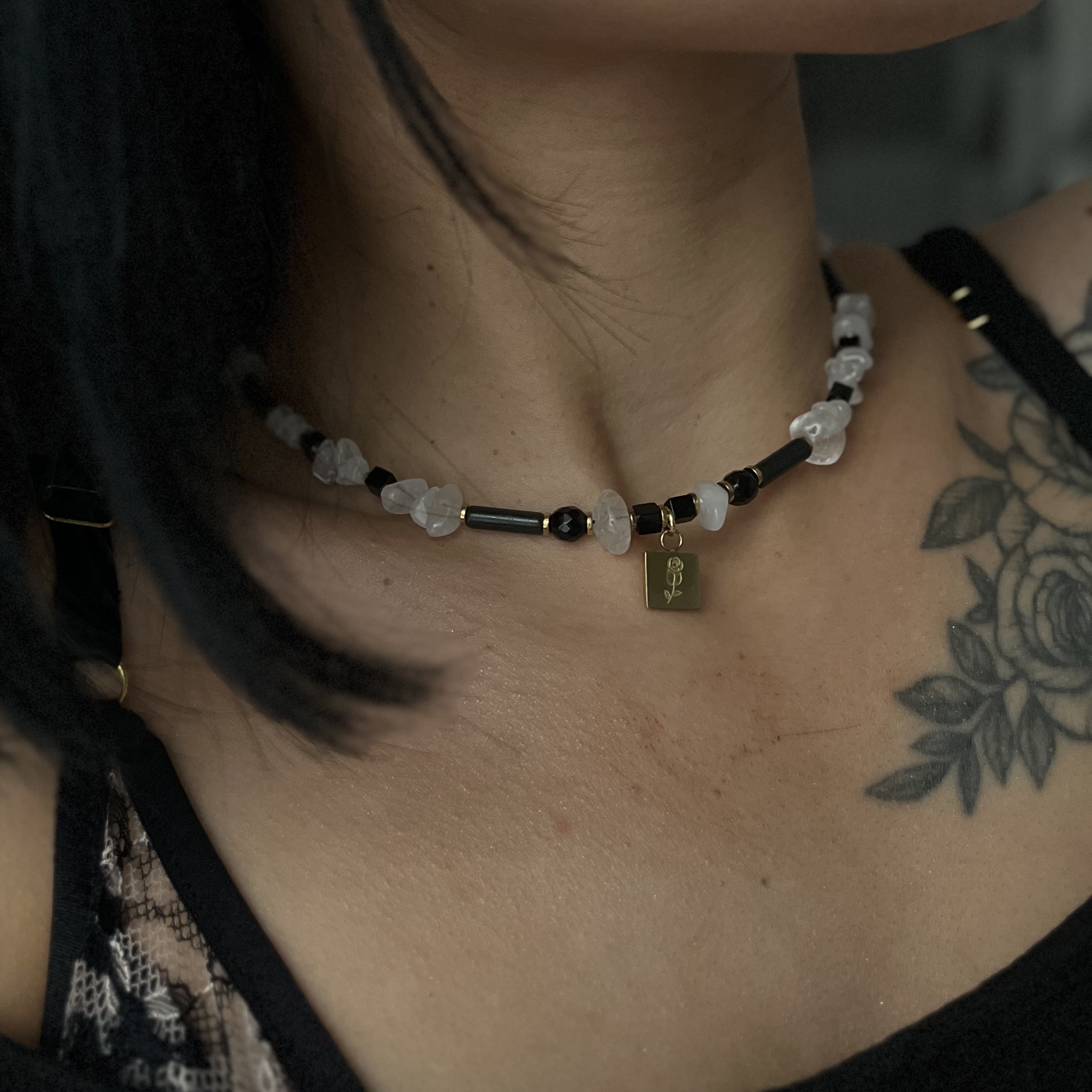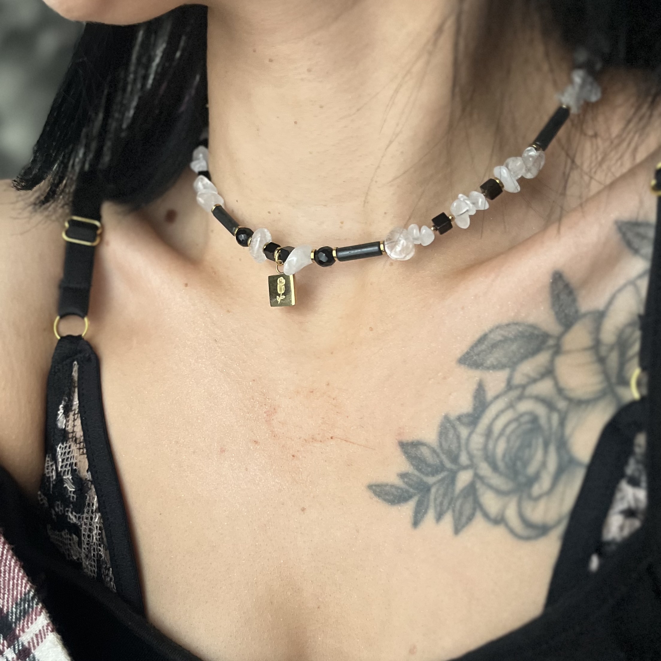 Lśnienie Nocy – naszyjnik z kryształem górskim, turmalinem i onyksami