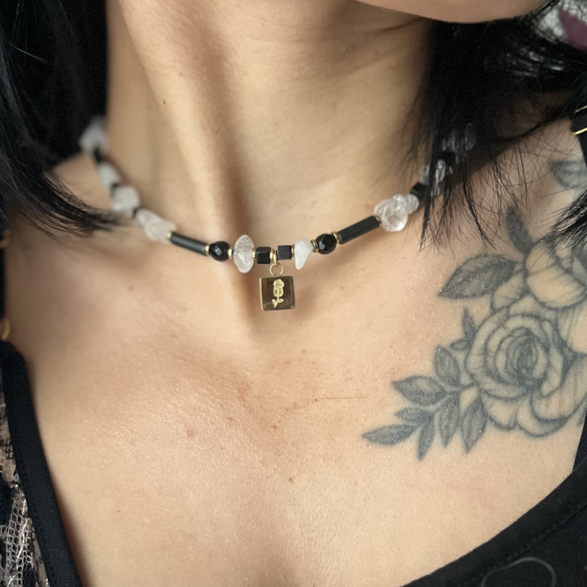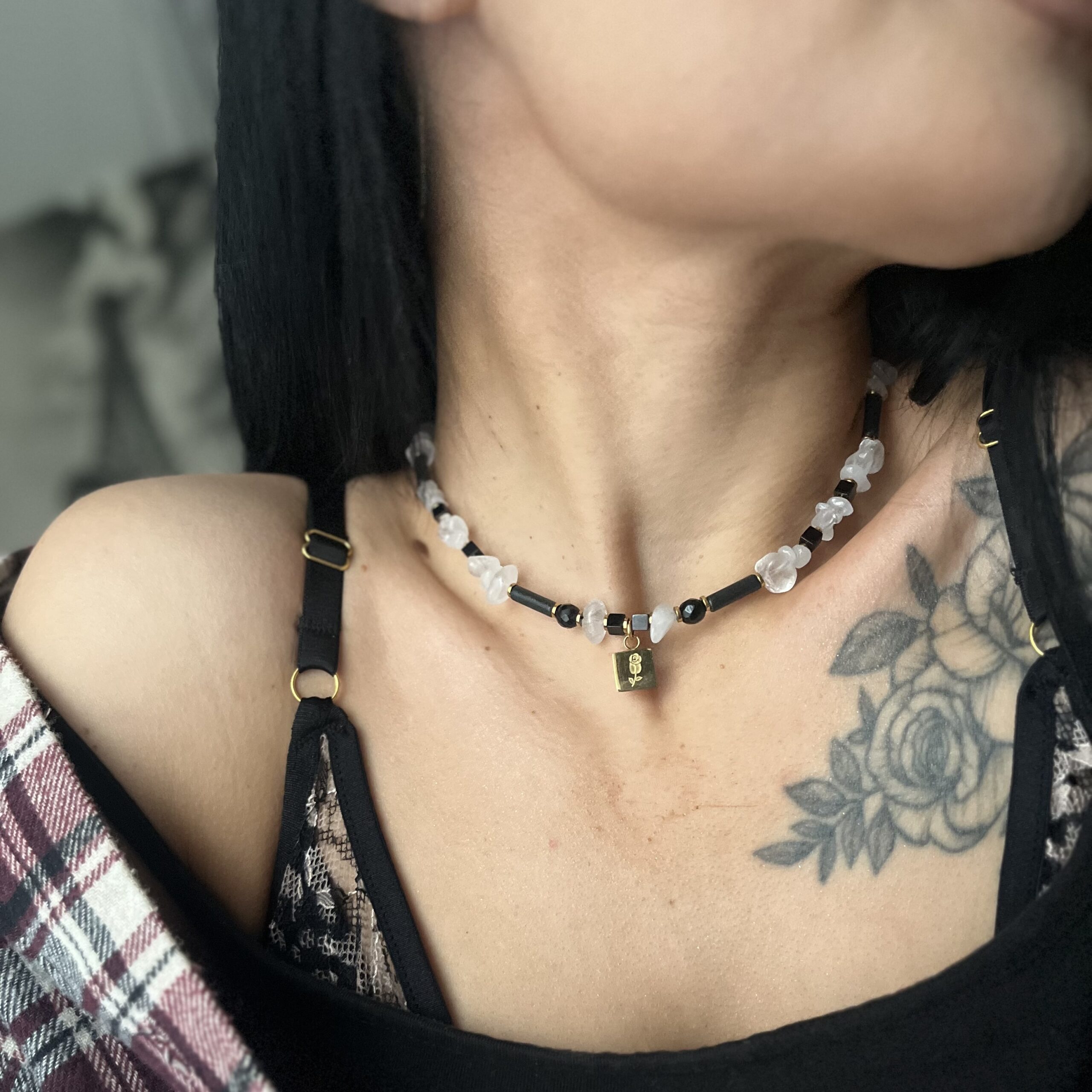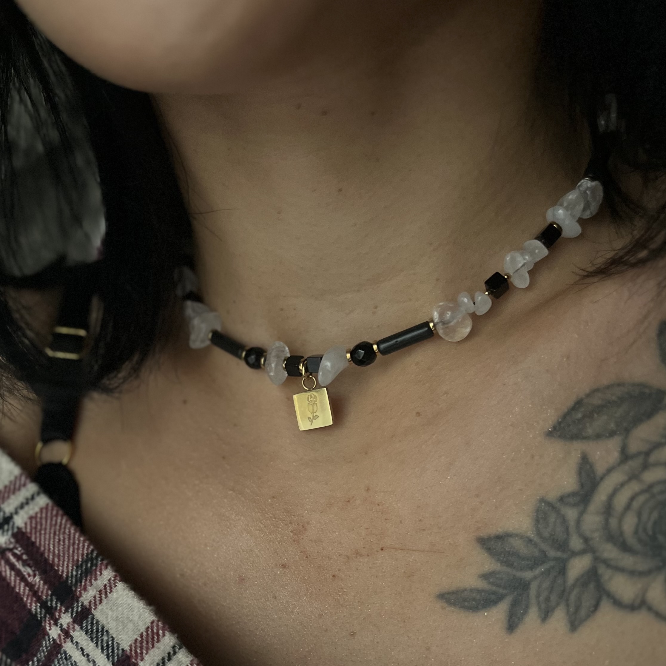 Lśnienie Nocy – naszyjnik z kryształem górskim, turmalinem i onyksami