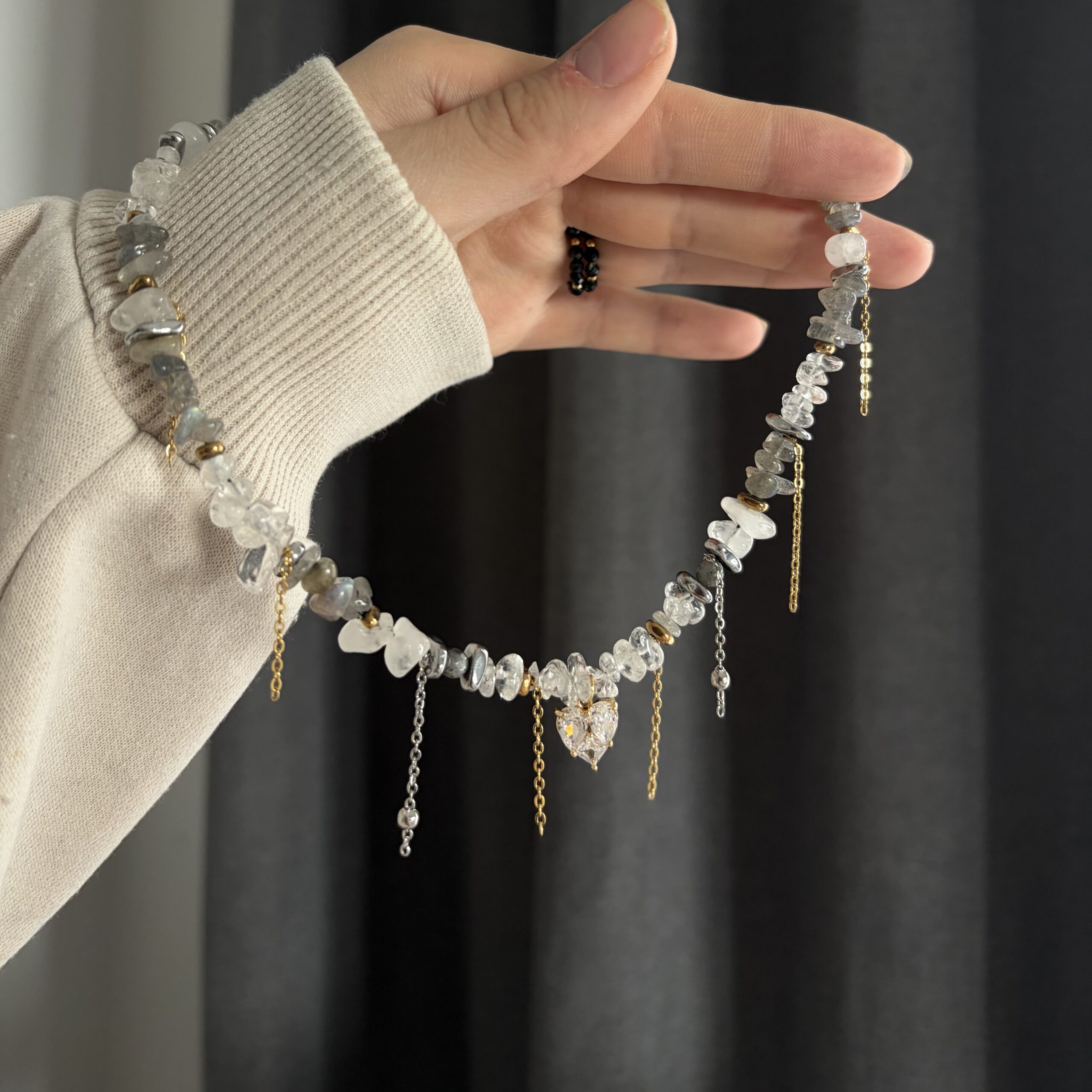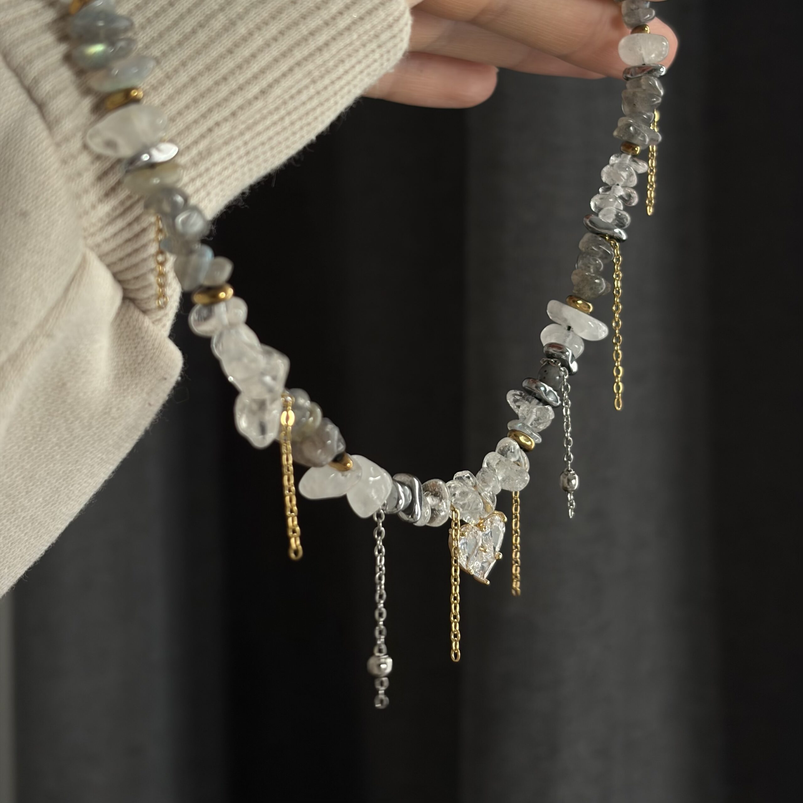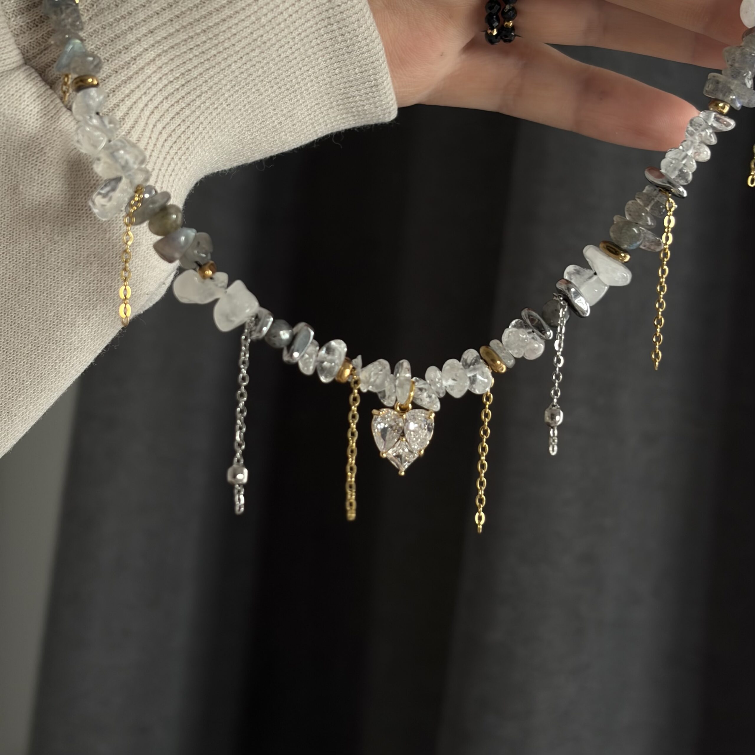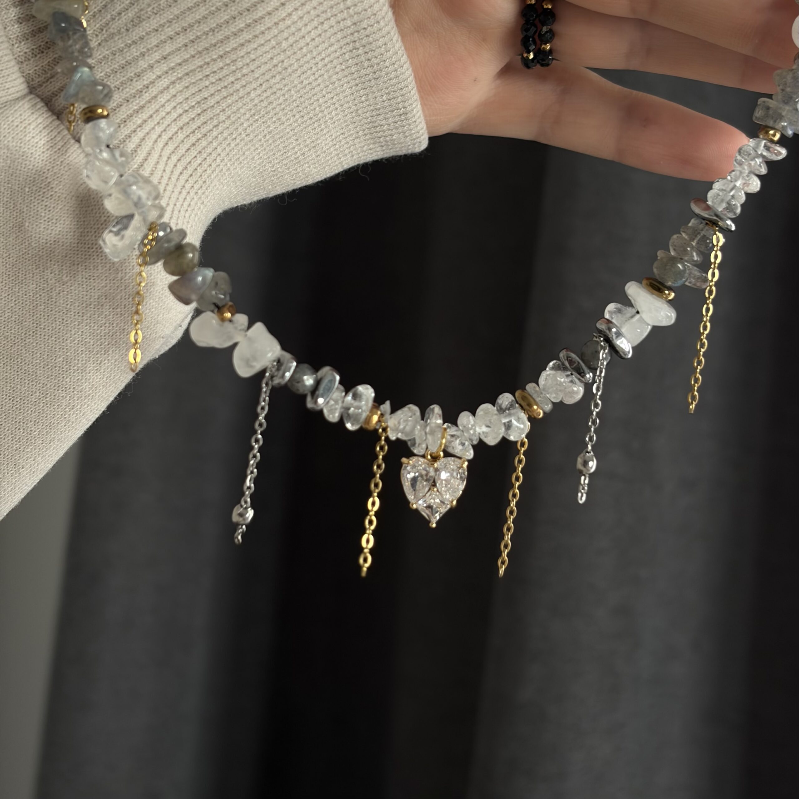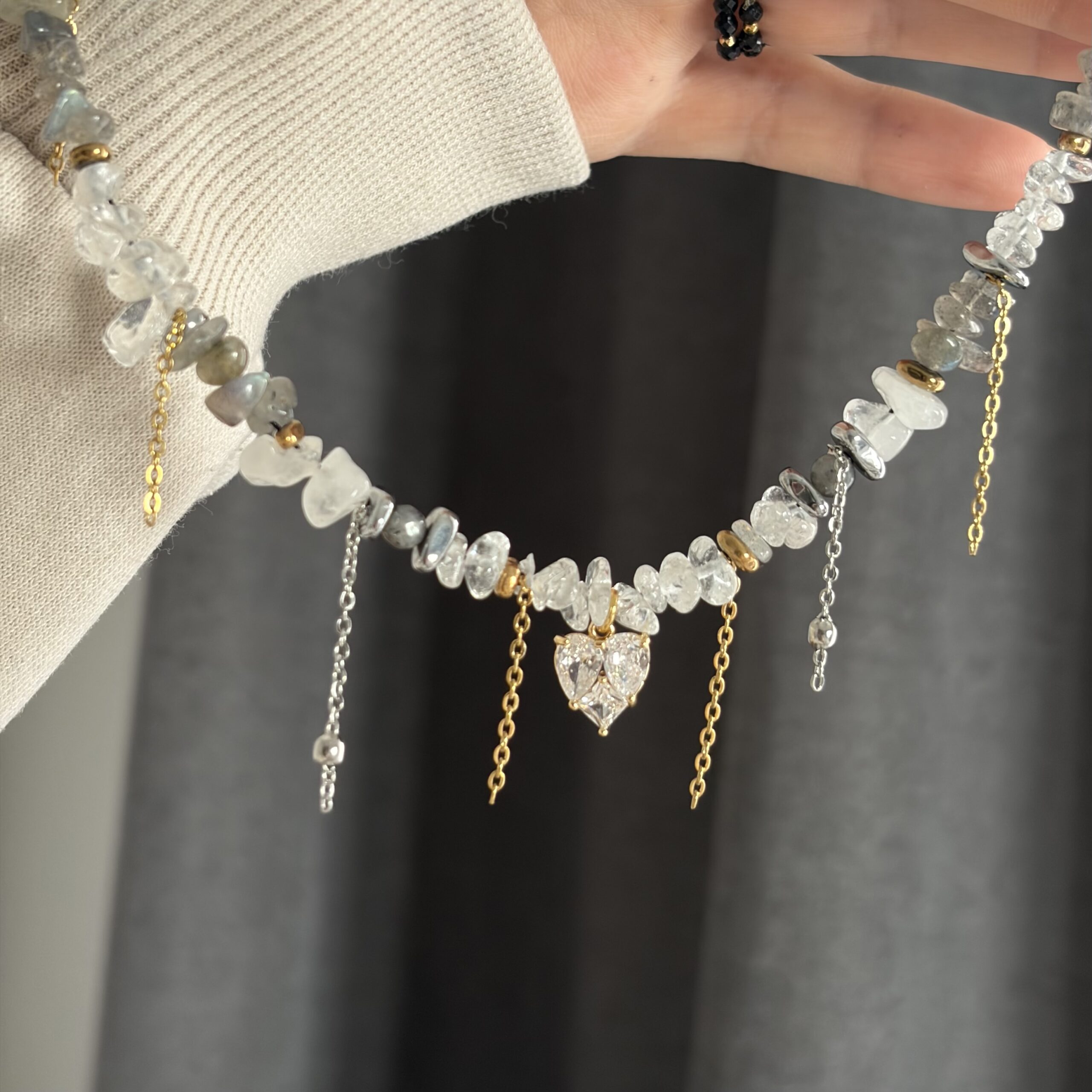 Labradoryt delikatnie mieni się przy ruchu, nadając naszyjnikowi tajemniczej głębi, a kryształ górski rozświetla całość i dodaje jej lekkości. To połączenie sprawia, że biżuteria wygląda niezwykle świeżo, elegancko i ponadczasowo.