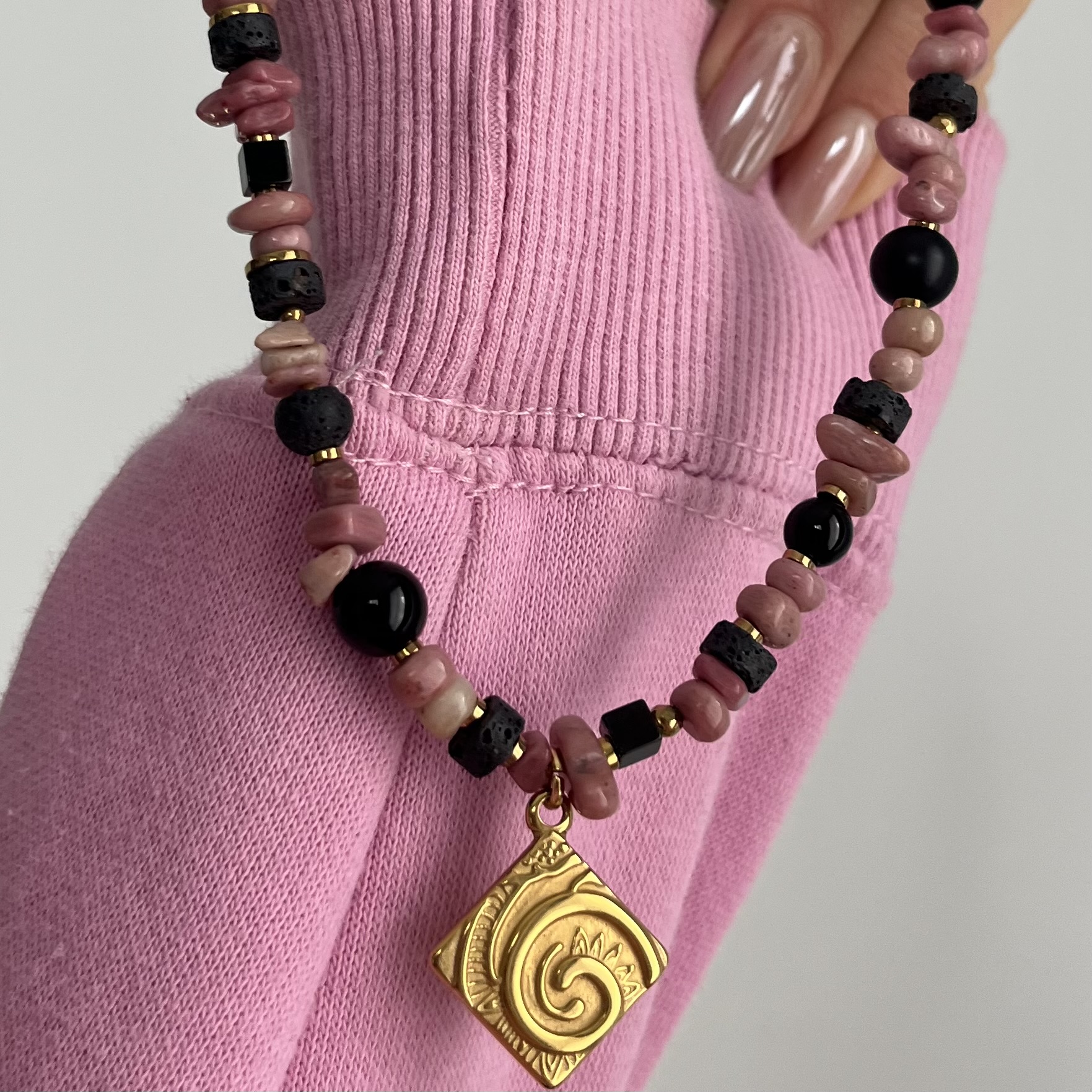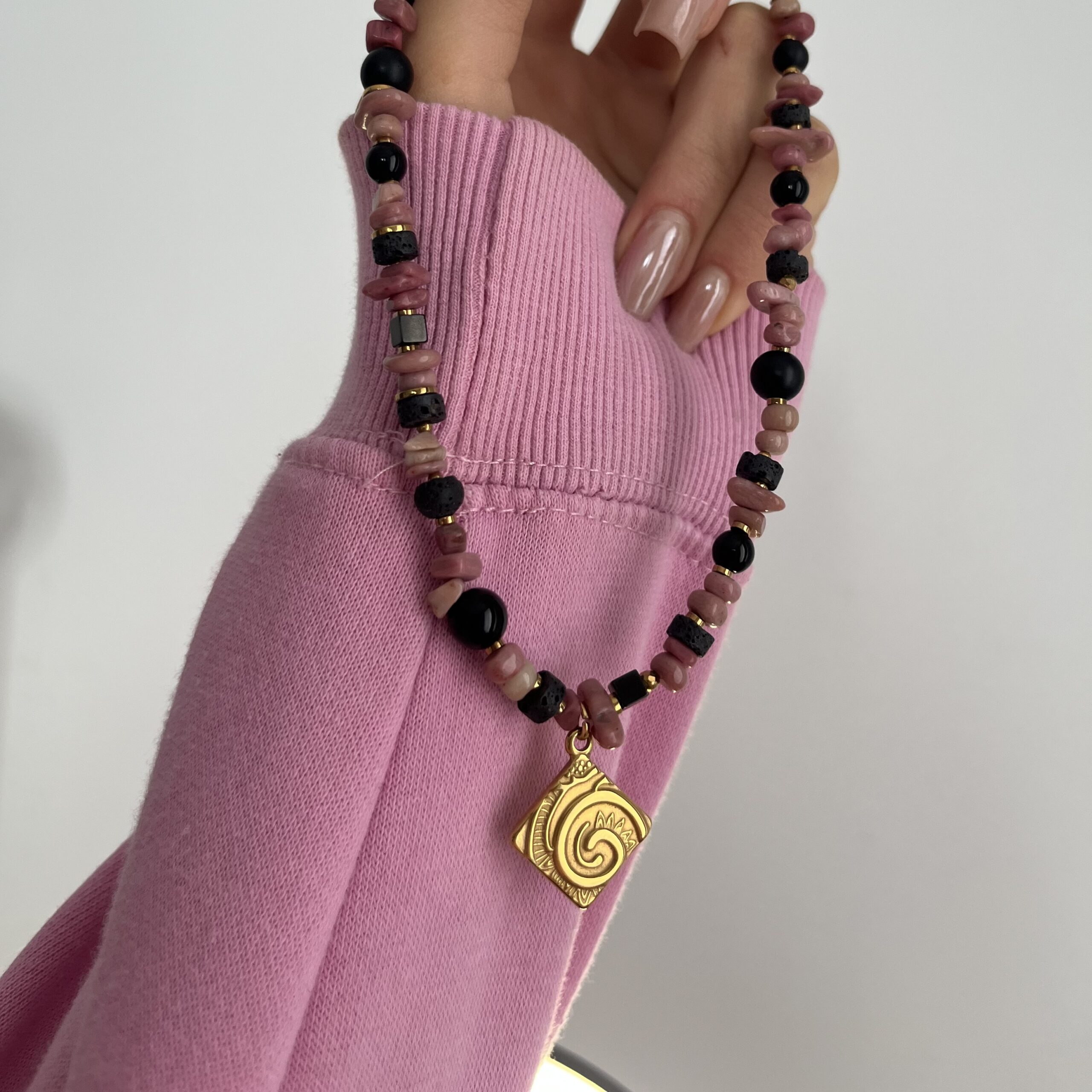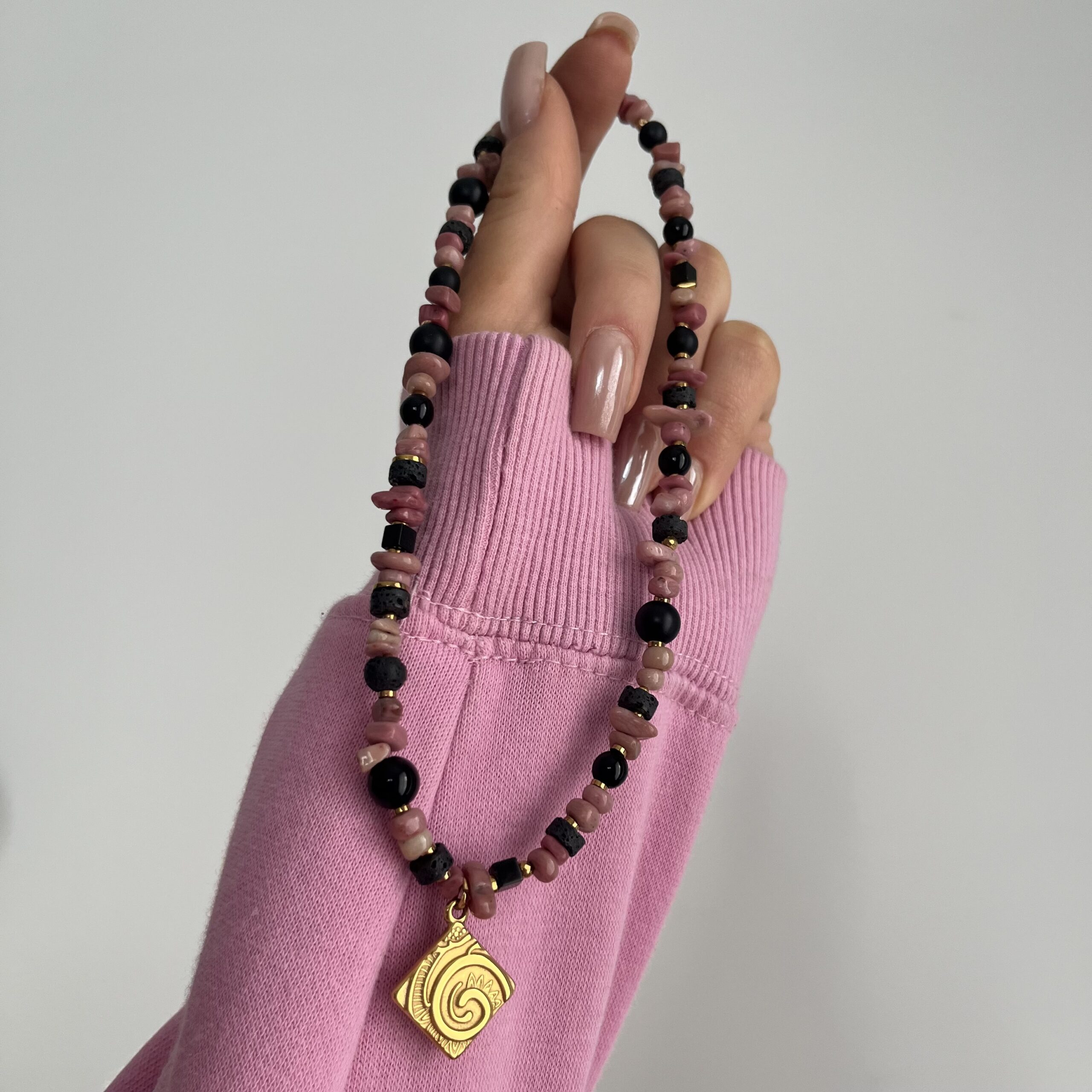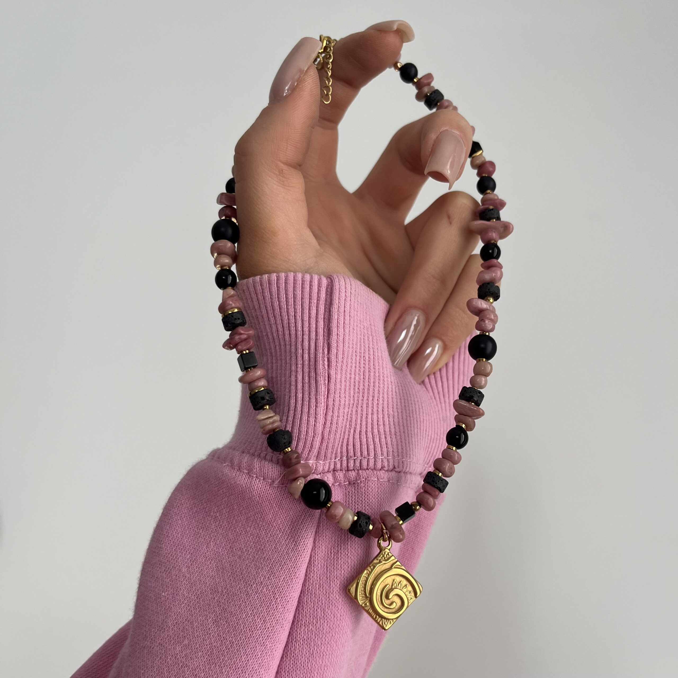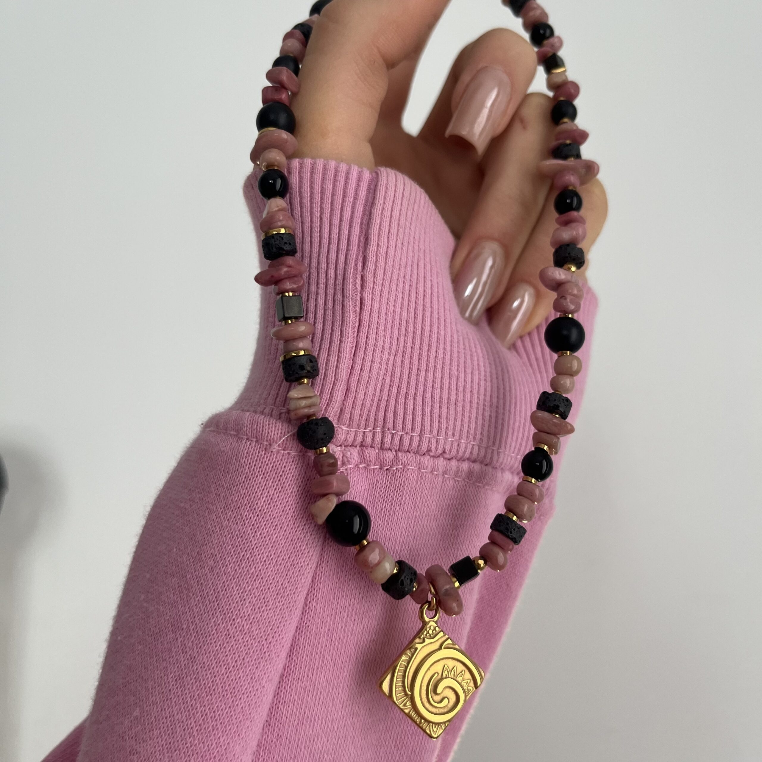 Tworzę go z rodonitu, onyksu i lawy wulkanicznej, uzupełnionych złotymi hematytami, które dodają całości elegancji i delikatnego blasku. Rodonit kojarzony jest z harmonią i emocjonalną równowagą, onyks z siłą i stabilnością, a lawa wulkaniczna z ugruntowaniem i wewnętrzną mocą. Złota zawieszka stanowi wyrazisty akcent, który pięknie przyciąga wzrok.