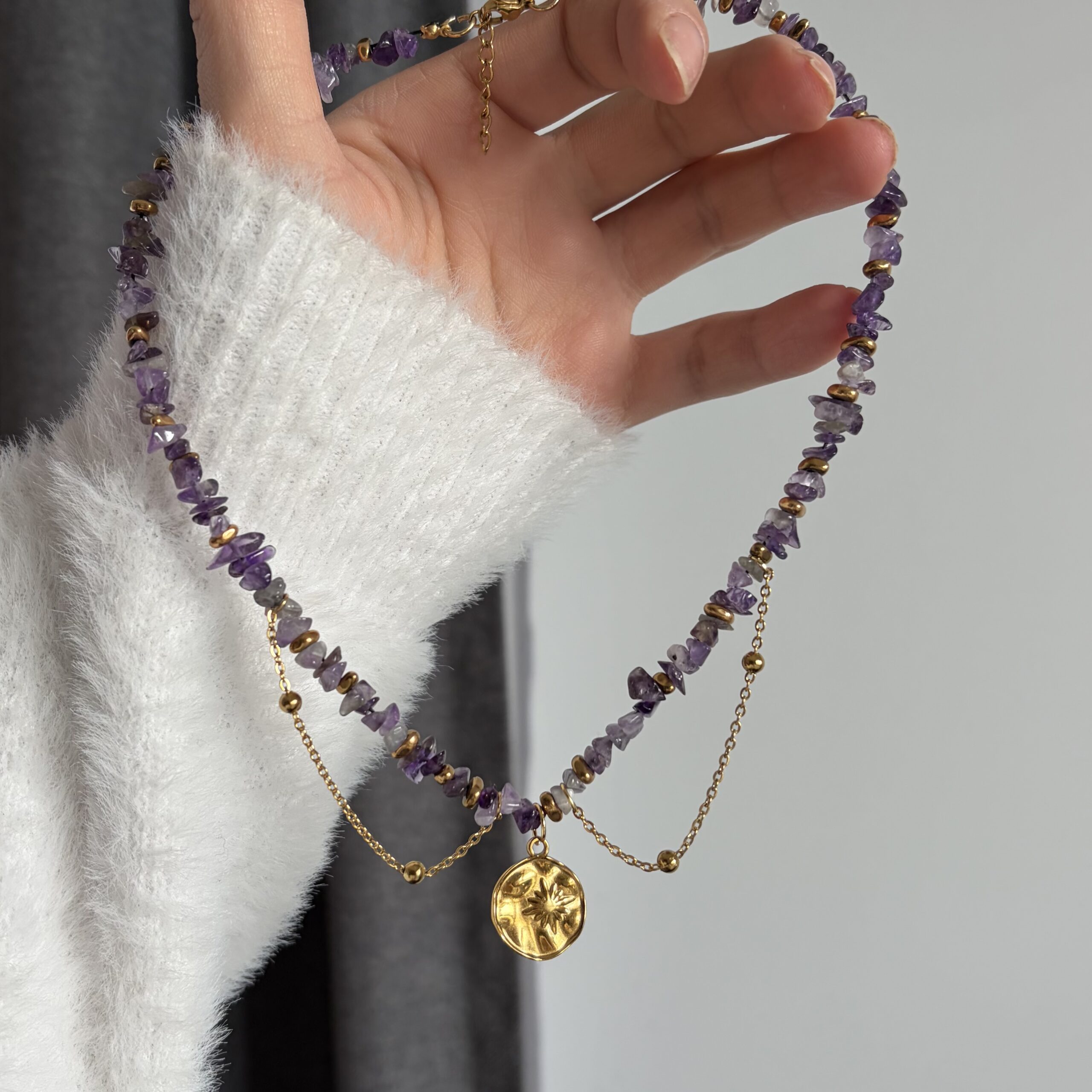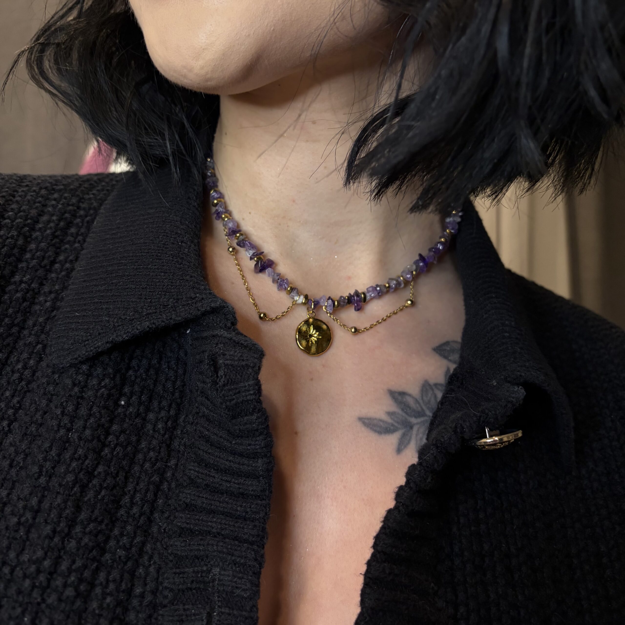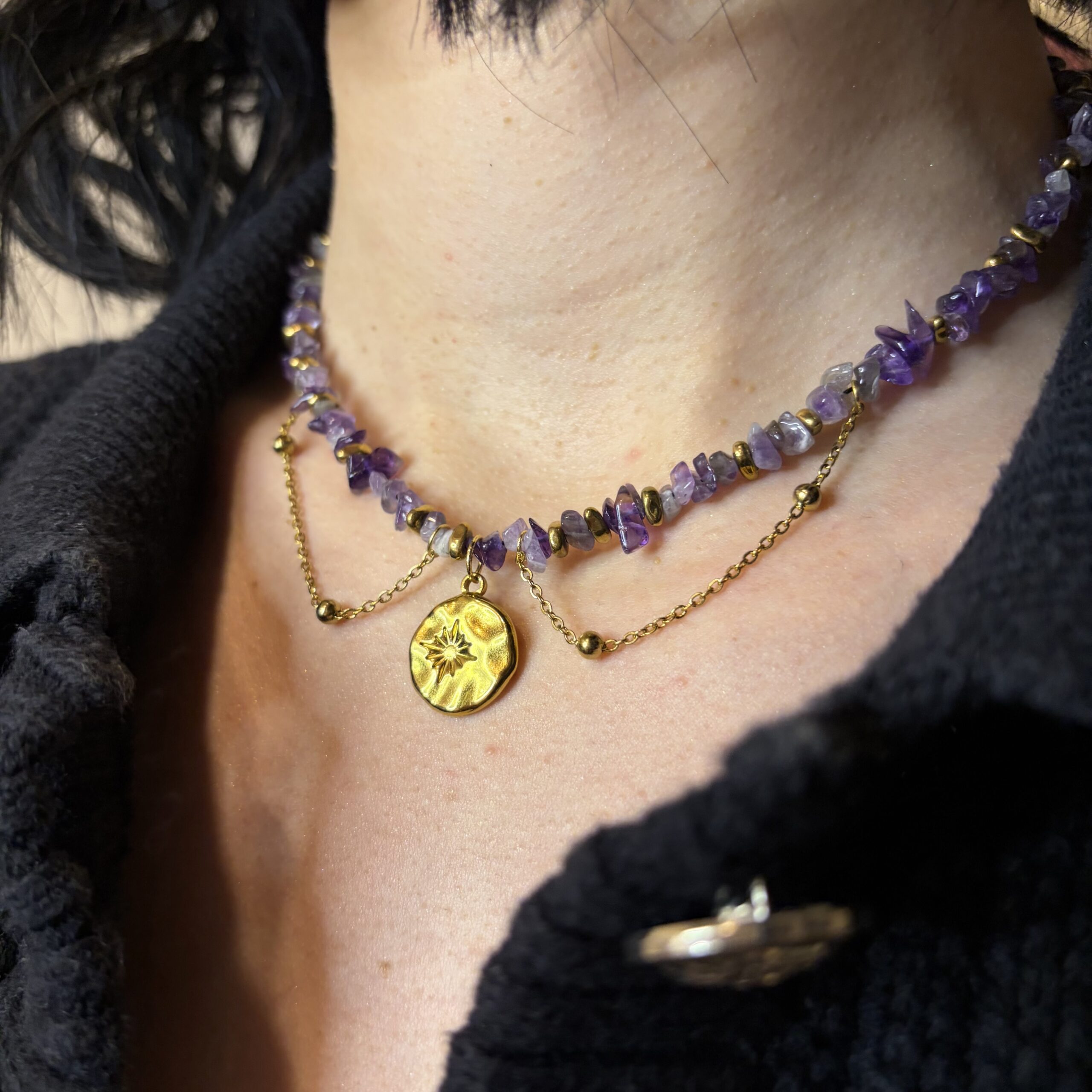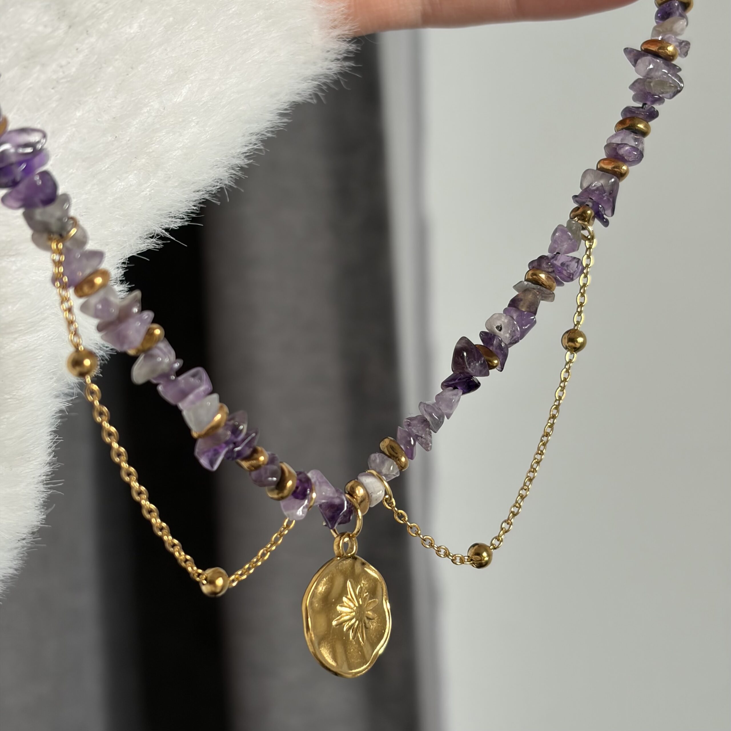 Naszyjnik z sieczki ametystu to delikatna, romantyczna biżuteria, która przyciąga wzrok naturalnym blaskiem kamieni i złotymi detalami.