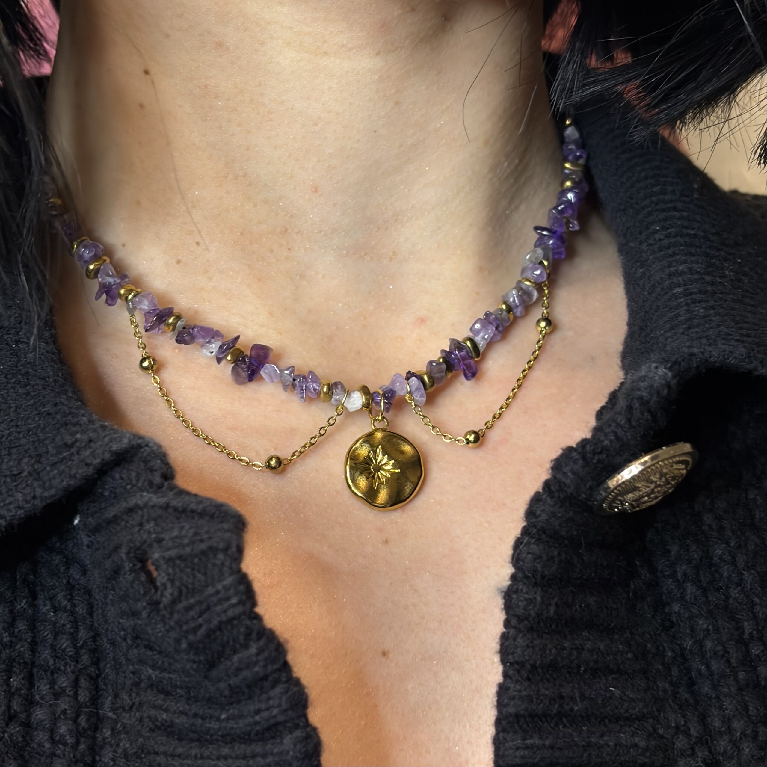 Ametyst nadaje biżuterii wyjątkowego uroku i delikatnej, romantycznej kolorystyki. Złote akcenty sprawiają, że naszyjnik świetnie komponuje się zarówno z codziennymi stylizacjami, jak i bardziej eleganckimi zestawami.
